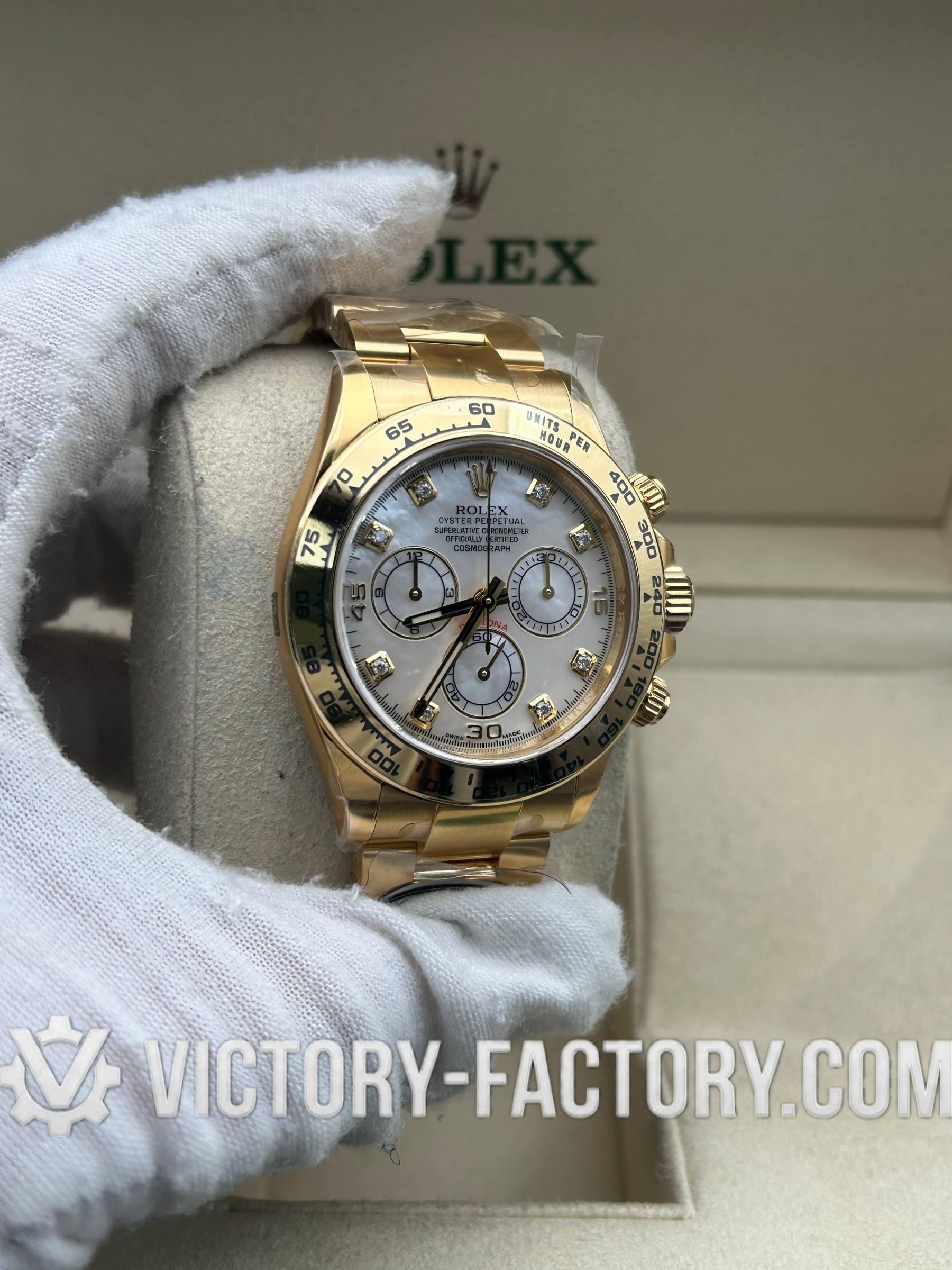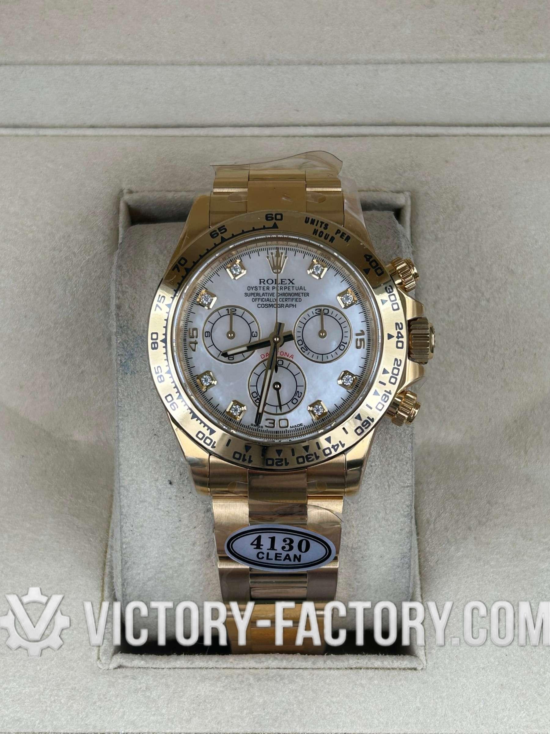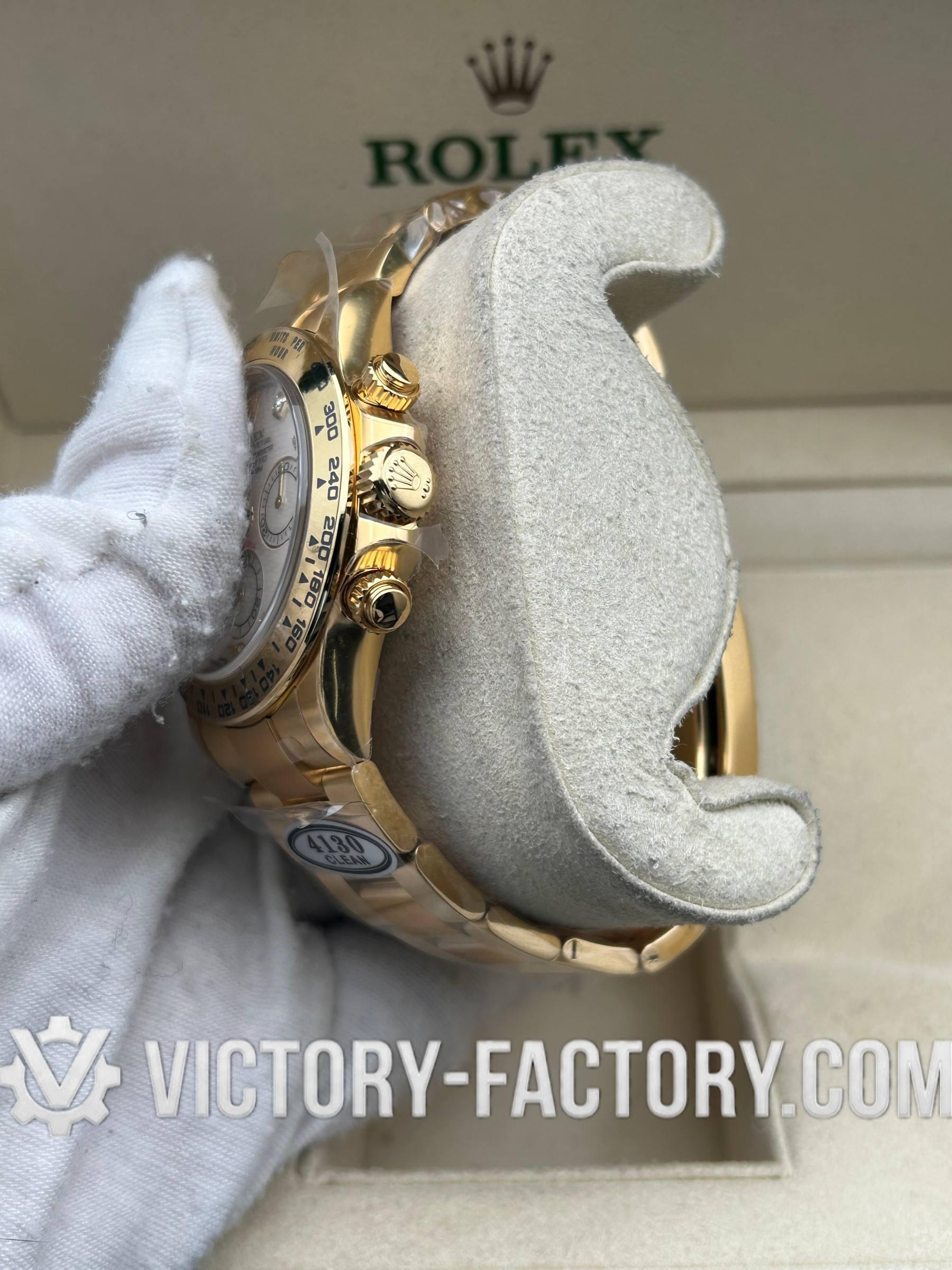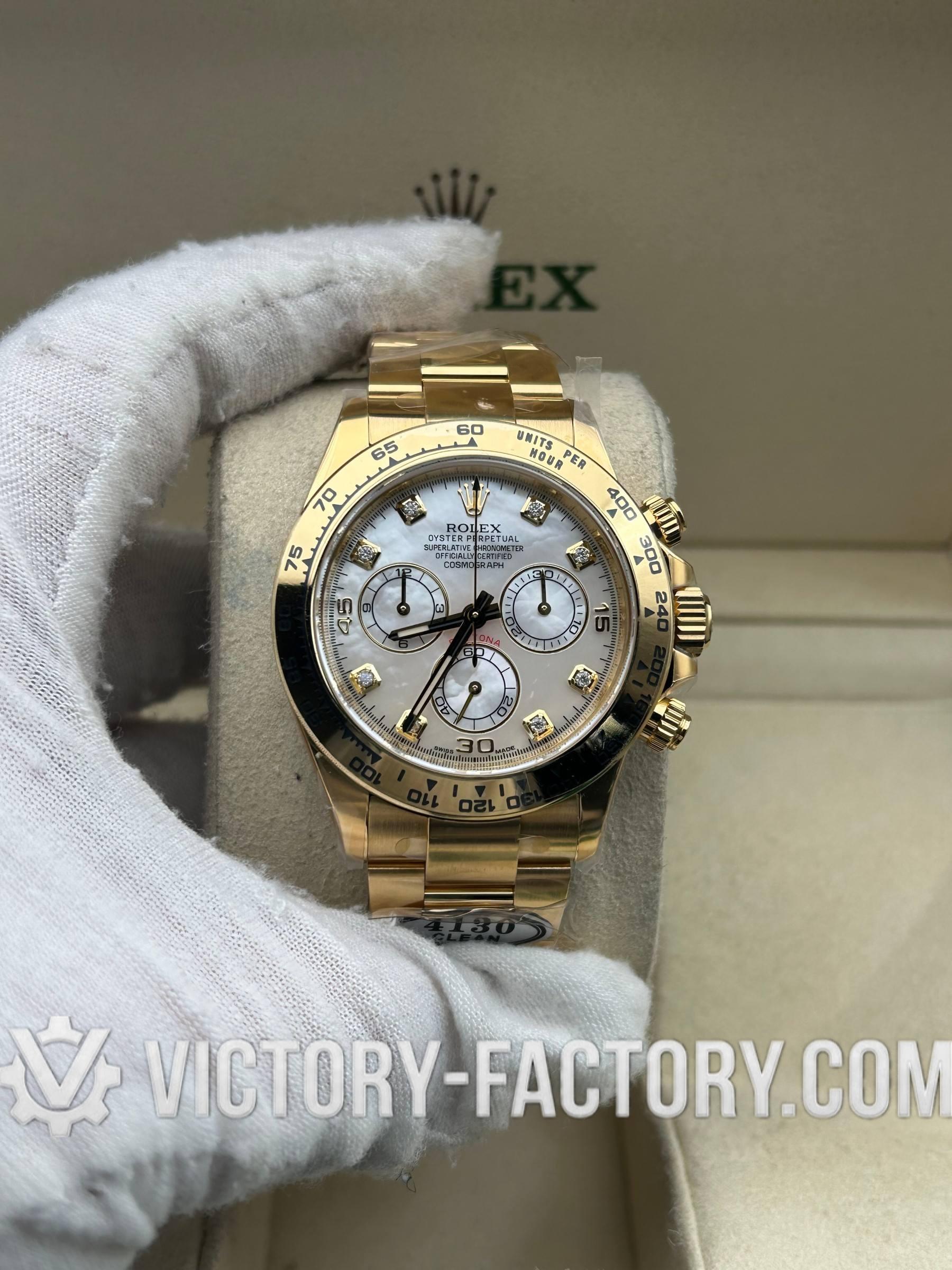 Victory Factory (VF) proudly presents the Rolex Cosmograph Daytona 18k Yellow Gold Mother of Pearl Dial with Diamond Markers Super Replica Watch, a symbol of luxury and precision engineering. This timepiece is expertly crafted to match the original Rolex Cosmograph Daytona in every aspect, from design to functionality, by integrating premium Clean Factory (C-Factory) exterior components with the industry-leading Dandong 4130 movement.