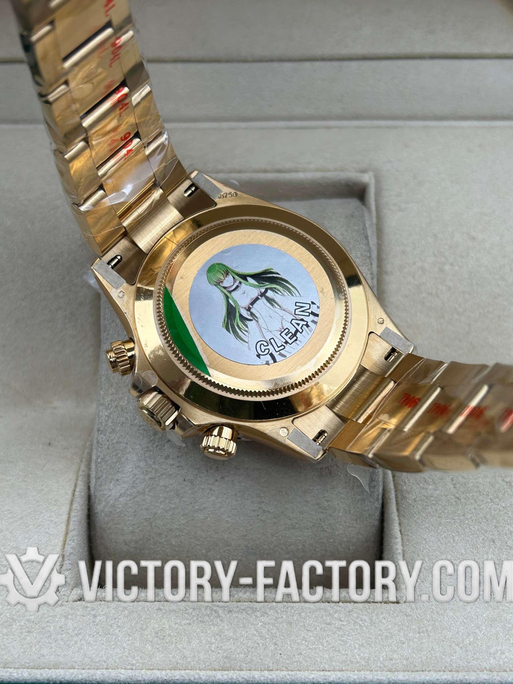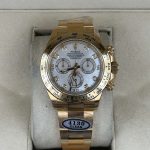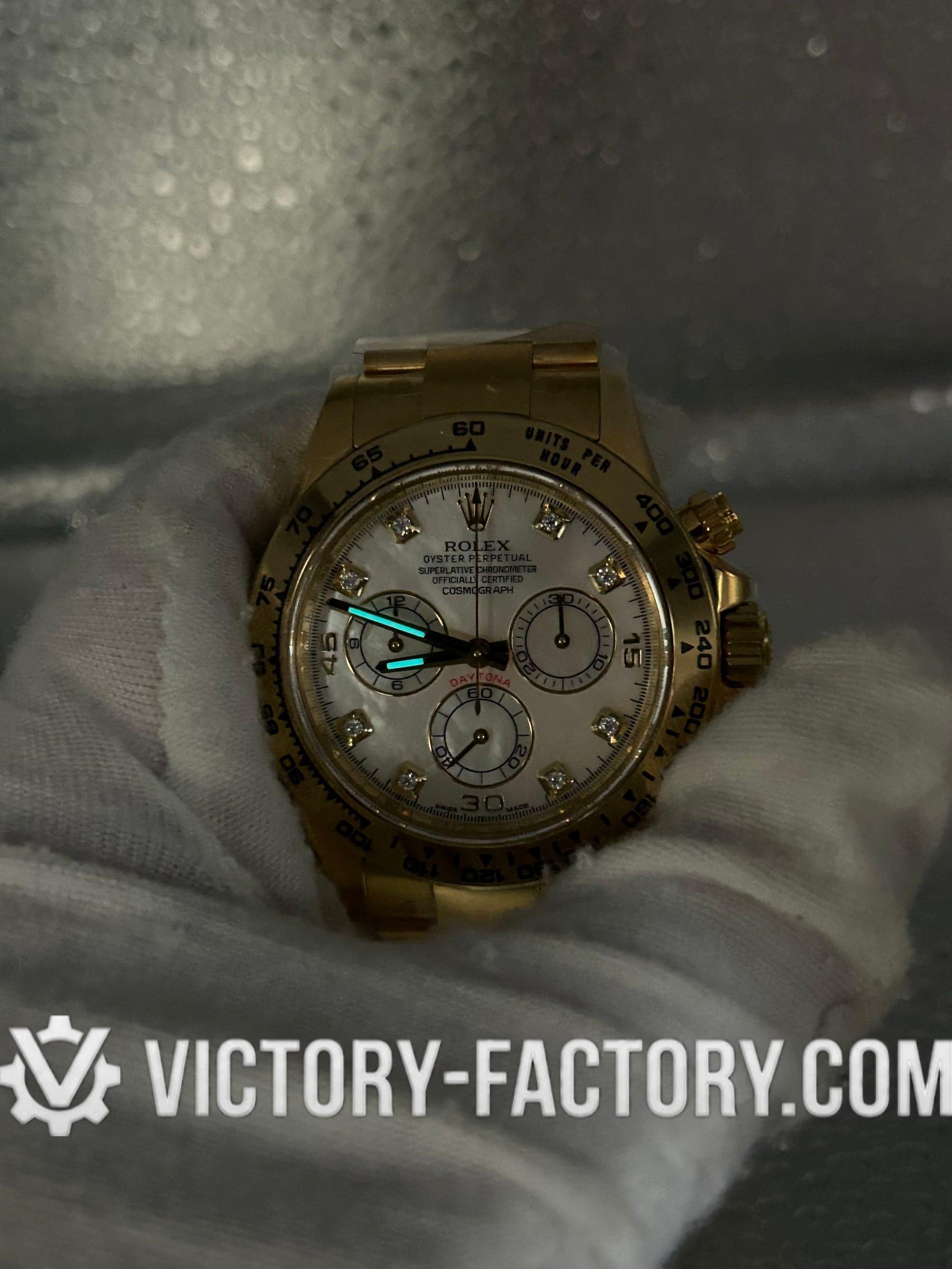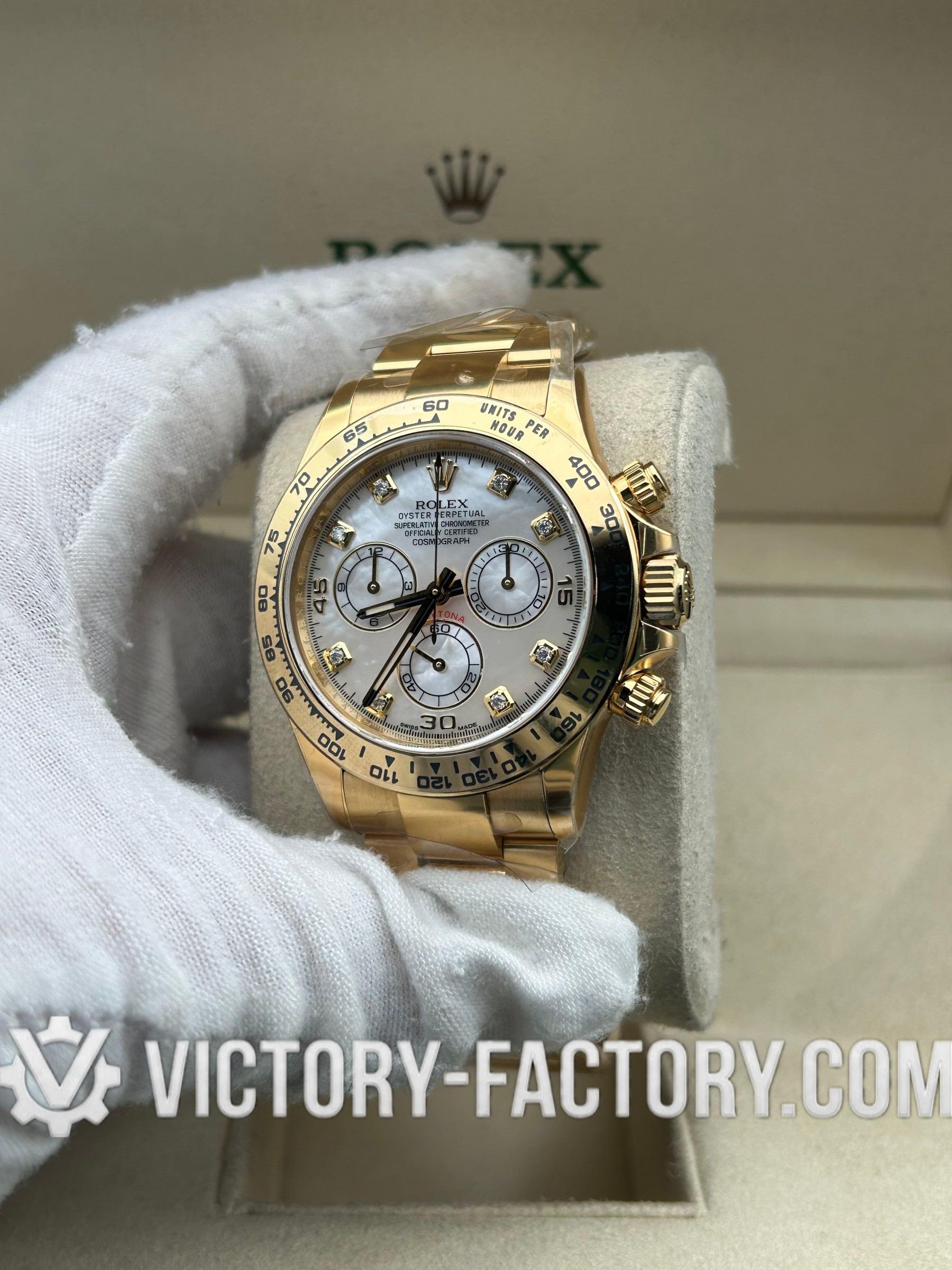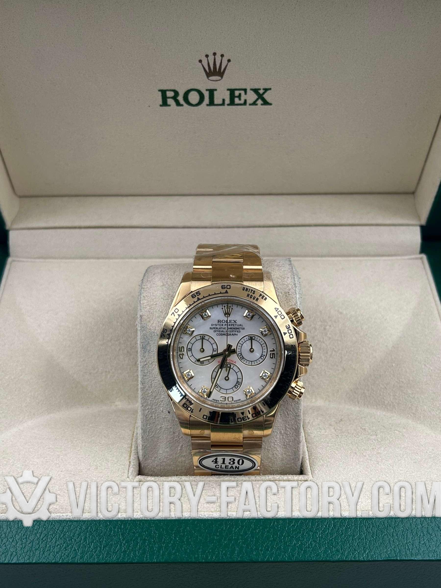 Victory Factory (VF) proudly presents the Rolex Cosmograph Daytona 18k Yellow Gold Mother of Pearl Dial with Diamond Markers Super Replica Watch, a symbol of luxury and precision engineering. This timepiece is expertly crafted to match the original Rolex Cosmograph Daytona in every aspect, from design to functionality, by integrating premium Clean Factory (C-Factory) exterior components with the industry-leading Dandong 4130 movement.