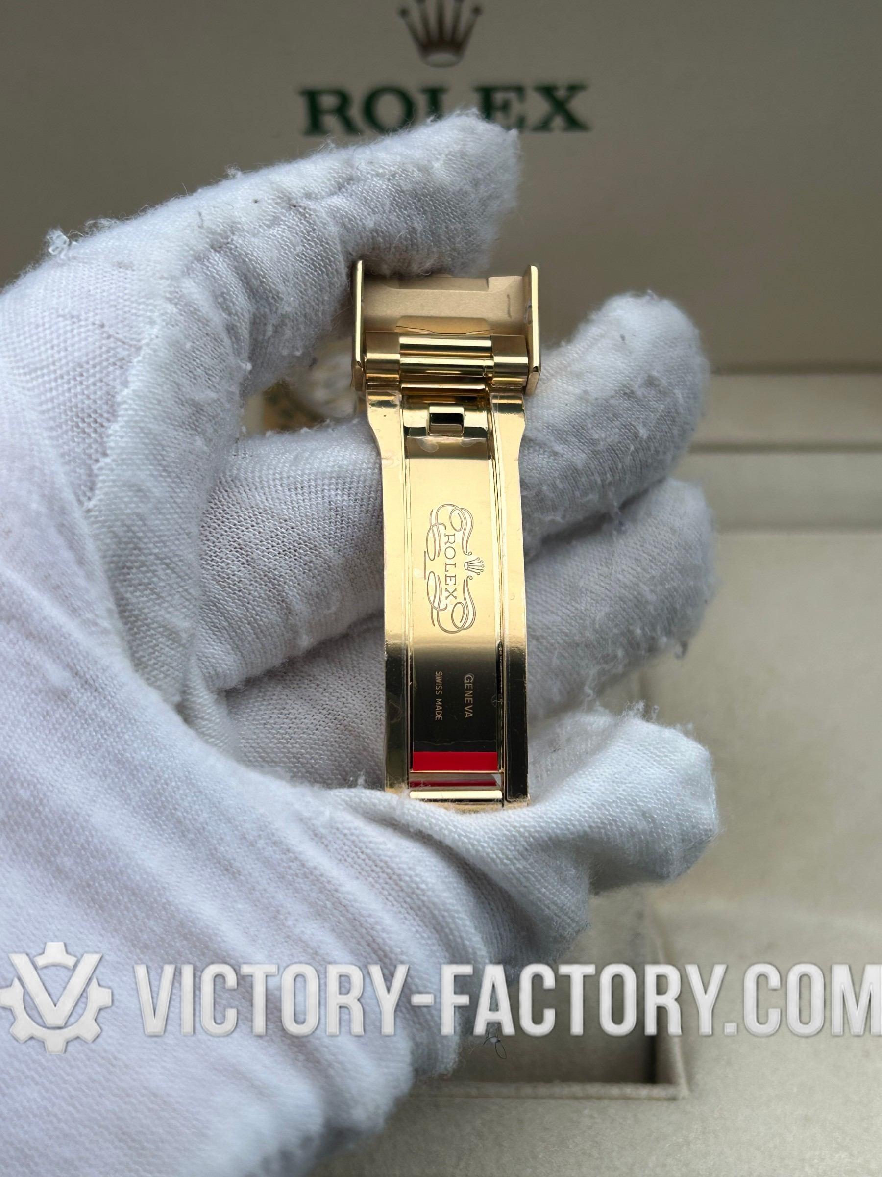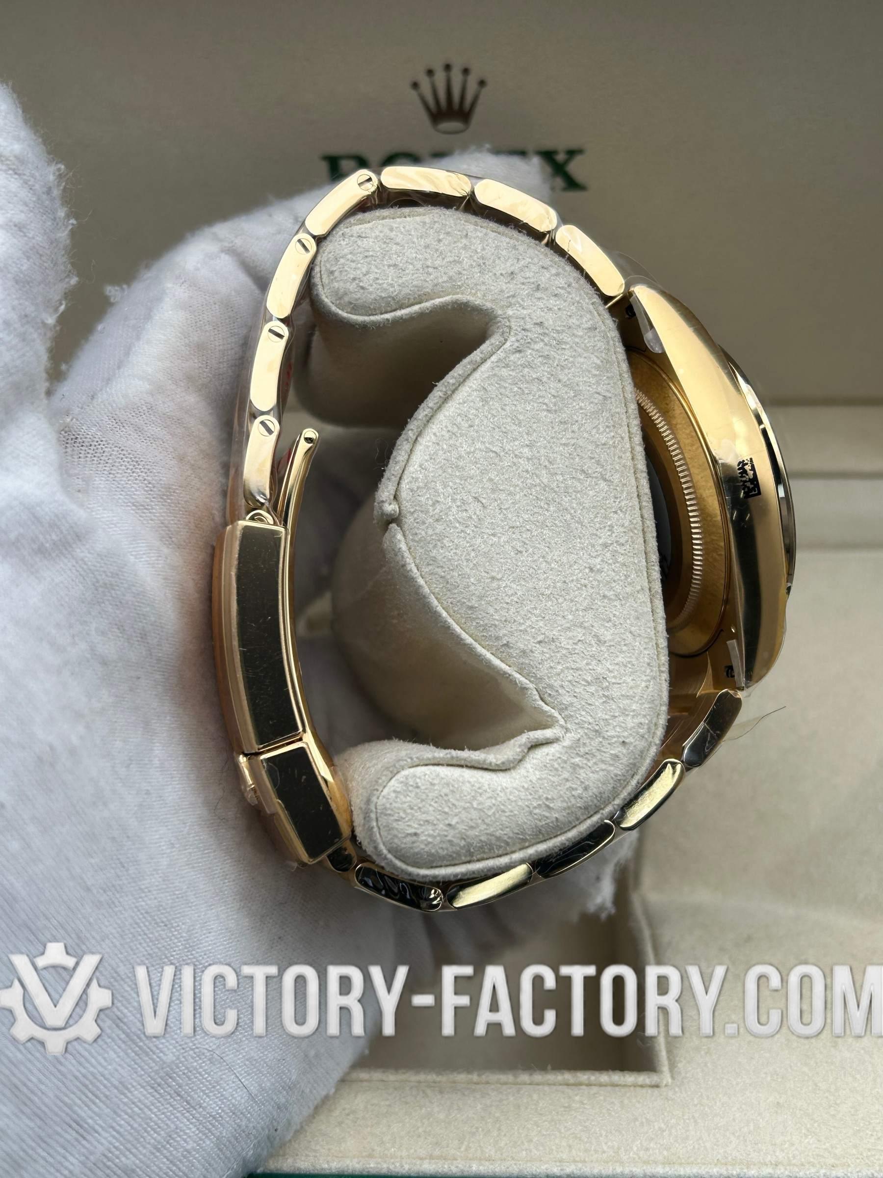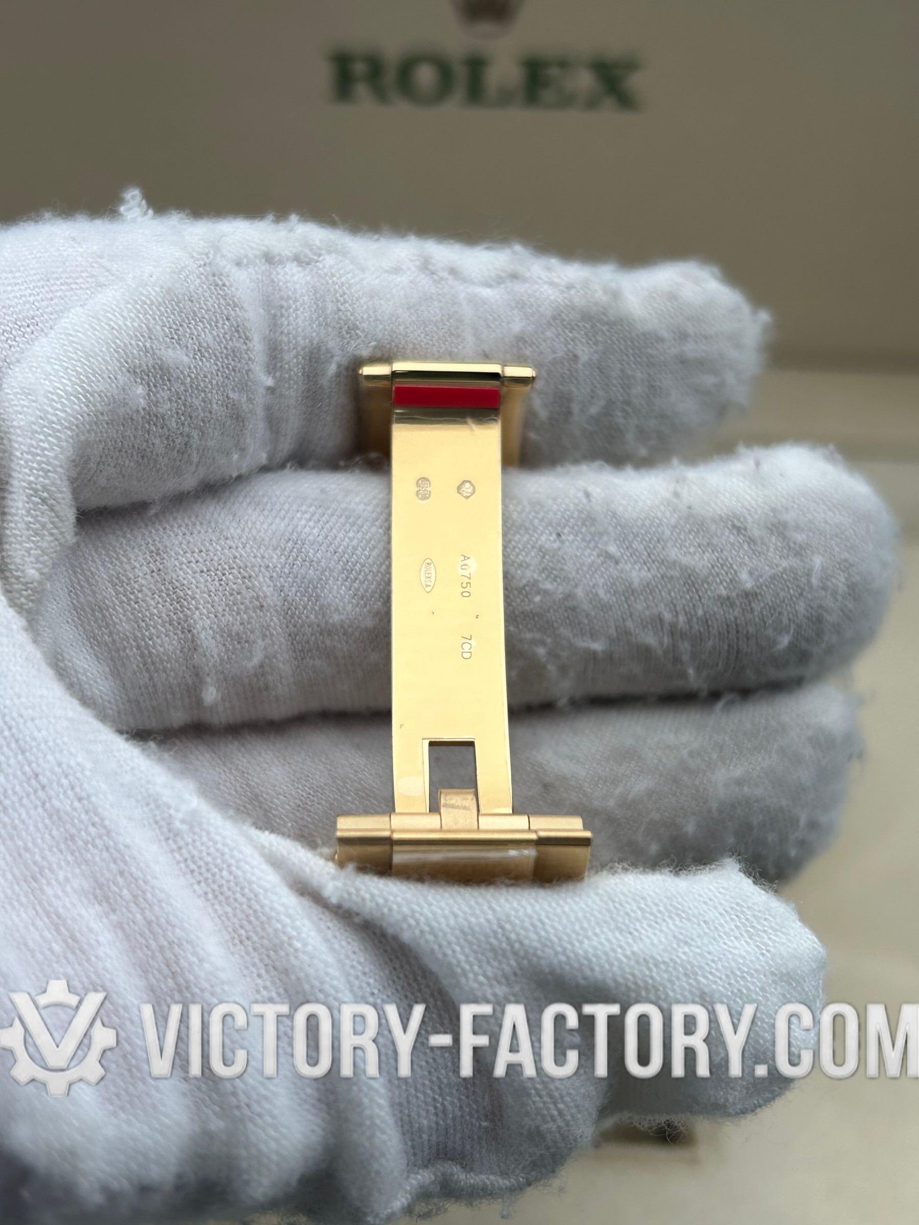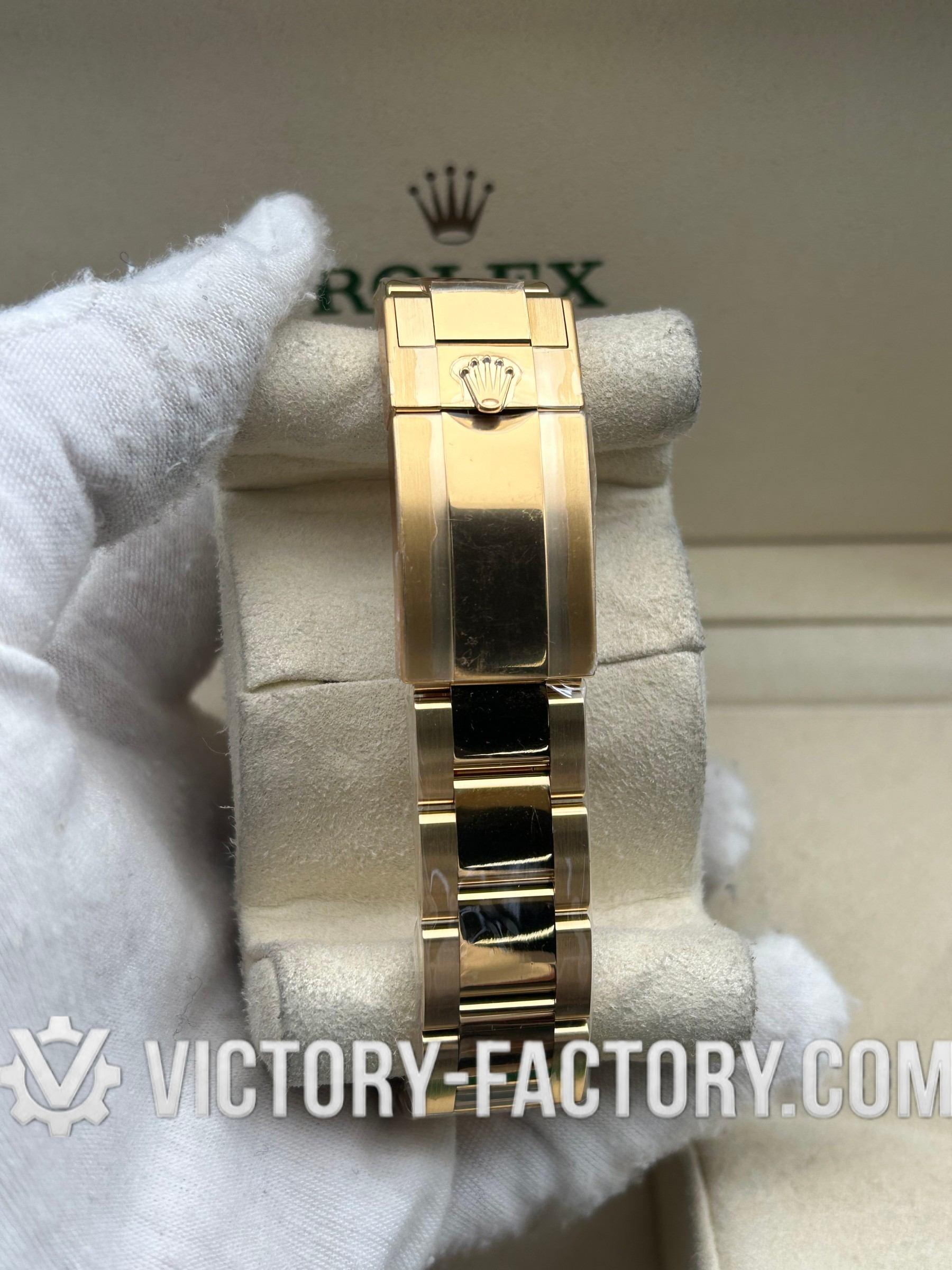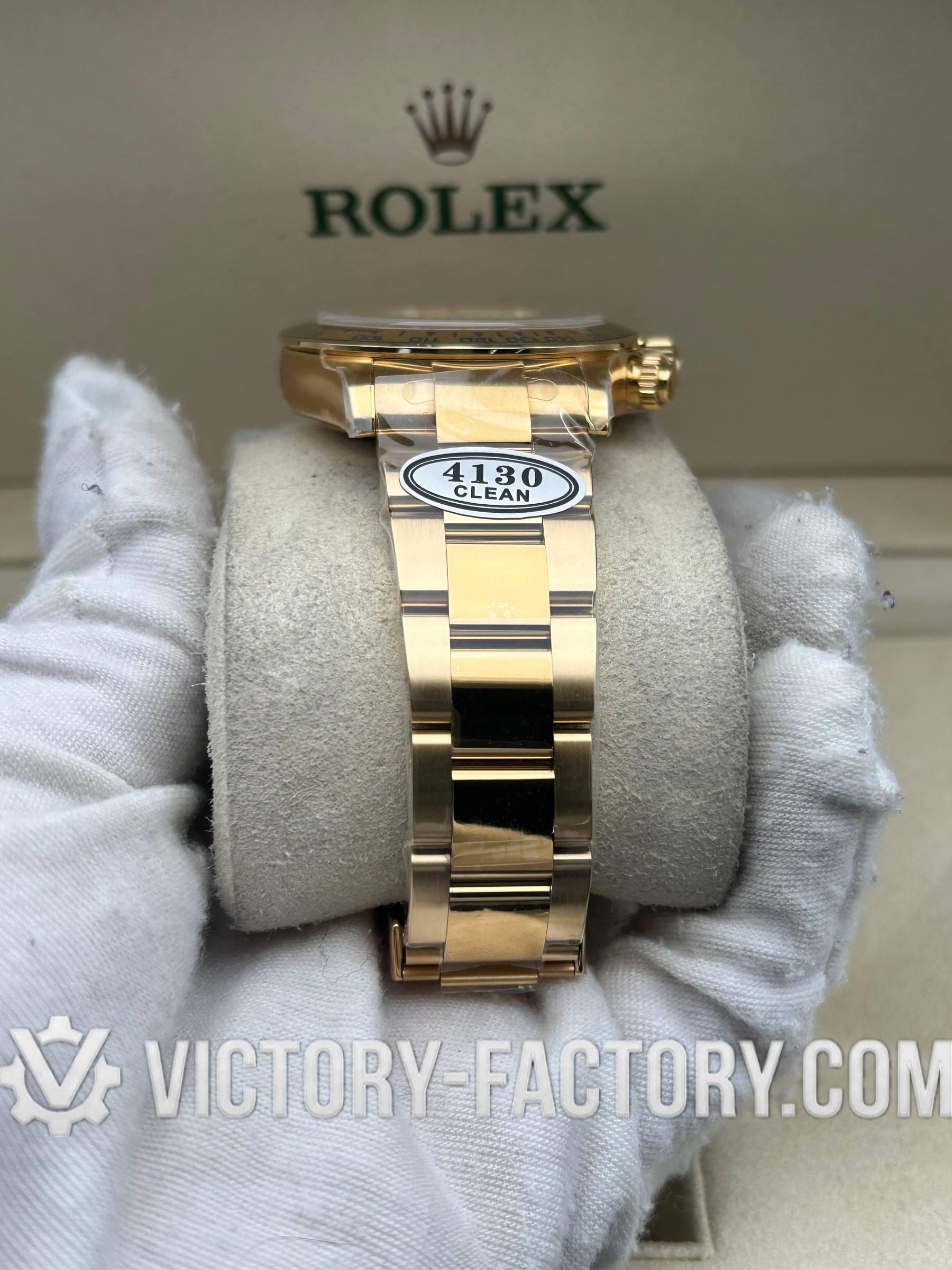 CASE: The 40mm case is made from 18k Yellow Gold wrapped over solid 904L stainless steel, mirroring the original Rolex steel’s monobloc construction. The case is complemented by a screw-down case-back, push-buttons, and a winding crown, all sealed with synthetic rubber for enhanced water resistance. Notable is the ‘ROLEXROLEX’ laser engraving on the Rehaut ring and the DLC scratch-protection coating, ensuring durability. Every dimension of the replica matches the original perfectly, with all parts interchangeable with an authentic Rolex.