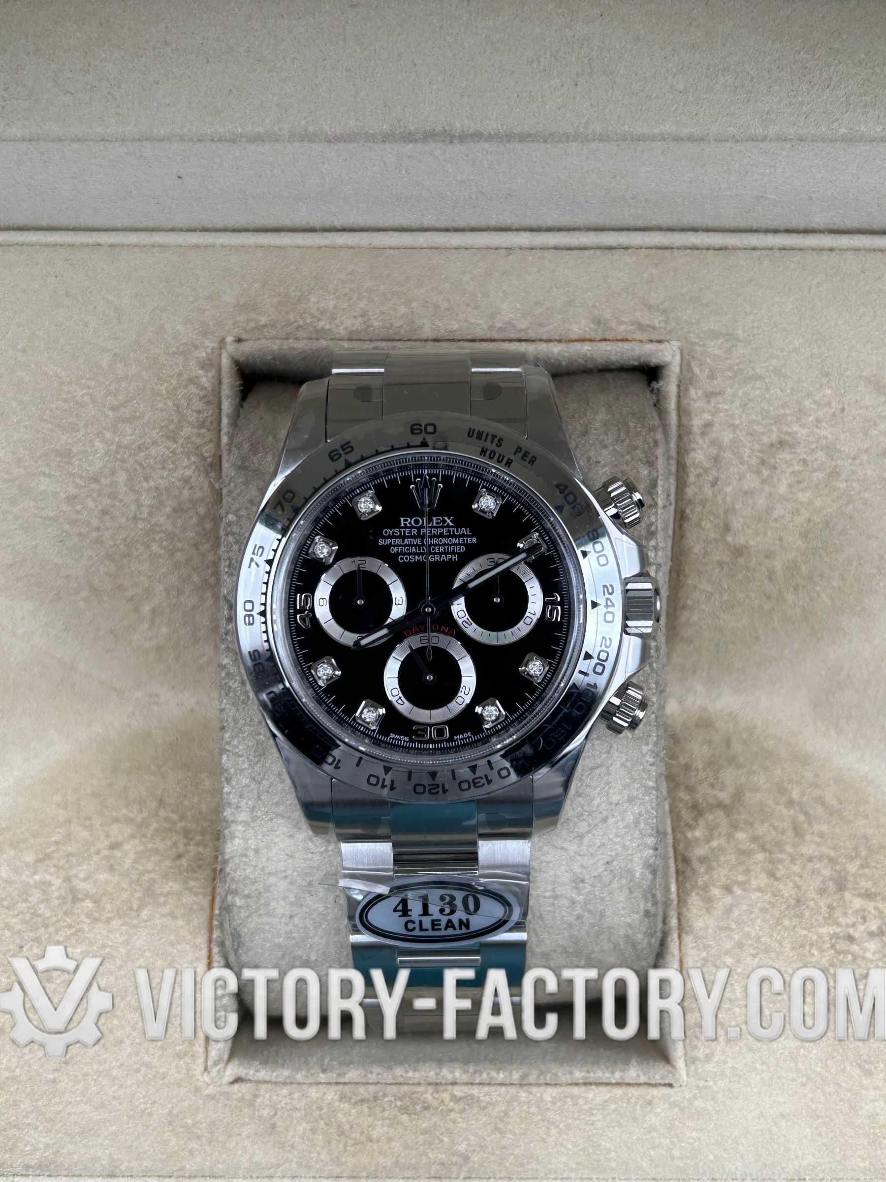 Introduction: Victory Factory (VF) proudly presents the definitive edition of the 116509 Diamond Black Panda Daytona. This masterpiece represents the pinnacle of the super clone industry, seamlessly integrating Clean Factory’s (CF) world-class exterior craftsmanship with the legendary Dandong 4130 Integrated Chronograph movement. For the discerning collector who demands Clean Factory’s aesthetic perfection paired with the unrivaled reliability of a genuine Dandong “heart,” Victory Factory is the undisputed choice.