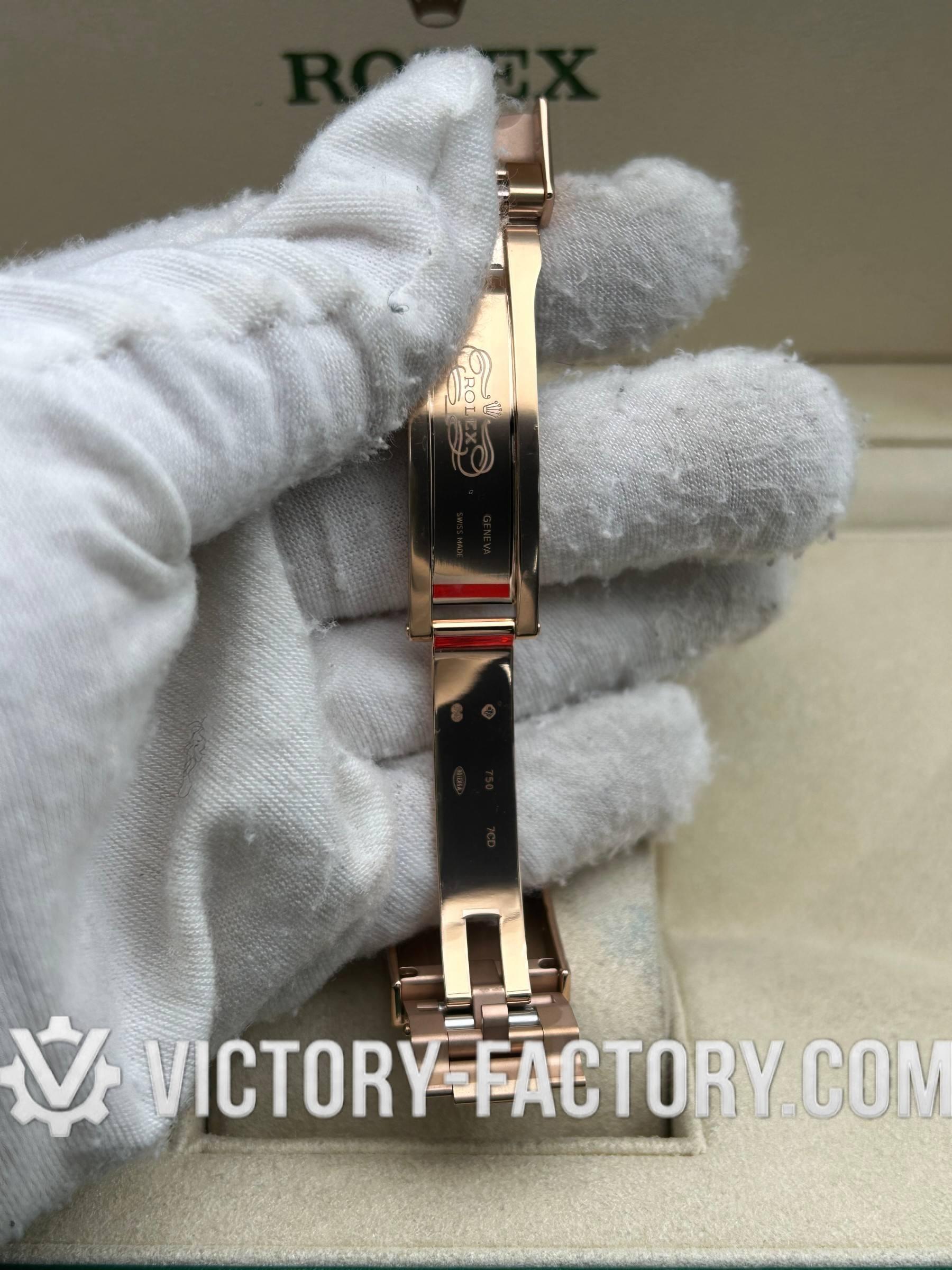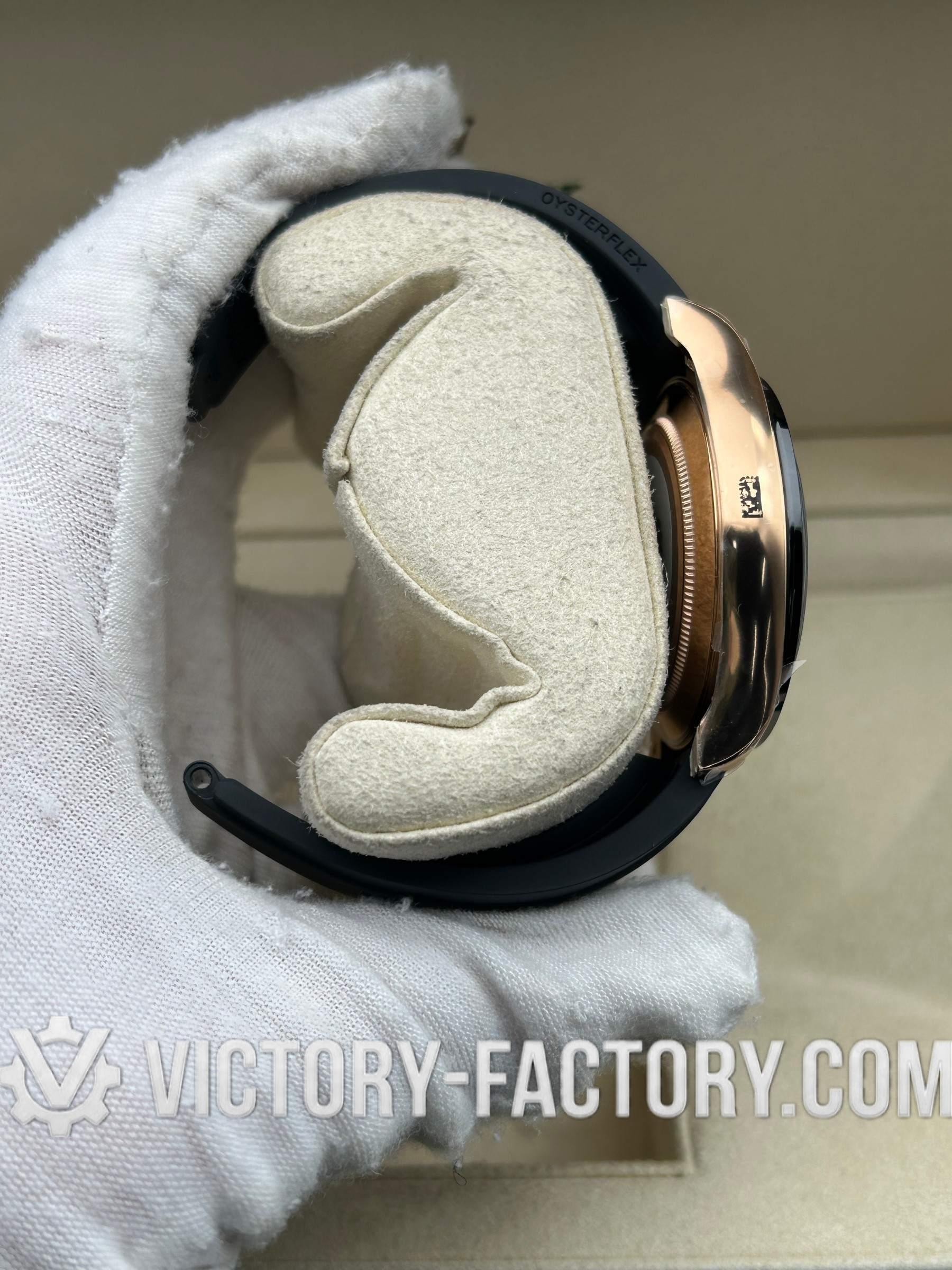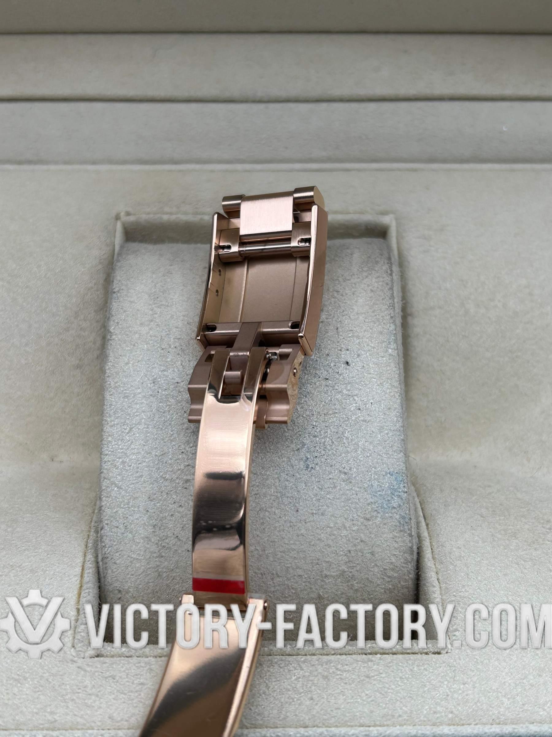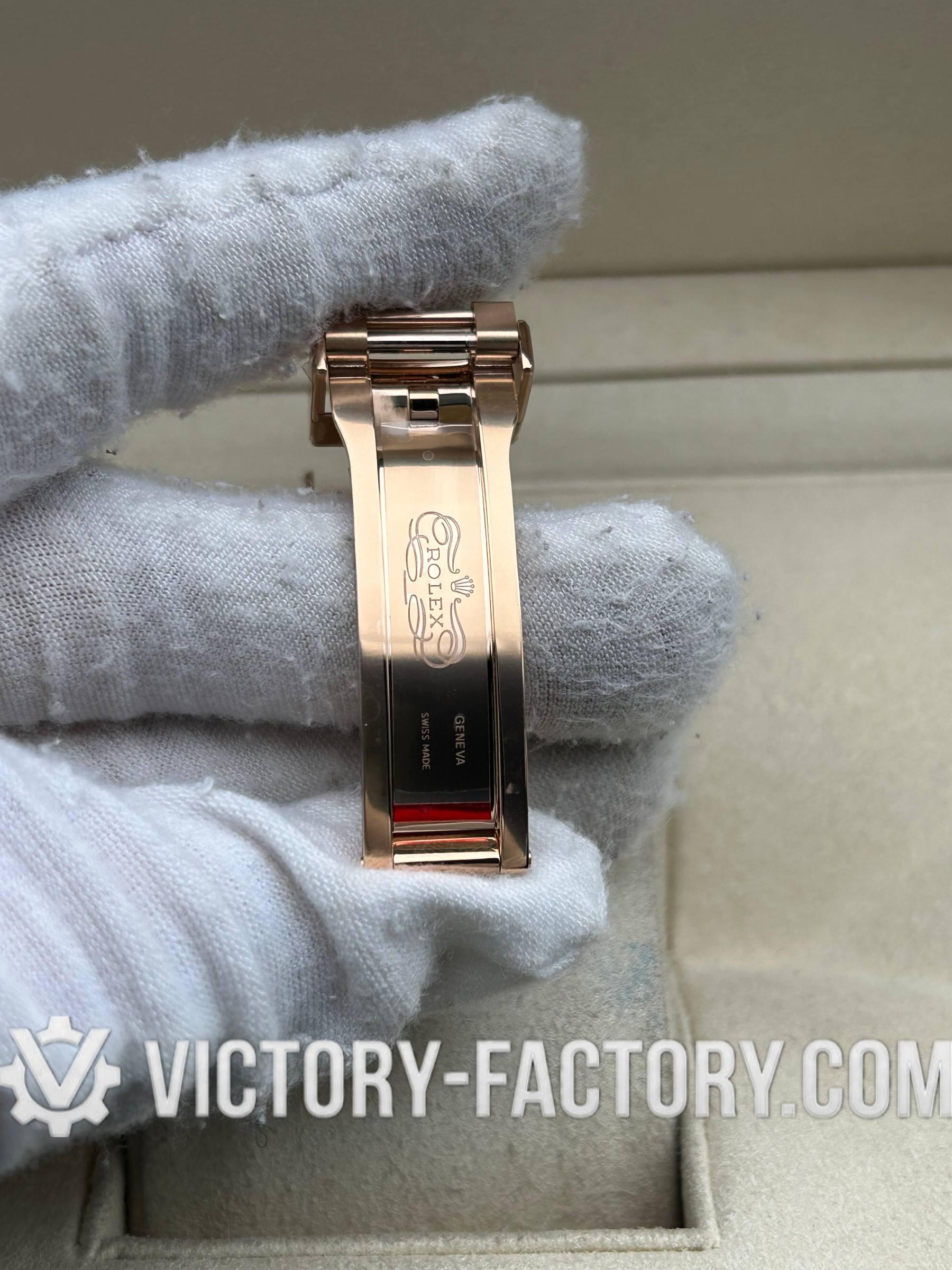 **CASE**: The watch features a 40mm case made from Everose-18k Rose Gold wrapped over solid 904L stainless steel, mirroring the original Rolex steel’s monobloc construction. The case is complemented by a screw-down case-back, push-buttons, and a winding crown, all sealed with synthetic rubber for enhanced water resistance. Notable is the ‘ROLEXROLEX’ laser engraving on the Rehaut ring and the DLC scratch-protection coating, ensuring durability. Every dimension of the replica matches the original perfectly, with all parts interchangeable with an authentic Rolex.