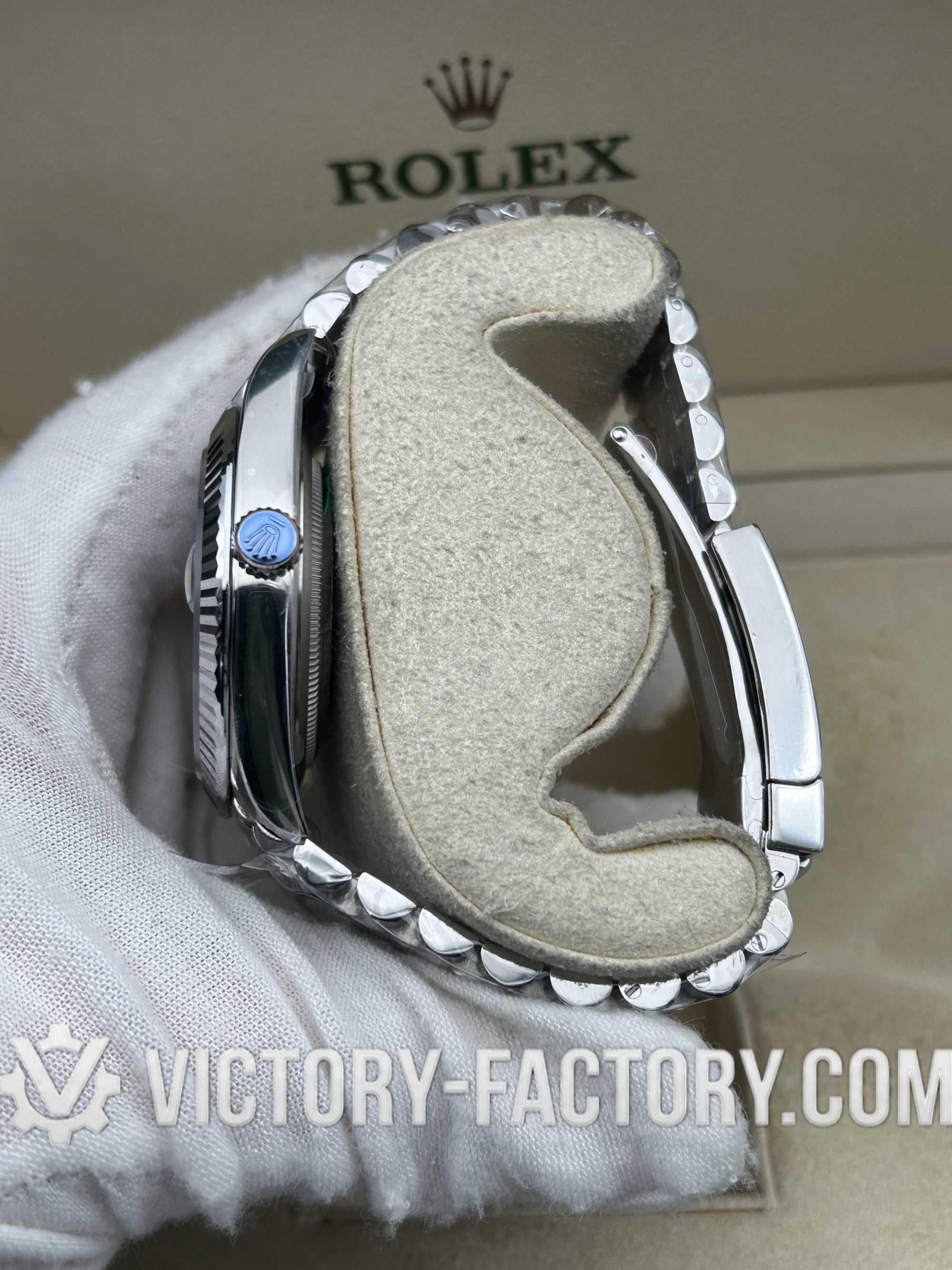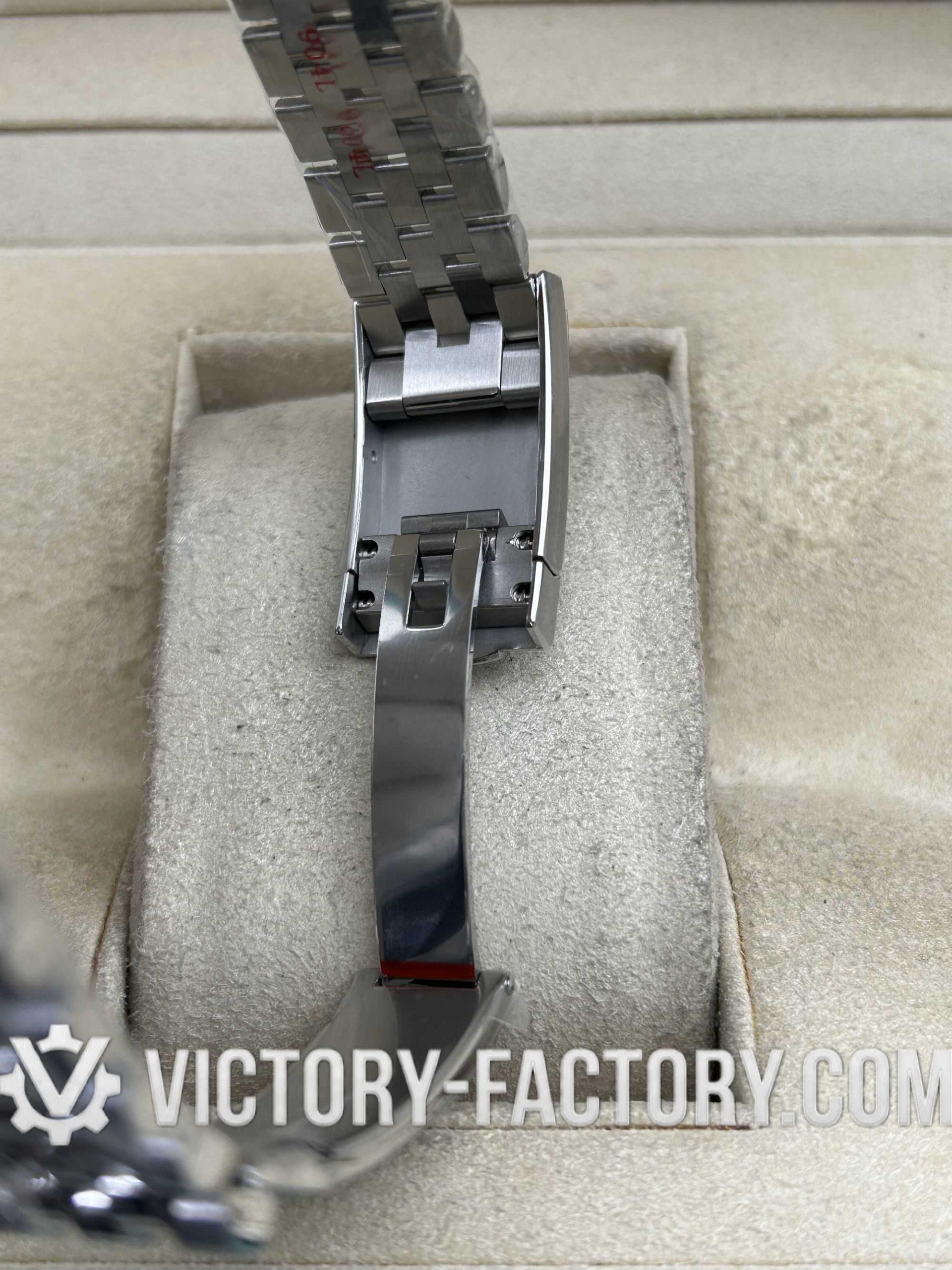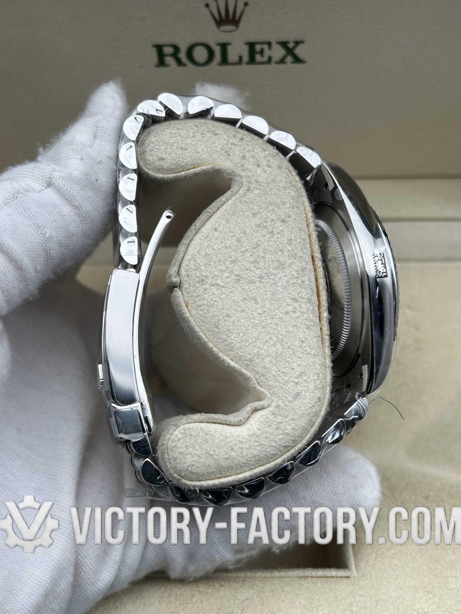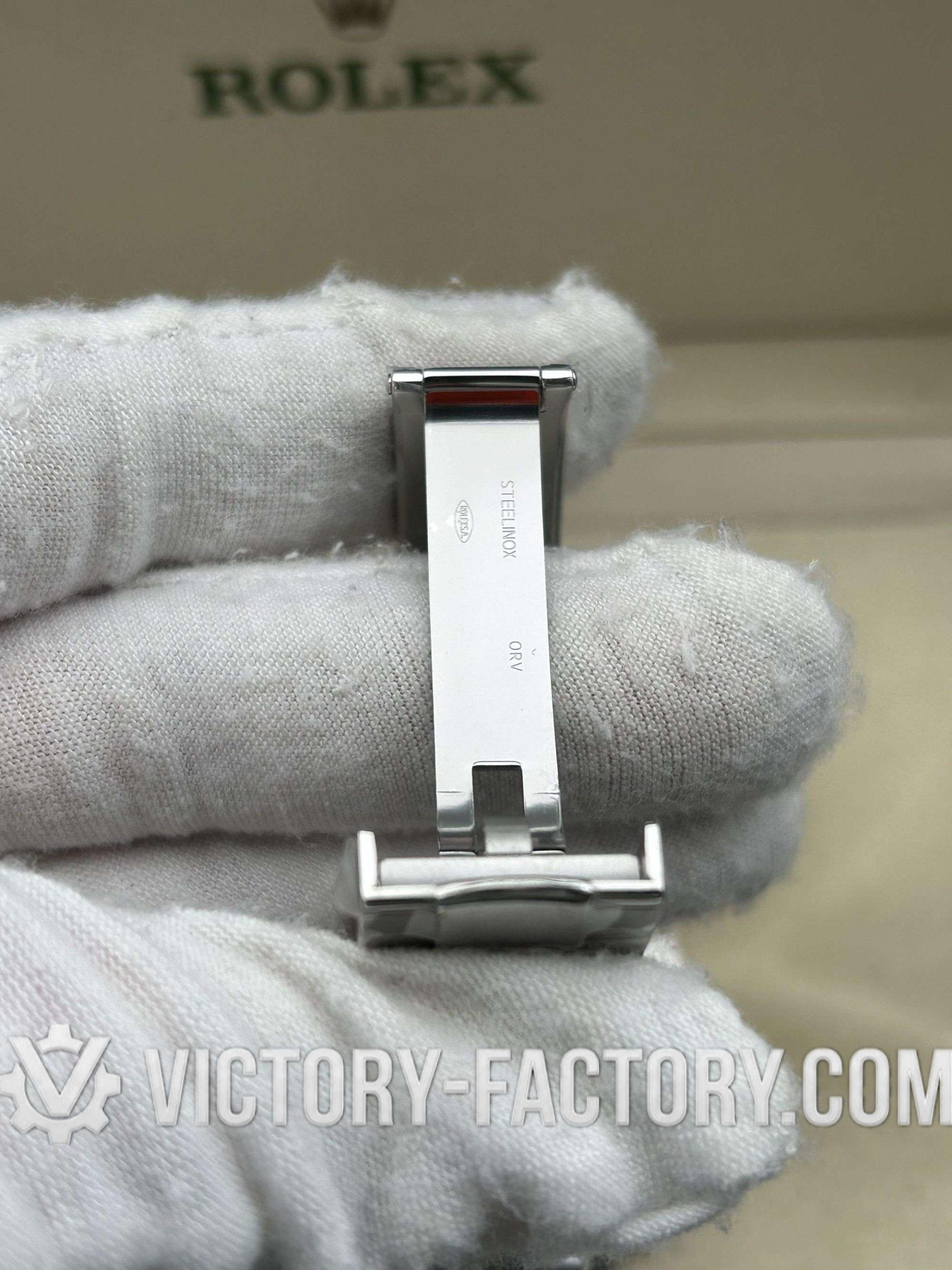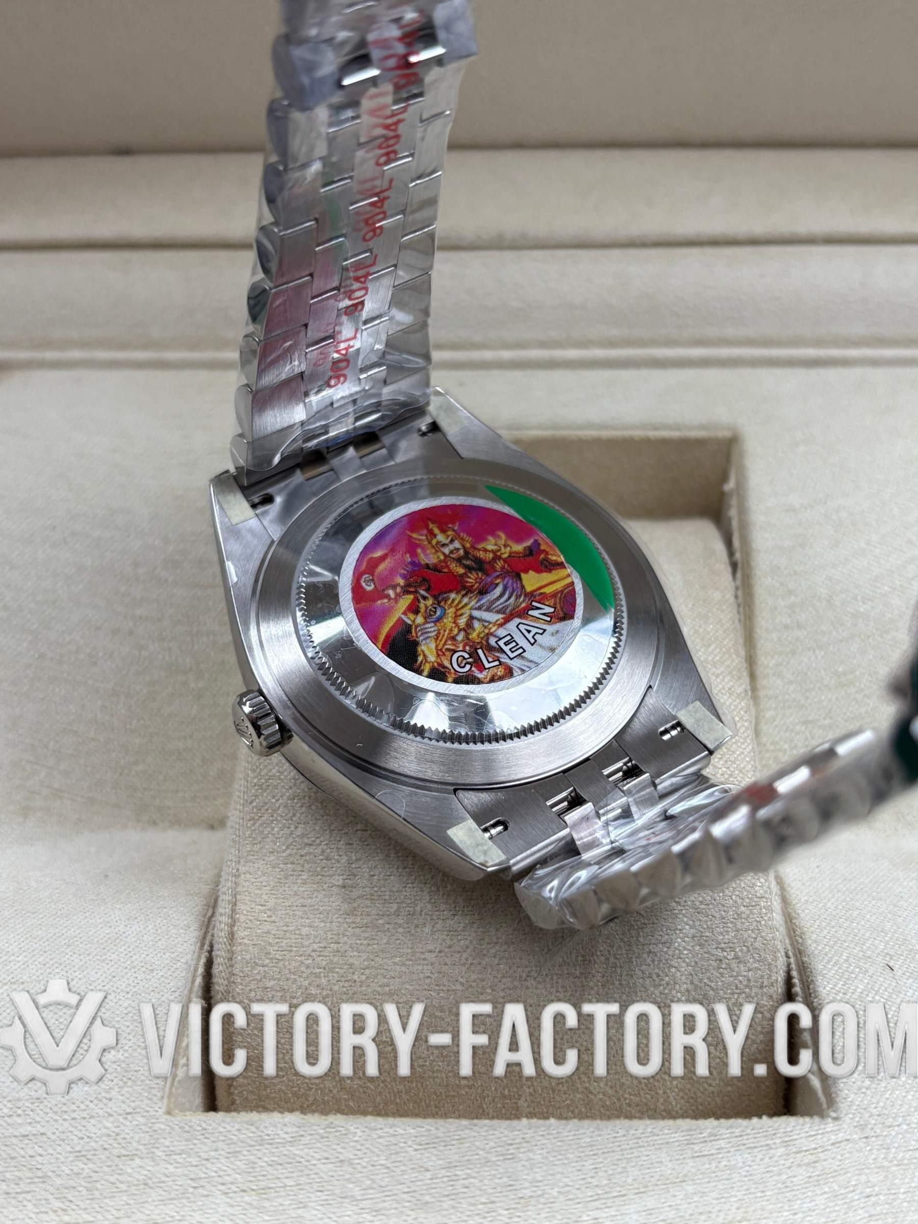 CASE: Our Victory Factory Super Clone features a 41mm solid 904L stainless steel construction, ensuring an exact match to genuine Rolex steel density and luster. It includes a screw-down case-back and a Twinlock double waterproofness system crown. Every dimension is replicated to a 1:1 ratio, allowing for seamless part interchangeability with genuine components.