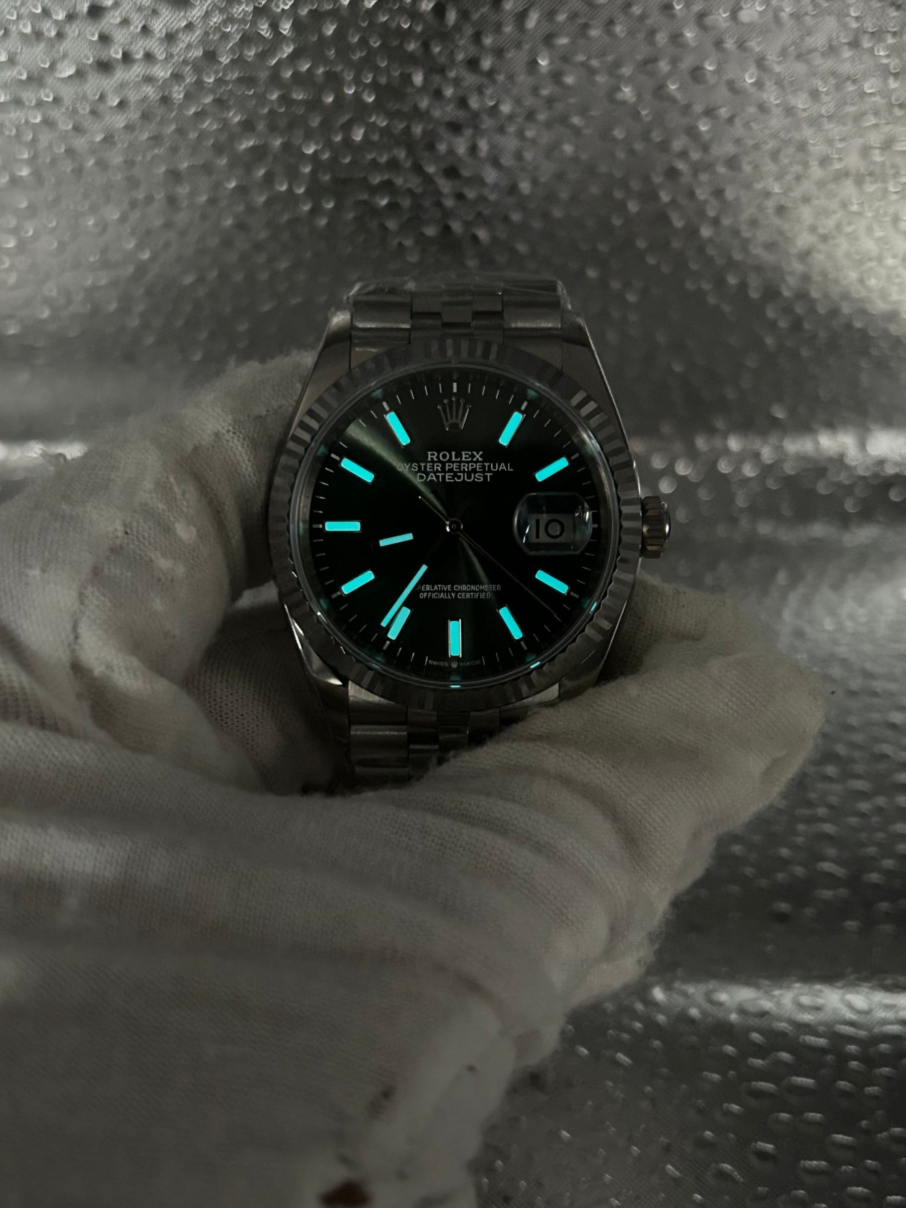 • The signature fluted bezel is made from solid 904L stainless steel and wrapped in 18k White Gold.