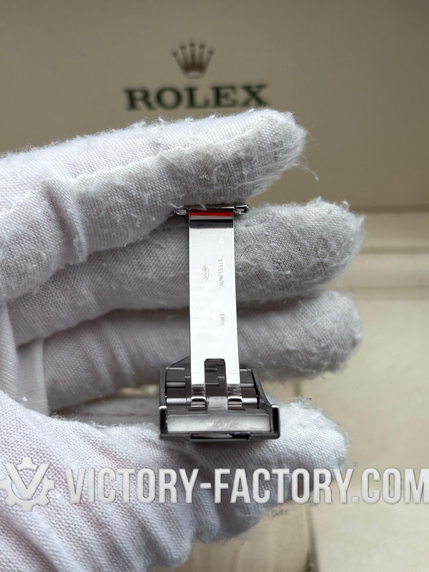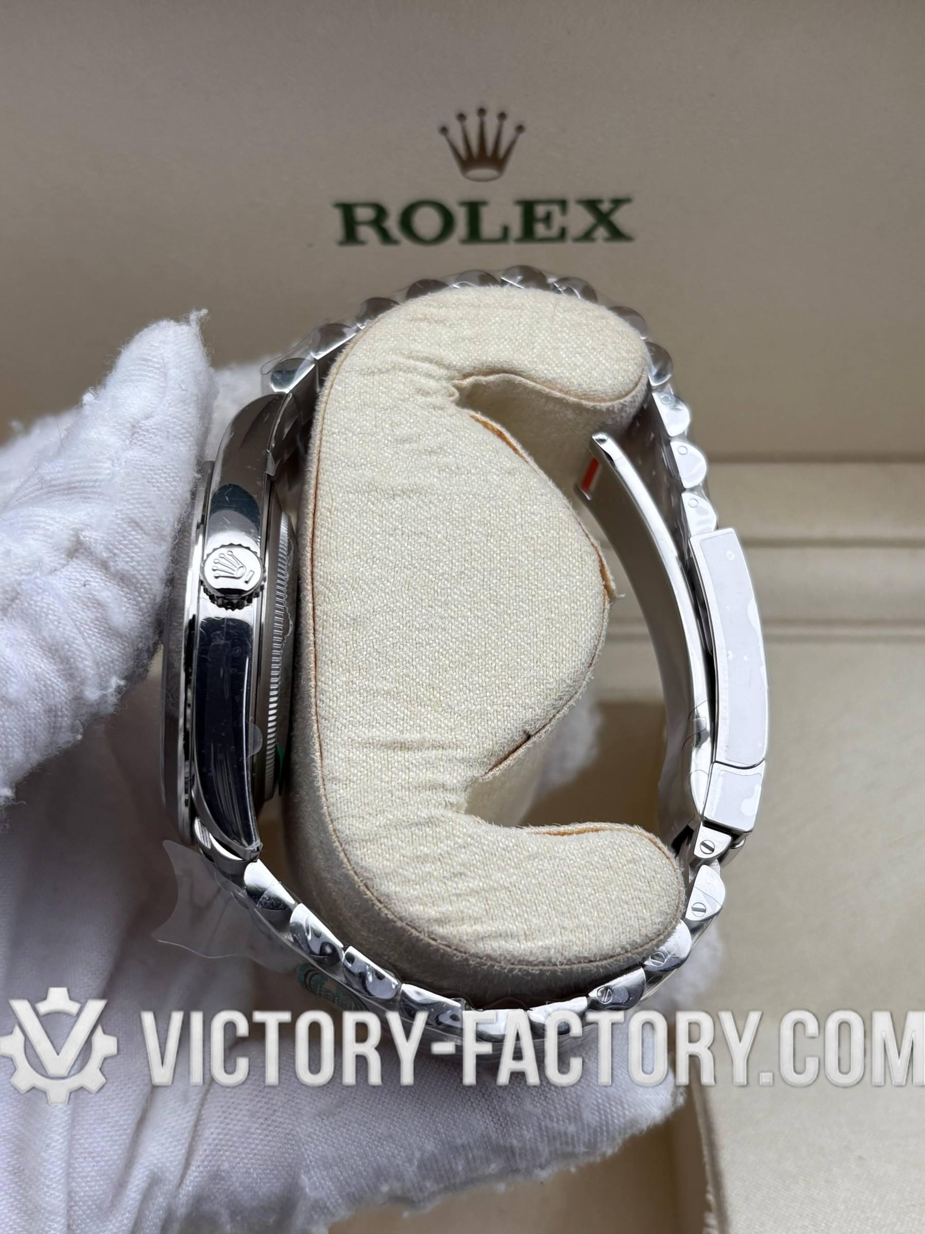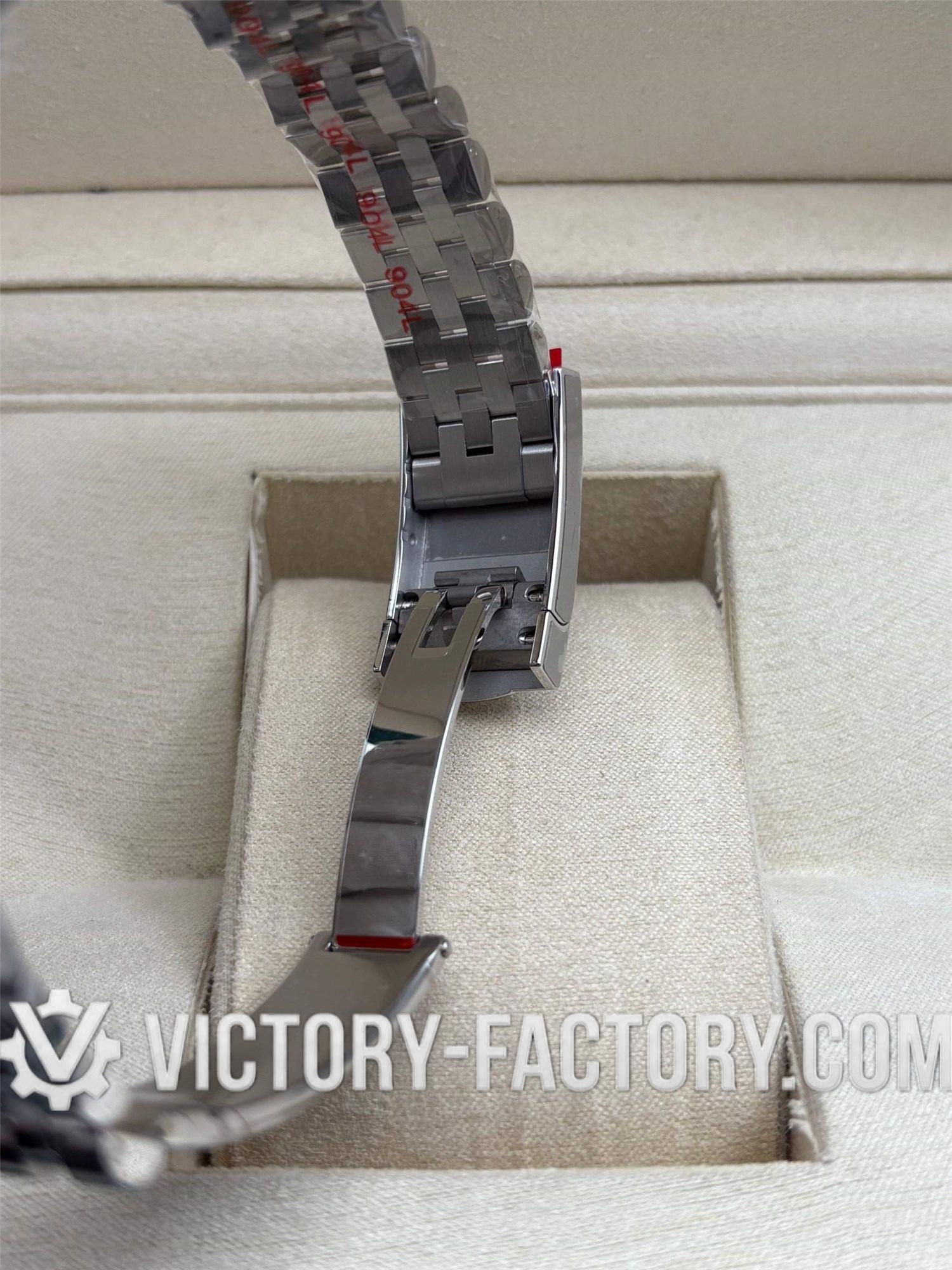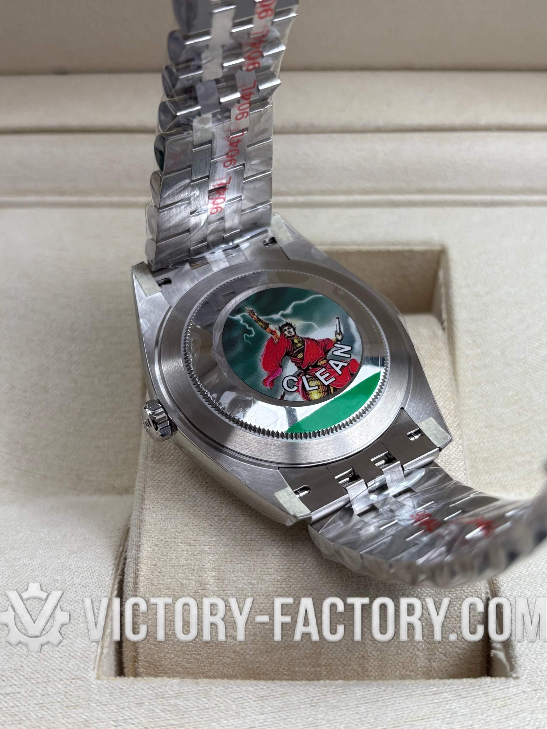 CASE: Our Victory Factory Super Clone features a 41mm solid 904L stainless steel construction, ensuring an exact match to genuine Rolex 904L steel. It includes a screw-down case-back and a Twinlock double waterproofness system winding crown for superior water resistance. Every detail, including the ROLEX laser engraving on the Rehaut ring and a DLC scratch-protection coating, is faithfully replicated for 100% part interchangeability.