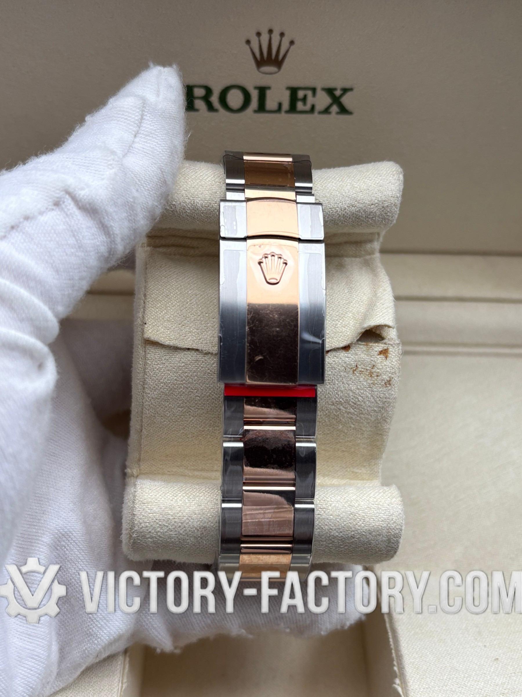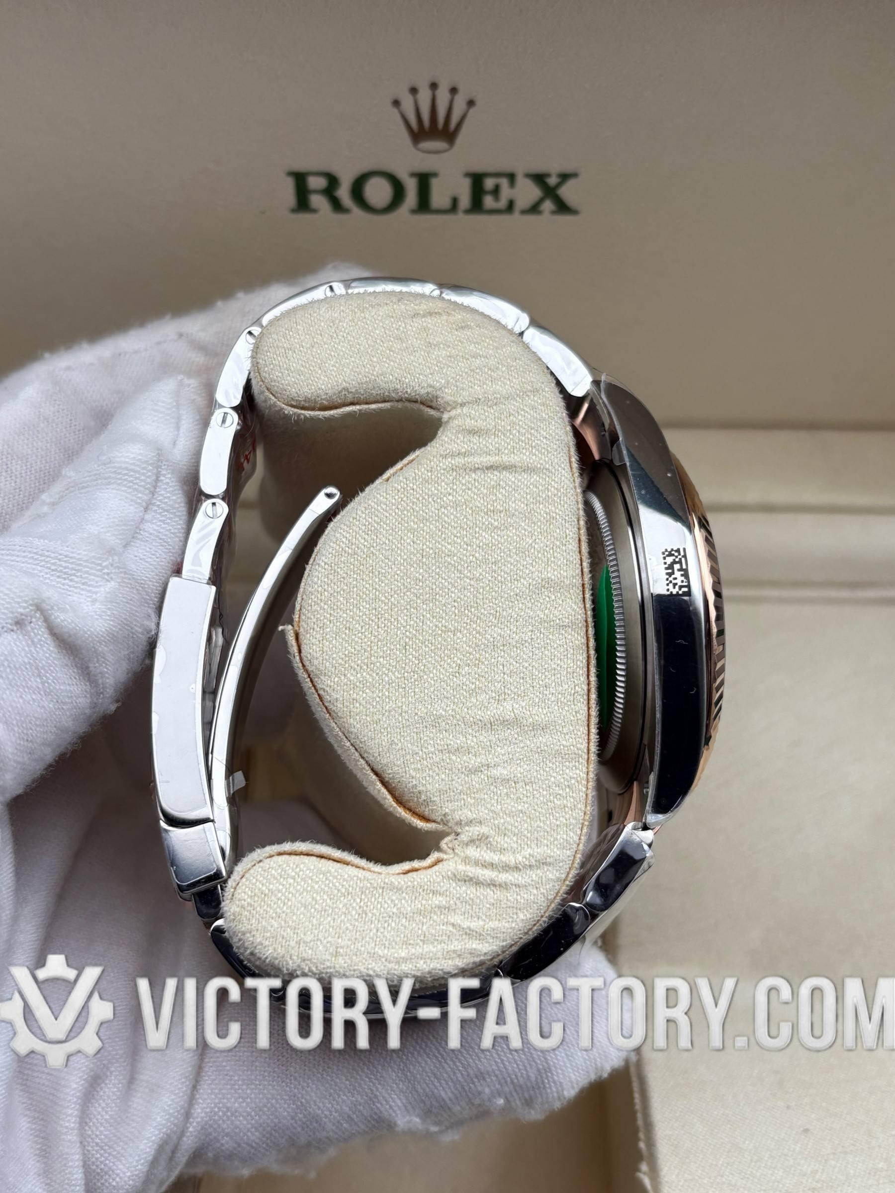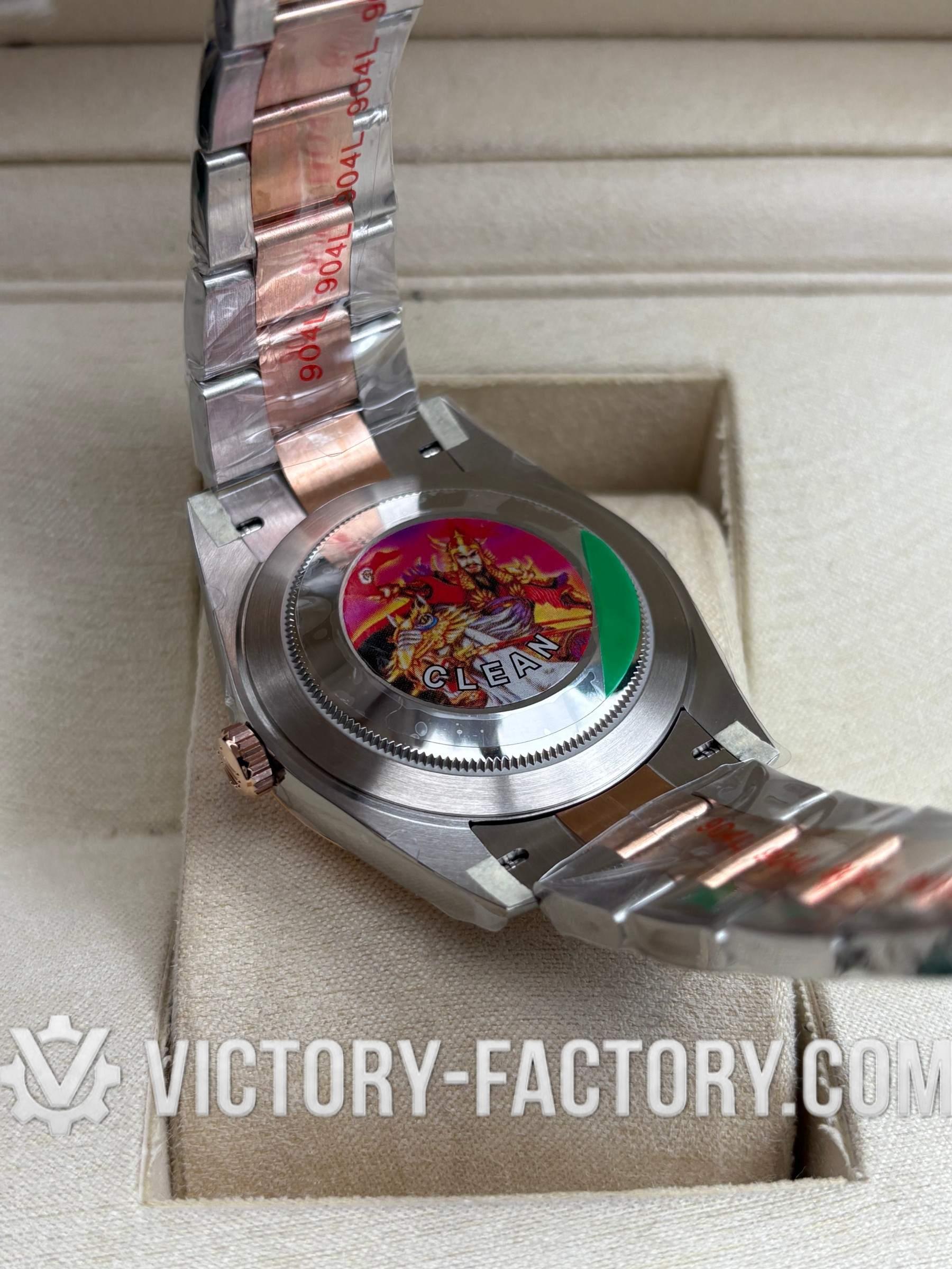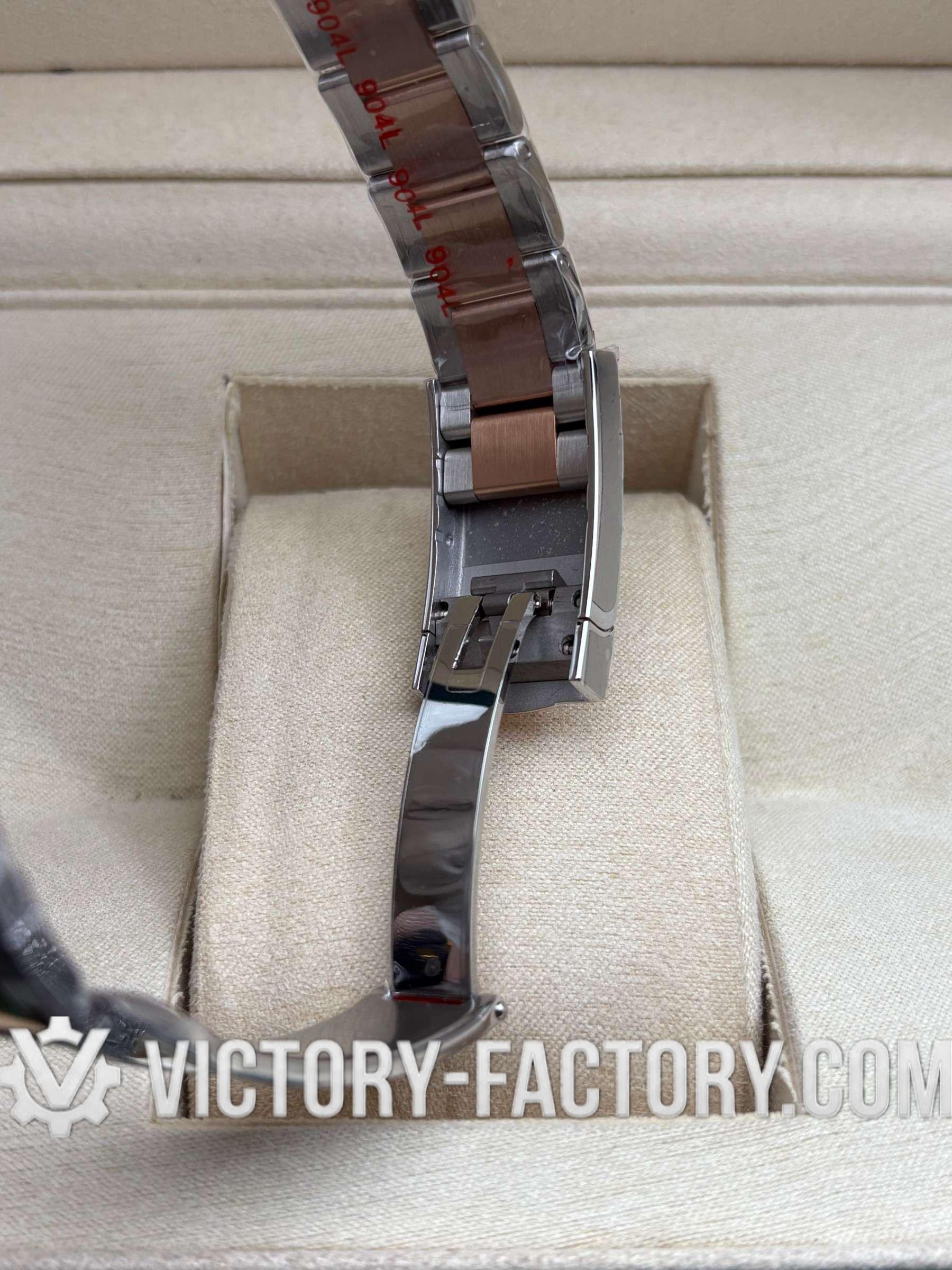 CASE: Victory Factory presents the 41mm 2-tone 18k Rose Gold wrapped Solid 904L Stainless steel case, mirroring the authentic Rolex 904L steel in a monobloc construction. It includes a screw-down case-back and Twinlock double waterproofness system screw-down winding crown for superior protection. The case features the iconic ROLEXROLEX laser engraving on the Rehaut ring and is protected by a DLC scratch-protection coating. Every detail is faithfully replicated to be 100% identical to genuine Rolex watches, allowing for seamless part interchangeability.
