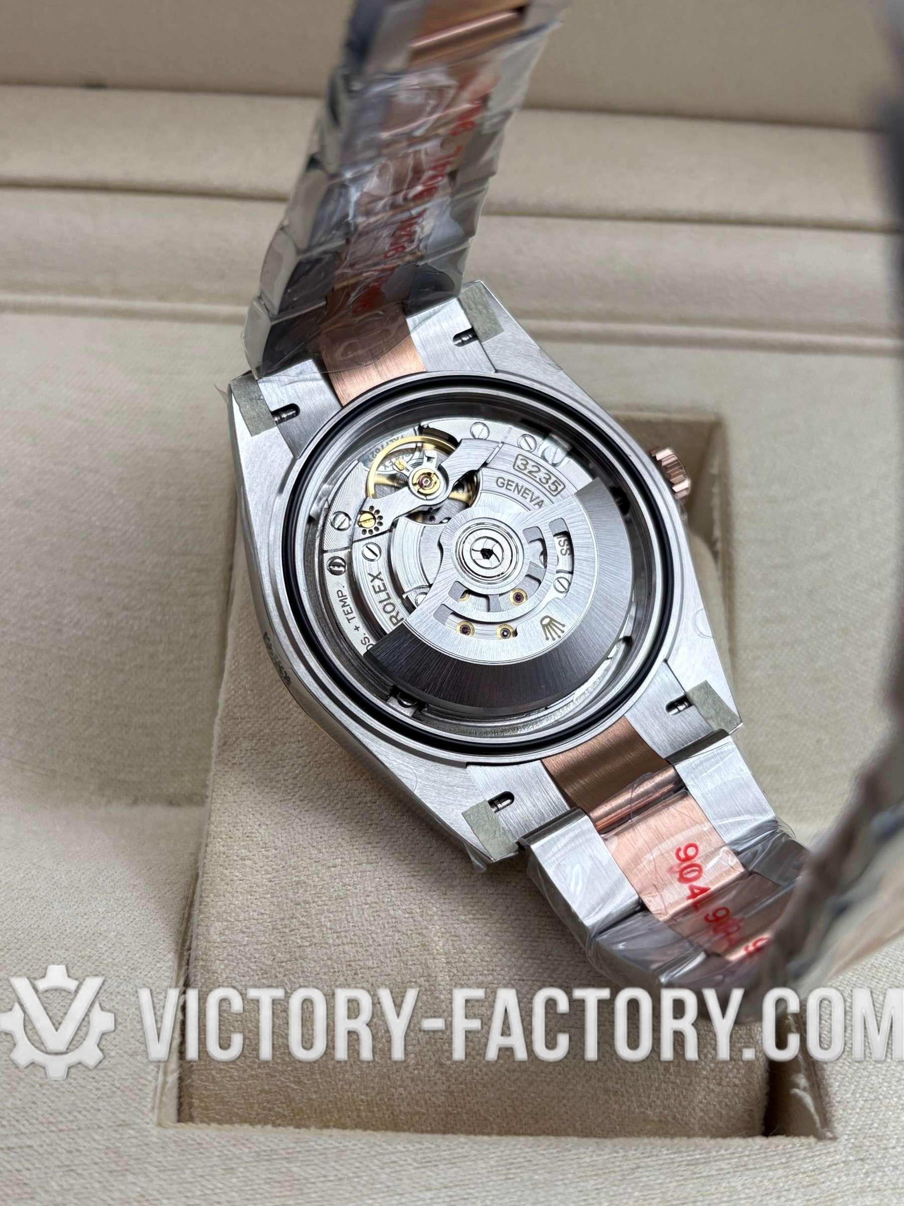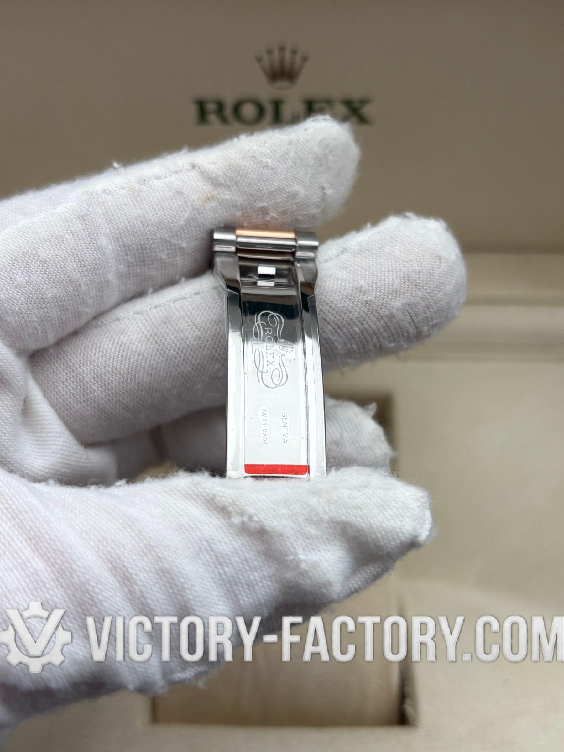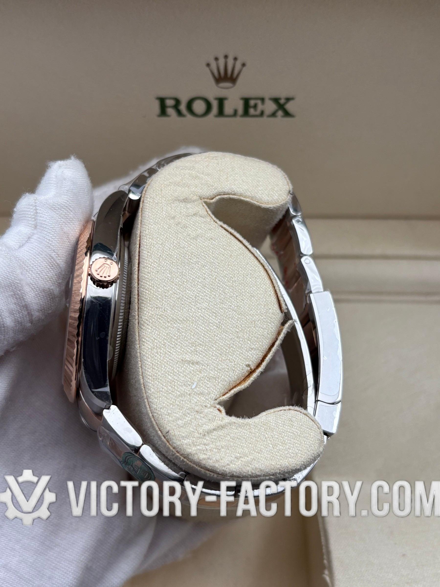 CASE: Victory Factory presents the 41mm 2-tone 18k Rose Gold wrapped Solid 904L Stainless steel case, mirroring the authentic Rolex 904L steel in a monobloc construction. It includes a screw-down case-back and Twinlock double waterproofness system screw-down winding crown for superior protection. The case features the iconic ROLEXROLEX laser engraving on the Rehaut ring and is protected by a DLC scratch-protection coating. Every detail is faithfully replicated to be 100% identical to genuine Rolex watches, allowing for seamless part interchangeability.