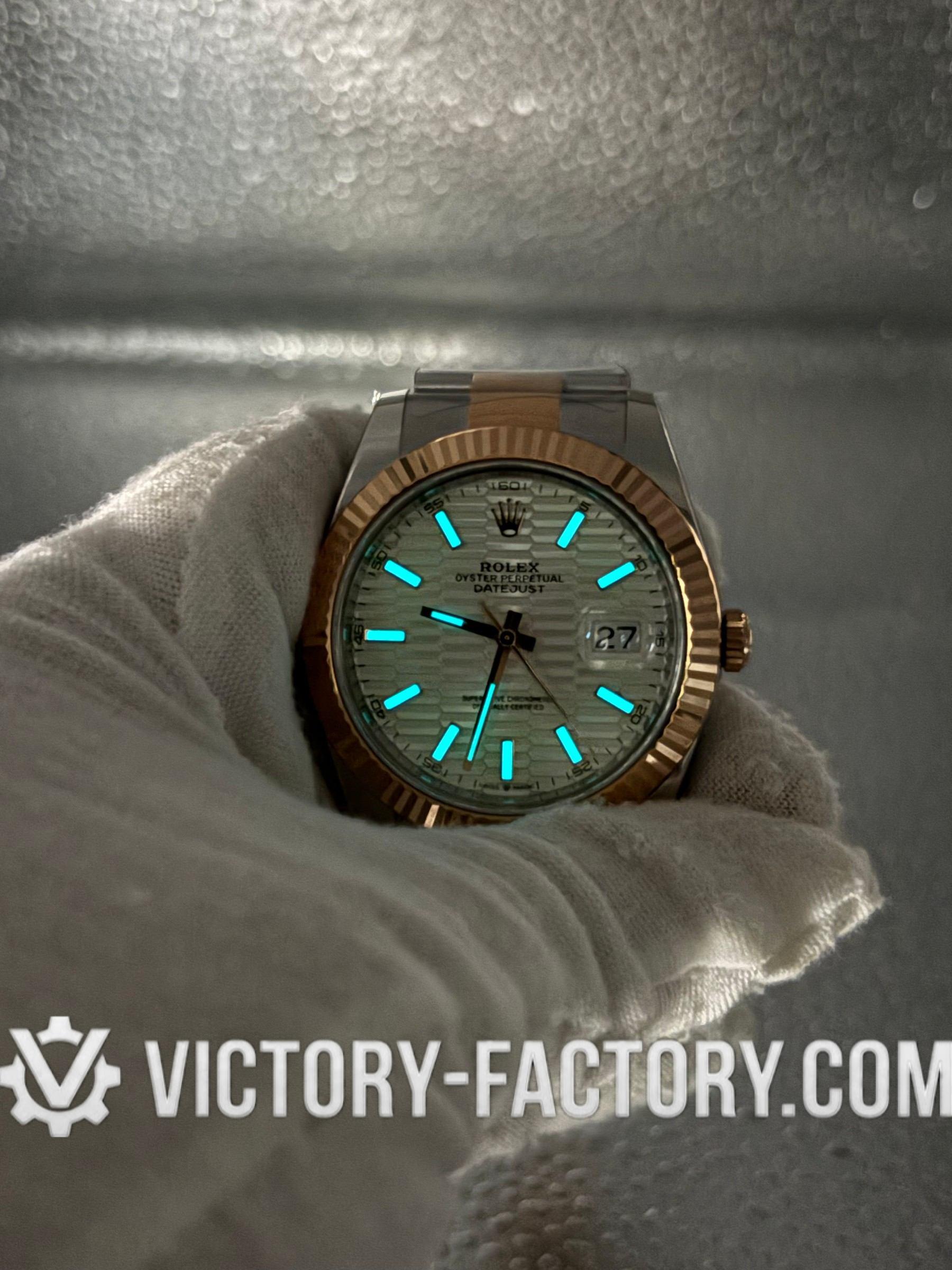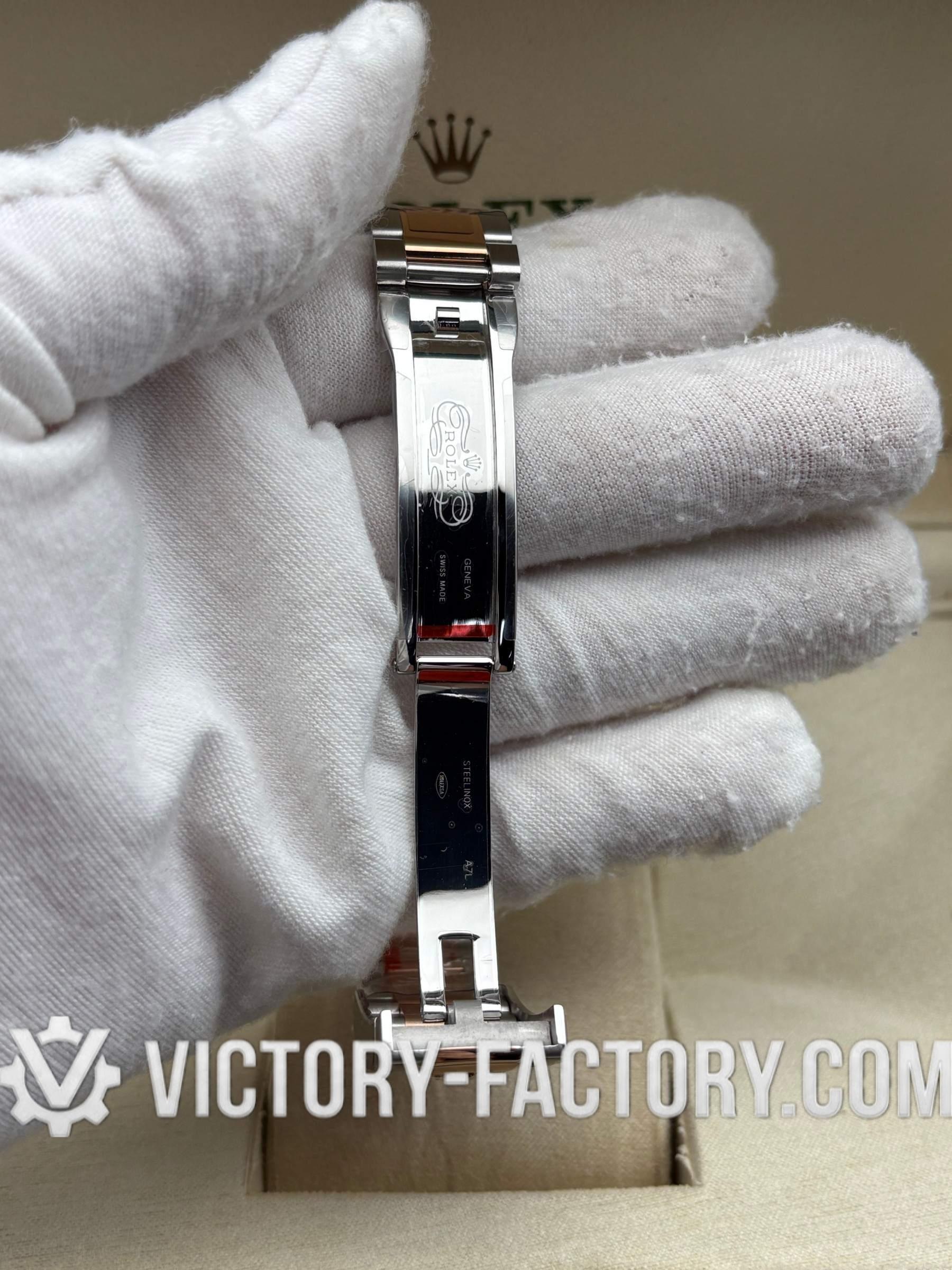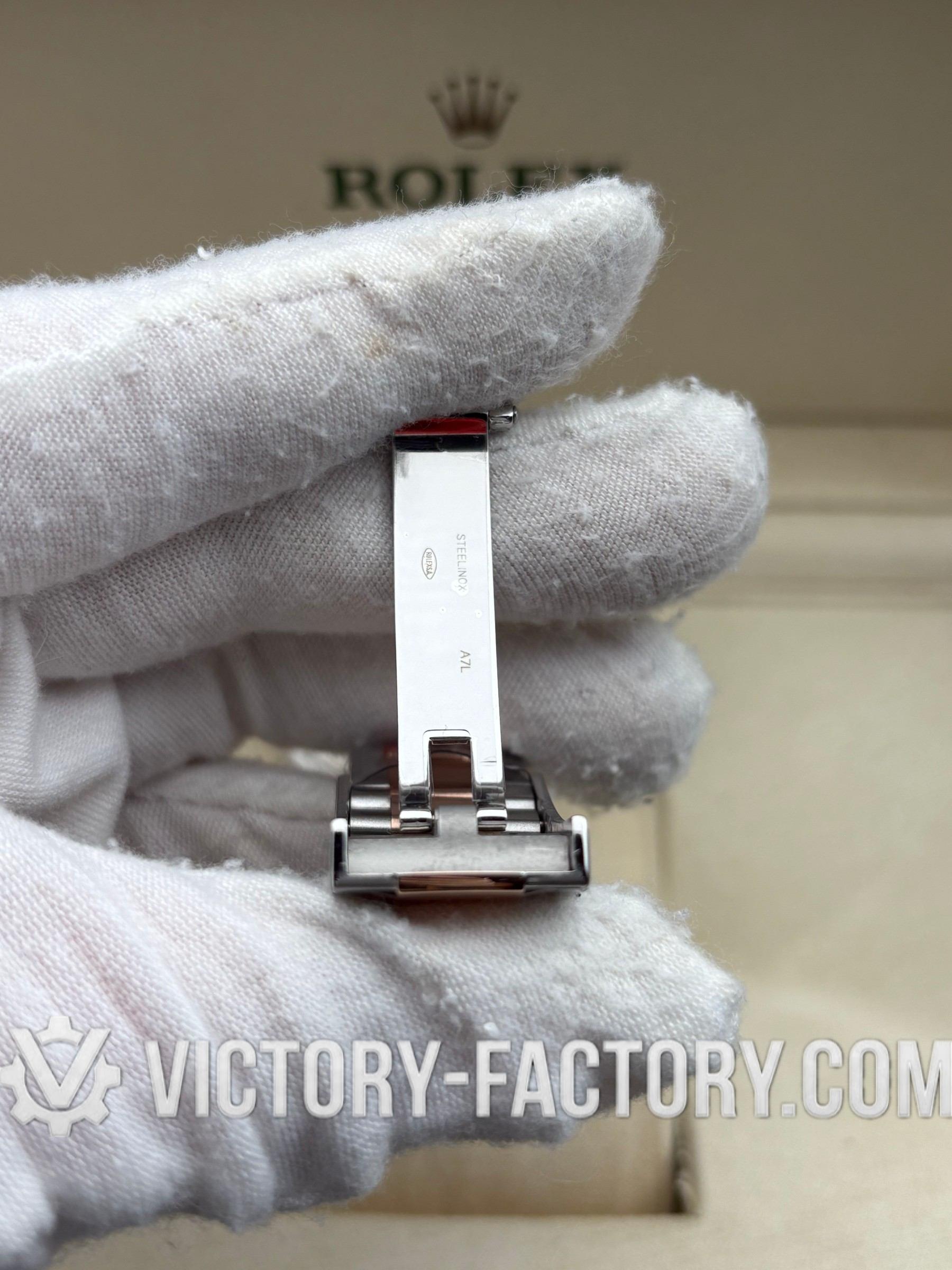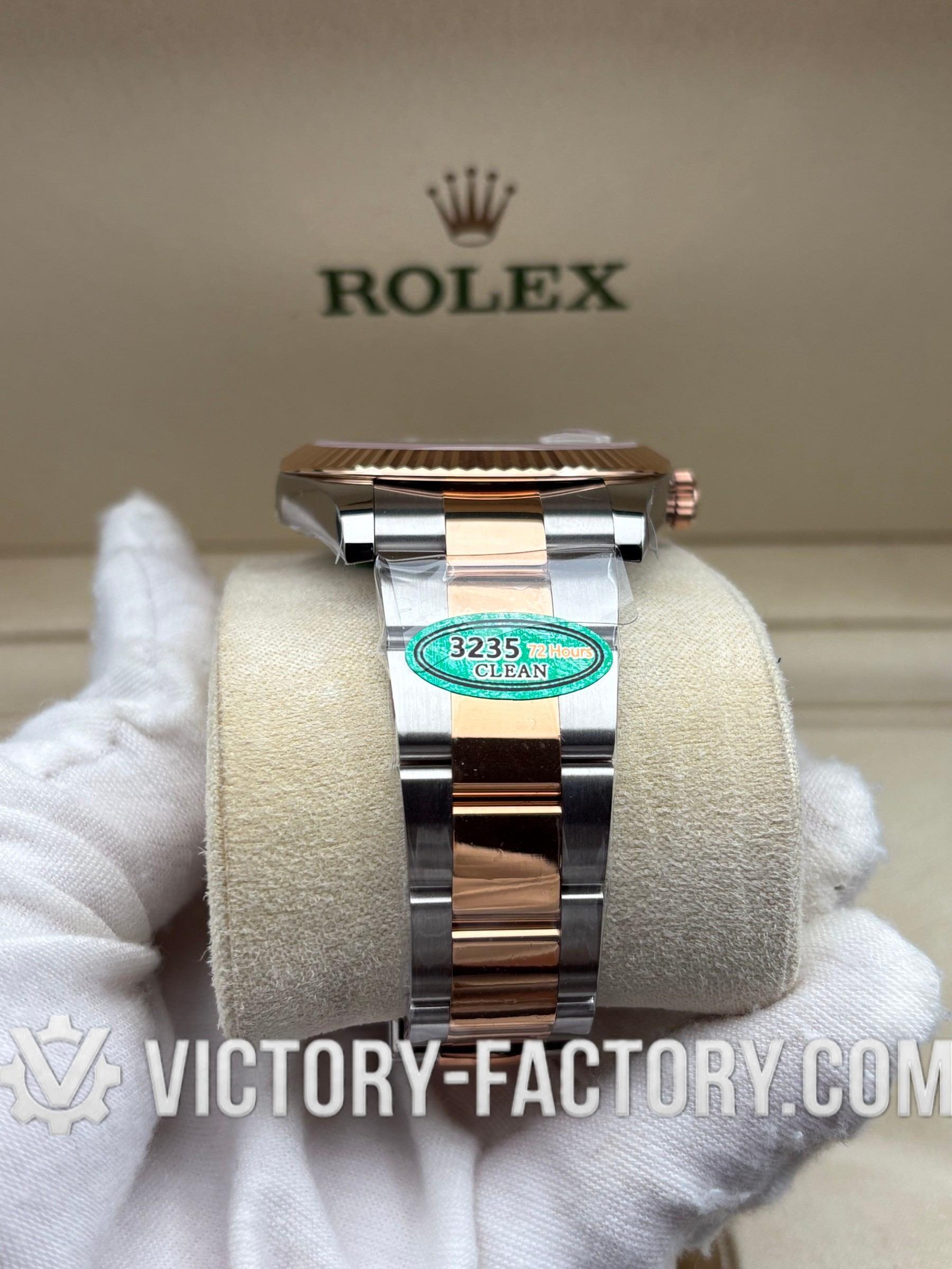 CASE: Victory Factory presents the 41mm 2-tone 18k Rose Gold wrapped Solid 904L Stainless steel case, mirroring the authentic Rolex 904L steel in a monobloc construction. It includes a screw-down case-back and Twinlock double waterproofness system screw-down winding crown for superior protection. The case features the iconic ROLEXROLEX laser engraving on the Rehaut ring and is protected by a DLC scratch-protection coating. Every detail is faithfully replicated to be 100% identical to genuine Rolex watches, allowing for seamless part interchangeability.