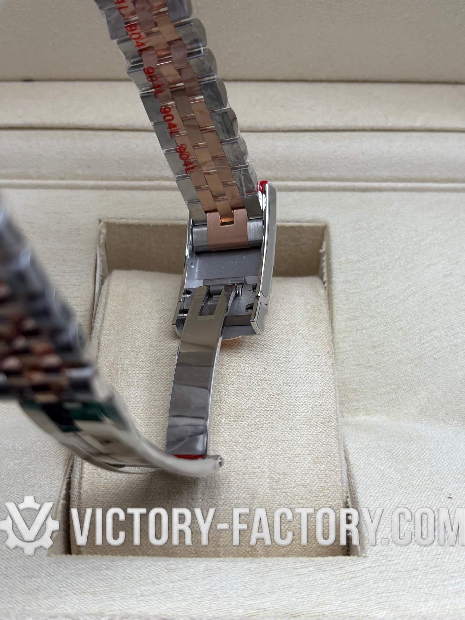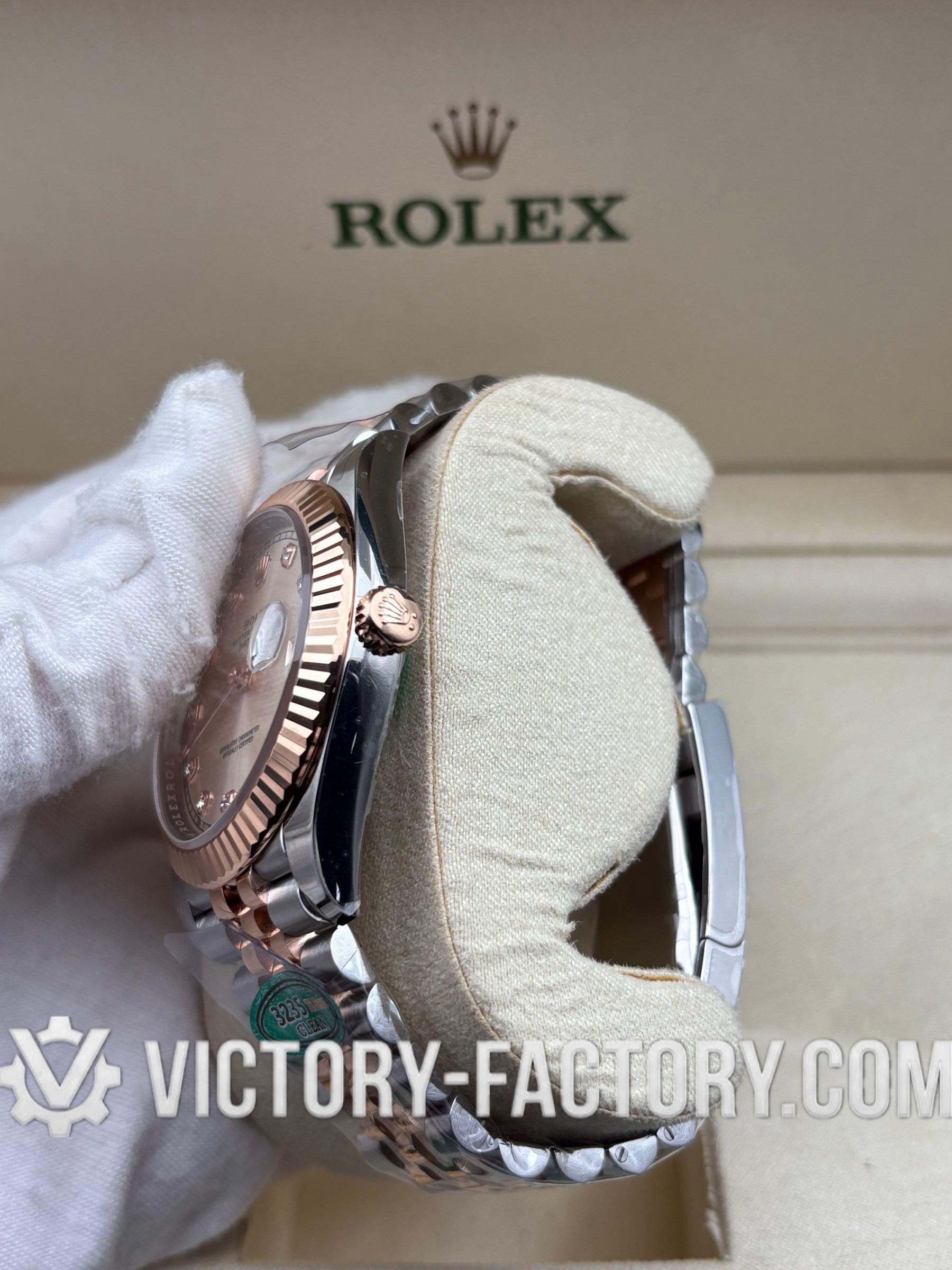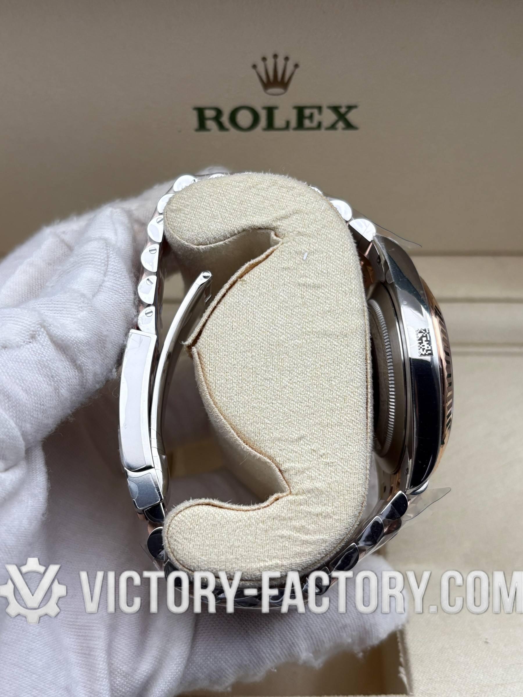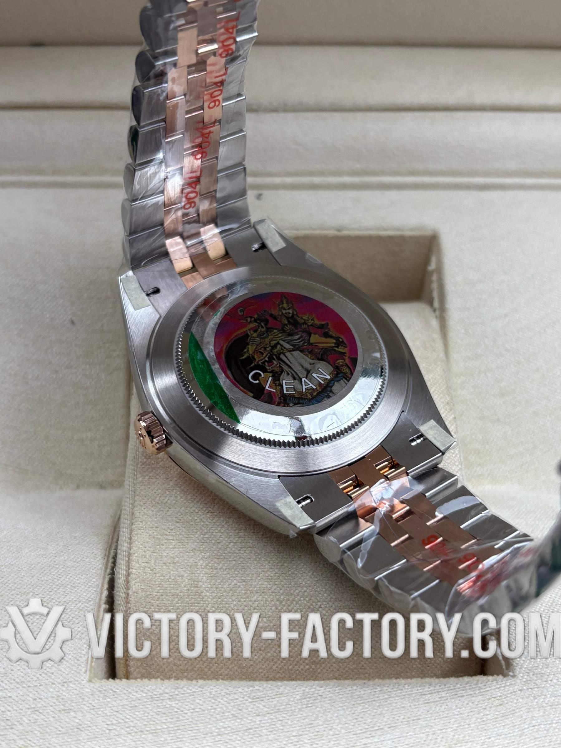 CASE: Our Victory Factory Super Clone features a 41mm 18k Rose Gold wrapped solid 904L stainless steel construction, mirroring the authentic Rolex 904L steel. It includes a screw-down case-back and the Twinlock double waterproofness system for genuine-tier durability. Every detail, including the laser-etched Rehaut and 1:1 dimensions, allows for seamless part interchangeability.