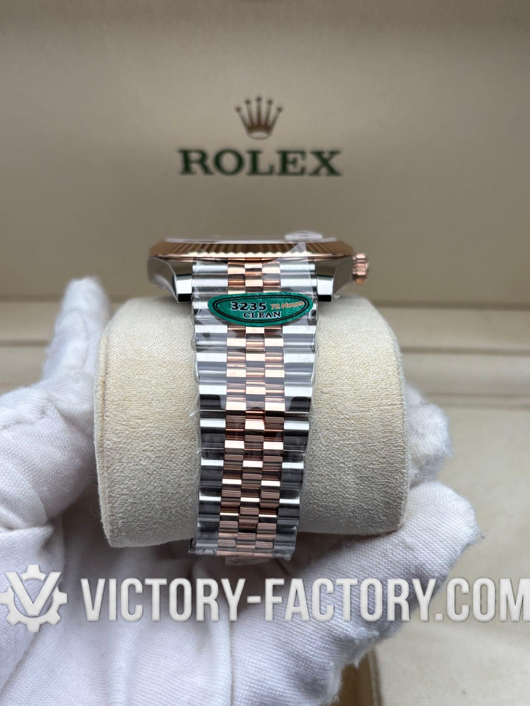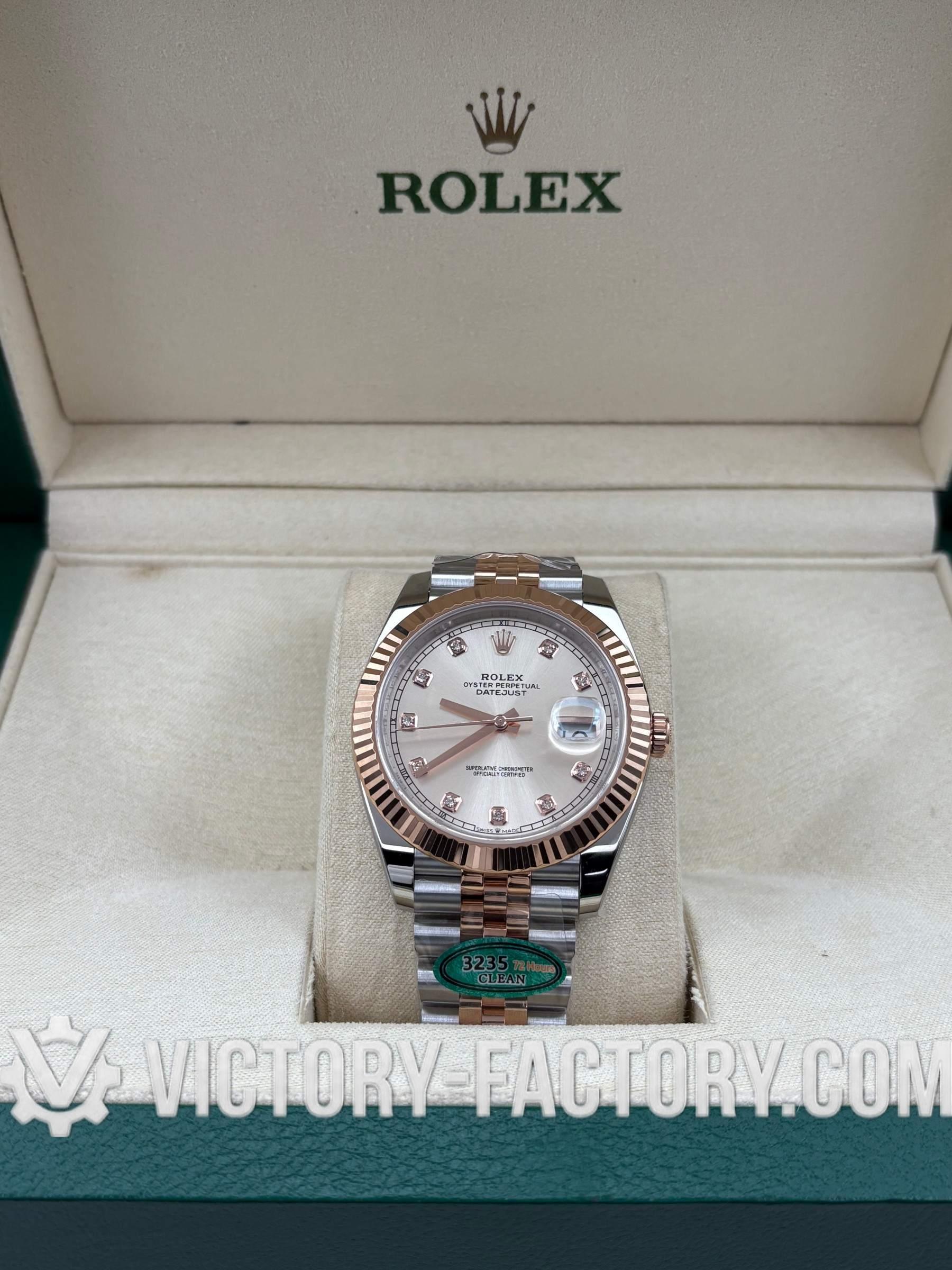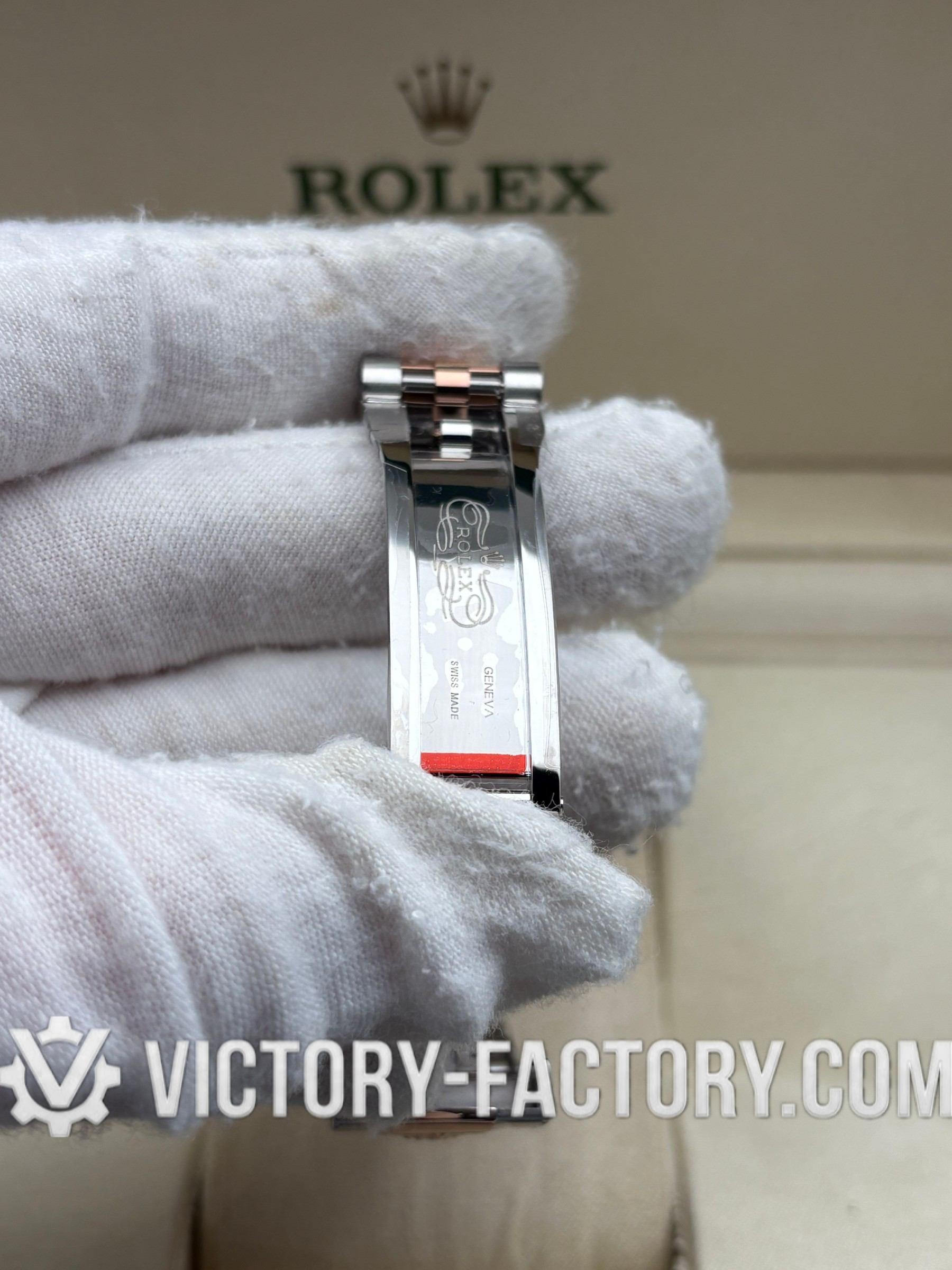 CASE: Our Victory Factory Super Clone features a 41mm 18k Rose Gold wrapped solid 904L stainless steel construction, mirroring the authentic Rolex 904L steel. It includes a screw-down case-back and the Twinlock double waterproofness system for genuine-tier durability. Every detail, including the laser-etched Rehaut and 1:1 dimensions, allows for seamless part interchangeability.