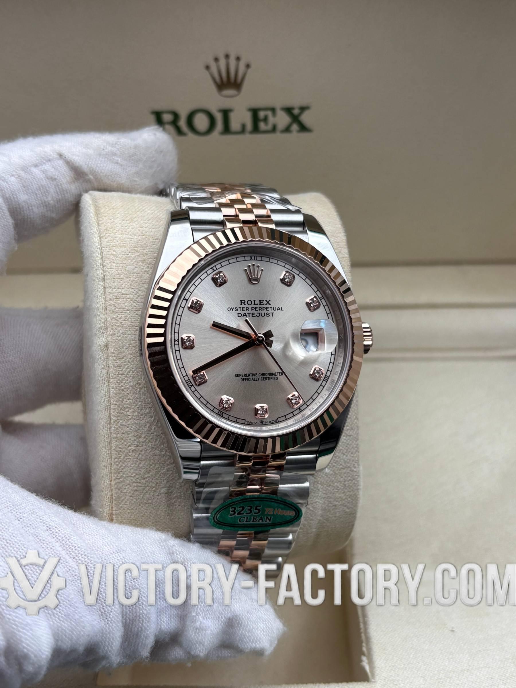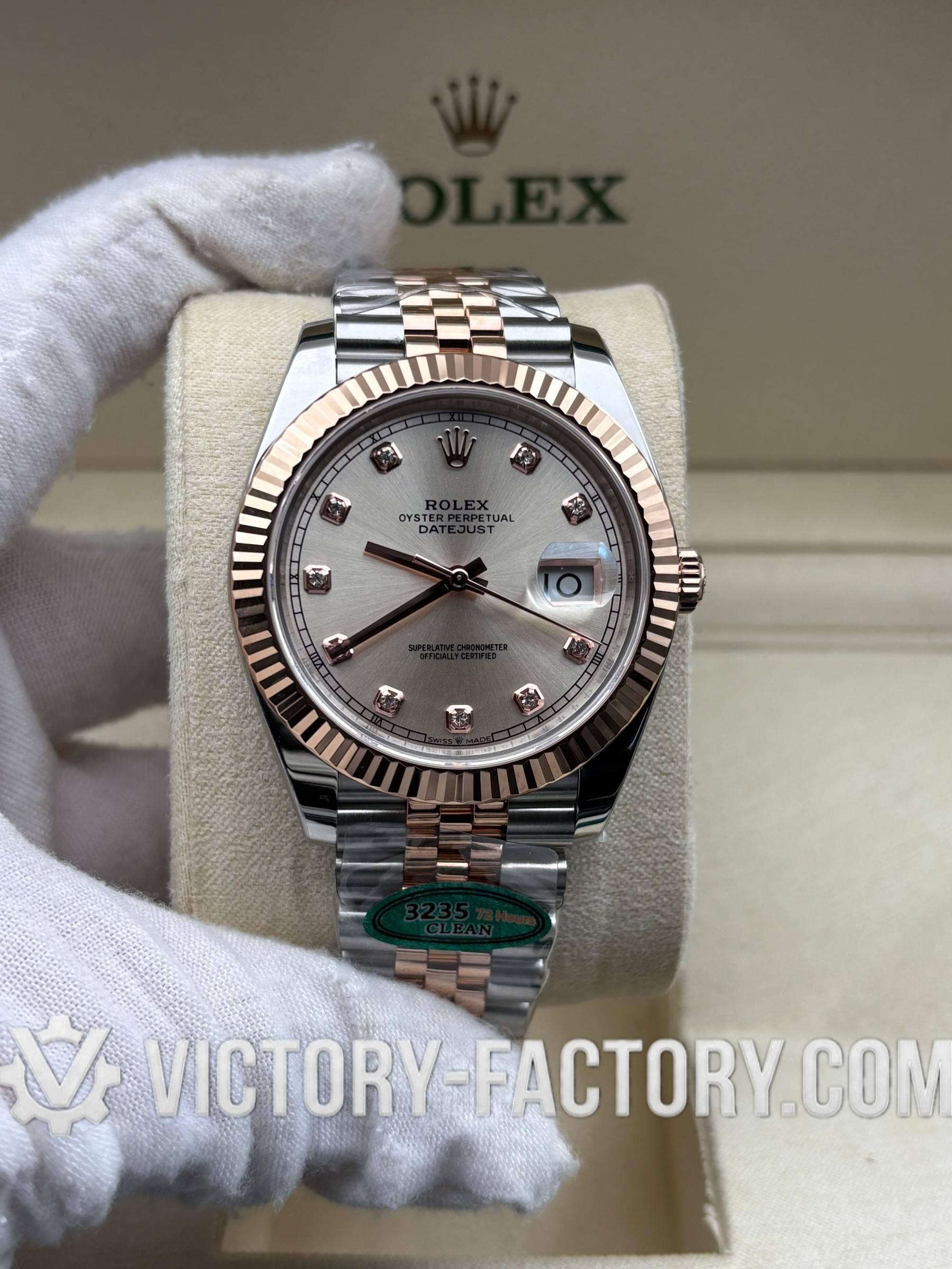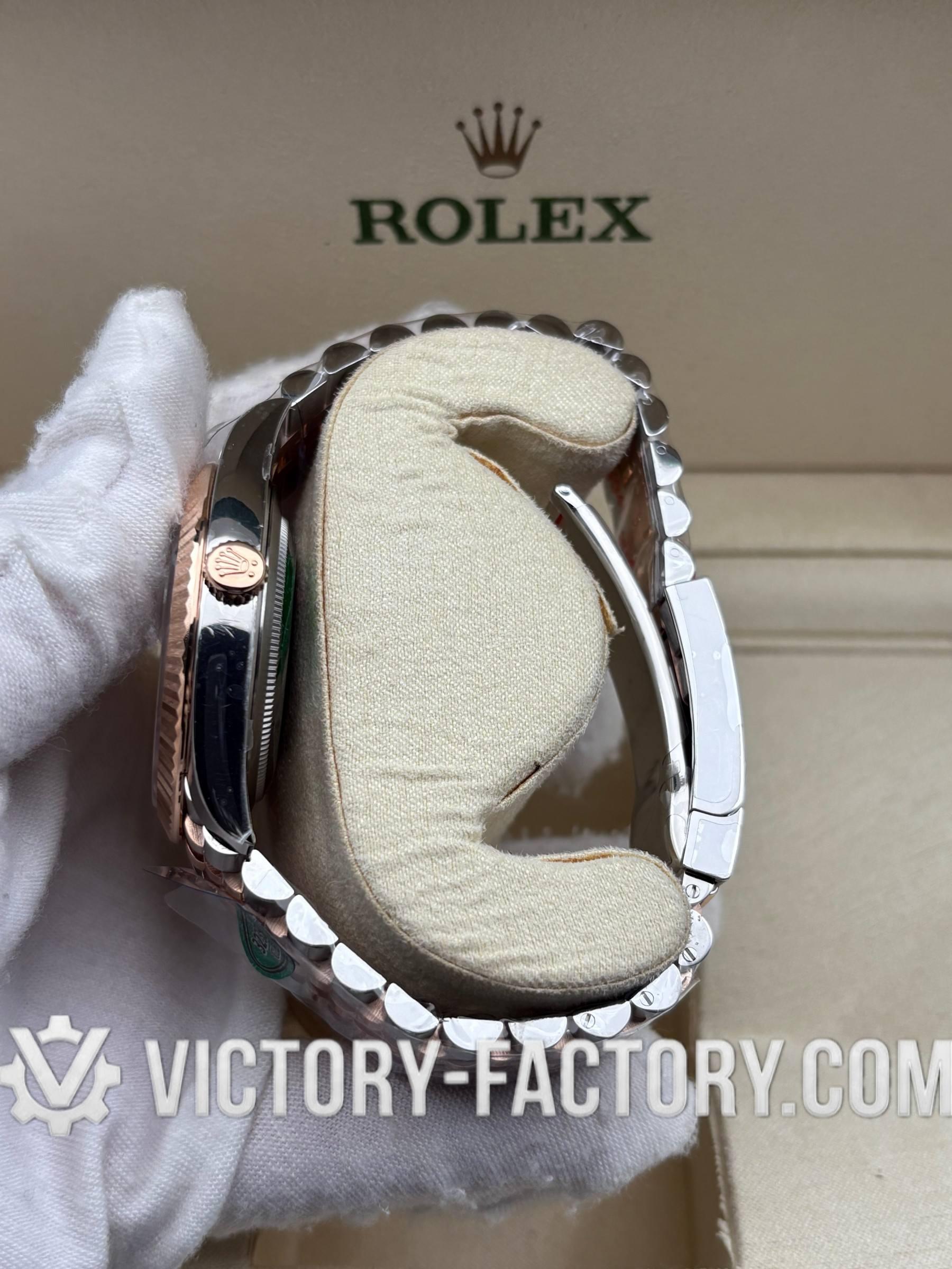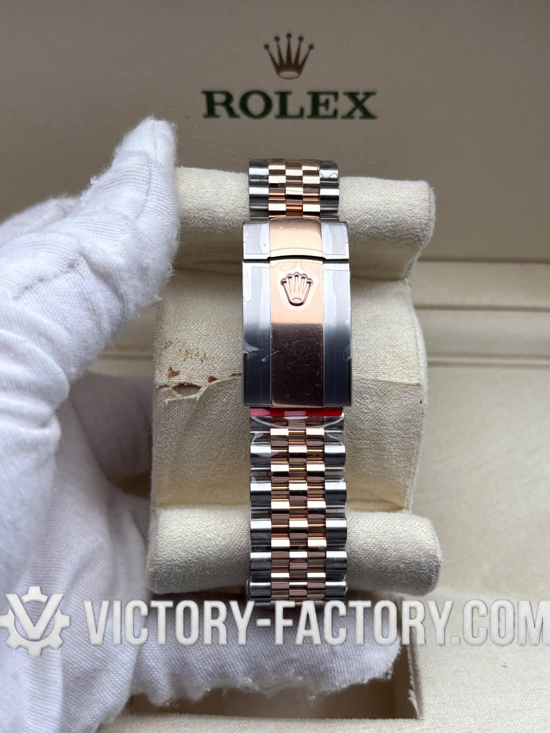 CASE: Our Victory Factory Super Clone features a 41mm 18k Rose Gold wrapped solid 904L stainless steel construction, mirroring the authentic Rolex 904L steel. It includes a screw-down case-back and the Twinlock double waterproofness system for genuine-tier durability. Every detail, including the laser-etched Rehaut and 1:1 dimensions, allows for seamless part interchangeability.