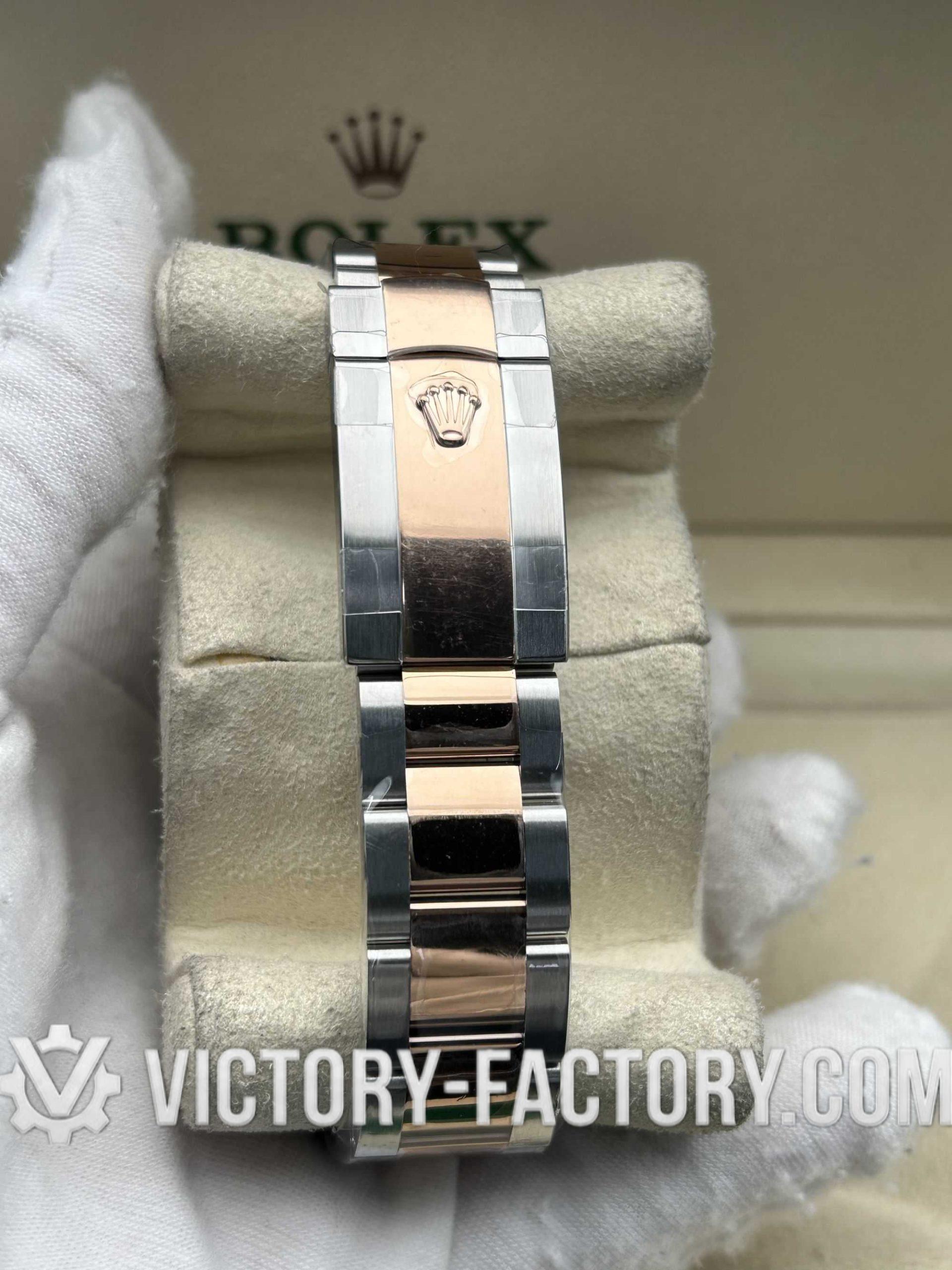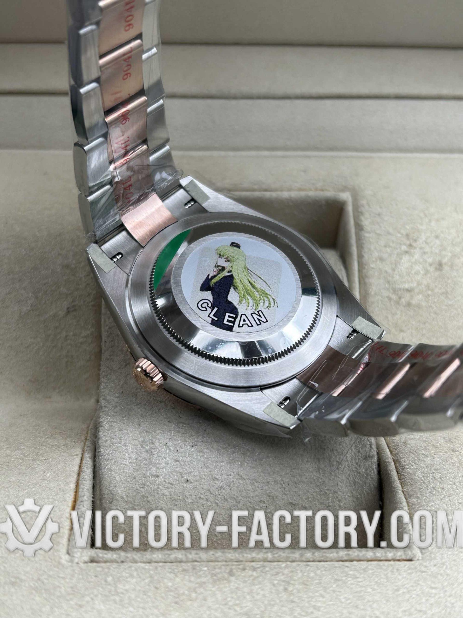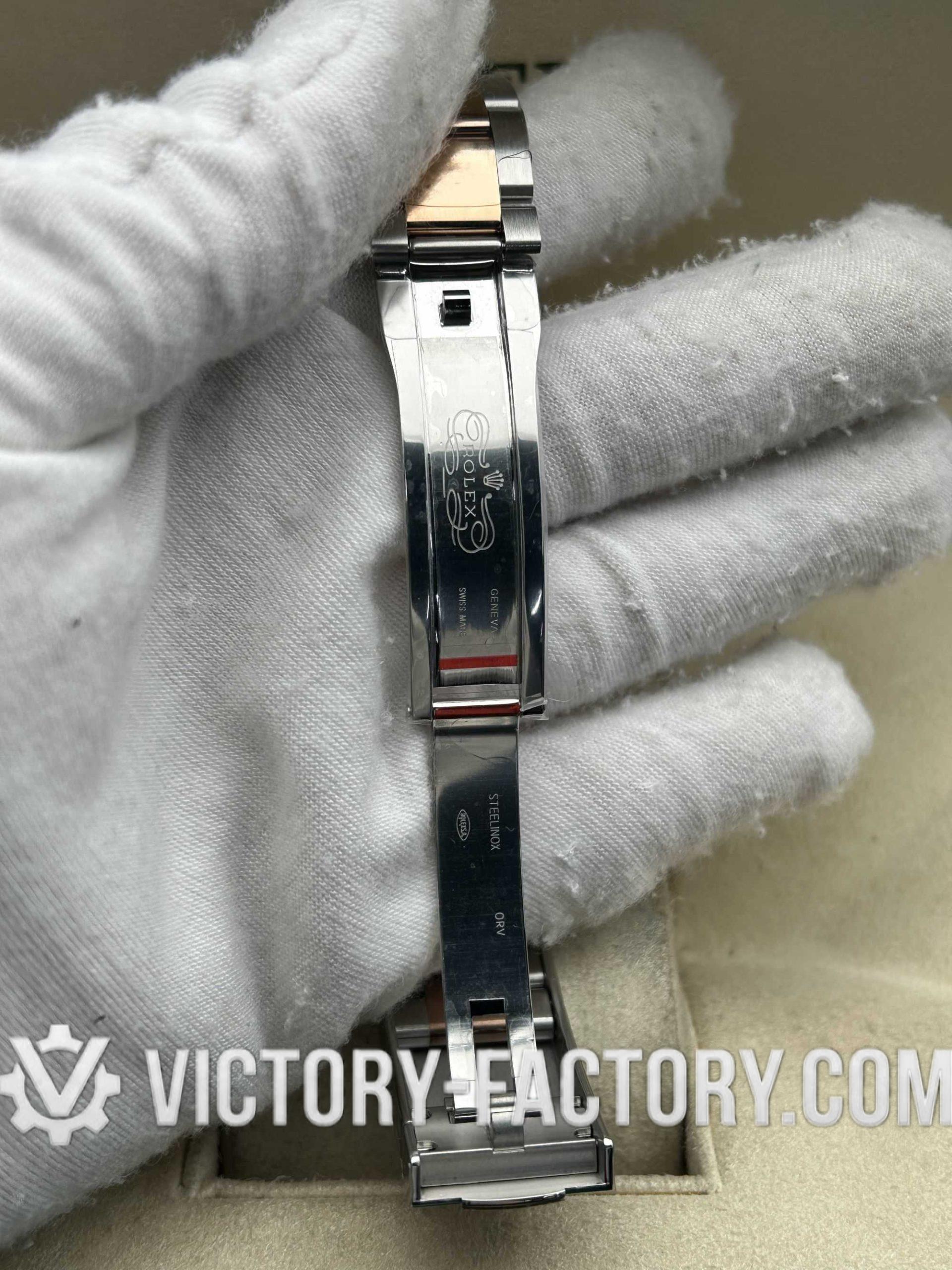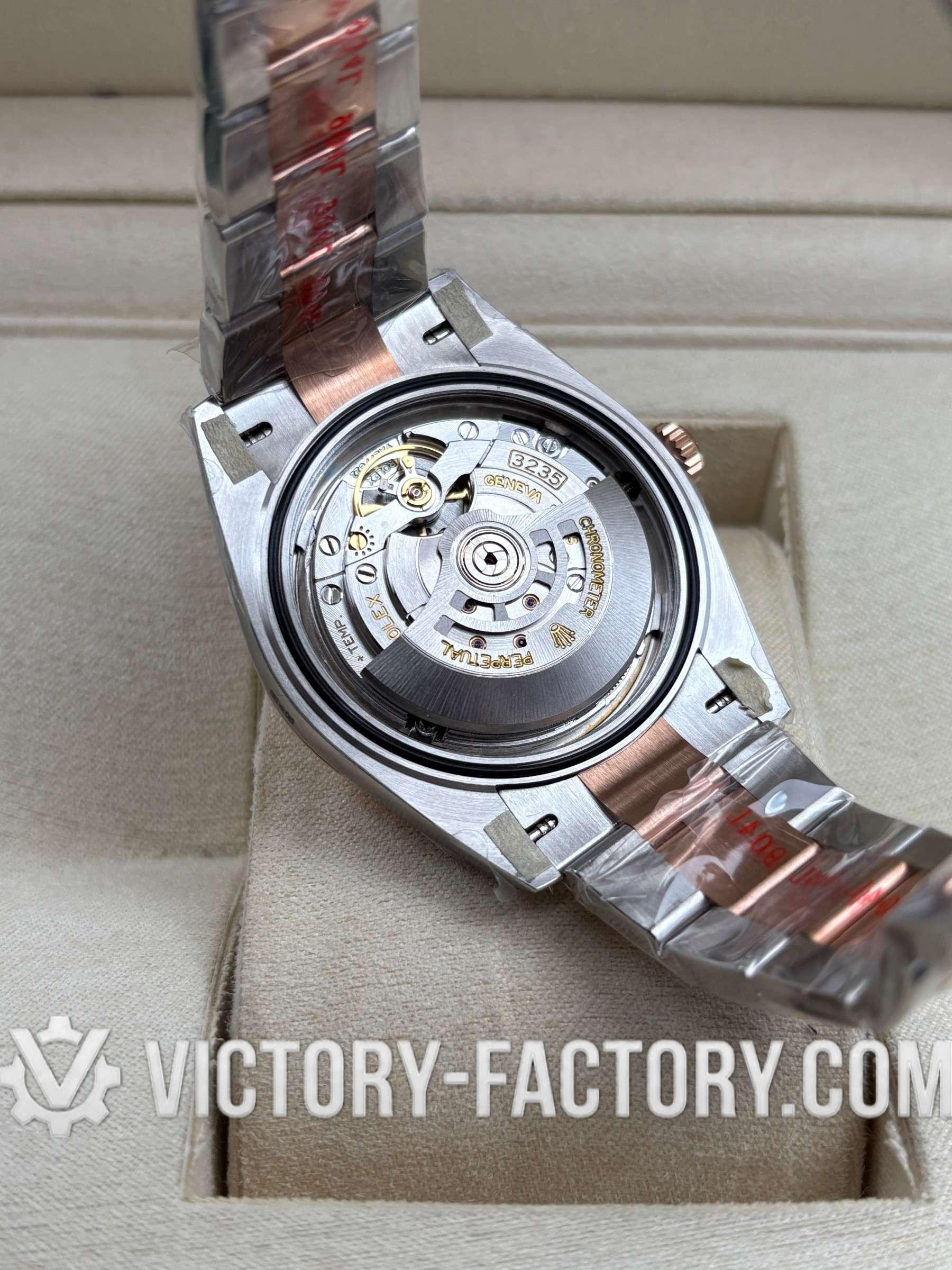 CASE: Our VF replica features a luxurious 41mm two-tone design with 18k Rose Gold wrapping over solid 904L stainless steel. The monobloc construction mirrors the genuine Rolex 904L steel, ensuring authenticity in every detail, weight, and dimension. All parts are fully interchangeable with an original Rolex.