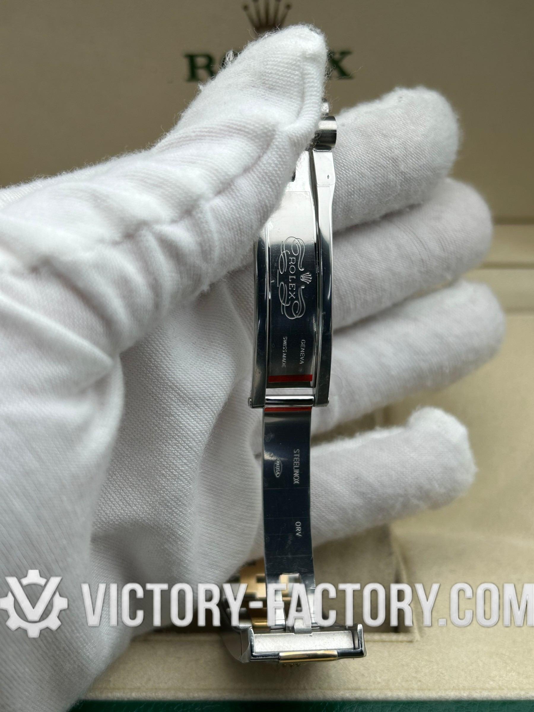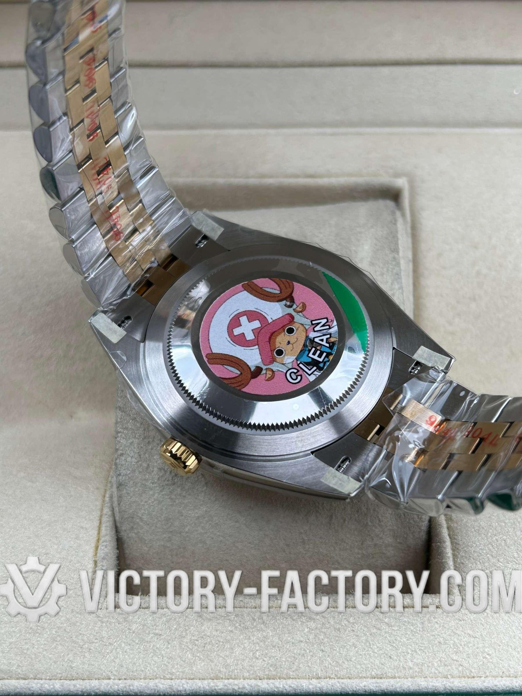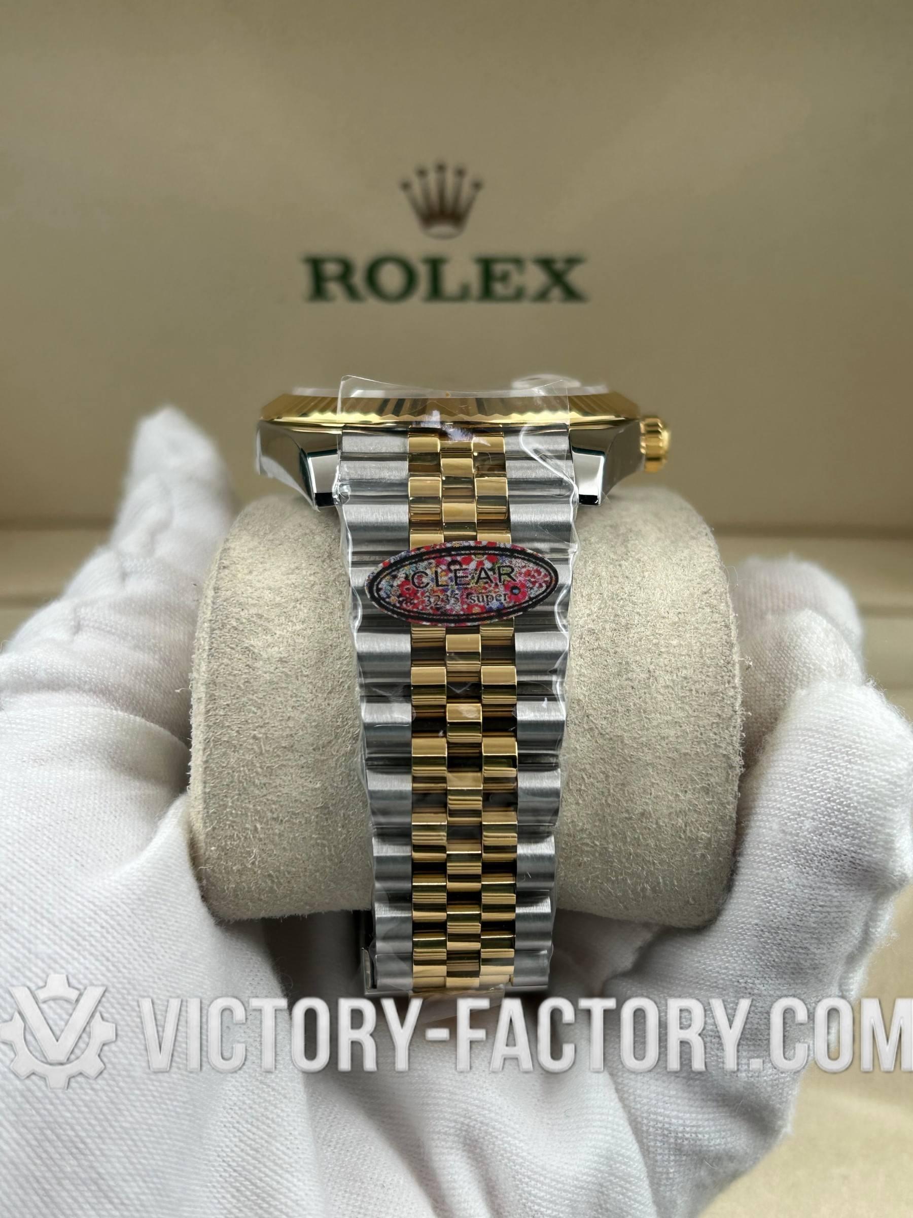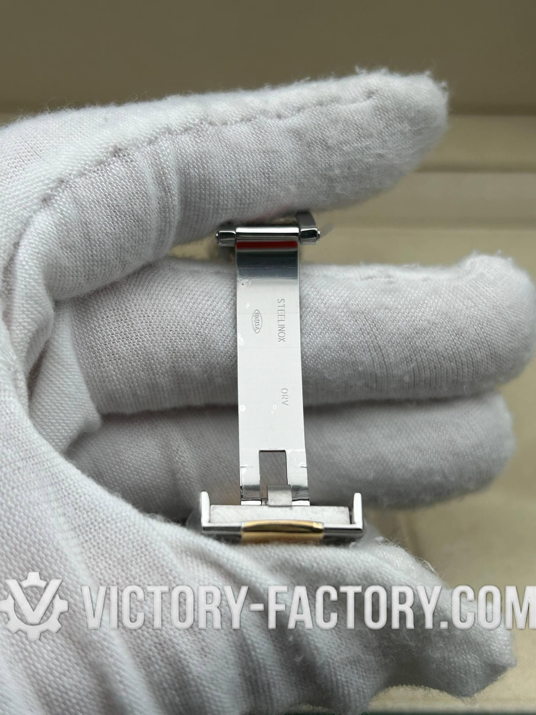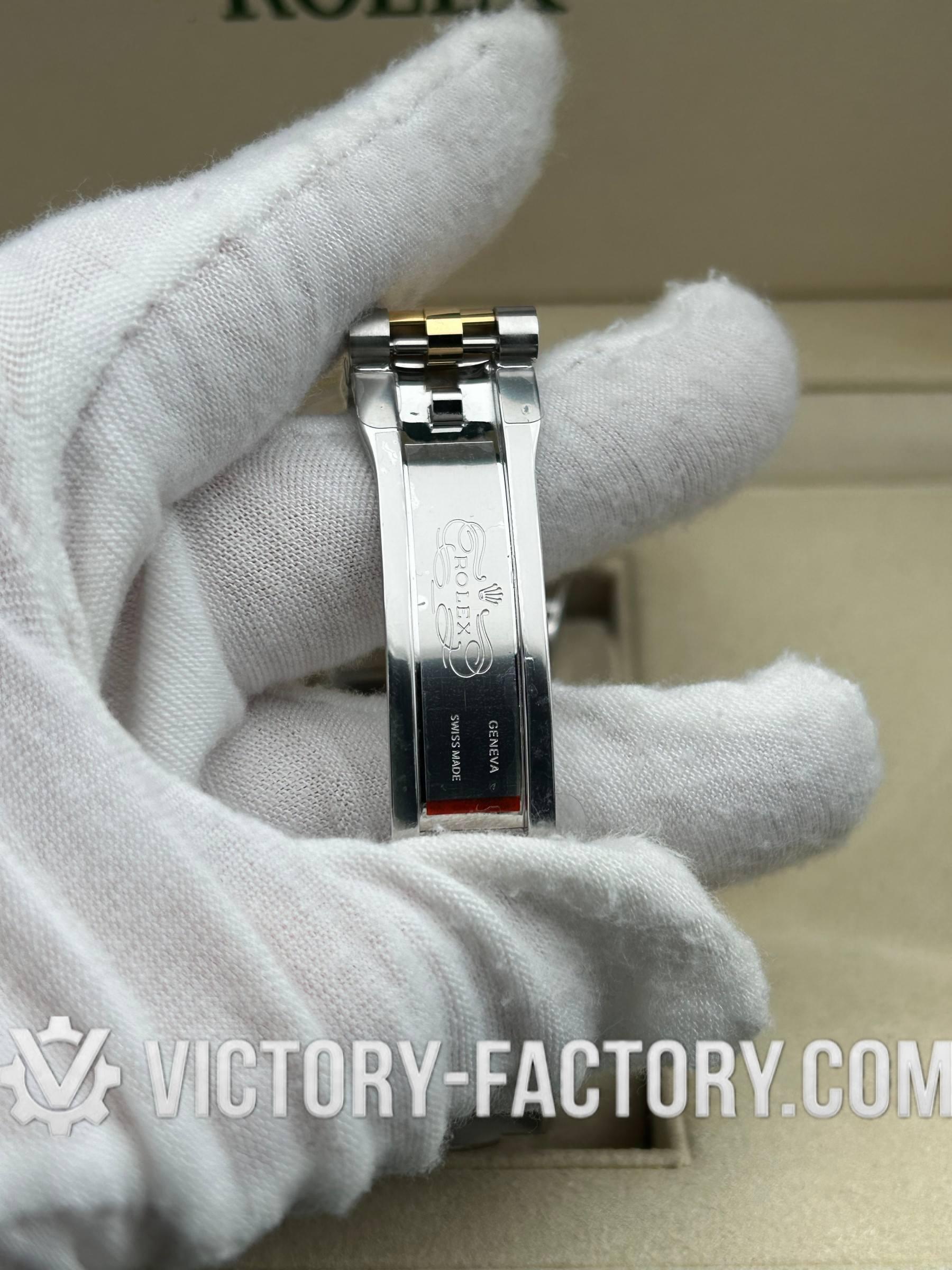 • CASE: Our Victory Factory Super Clone features a 41mm 2-tone 18k Yellow Gold wrapped Solid 904L Stainless steel case. It mirrors the authentic Rolex 904L steel in a monobloc construction. The screw-down case-back and Twinlock double waterproofness system with a screw-down winding crown are testaments to our dedication to durability and quality. Every detail, including dimensions and the iconic ROLEX laser engraving on the Rehaut ring, is faithfully replicated to ensure a perfect 1:1 replica where all parts are interchangeable with the original.