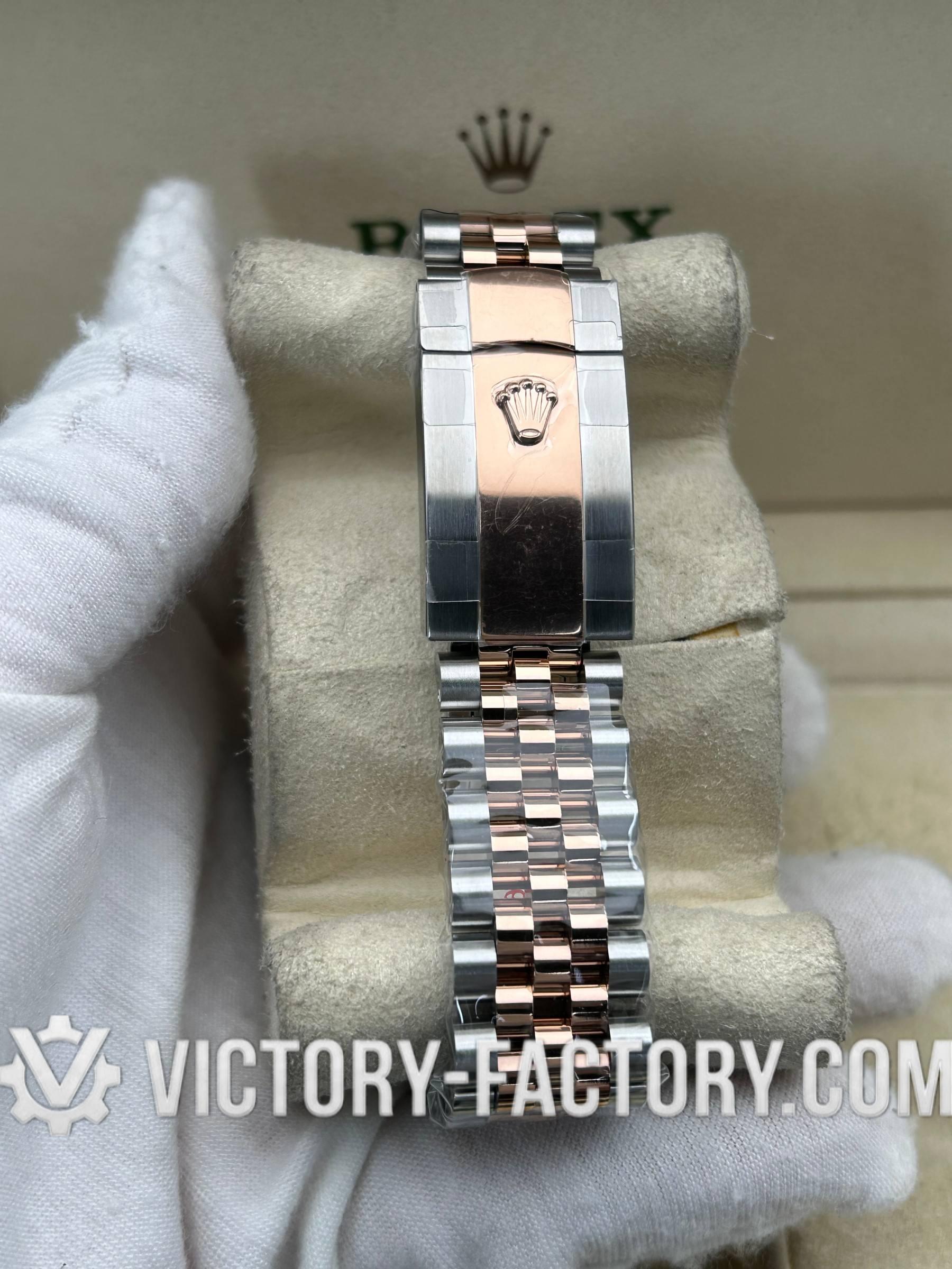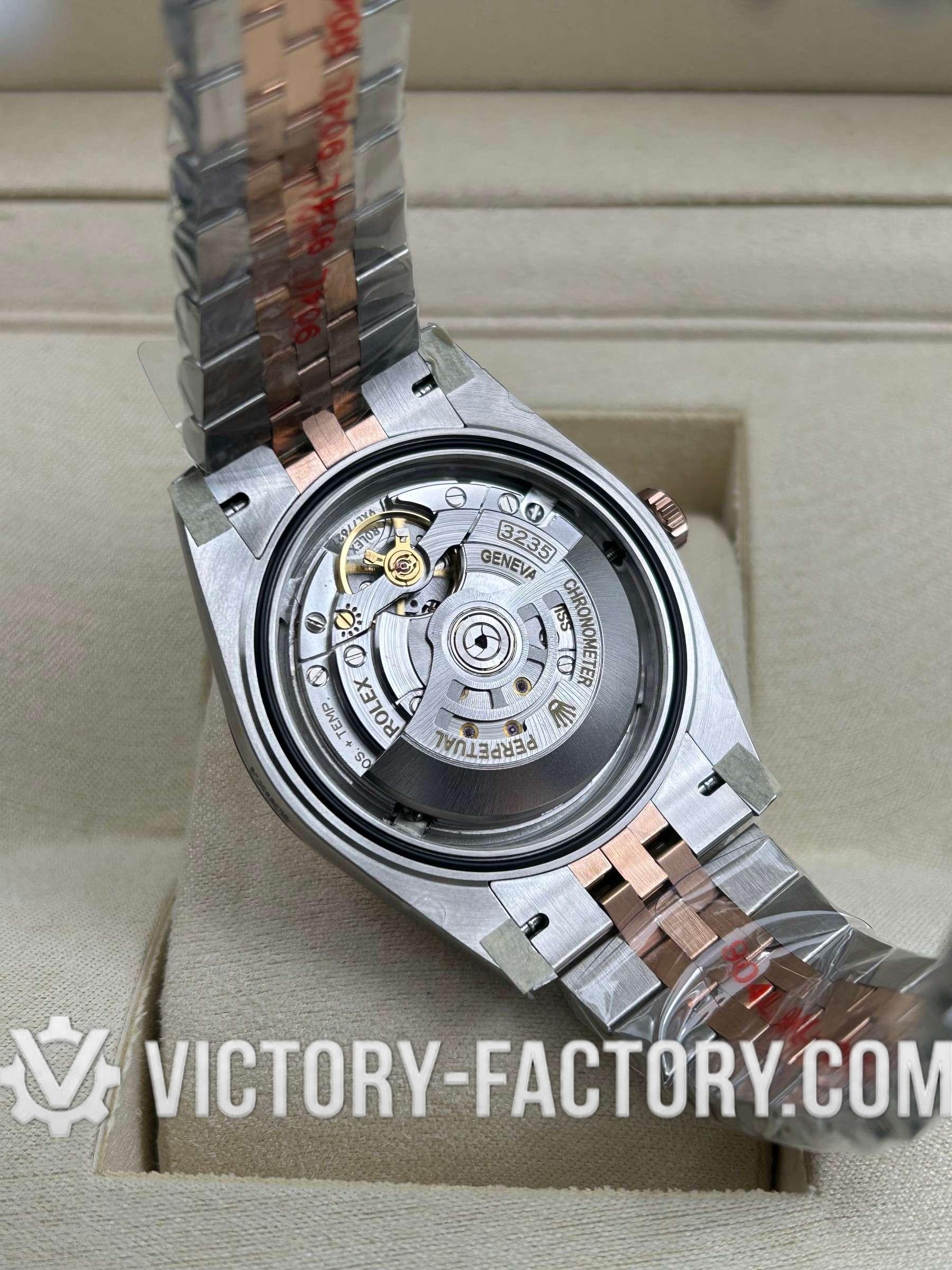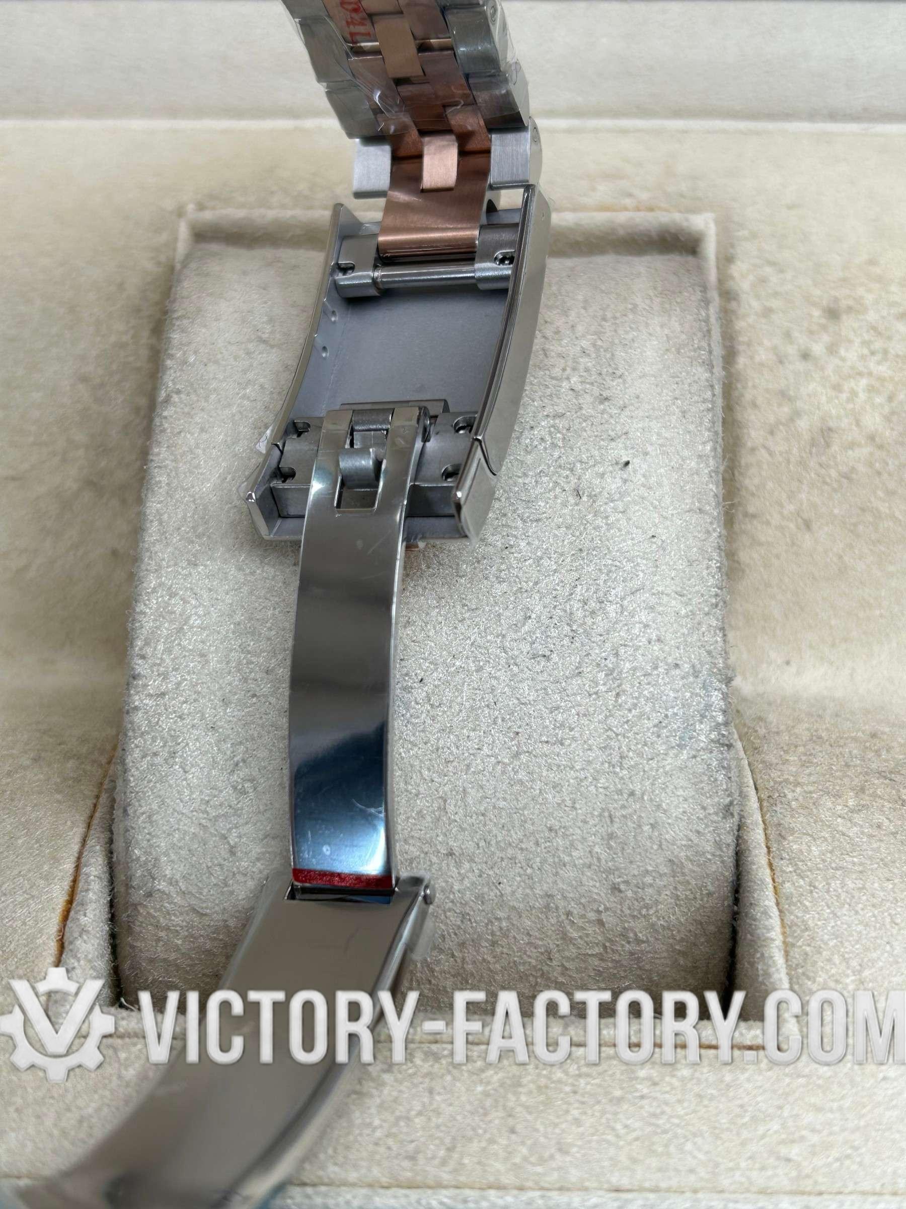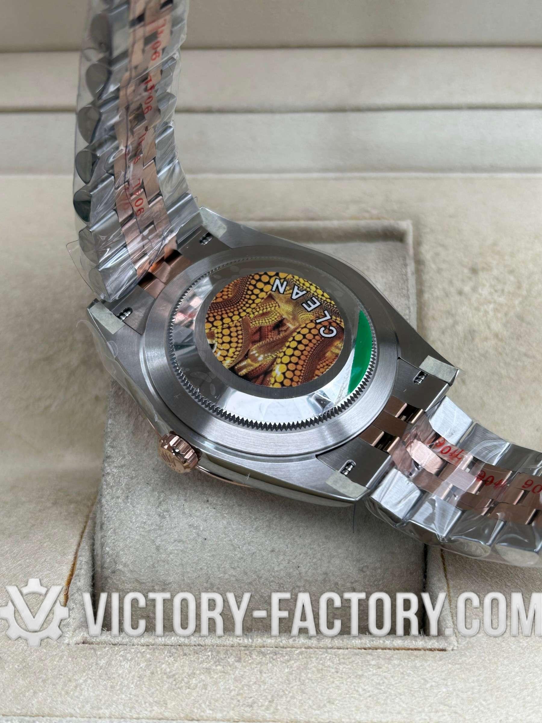 CASE: Victory Factory presents the 41mm 2-tone 18k Rose Gold wrapped Solid 904L Stainless steel case, mirroring the authentic Rolex 904L steel in a monobloc construction. It includes a screw-down case-back and Twinlock double waterproofness system screw-down winding crown for superior protection. The case features the iconic ROLEXROLEX laser engraving on the Rehaut ring and is protected by a DLC scratch-protection coating. Every detail is faithfully replicated to be 100% identical to genuine Rolex watches, allowing for seamless part interchangeability.