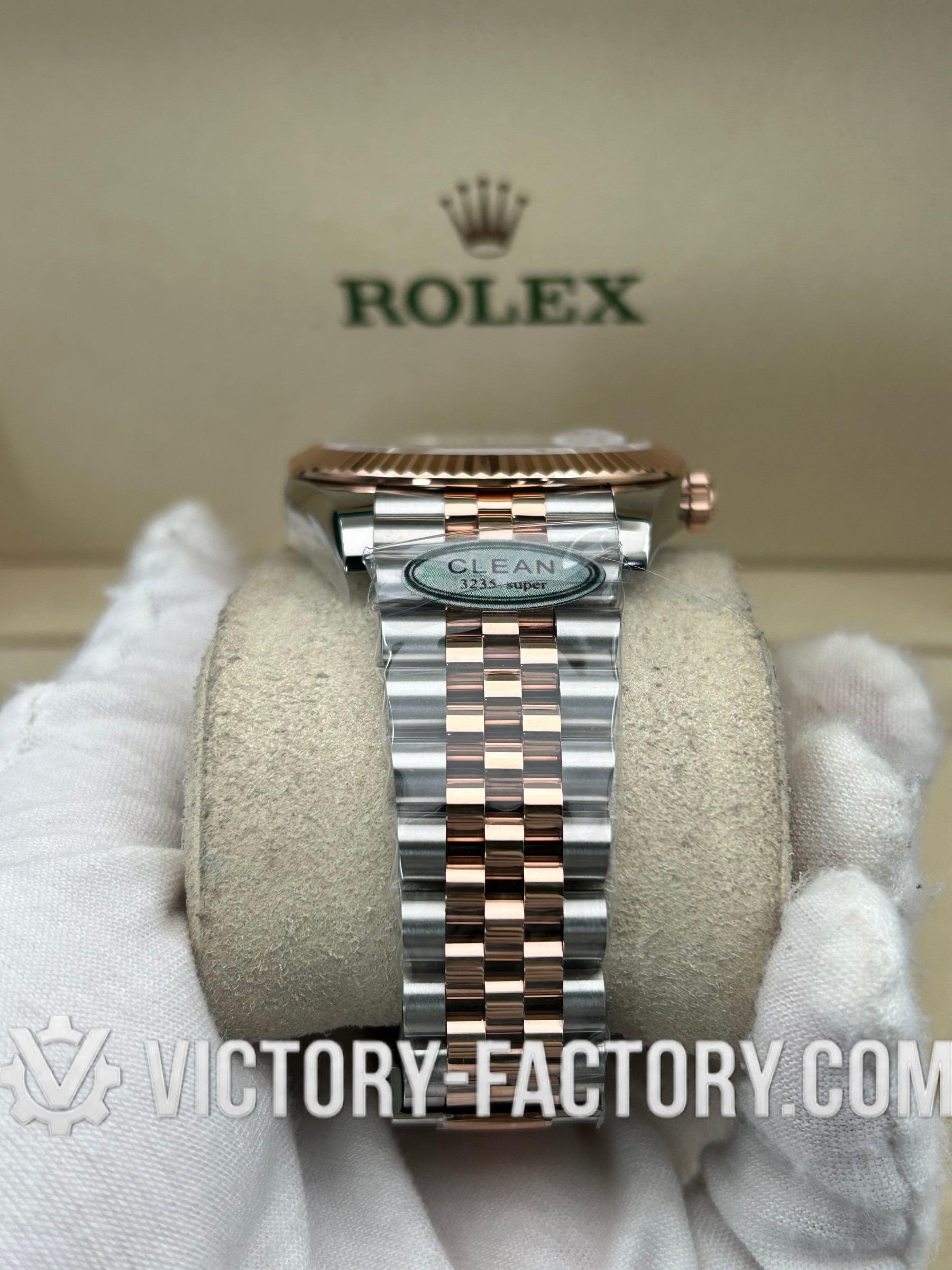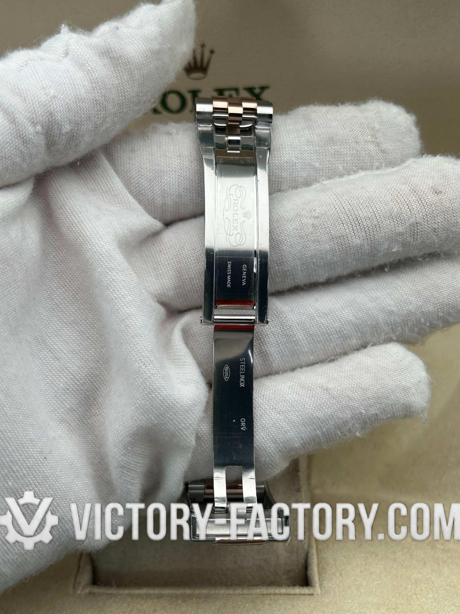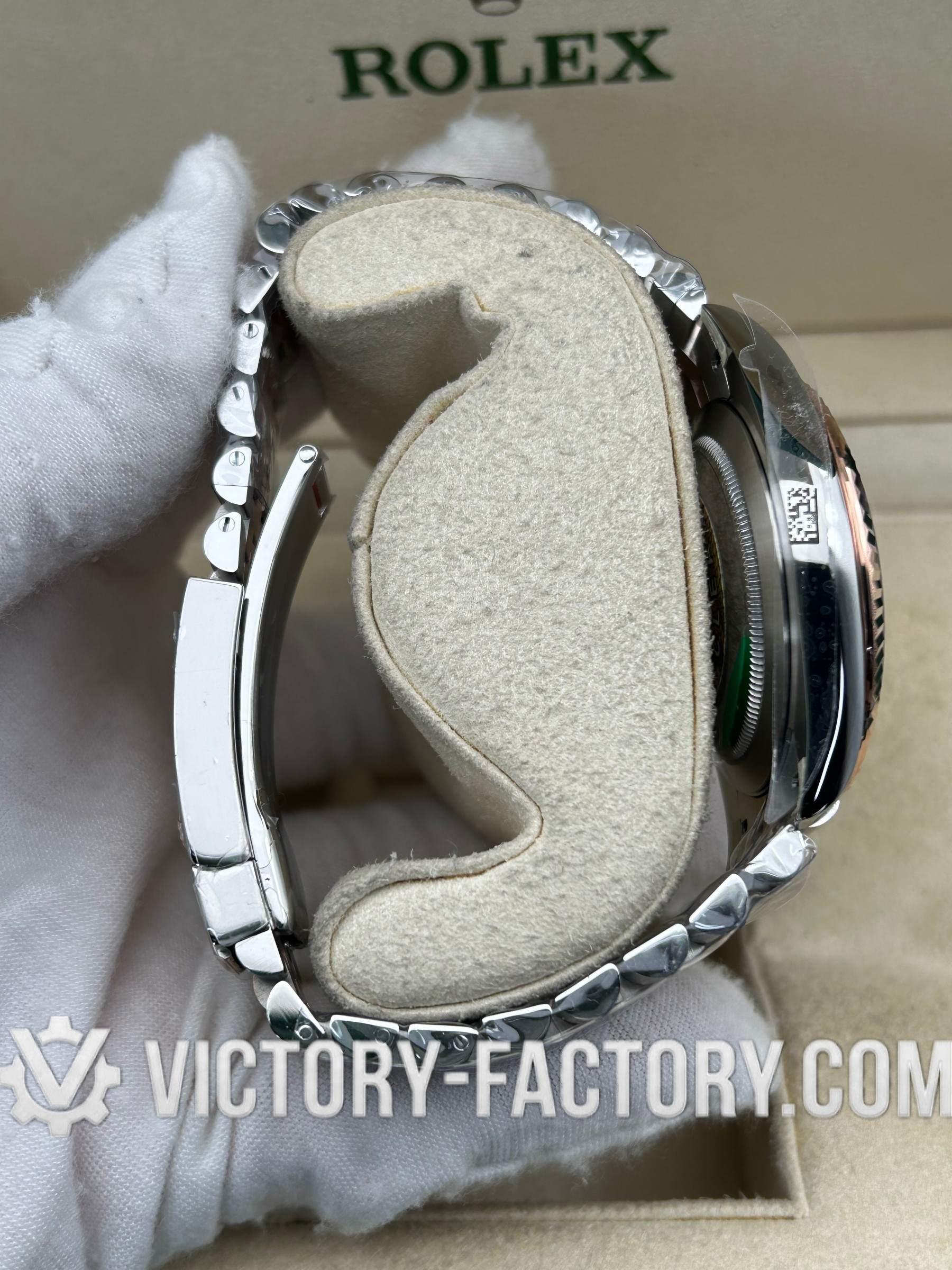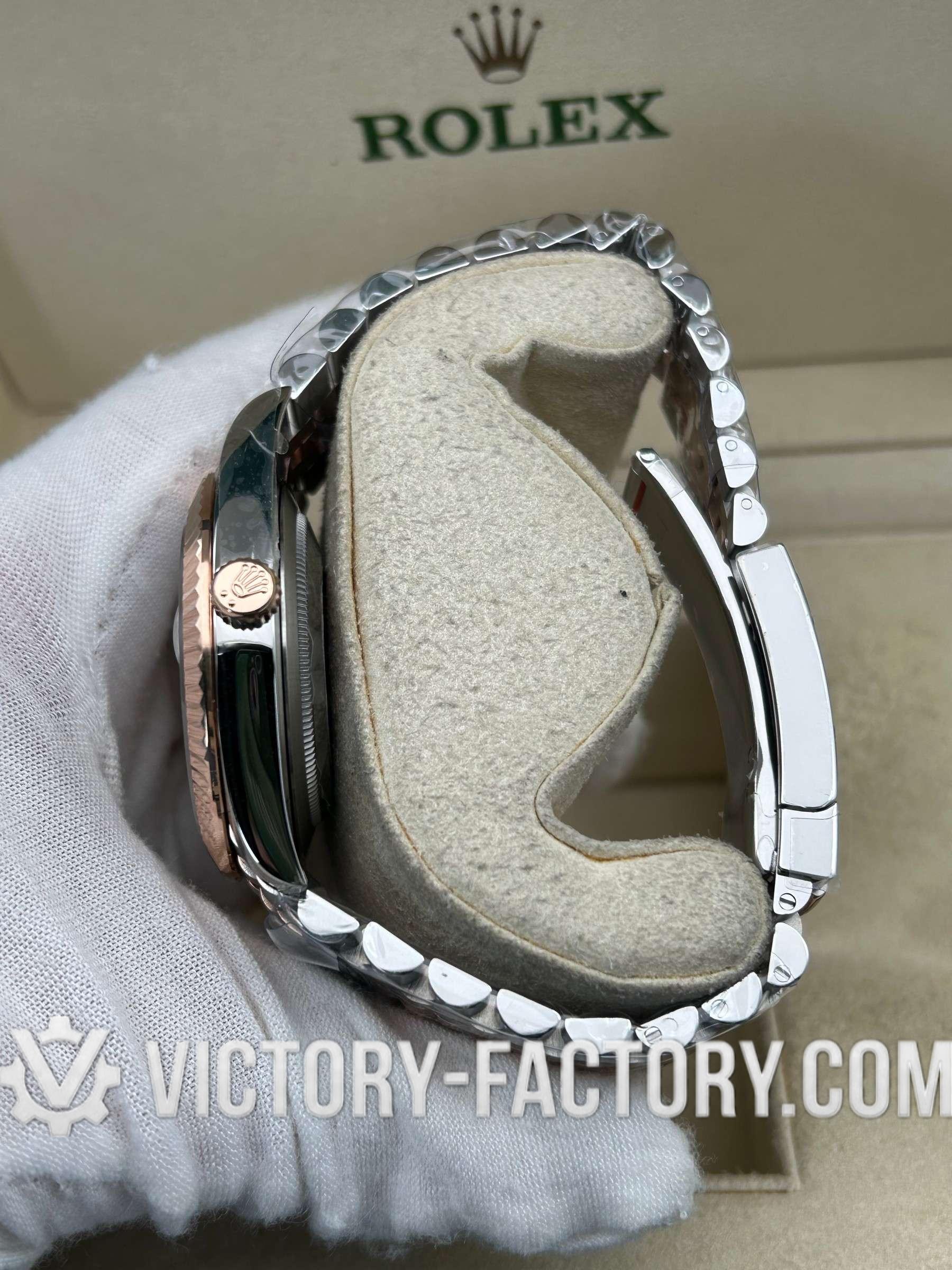 CASE: Victory Factory presents the 41mm 2-tone 18k Rose Gold wrapped Solid 904L Stainless steel case, mirroring the authentic Rolex 904L steel in a monobloc construction. It includes a screw-down case-back and Twinlock double waterproofness system screw-down winding crown for superior protection. The case features the iconic ROLEXROLEX laser engraving on the Rehaut ring and is protected by a DLC scratch-protection coating. Every detail is faithfully replicated to be 100% identical to genuine Rolex watches, allowing for seamless part interchangeability.
