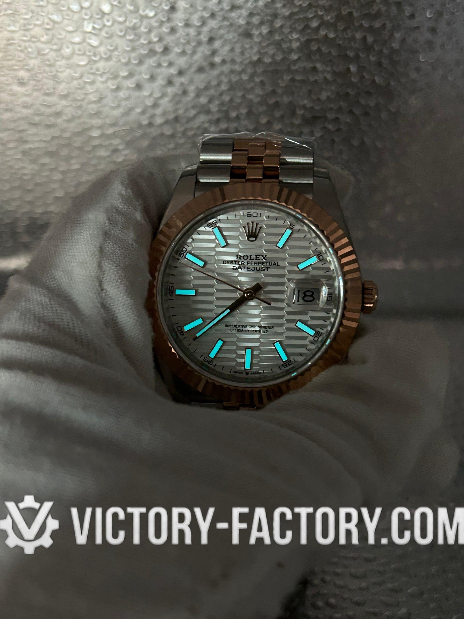 Dial: A stunning Silver Fluted Design dial is complemented by hour markers and hands coated with Superluminova Luminescence for extended low-light visibility. Victory Factory ensures high legibility with laser-precision text, prints, and engravings, meticulously crafted to be 100% identical to the genuine watch. The correct date font and size are used, and the hour markers and hands are wrapped in 18k Rose gold to prevent tarnishing.