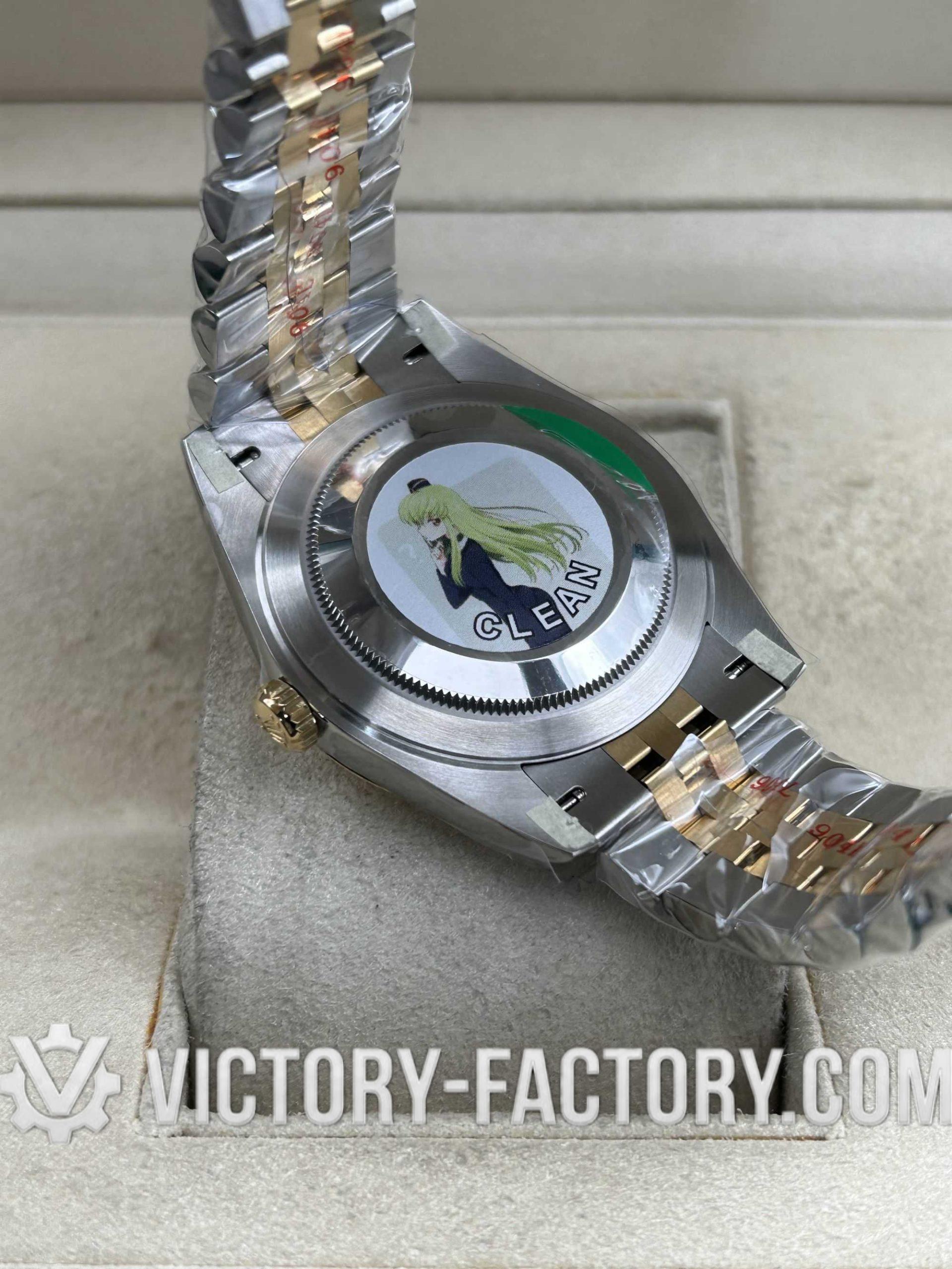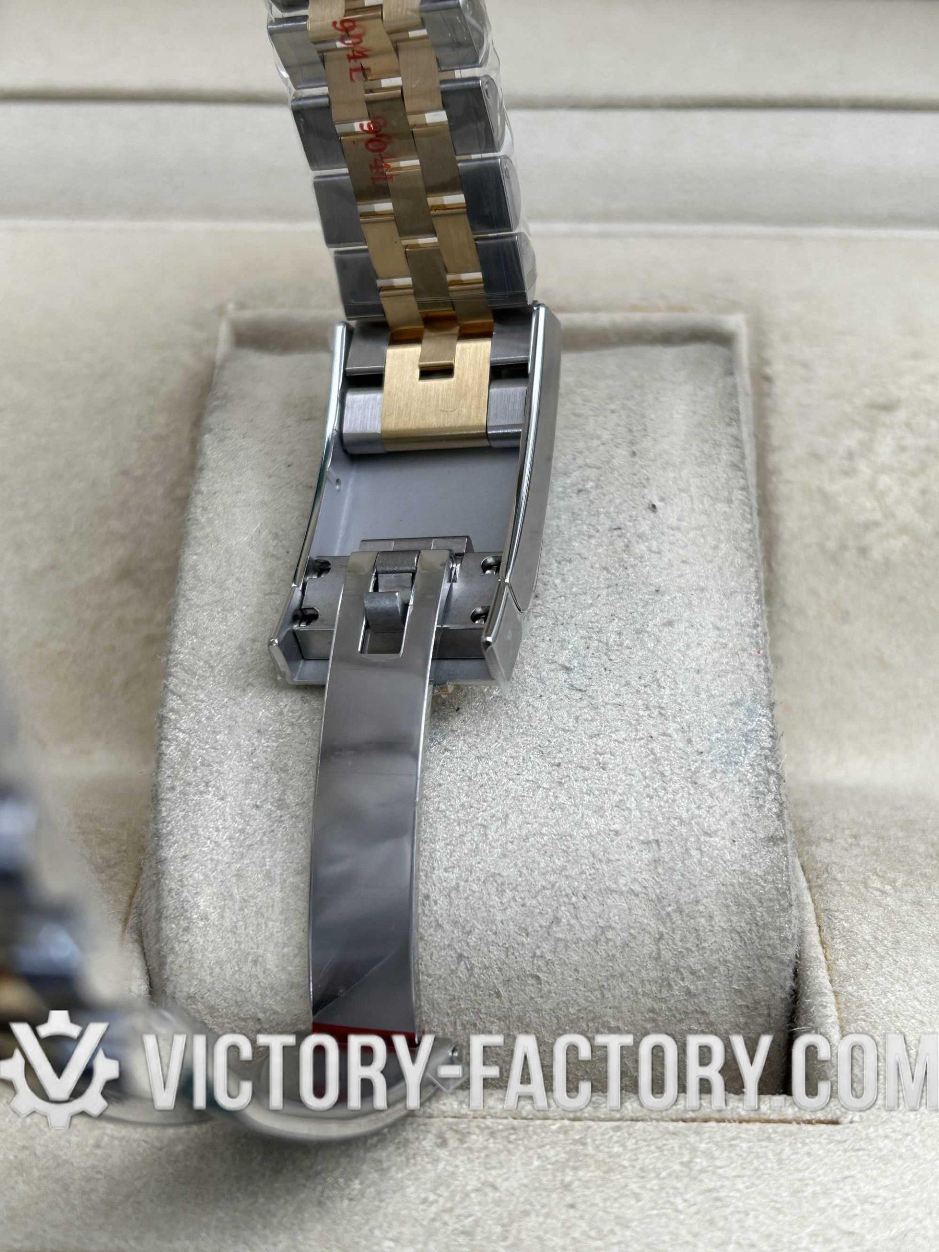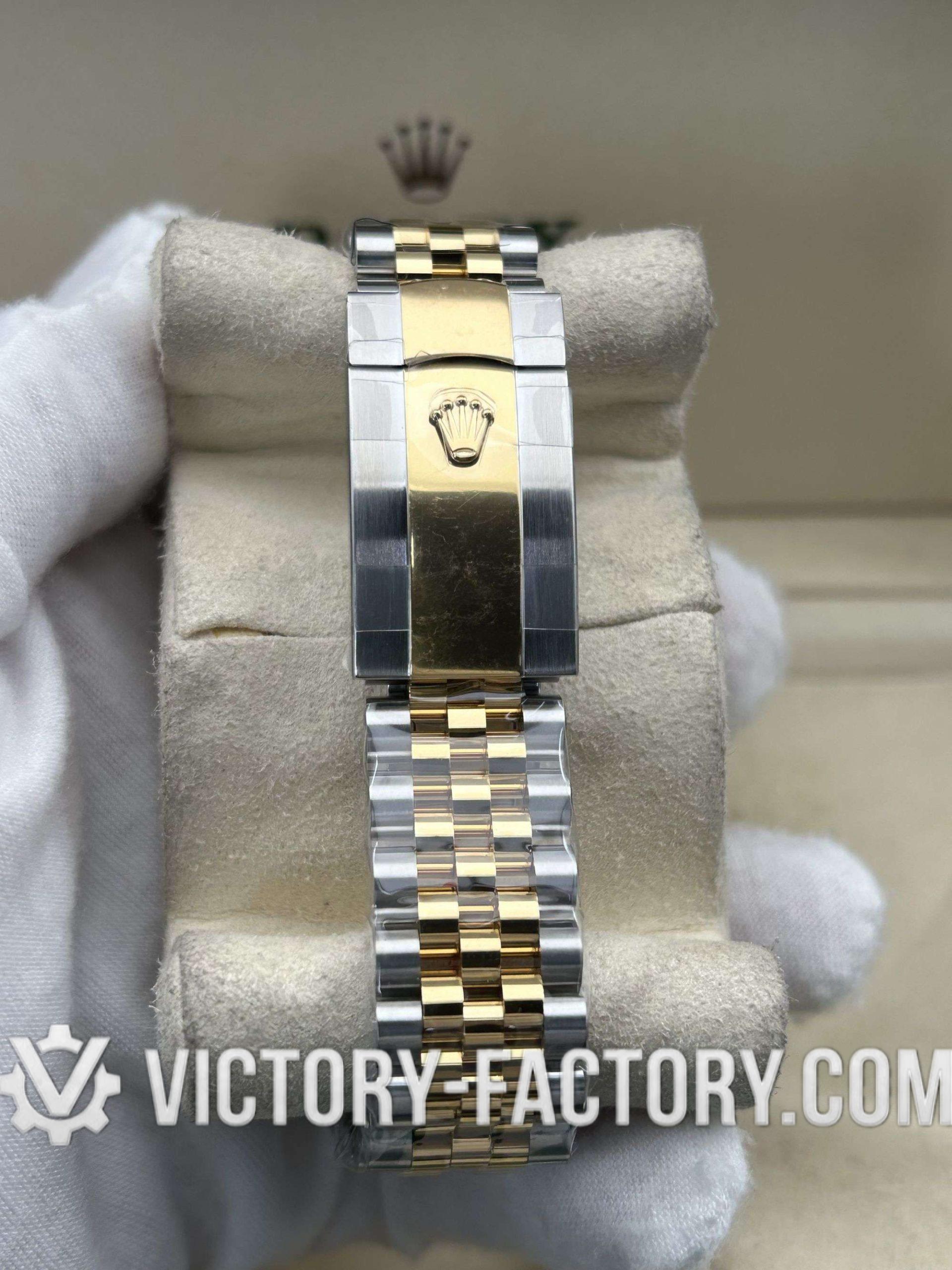 CASE: 18k Yellow Gold Wrapped 904L Steel Our Victory Factory case features a luxurious 41mm two-tone construction. The 18k Yellow Gold is wrapped (not plated) over solid 904L stainless steel, ensuring the correct weight and a deep gold luster that mirrors the genuine Rolex. It includes a screw-down case-back and a Twinlock double waterproofness system for superior durability.