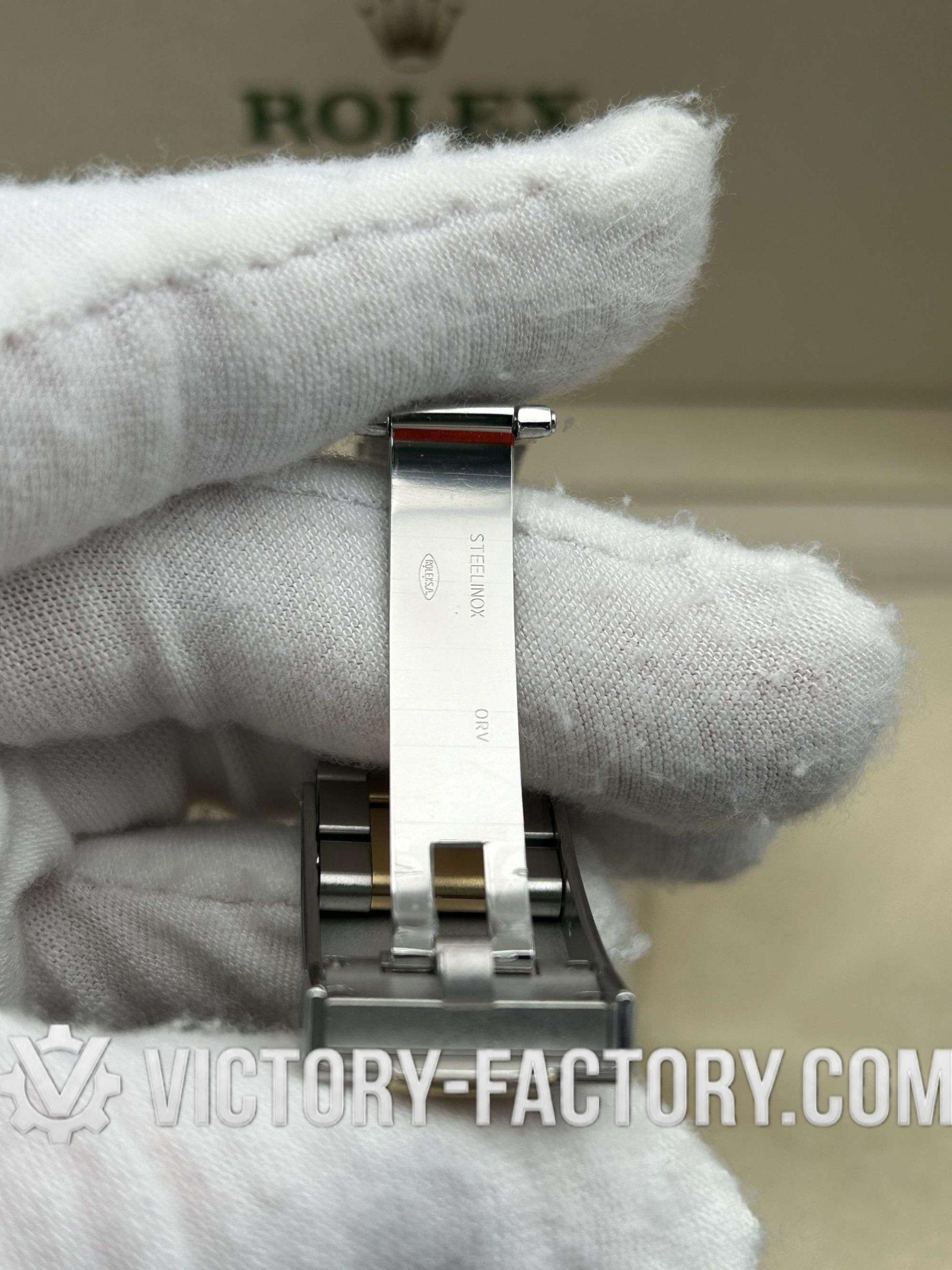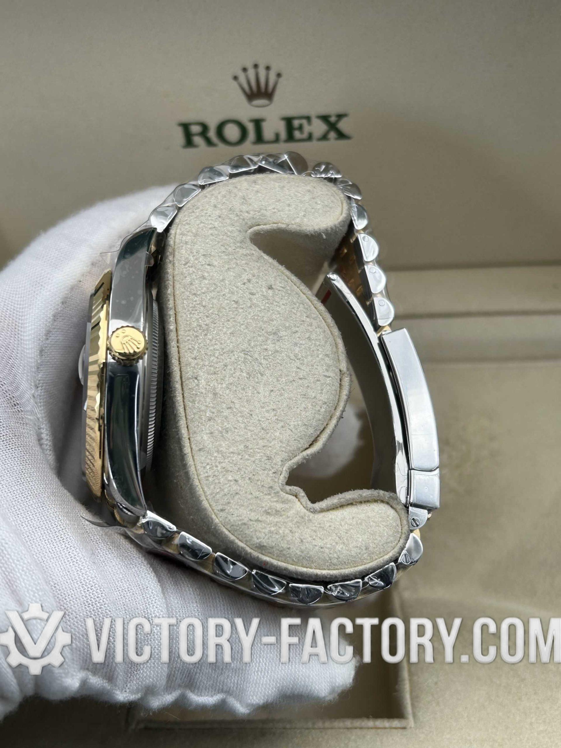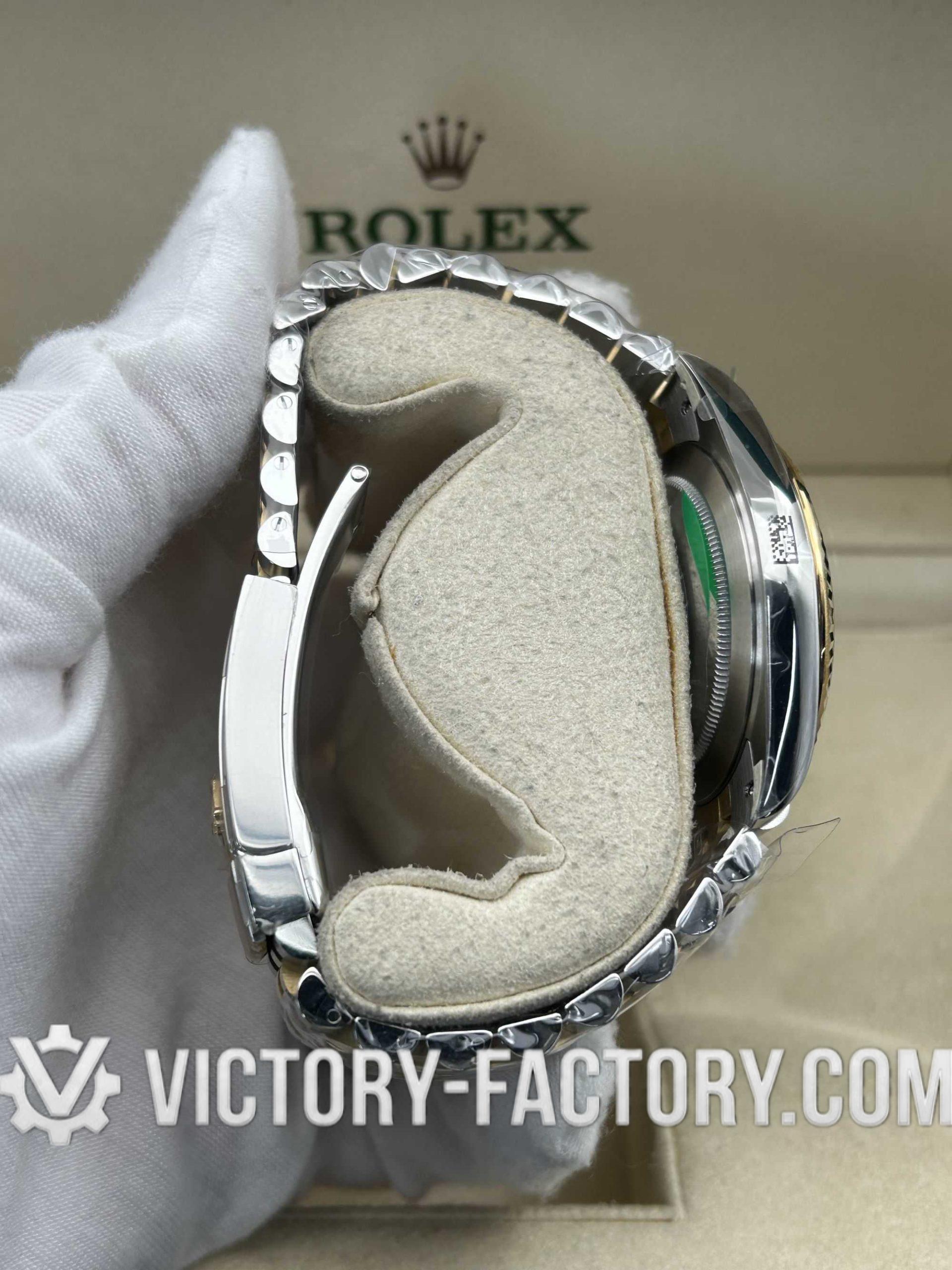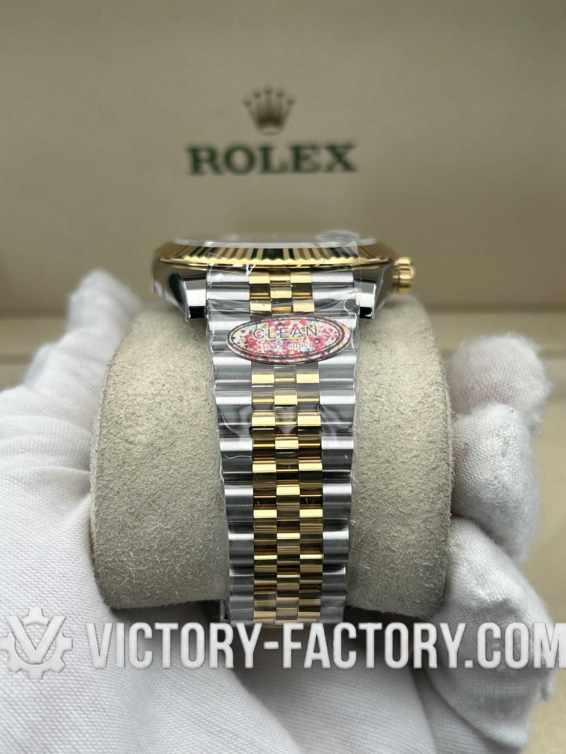 CASE: 18k Yellow Gold Wrapped 904L Steel Our Victory Factory case features a luxurious 41mm two-tone construction. The 18k Yellow Gold is wrapped (not plated) over solid 904L stainless steel, ensuring the correct weight and a deep gold luster that mirrors the genuine Rolex. It includes a screw-down case-back and a Twinlock double waterproofness system for superior durability.