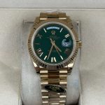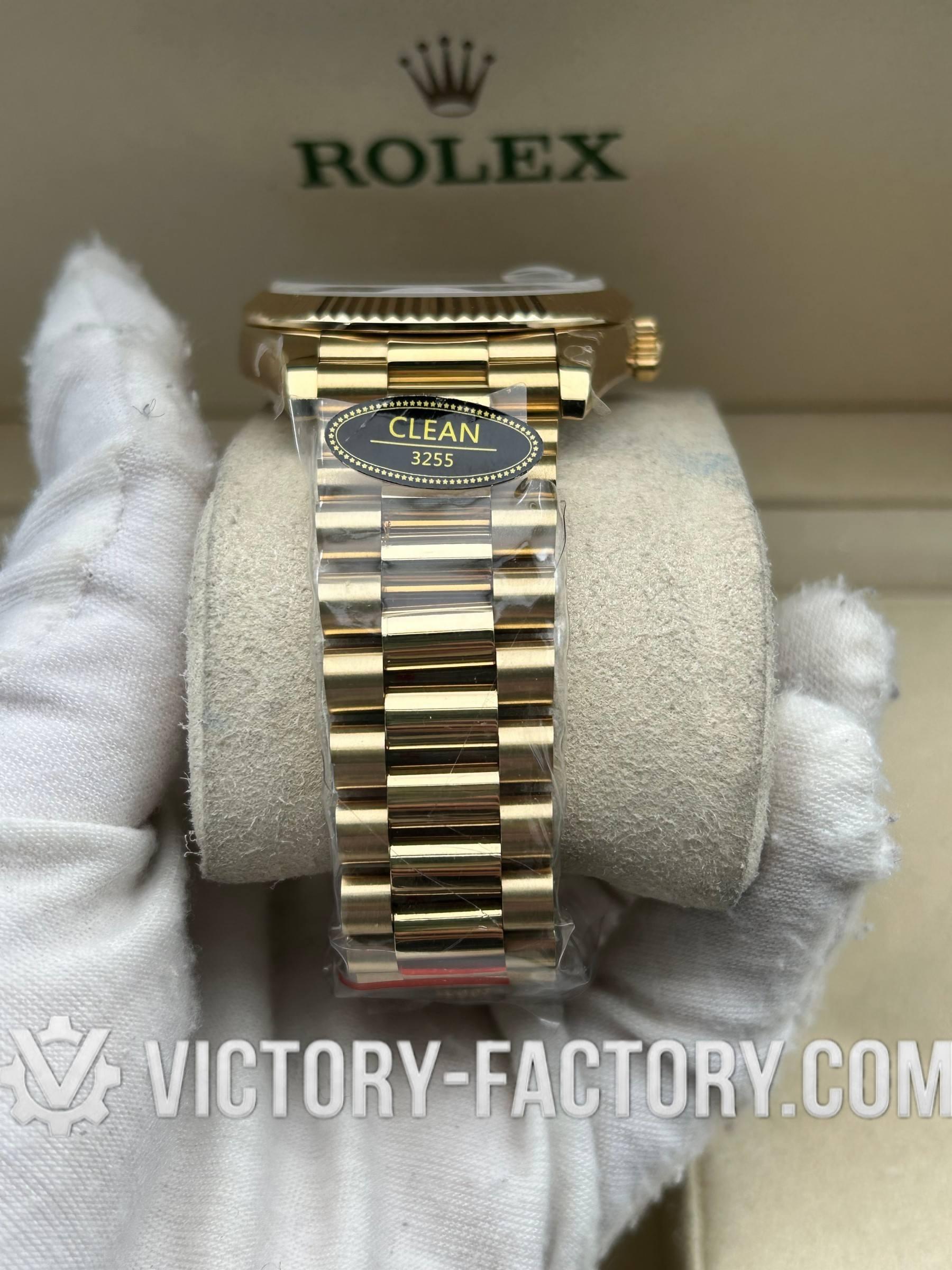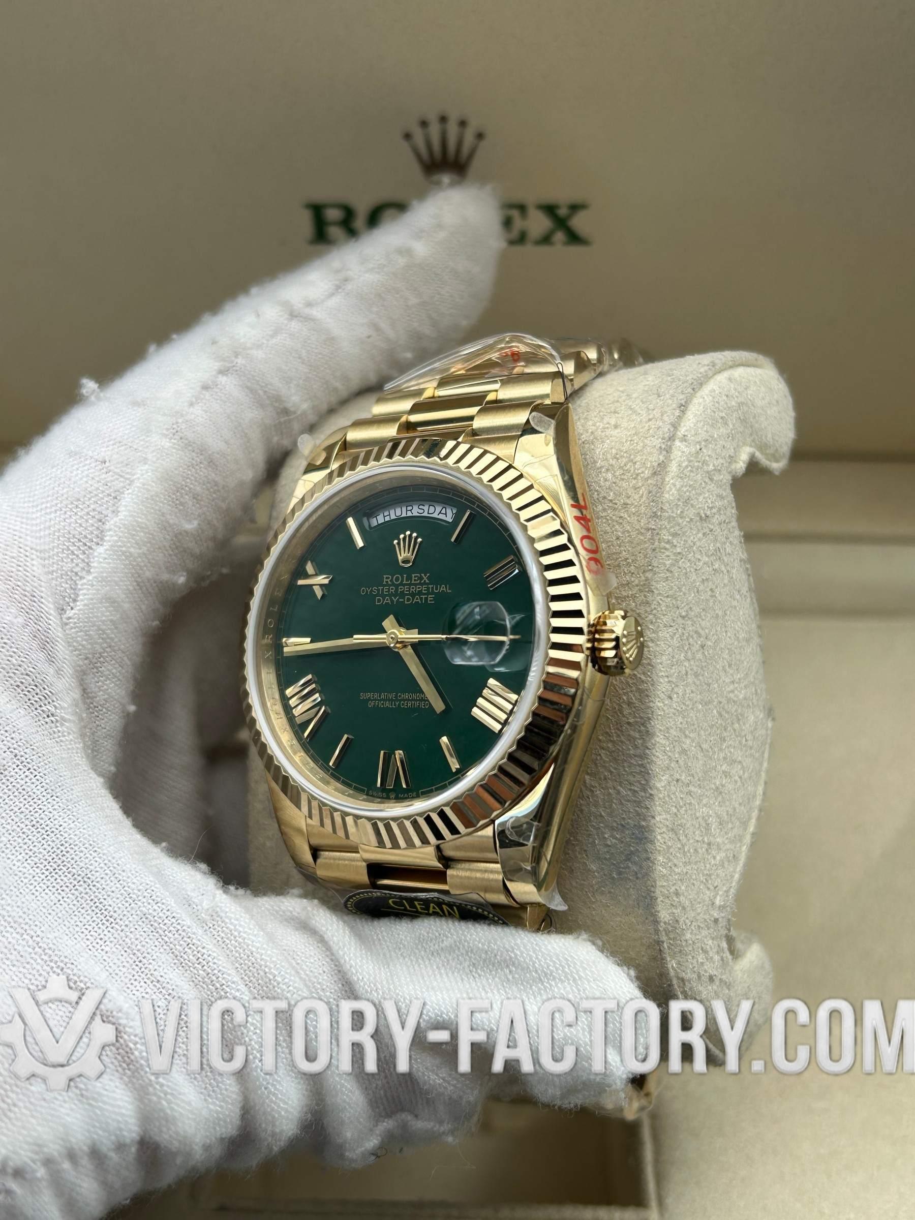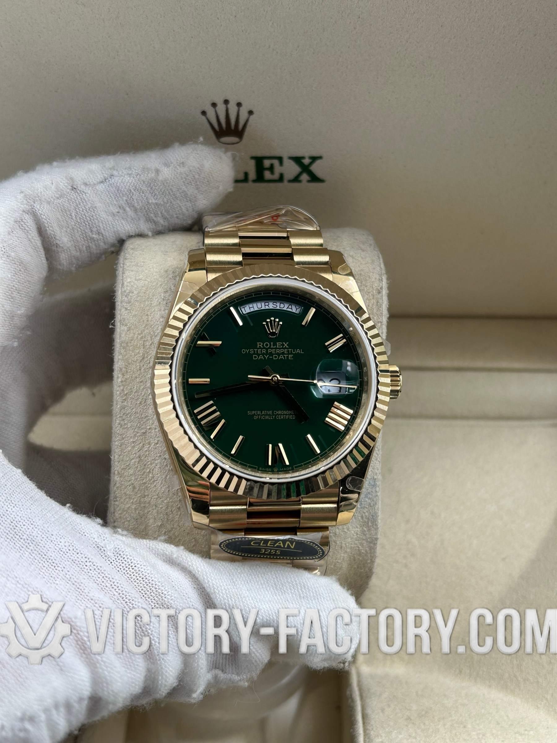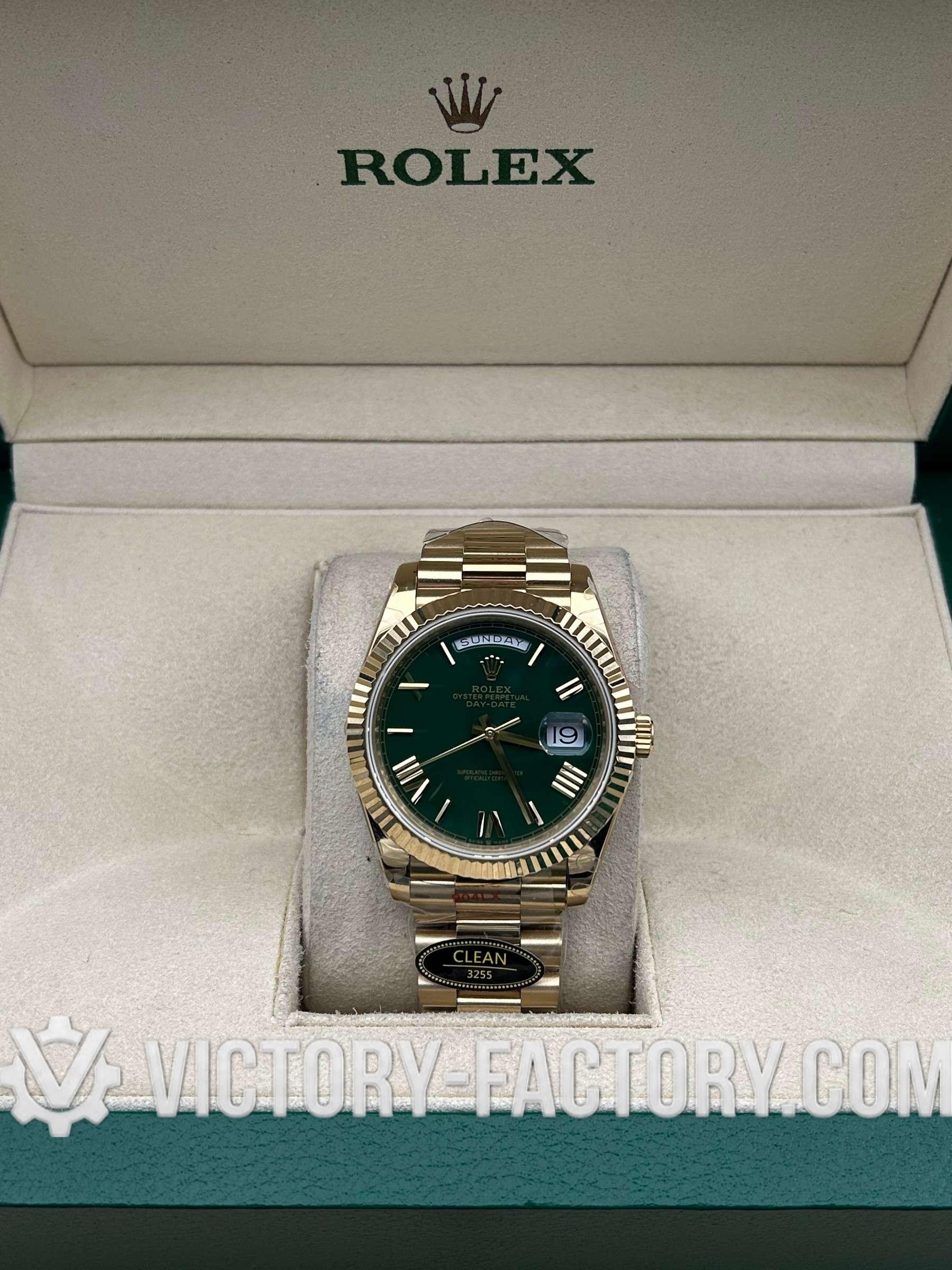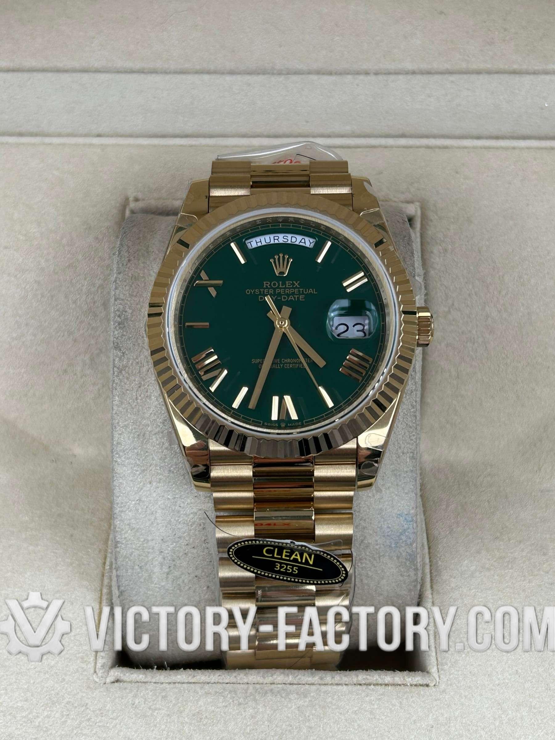 Product Overview: Victory Factory (VF) presents the definitive 1:1 replica of the Rolex Day-Date 40mm in Yellow Gold with the classic Green Dial. This masterpiece represents a perfect synergy of industry-leading components: it flawlessly inherits the world-class exterior parts from Clean Factory (CF) and pairs them with the unrivaled stability of the Dandong 3255 Integrated Movement. Every detail, from the weight of the gold plating to the sweep of the second hand, is a testament to unwavering precision.
