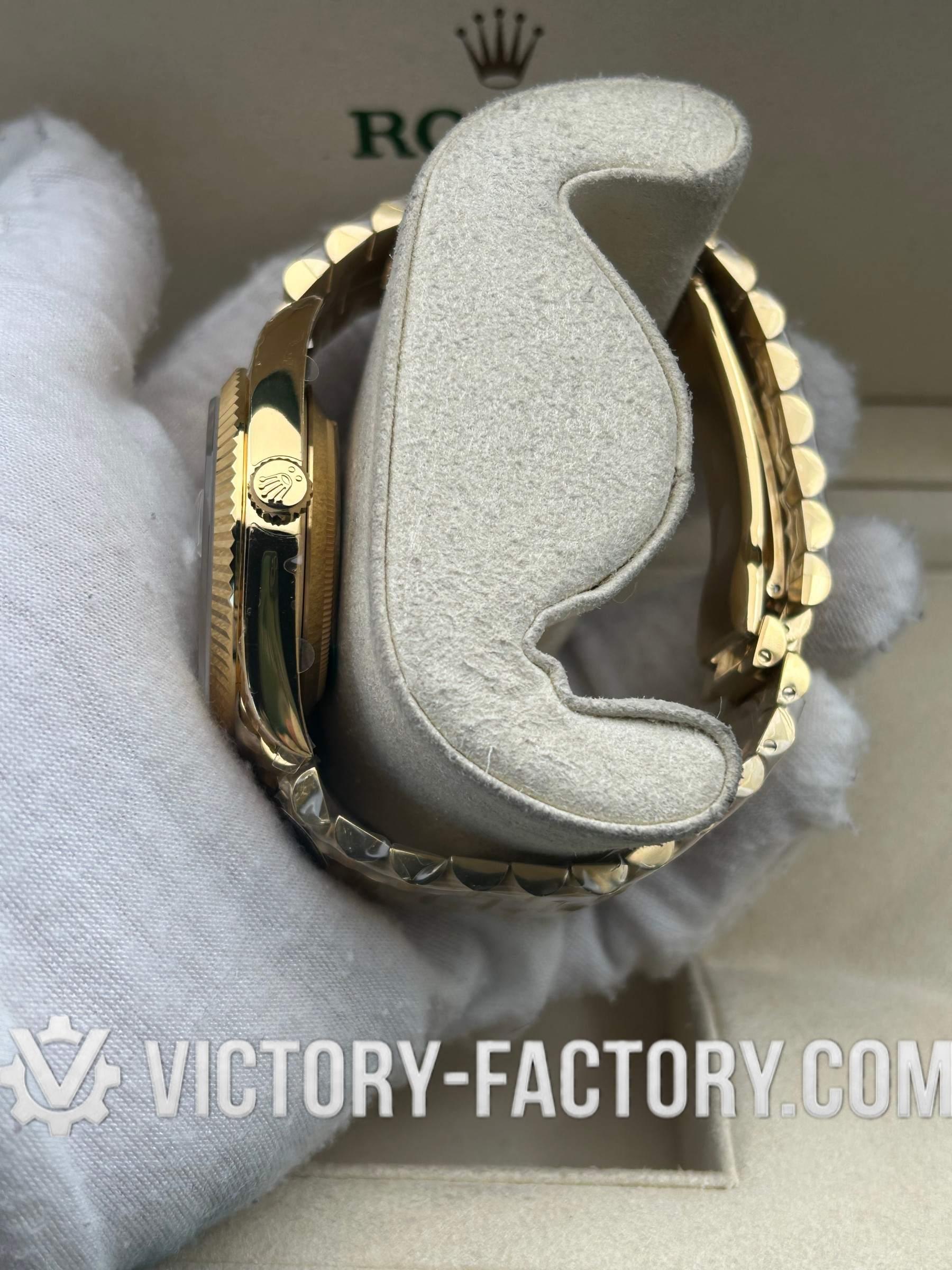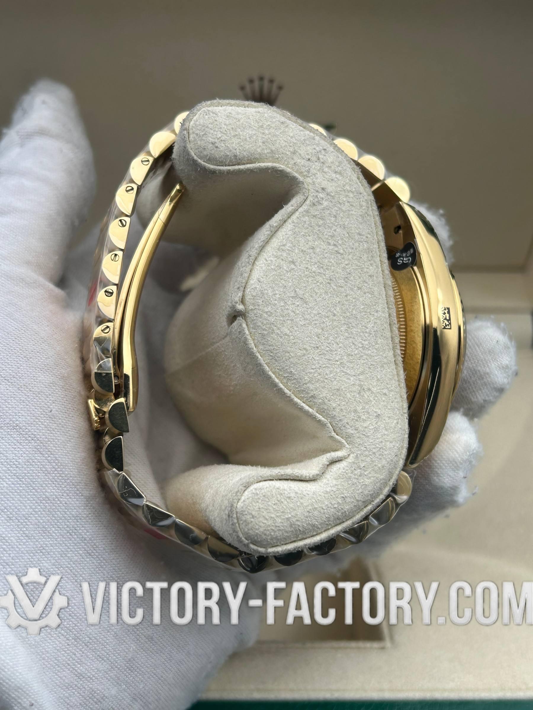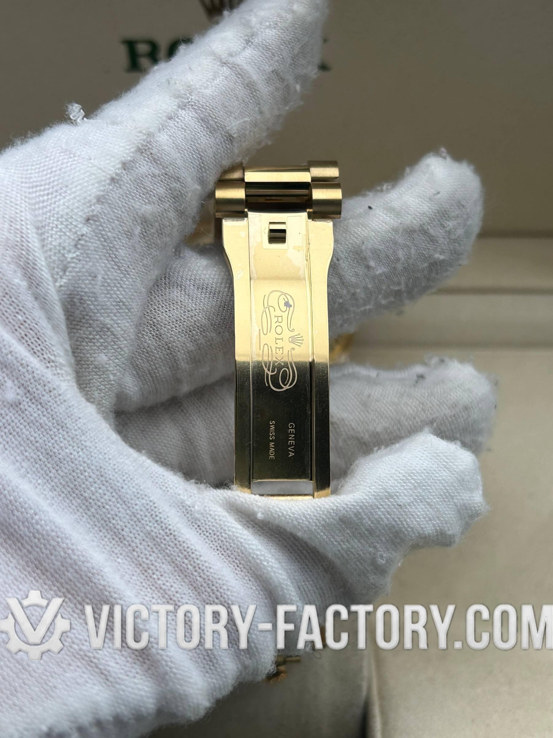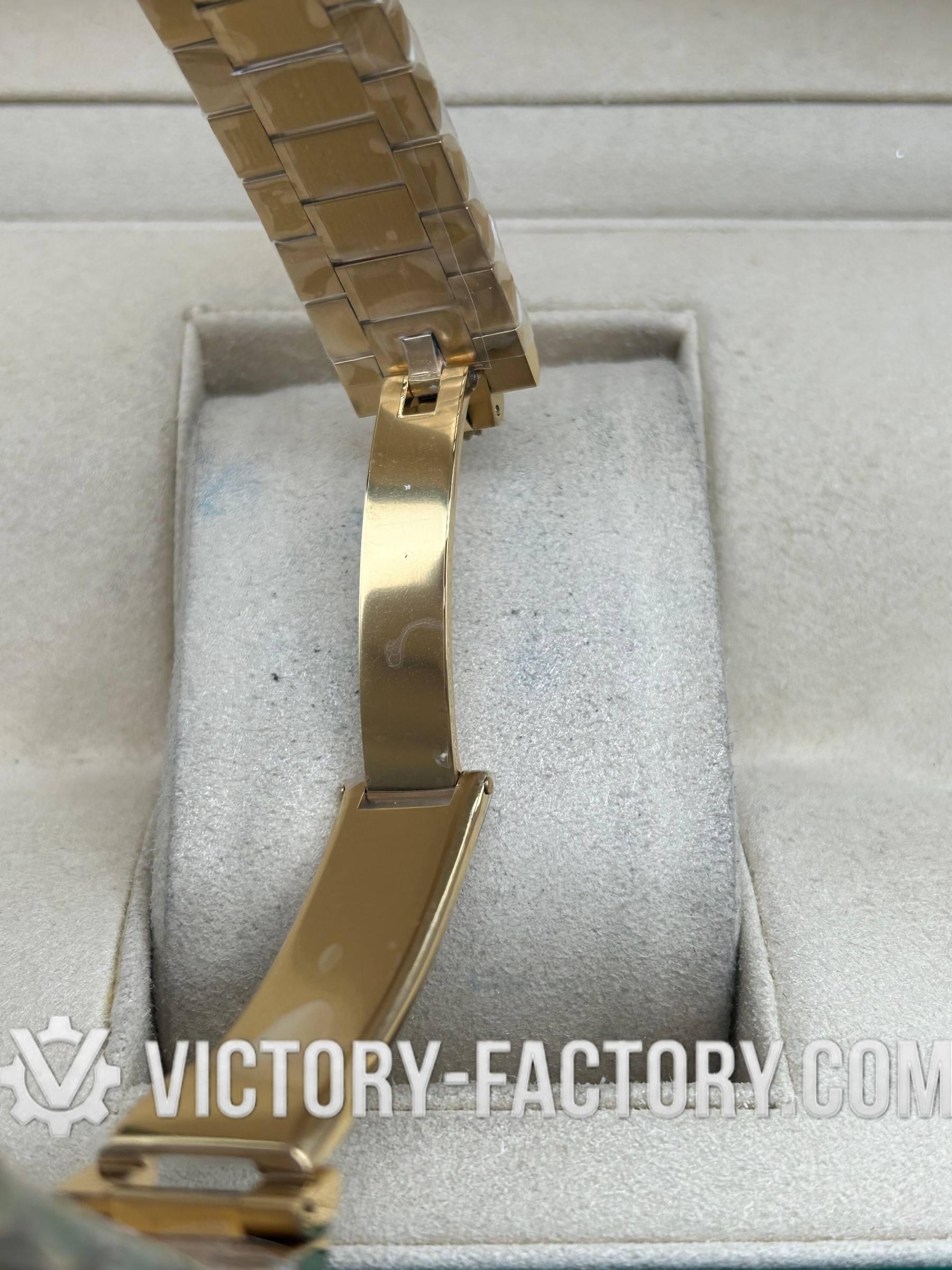 CASE: The 40mm Oyster case is constructed with 5 layers of 18k yellow gold plating over solid 904L stainless steel. It features a monobloc construction, matching Rolex’s Oystersteel dimensions exactly. The case includes a screw-down case-back and winding crown, complete with ‘ROLEX ROLEX’ laser engraving on the Rehaut ring for absolute authenticity.
