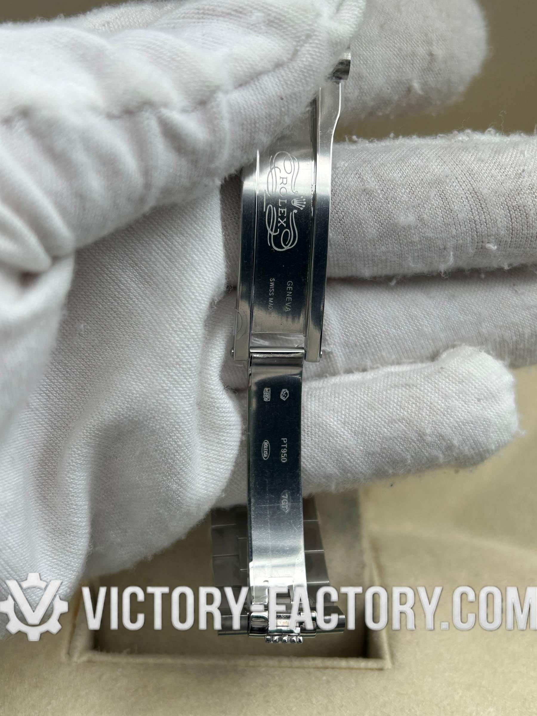 【CASE: 18k Platinum Plated 904L Steel】 The 40mm Oyster case is constructed with 5 layers of 18k Platinum plating over solid 904L stainless steel, precisely matching the hue and weight of Rolex’s Oystersteel. It features a screw-down case-back and crown, complete with ‘ROLEX ROLEX’ laser engraving on the Rehaut ring.
