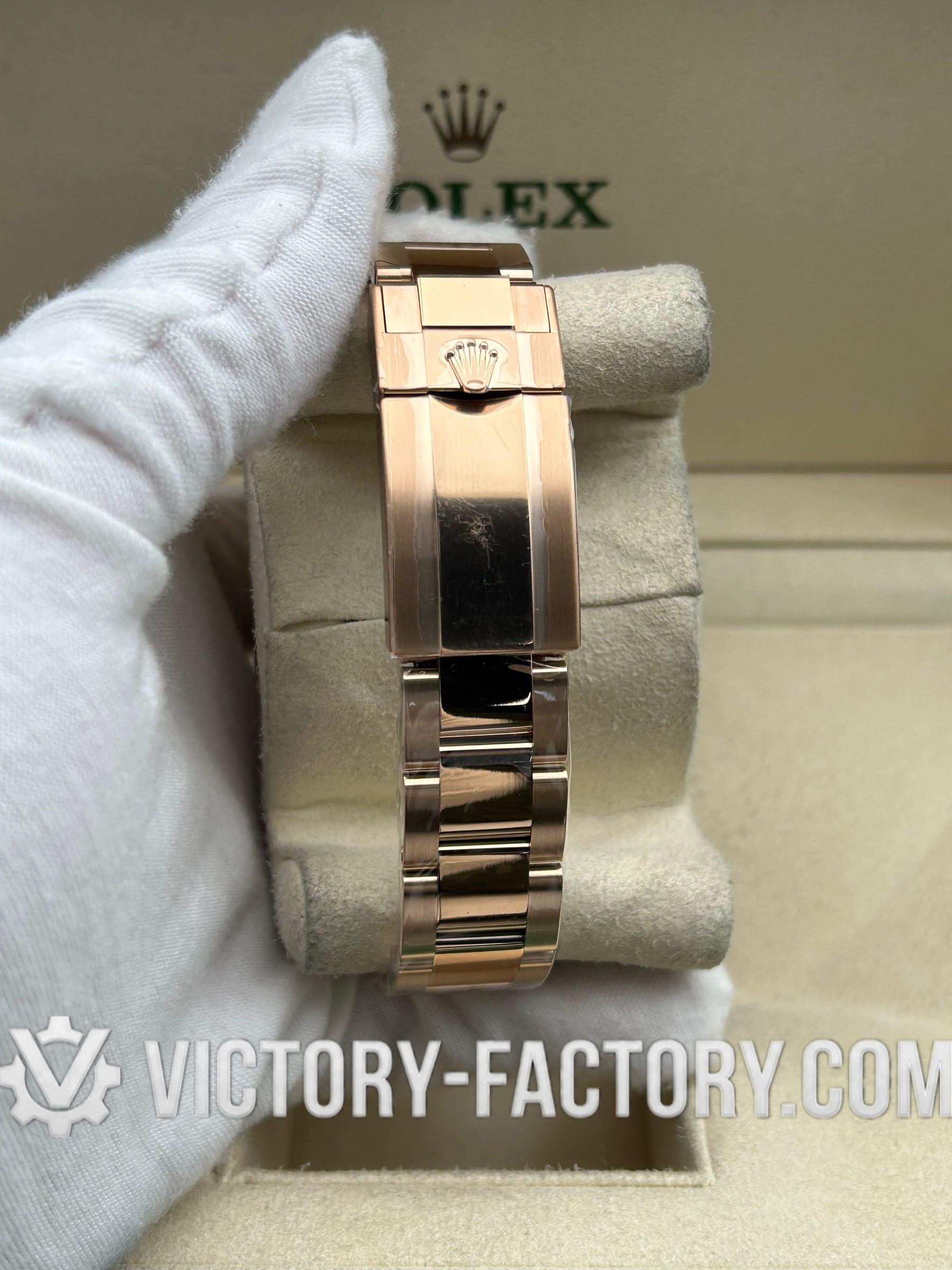 • CASE: The watch features a 40mm case made from Everose-18k Rose Gold wrapped over solid 904L stainless steel, mirroring the original Rolex steel’s monobloc construction. The case is complemented by a screw-down case-back, push-buttons, and a winding crown, all sealed with synthetic rubber for enhanced water resistance. Notable is the ‘ROLEXROLEX’ laser engraving on the Rehaut ring and the DLC scratch-protection coating, ensuring durability. Every dimension of the replica matches the original perfectly, with all parts interchangeable with an authentic Rolex.