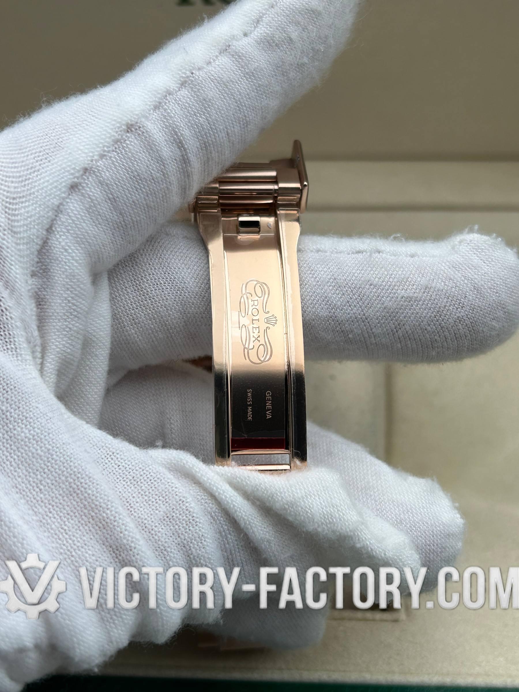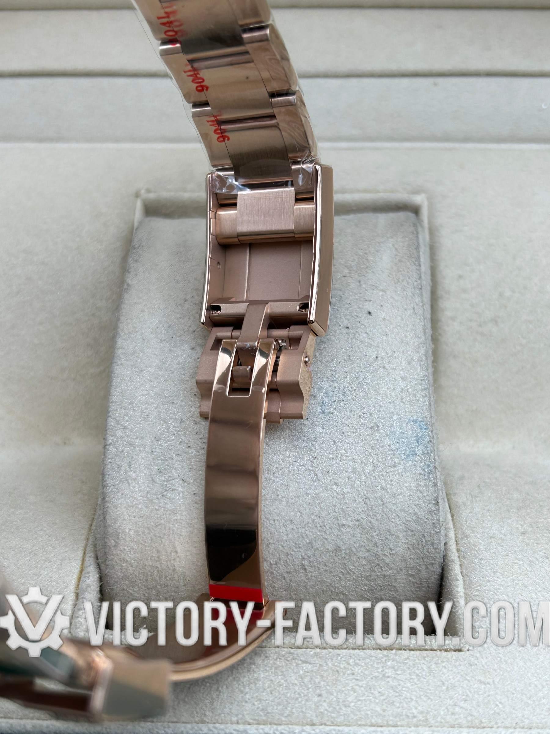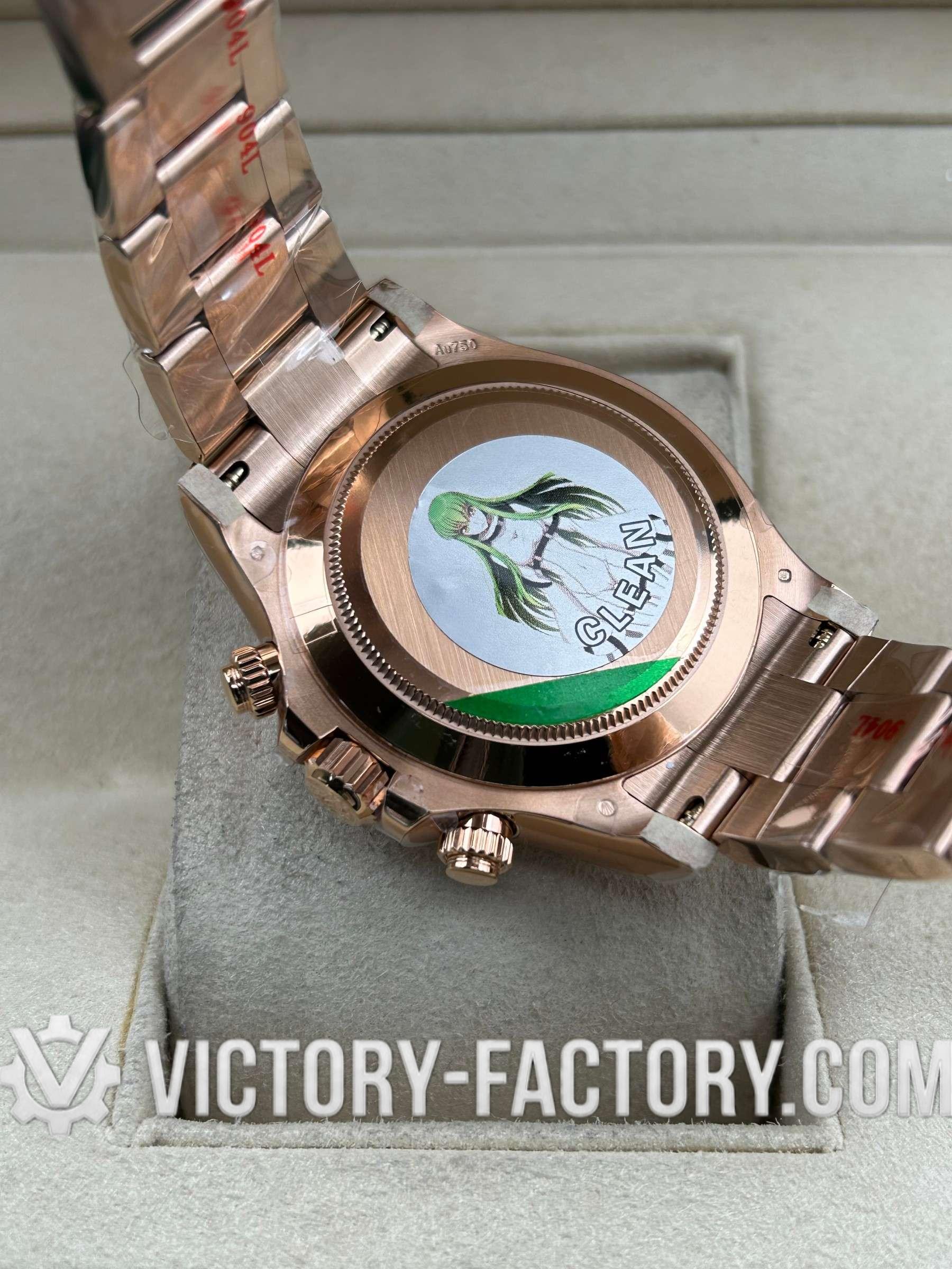 • Bezel: Victory Factory utilizes the genuine Clean Factory bezel, which is fixed and crafted from 18k Rose gold wrap solid 904L stainless steel, with black coated numerals and graduations. This design is a perfect replica of the original Rolex bezel.