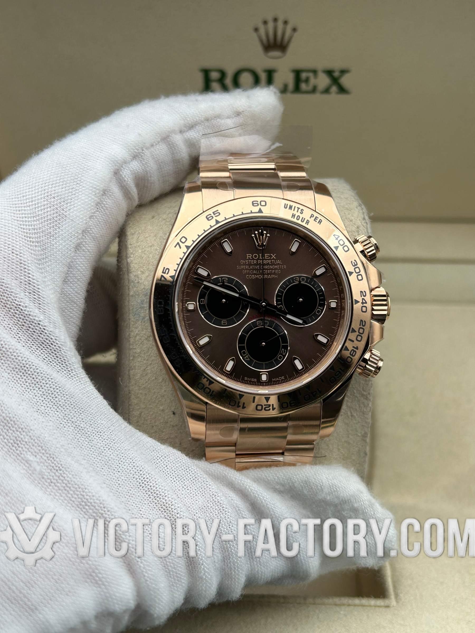 Victory Factory (VF) proudly presents the Rolex Cosmograph Daytona 18k Rose Gold Chocolate Dial Super Replica Watch, a symbol of luxury and precision engineering. This timepiece is expertly crafted to match the original Rolex Cosmograph Daytona in every aspect, from design to functionality, by integrating premium Clean Factory (C-Factory) exterior components with the industry-leading Dandong 4130 movement.