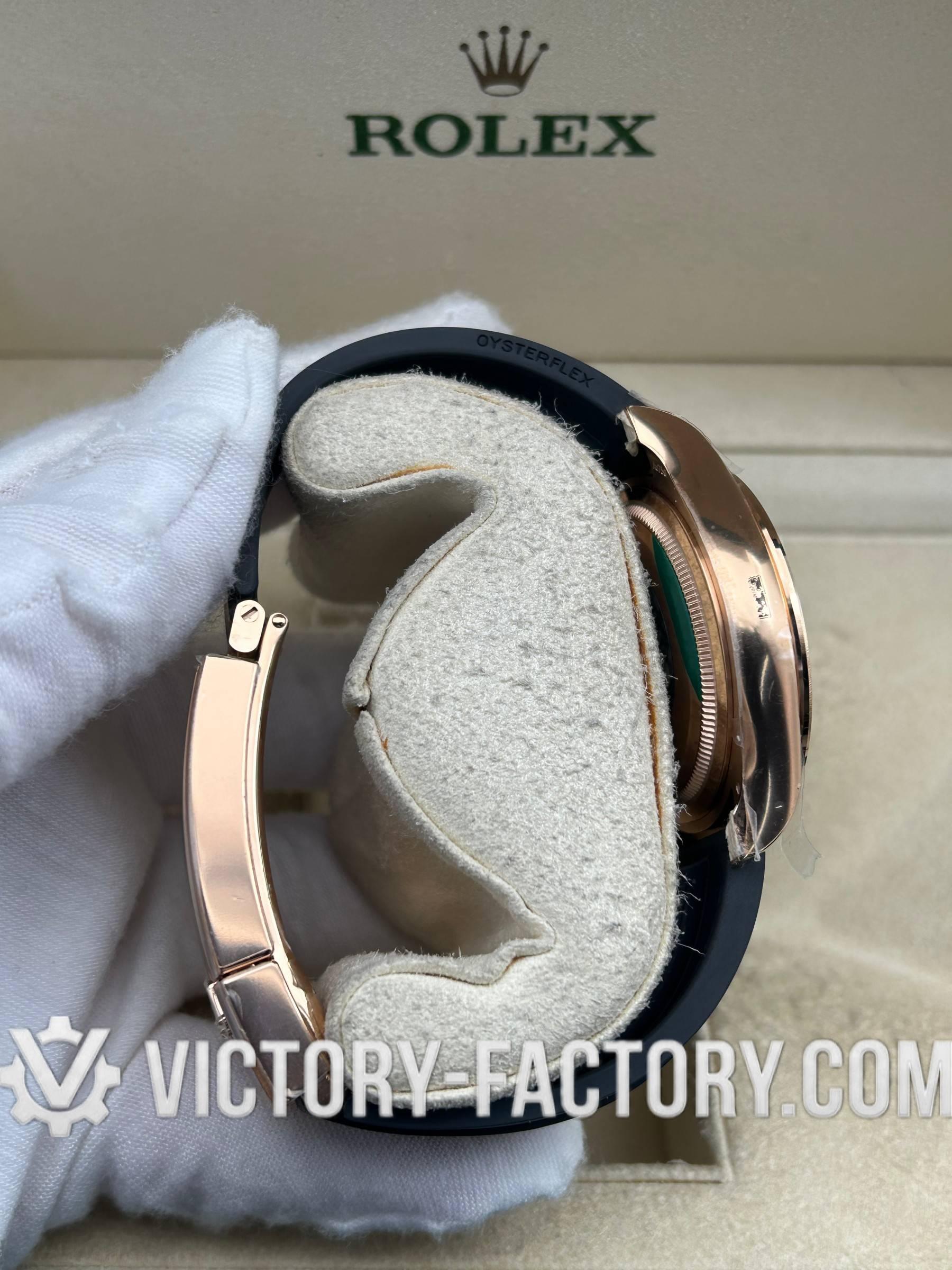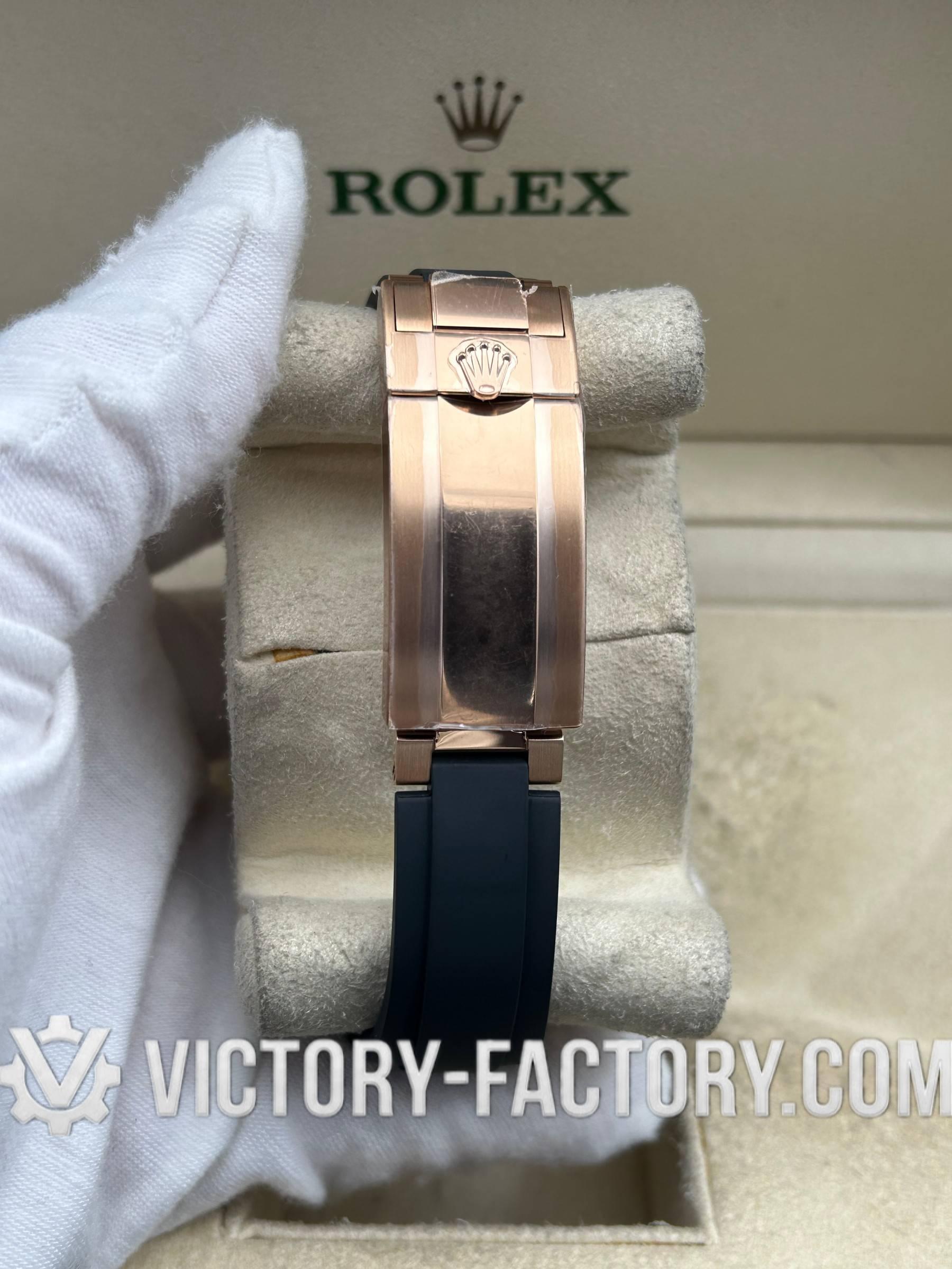CASE: Precision 18k Rose Gold Wrap on 904L Steel The 40mm case is crafted from solid 904L stainless steel, layered with a thick 18k rose gold wrap that perfectly matches the “Everose” hue of the genuine Rolex. The monobloc construction, screw-down case back, and Triplock winding crown are all enhanced with synthetic rubber seals for 100% water resistance. Dimensions are 1:1 identical to the original, allowing for full parts interchangeability.