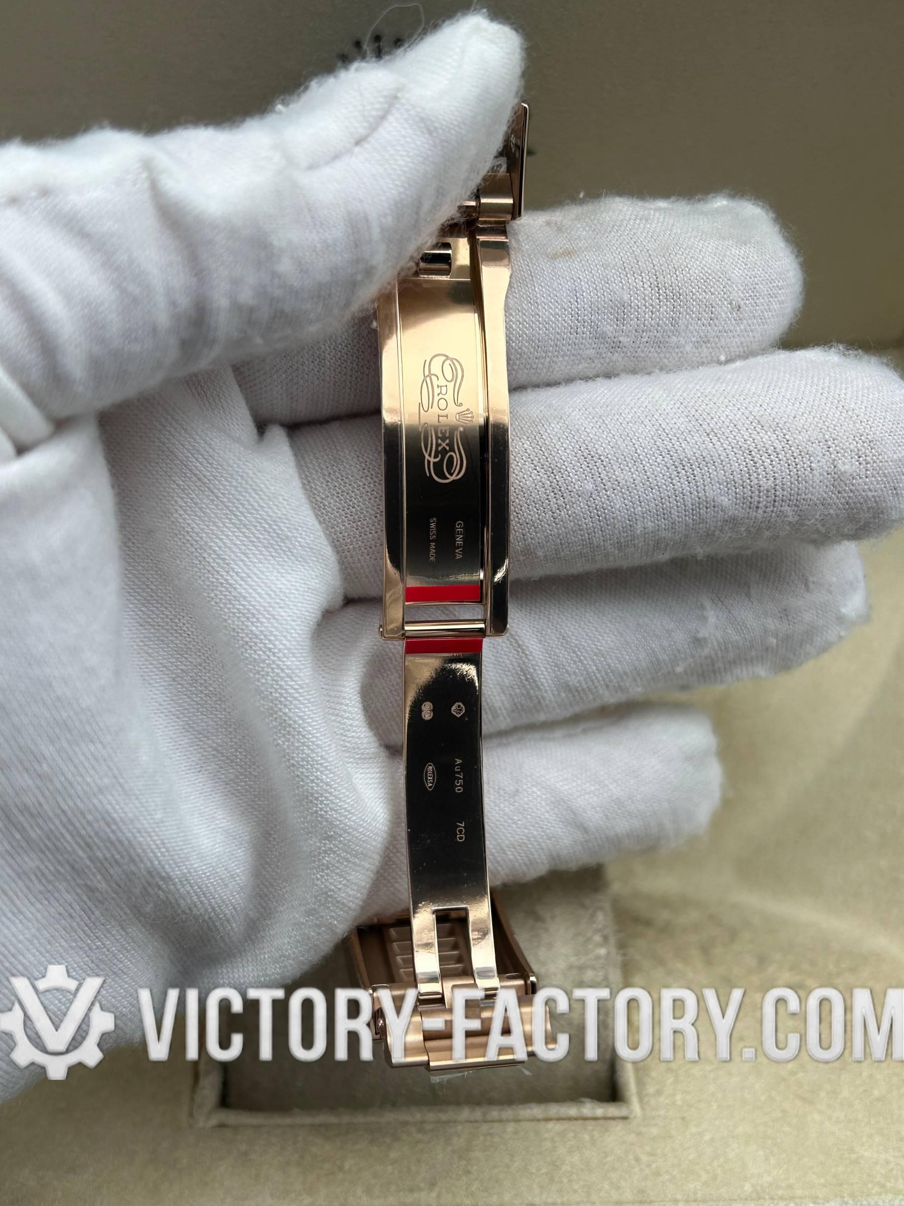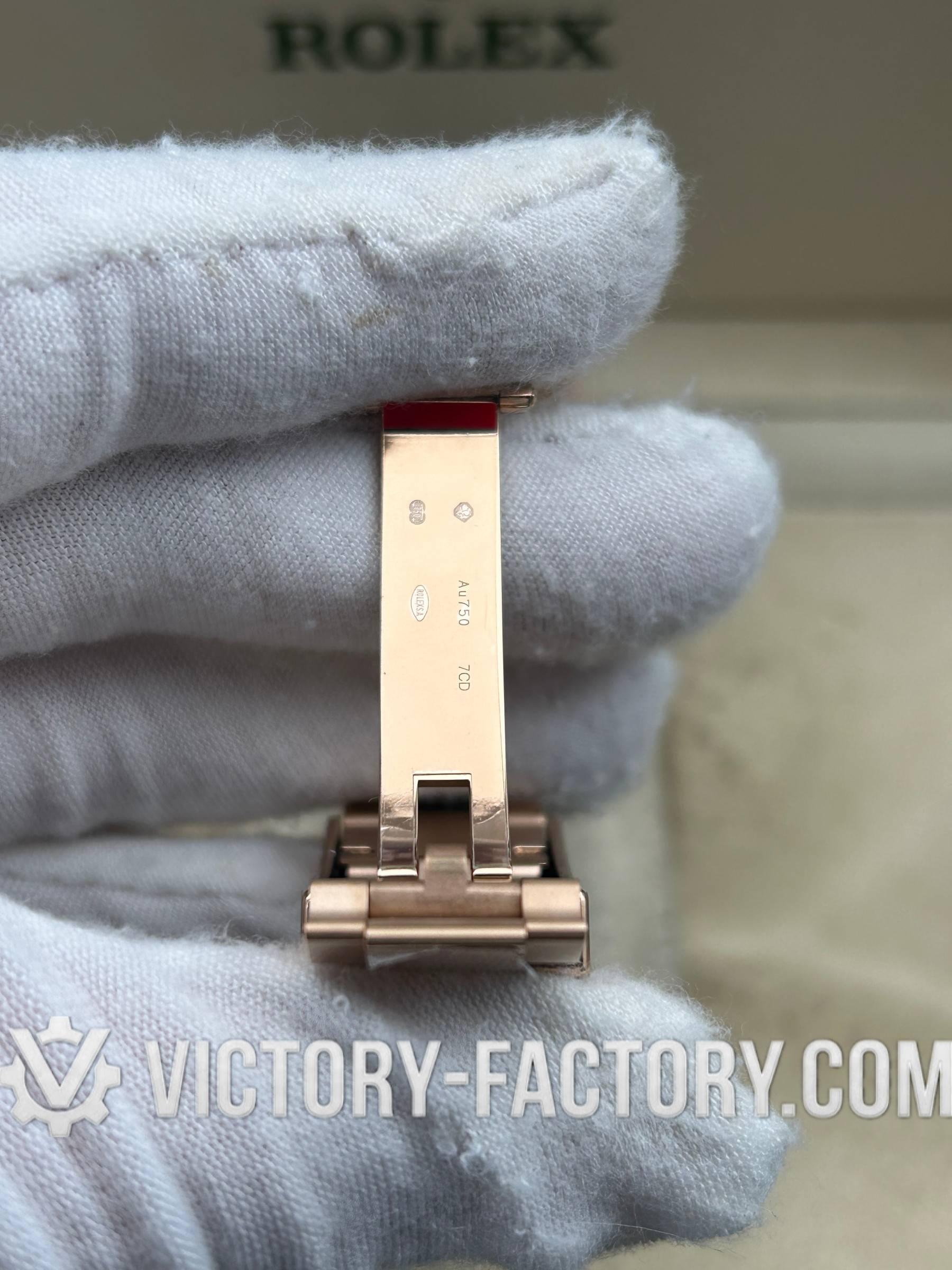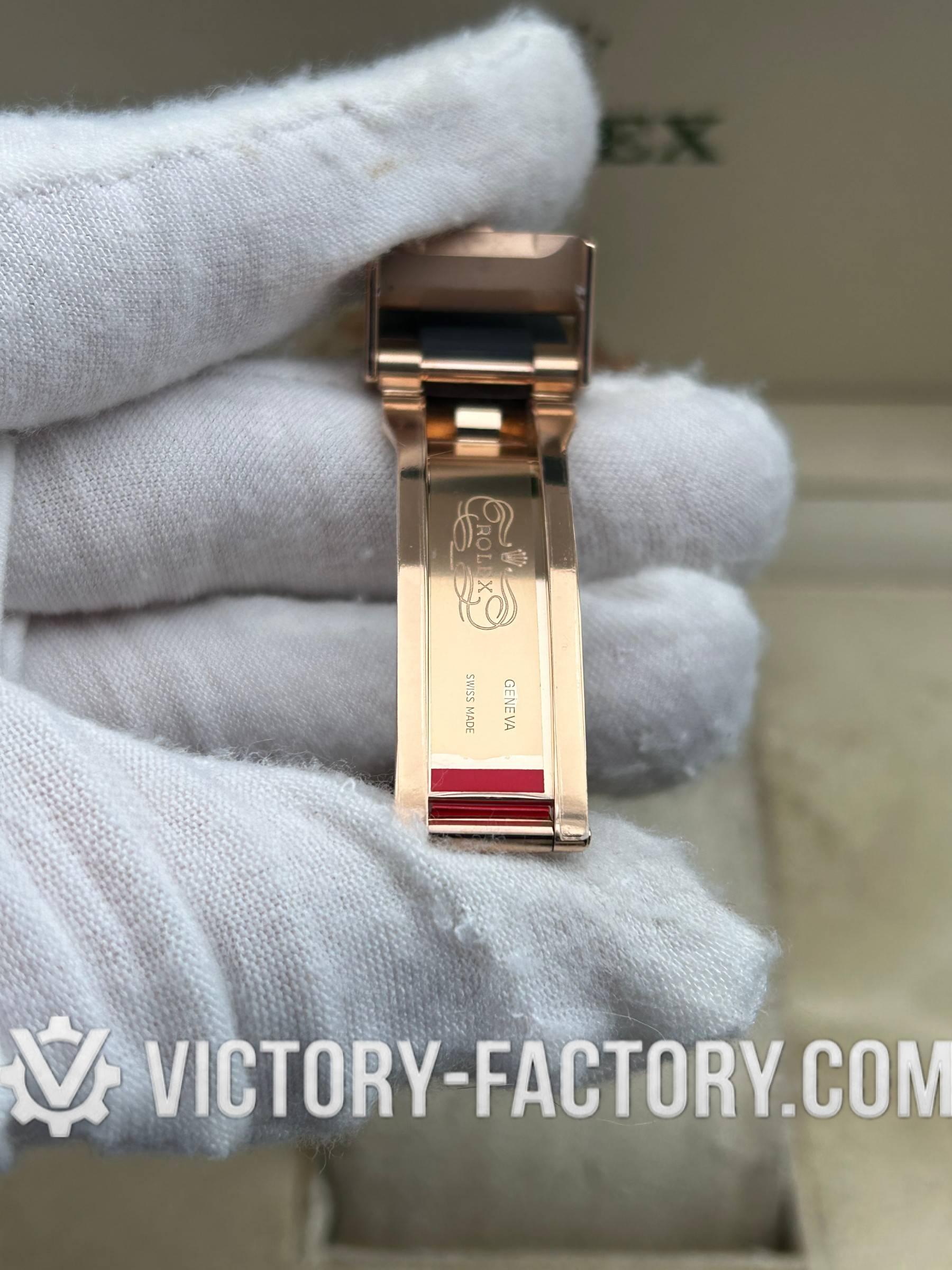 BRACELET: 18k Rose Gold Oyster Design The solid 904L steel Oyster bracelet is wrapped in 18k rose gold and protected by a DLC scratch-protection coating. It features a folding Oysterlock safety clasp with an Easylink 5mm comfort extension, providing both luxury and comfort.
