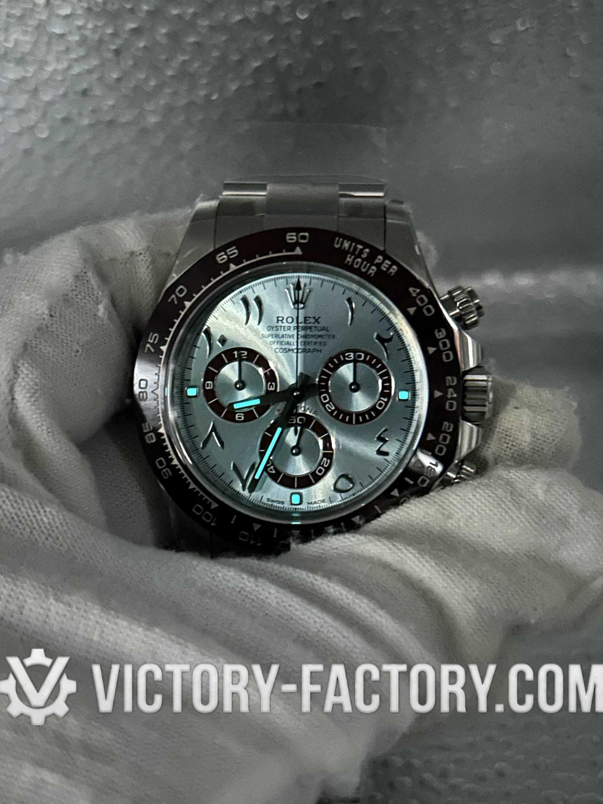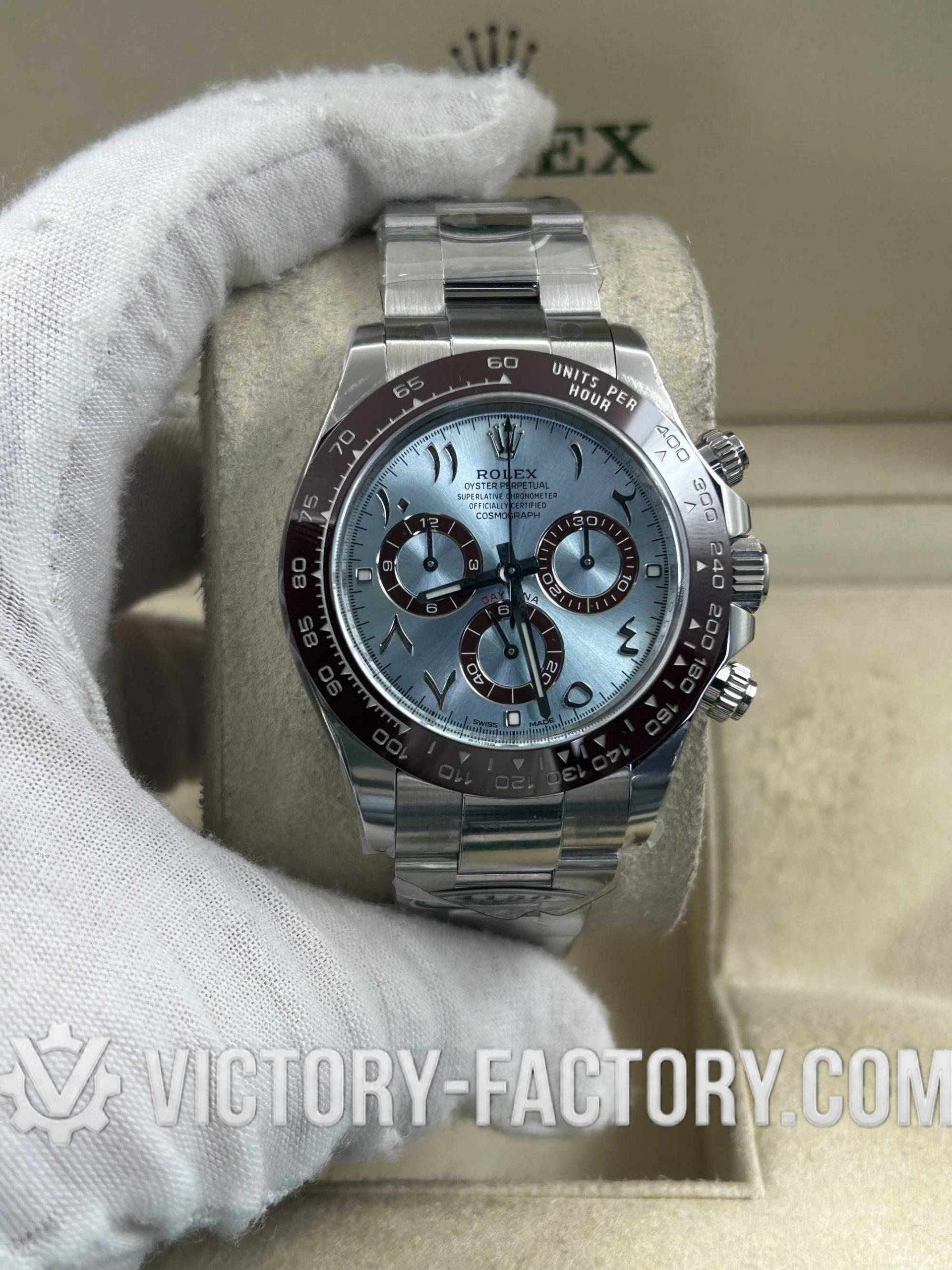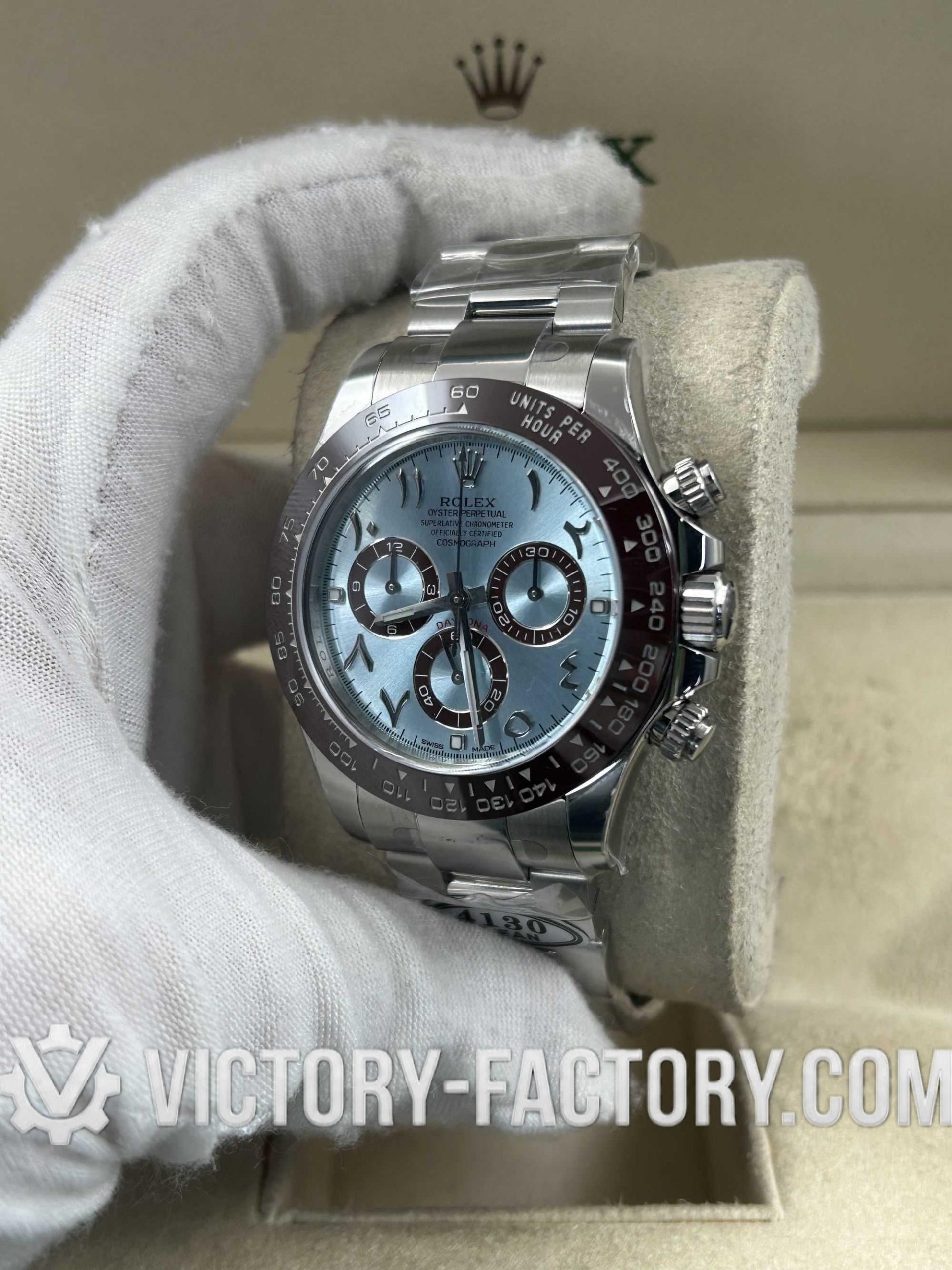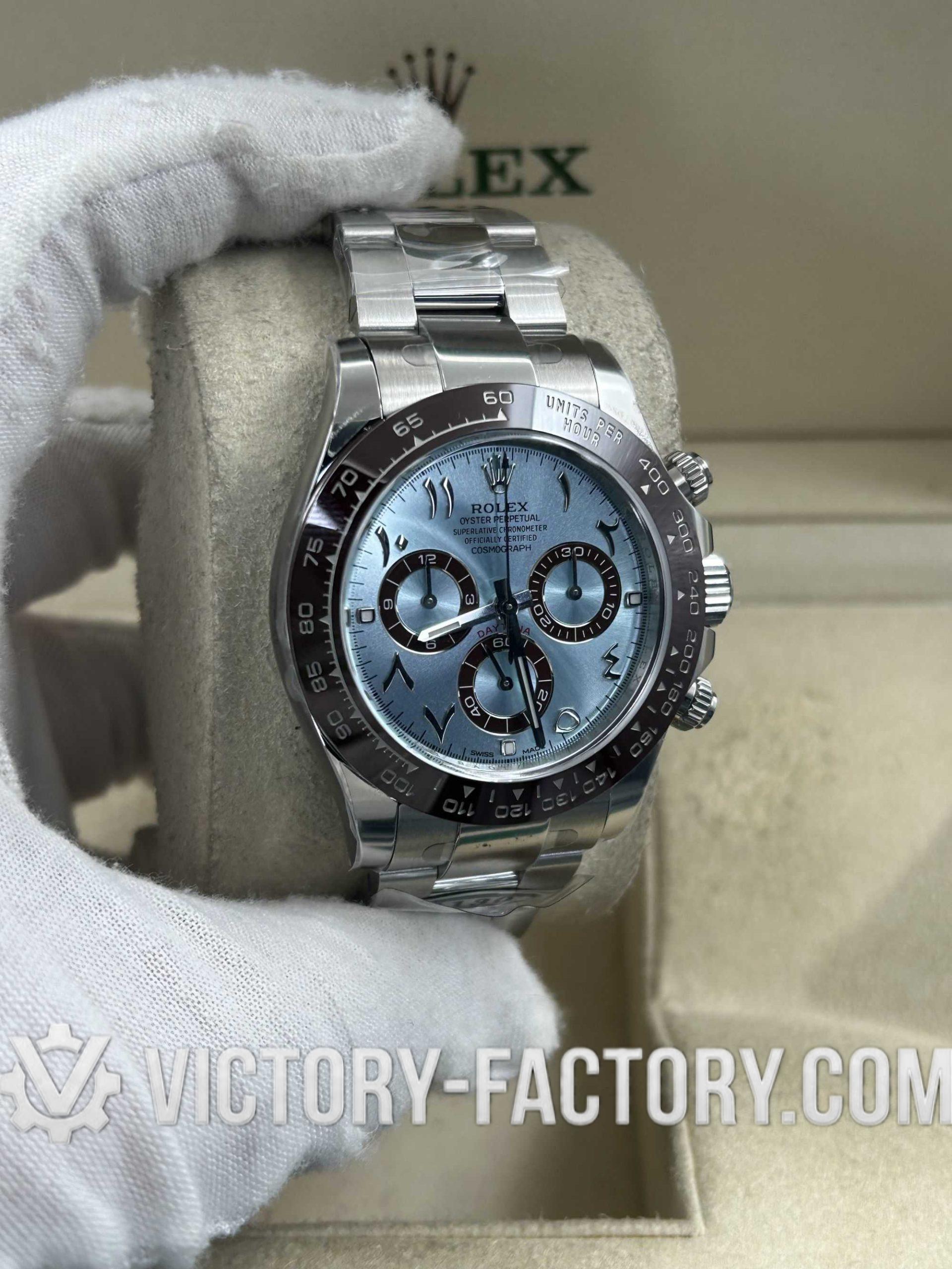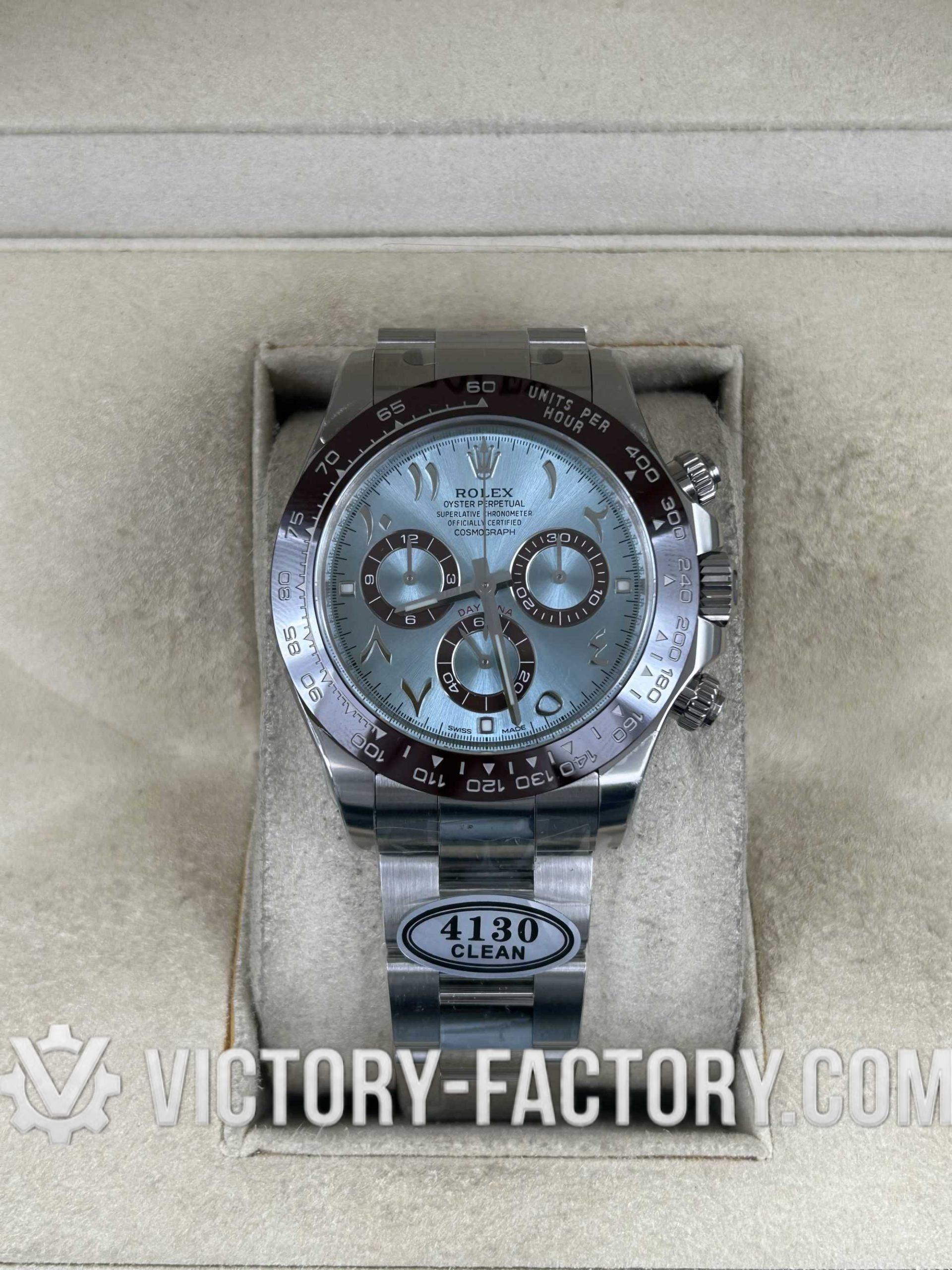 Victory Factory (VF) proudly presents the Rolex Cosmograph Daytona 116506 Ice Blue Dial with Arabic Markers Super Replica Watch, a symbol of luxury and precision engineering. This timepiece is expertly crafted to match the original Rolex Cosmograph Daytona in every aspect, from design to functionality, by integrating premium Clean Factory (C-Factory) exterior components with the industry-leading Dandong 4130 movement.