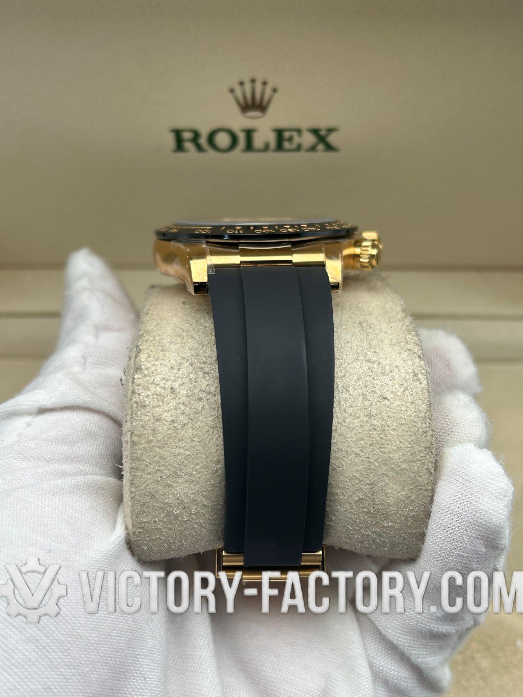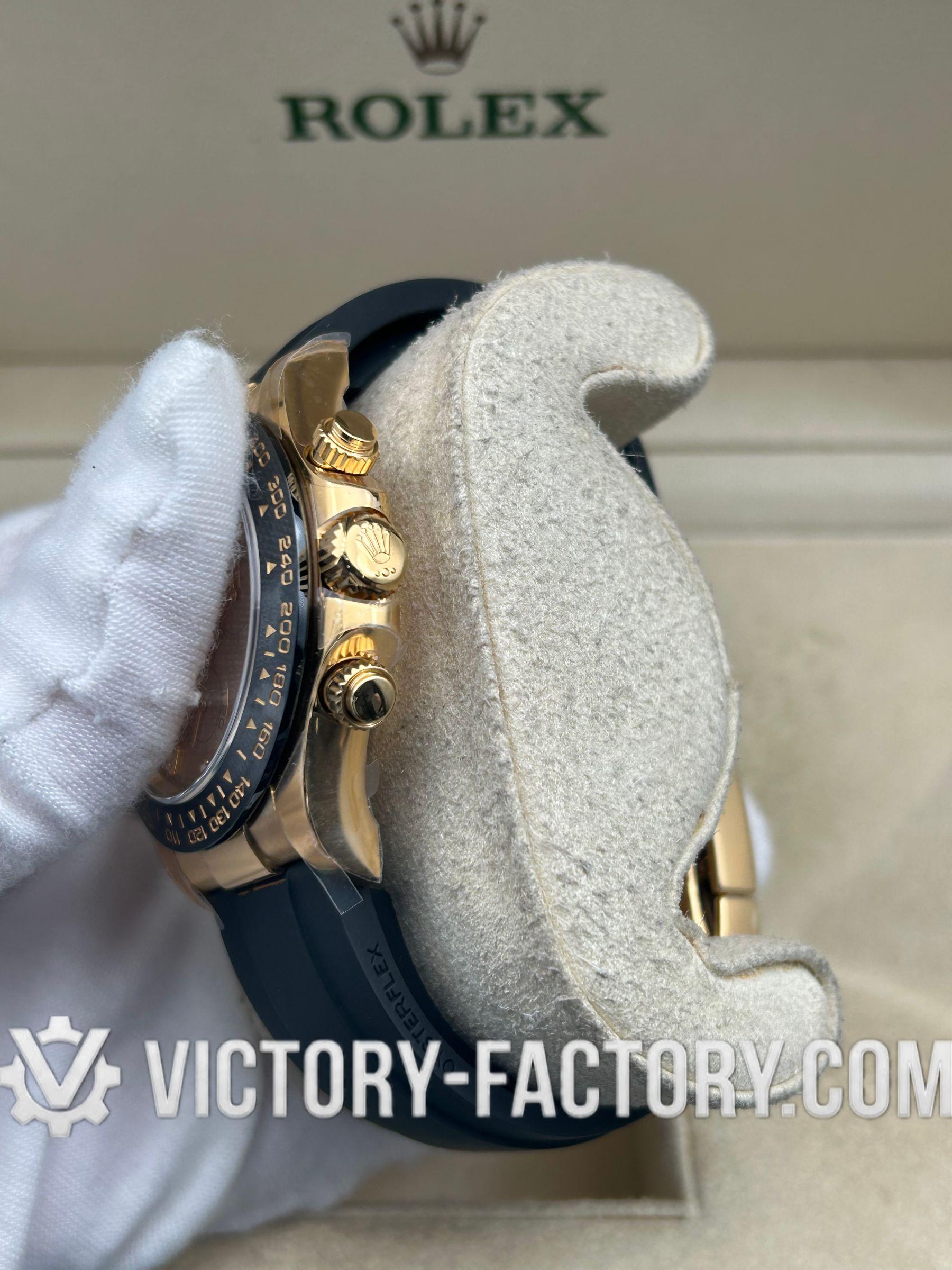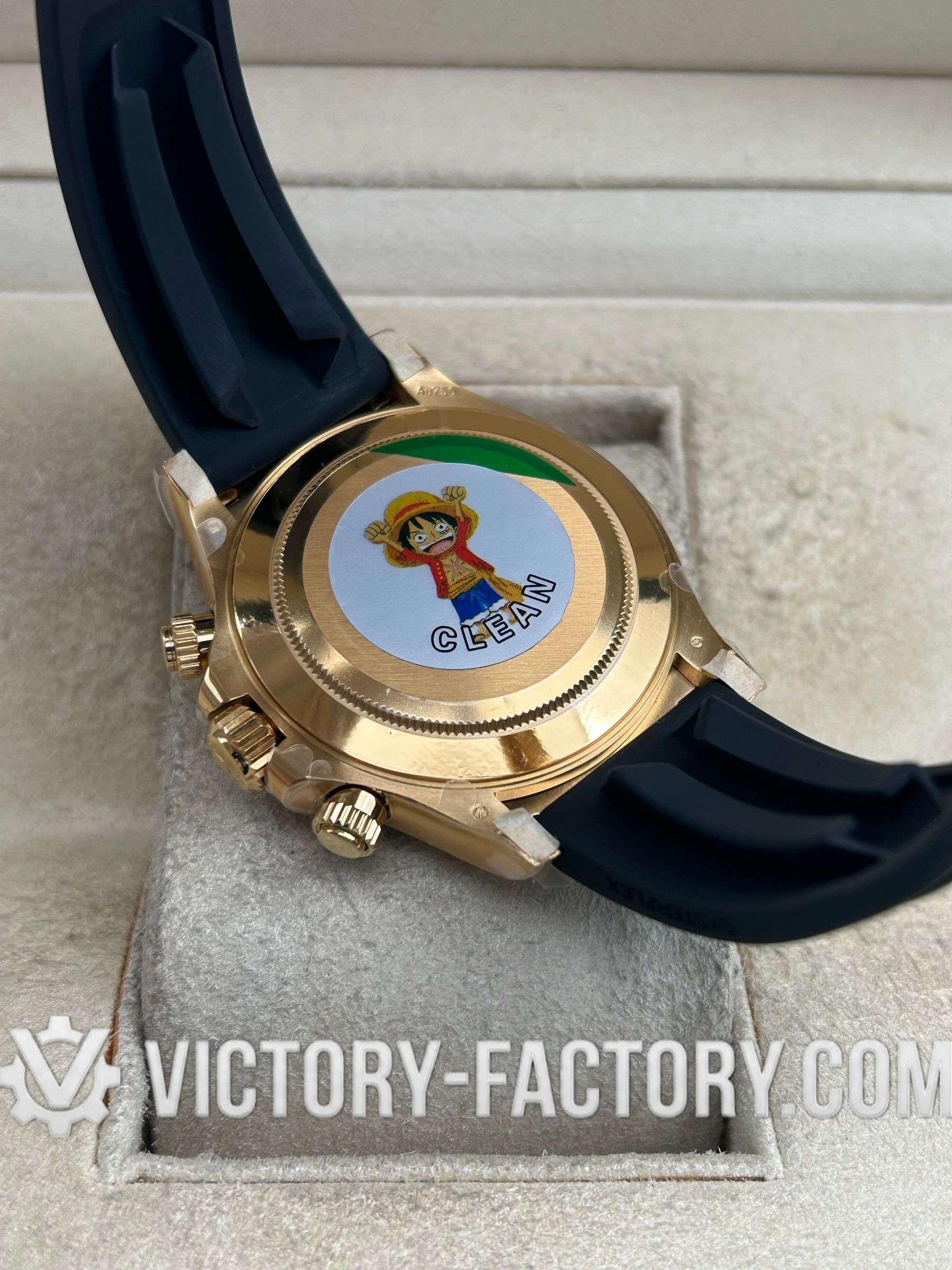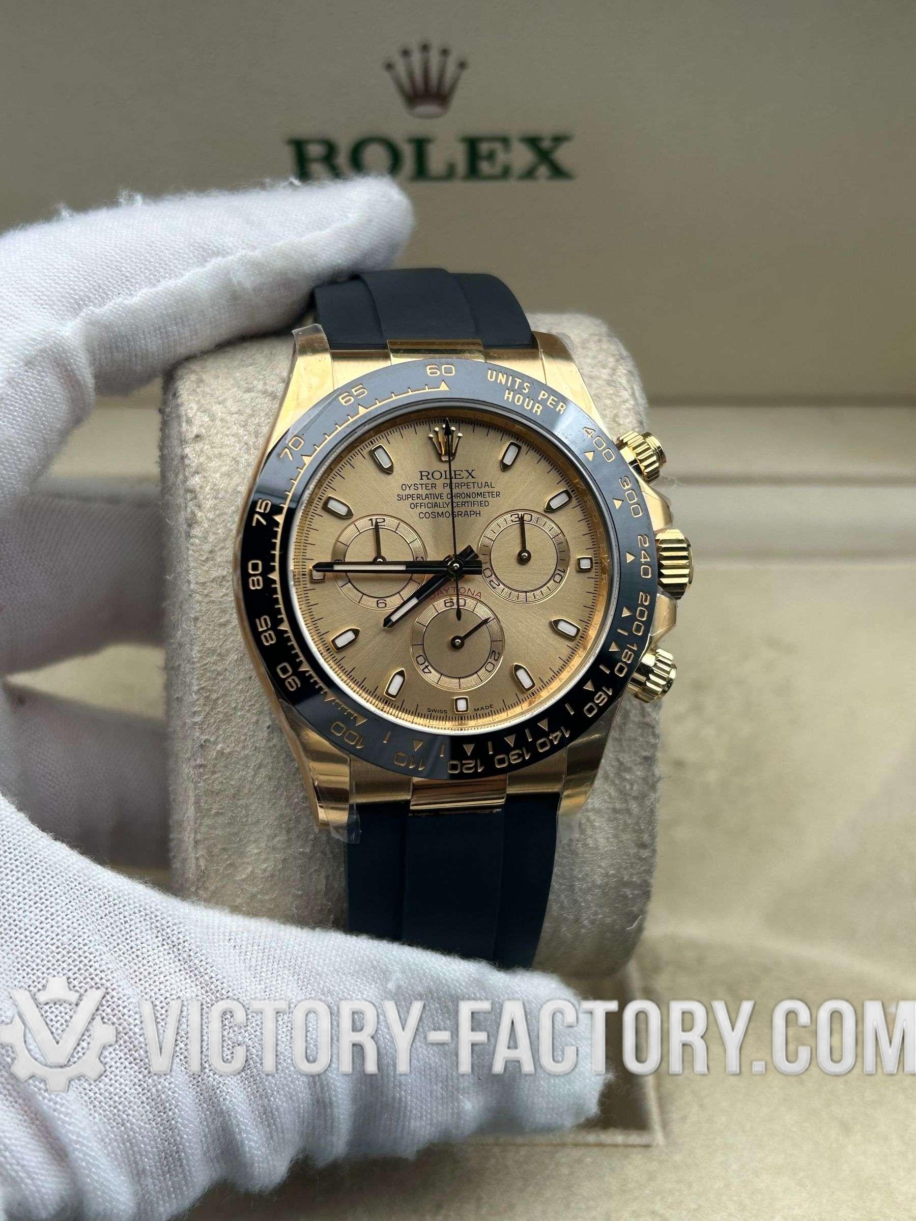Victory Factory (VF) proudly presents the Rolex Cosmograph Daytona 18k Gold Dial Super Replica Watch, a symbol of luxury and precision engineering. This timepiece is expertly crafted to match the original Rolex Cosmograph Daytona in every aspect, from design to functionality, by integrating premium Clean Factory (C-Factory) exterior components with the industry-leading Dandong 4130 movement.
