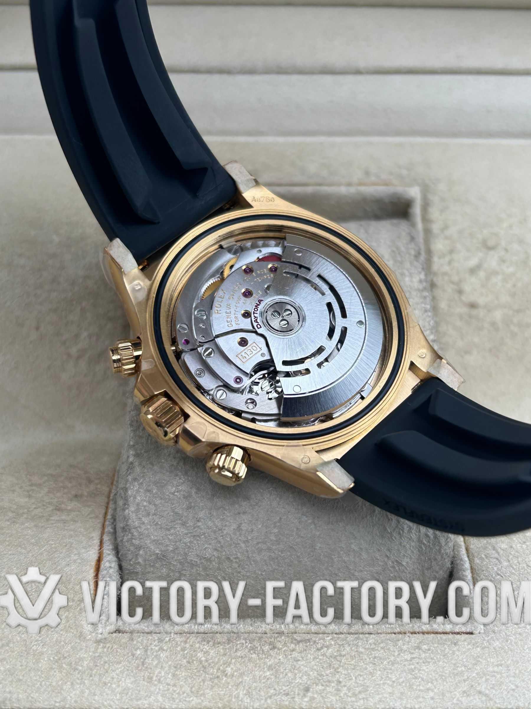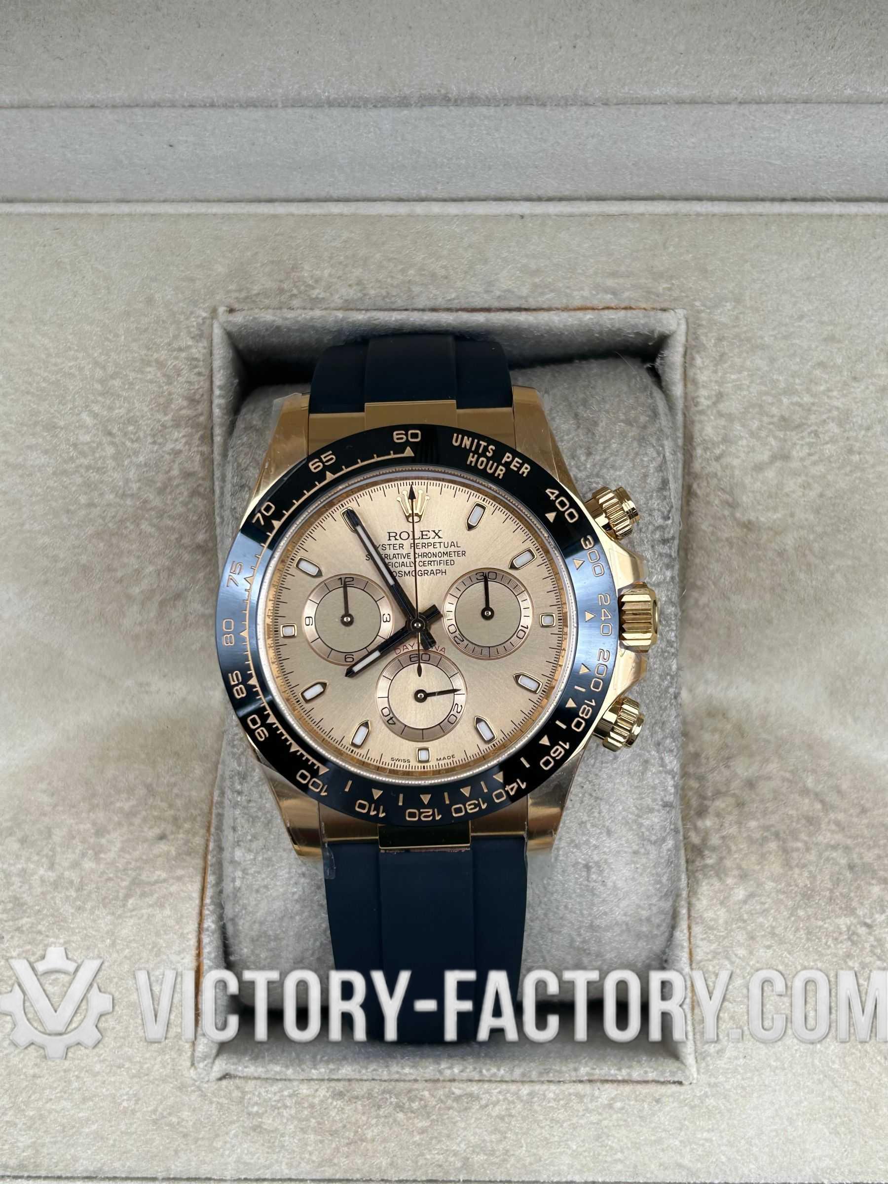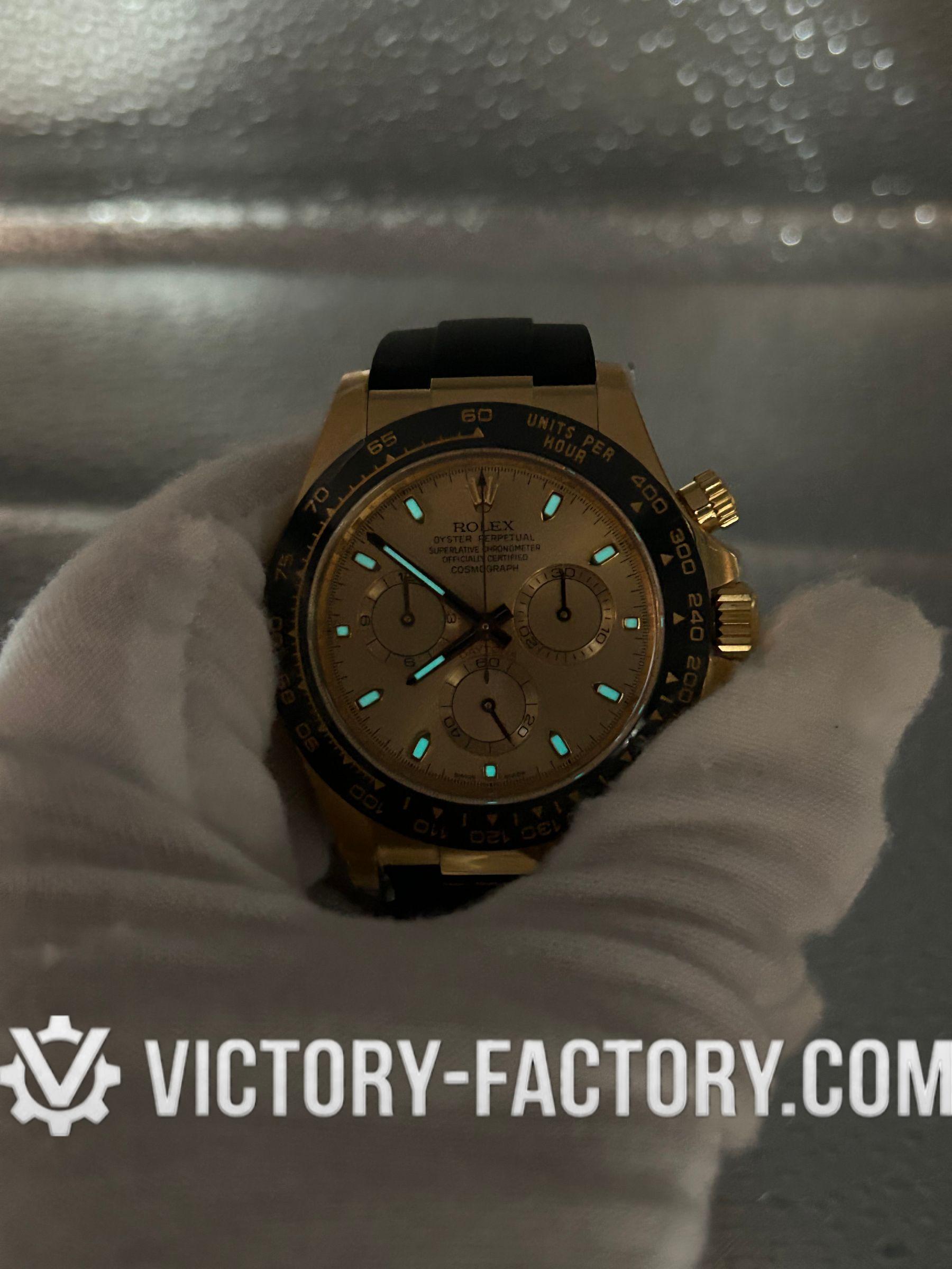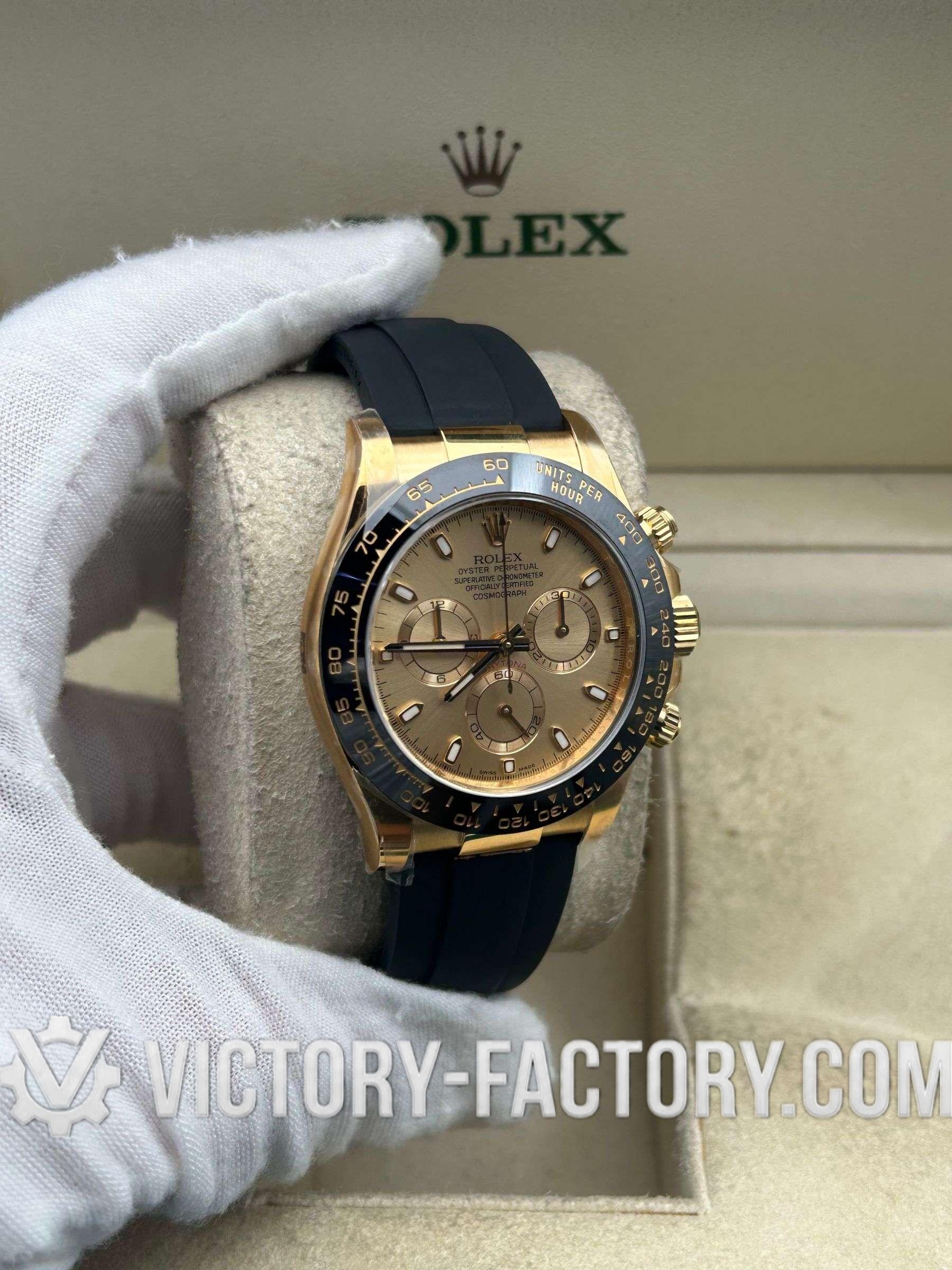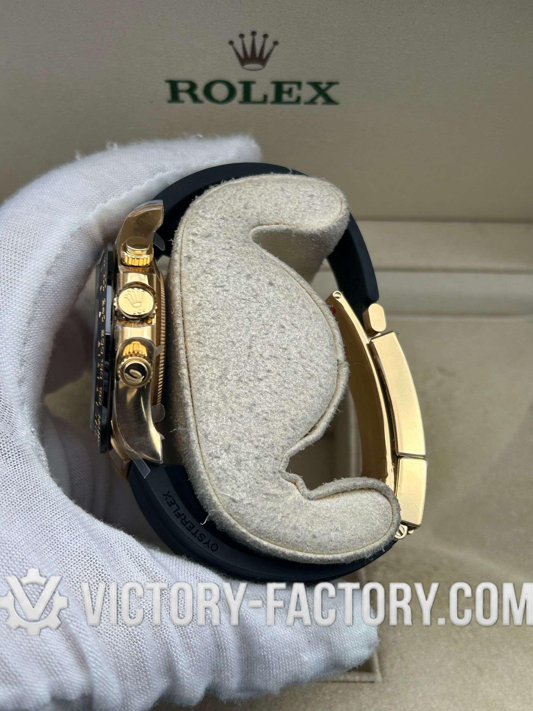 Victory Factory (VF) proudly presents the Rolex Cosmograph Daytona 18k Gold Dial Super Replica Watch, a symbol of luxury and precision engineering. This timepiece is expertly crafted to match the original Rolex Cosmograph Daytona in every aspect, from design to functionality, by integrating premium Clean Factory (C-Factory) exterior components with the industry-leading Dandong 4130 movement.