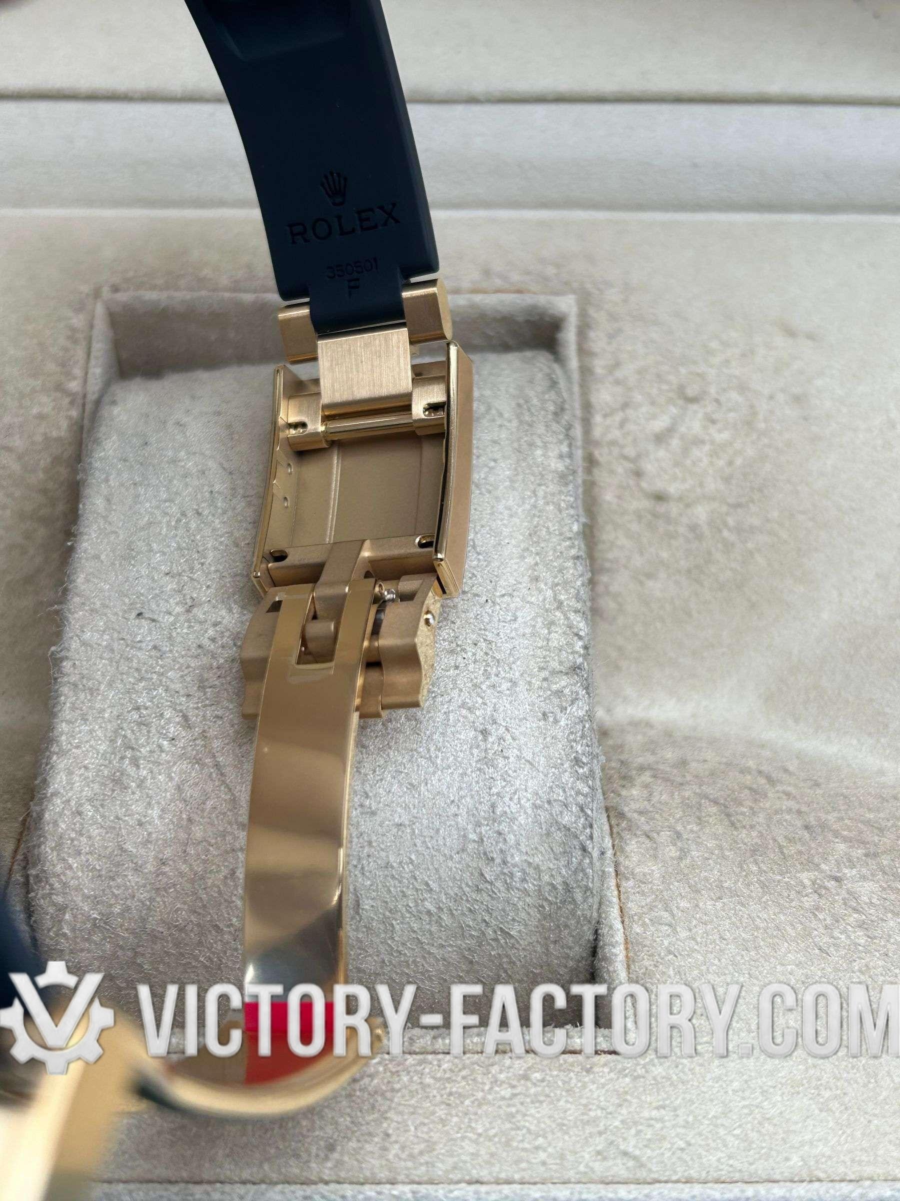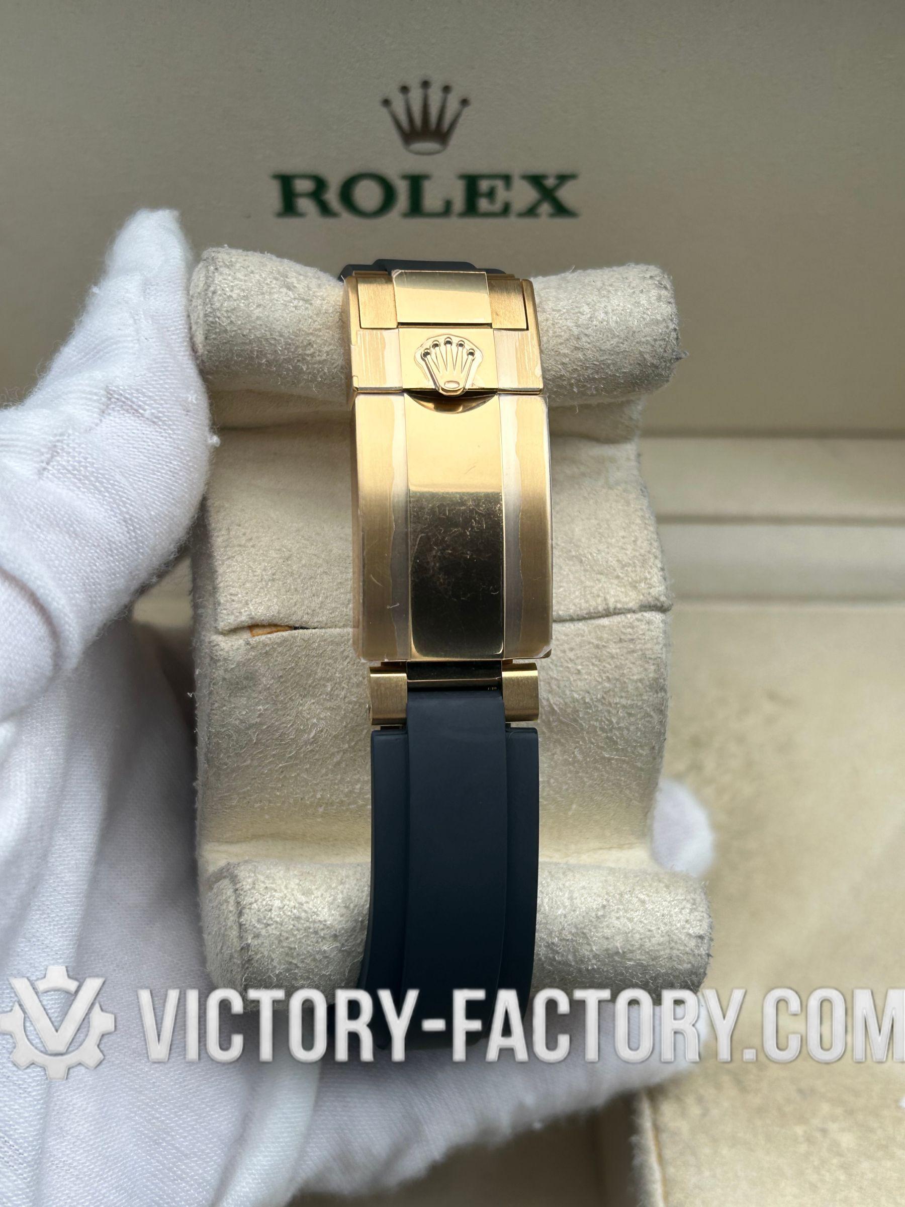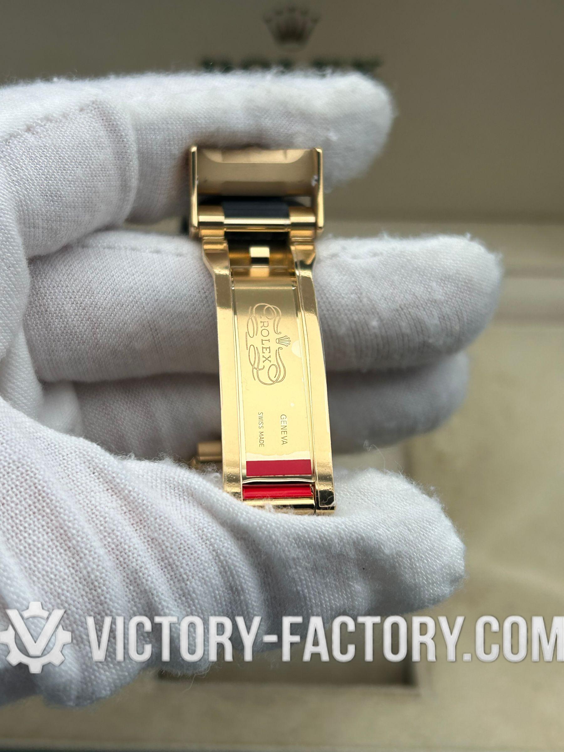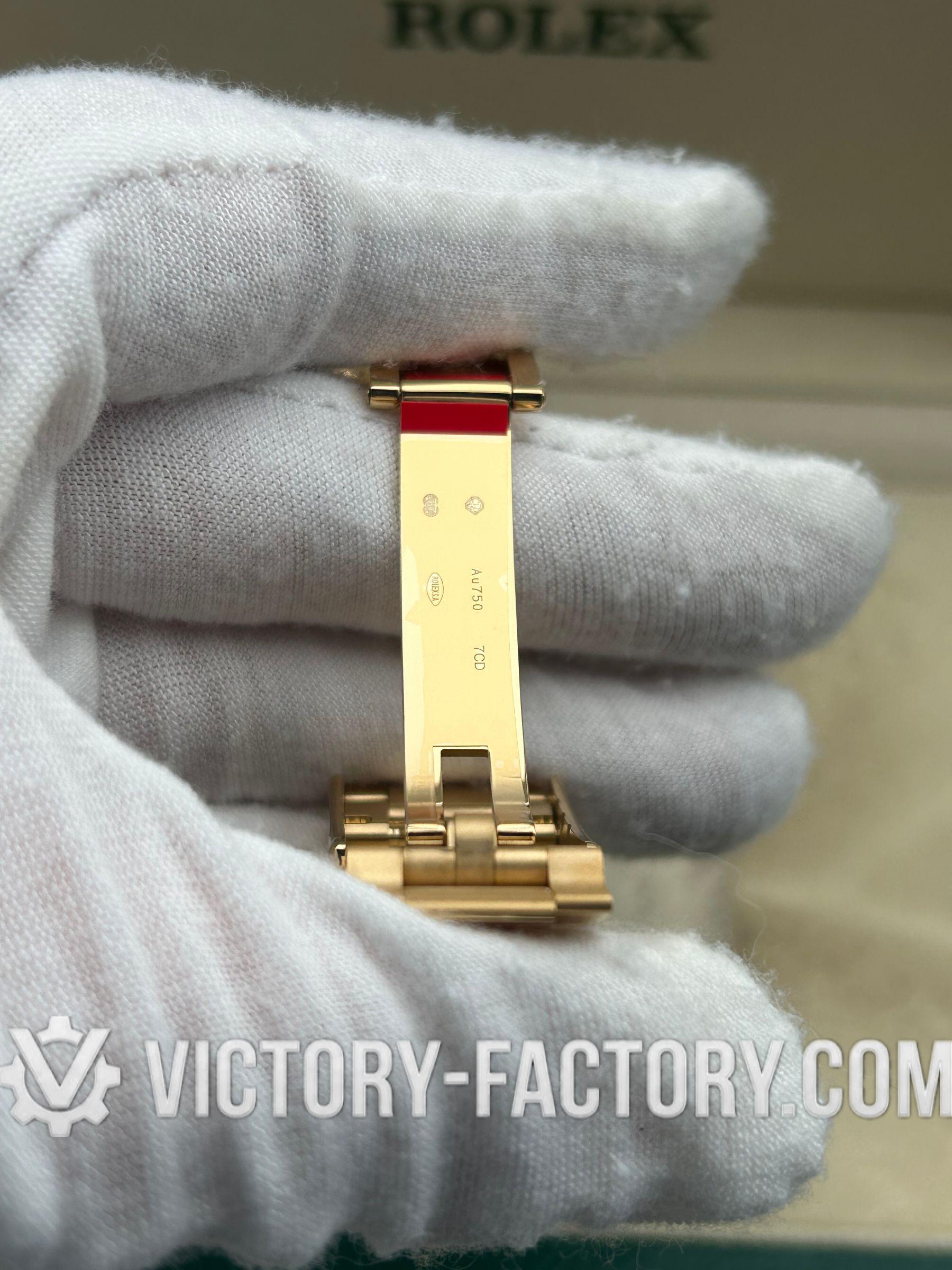 CASE: The watch features a 40mm case made from 18k Gold wrapped over solid 904L stainless steel, mirroring the original Rolex steel’s monobloc construction. The case is complemented by a screw-down case-back, push-buttons, and a winding crown, all sealed with synthetic rubber for enhanced water resistance. Notable is the ‘ROLEXROLEX’ laser engraving on the Rehaut ring and the DLC scratch-protection coating, ensuring durability. Every dimension of the replica matches the original perfectly, with all parts interchangeable with an authentic Rolex.