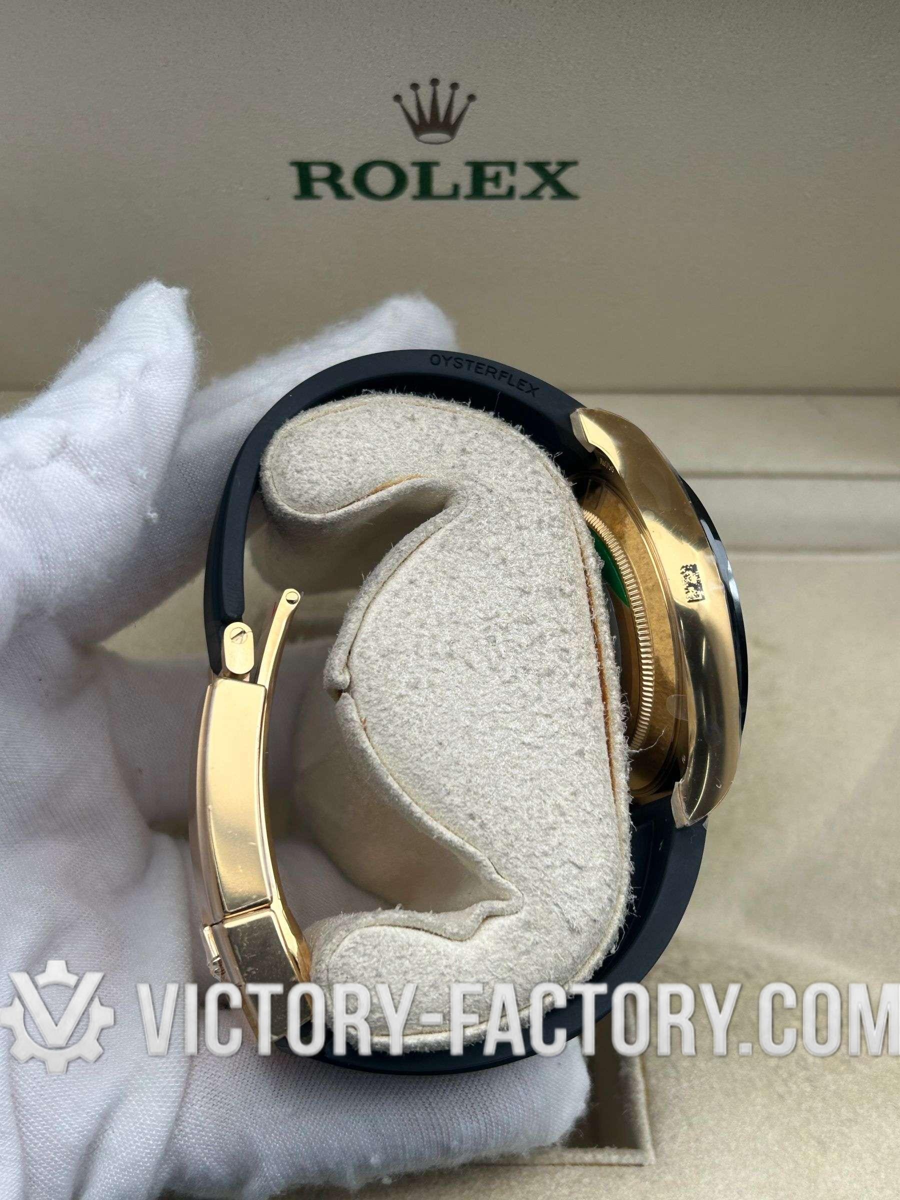 Bracelet: A high-performance Rubber Oysterflex bracelet with a metal blade core, overmoulded with black elastomer for durability and comfort. The bracelet includes a folding Oyster safety clasp on 18k gold wrapped solid 904L stainless steel, ensuring a secure fit.