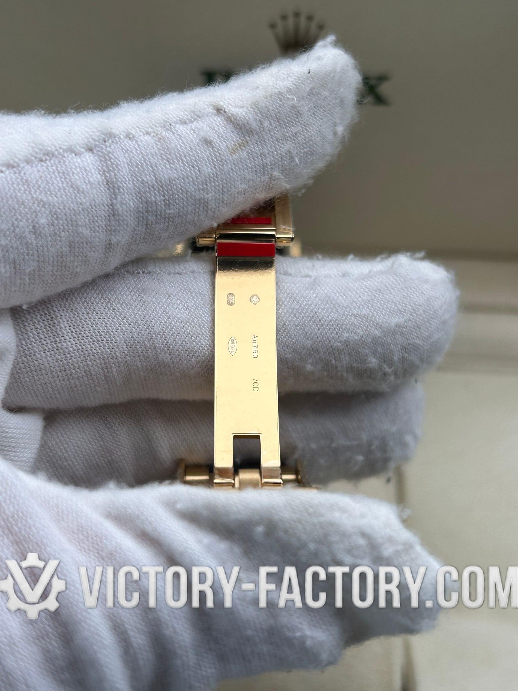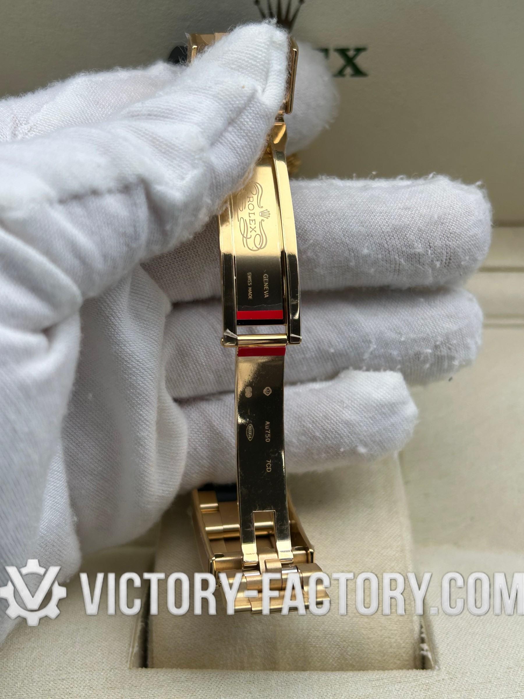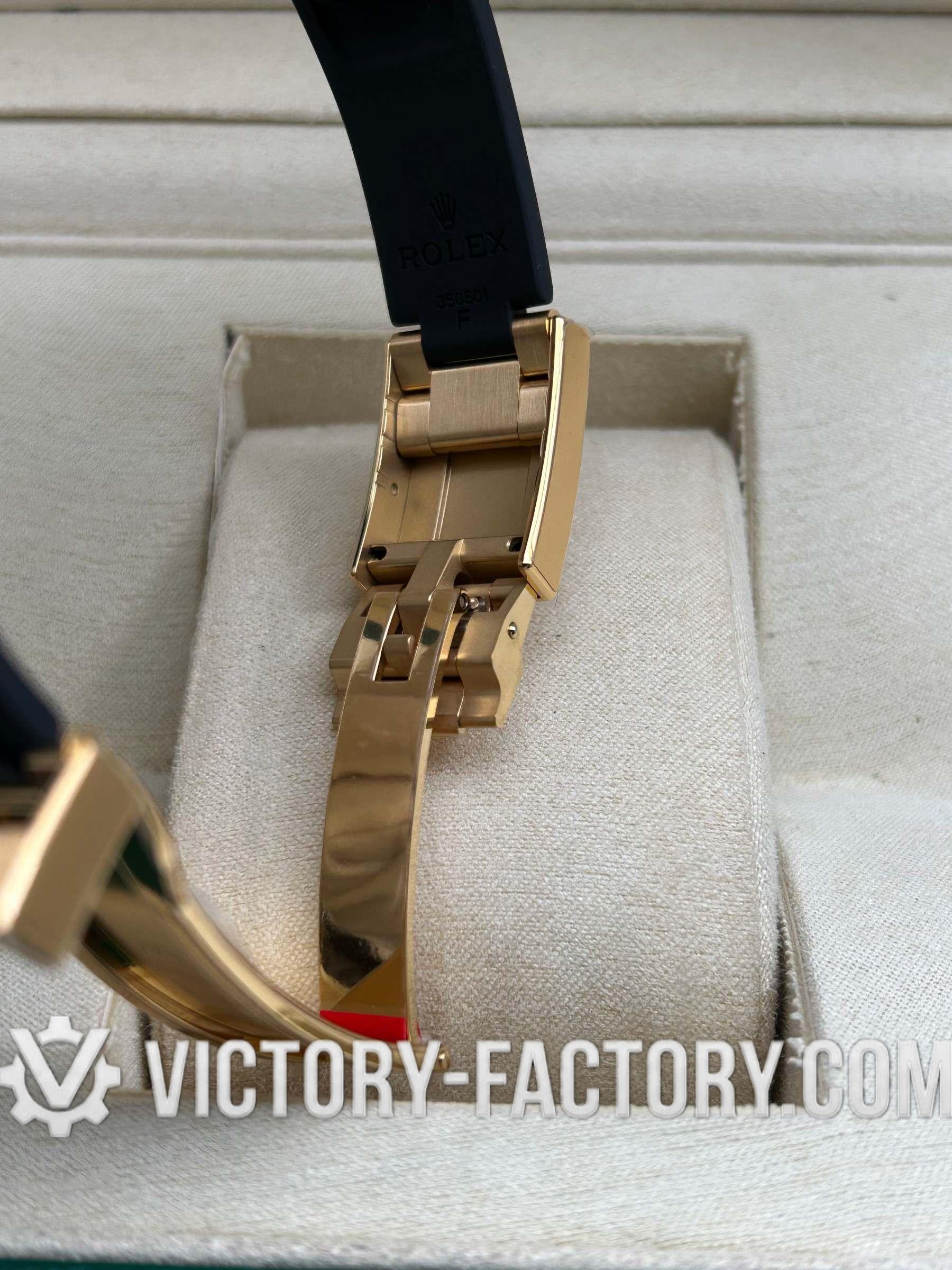 • 【CASE】: 18k Yellow Gold Wrapped 904L Steel The 40mm case is expertly crafted from 18k Yellow Gold wrapped over solid 904L stainless steel, mirroring the original Rolex steel’s monobloc construction. It features a screw-down case-back, push-buttons, and a winding crown, all sealed with synthetic rubber for enhanced water resistance. Notable details include the “ROLEXROLEX” laser engraving on the Rehaut ring and a DLC scratch-protection coating.