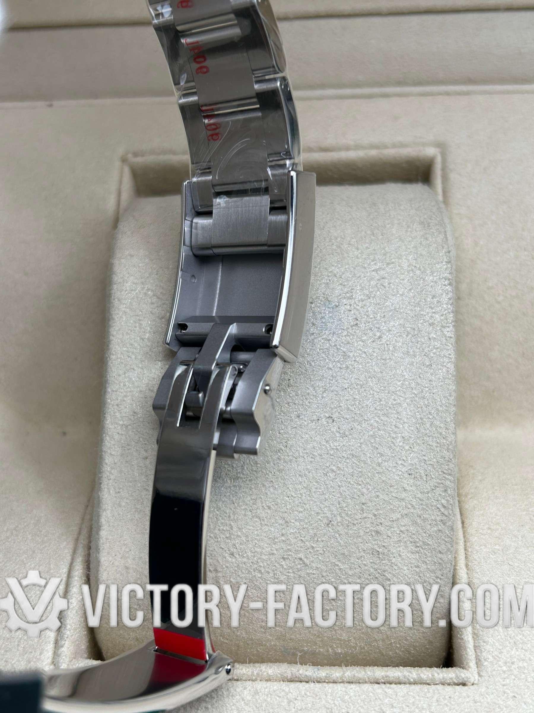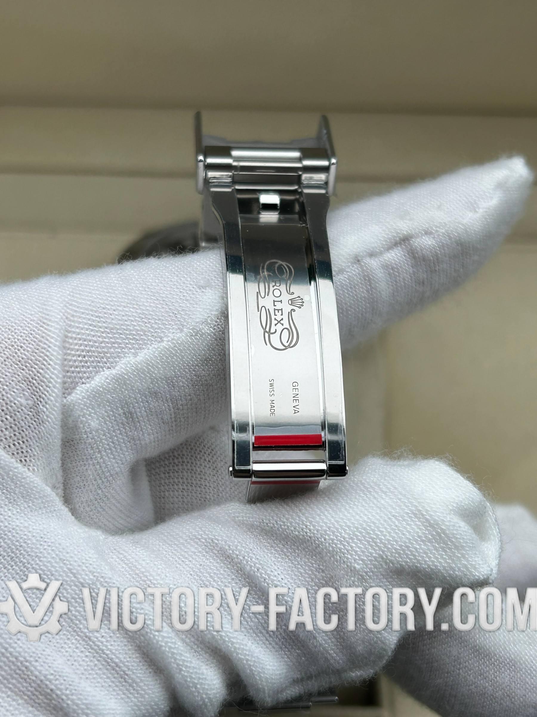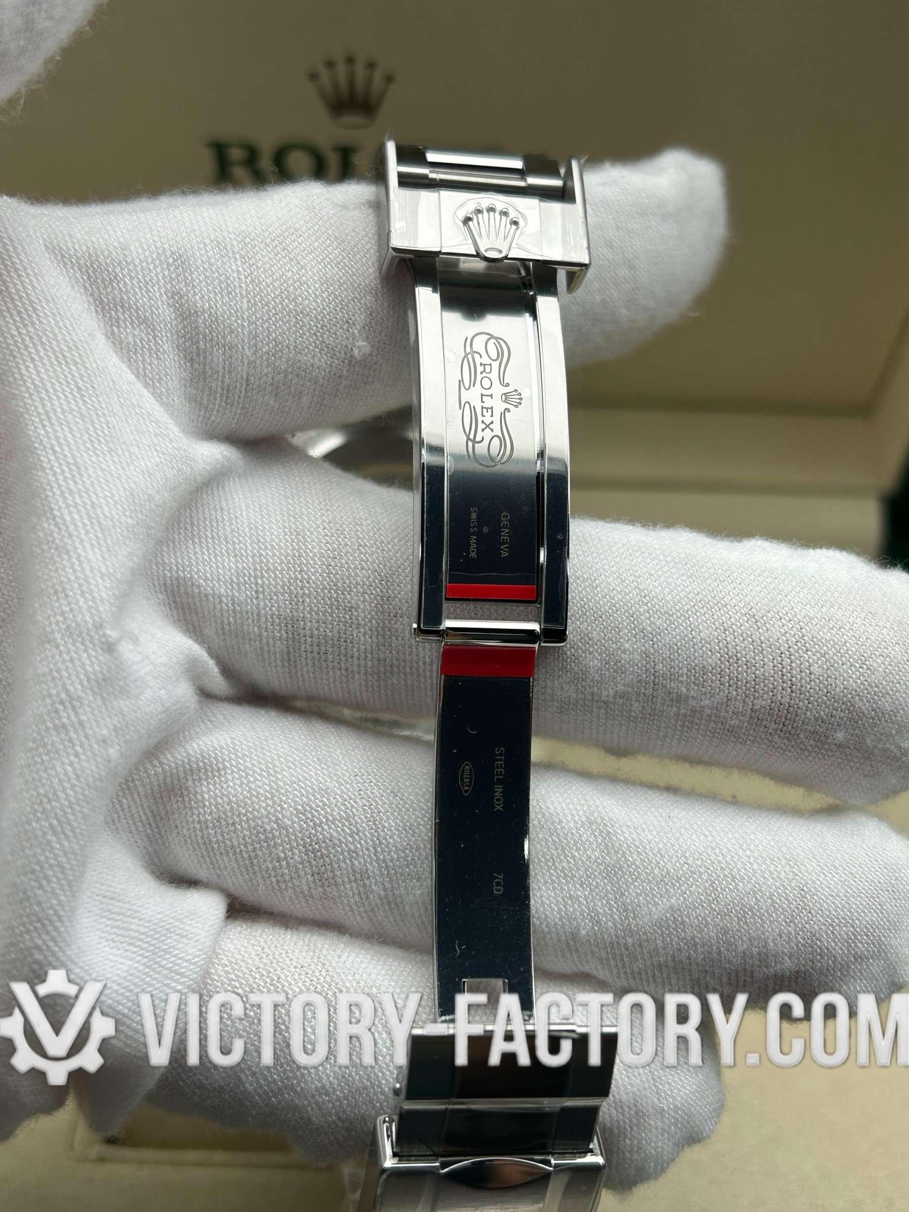 DIAL: Clean Factory’s Signature Perfection The deep black lacquer dial features “Stick” markers coated with Superluminova Blue luminescence, providing up to nine hours of low-light visibility. Victory Factory ensures that all text, prints, and the Rolex crown are laser-etched with 1:1 precision. The markers and hands are wrapped in 18k white gold to prevent oxidation and provide that unmistakable luxury glow.
