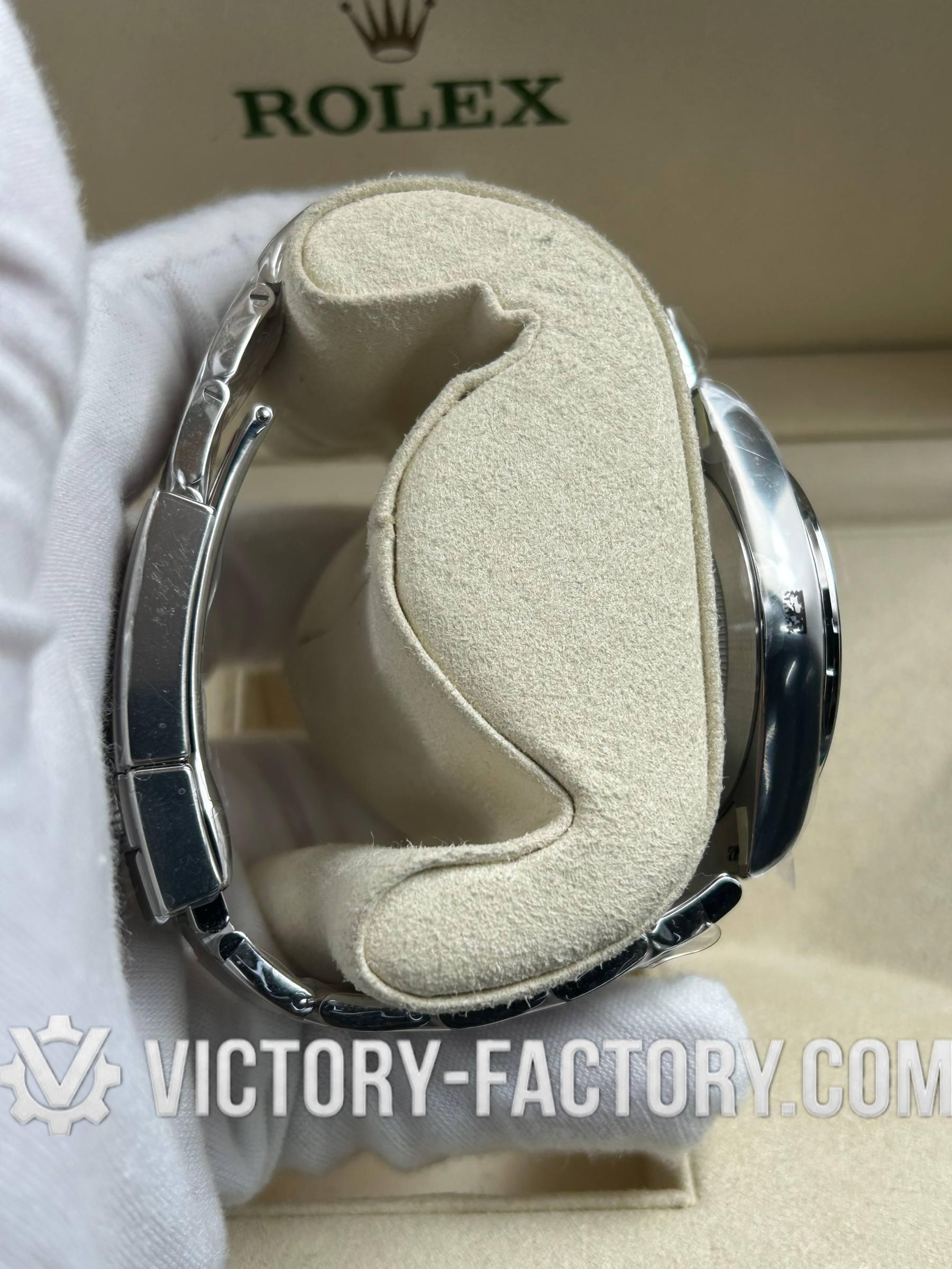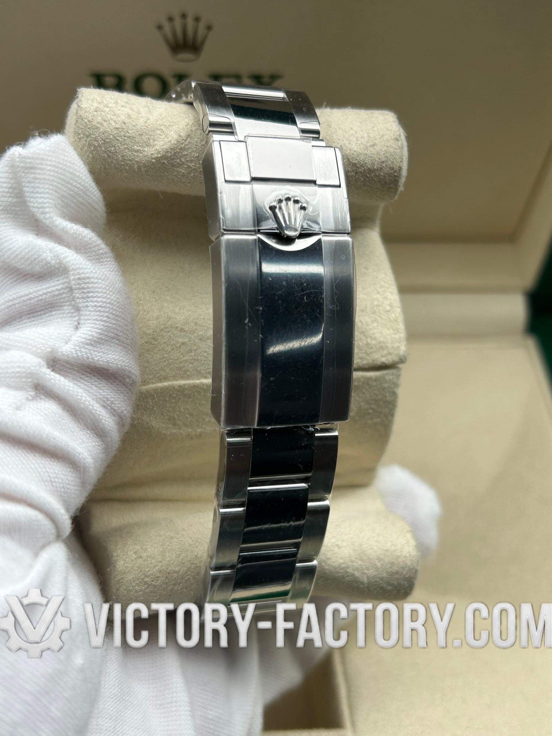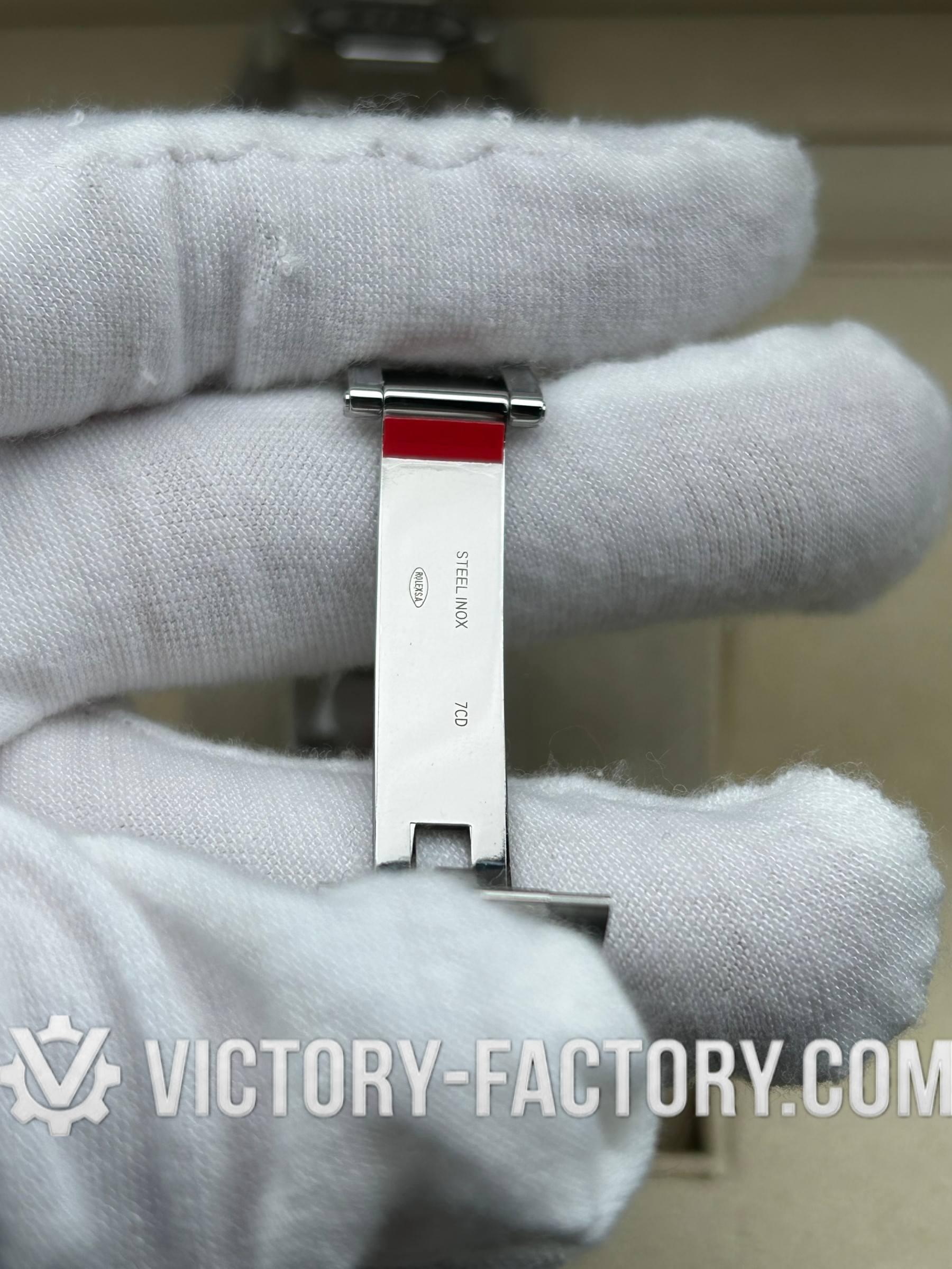 DIAL: Clean Factory’s Signature Perfection The deep black lacquer dial features “Stick” markers coated with Superluminova Blue luminescence, providing up to nine hours of low-light visibility. Victory Factory ensures that all text, prints, and the Rolex crown are laser-etched with 1:1 precision. The markers and hands are wrapped in 18k white gold to prevent oxidation and provide that unmistakable luxury glow.