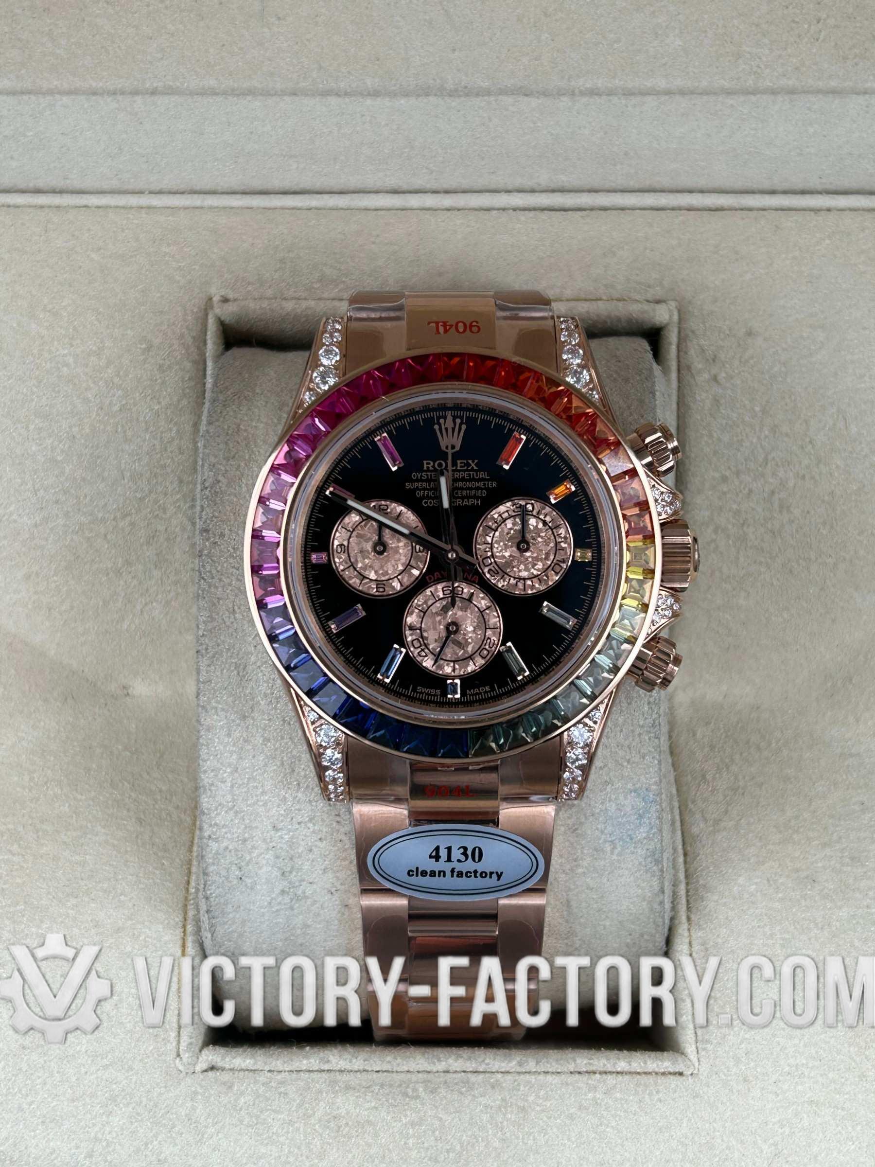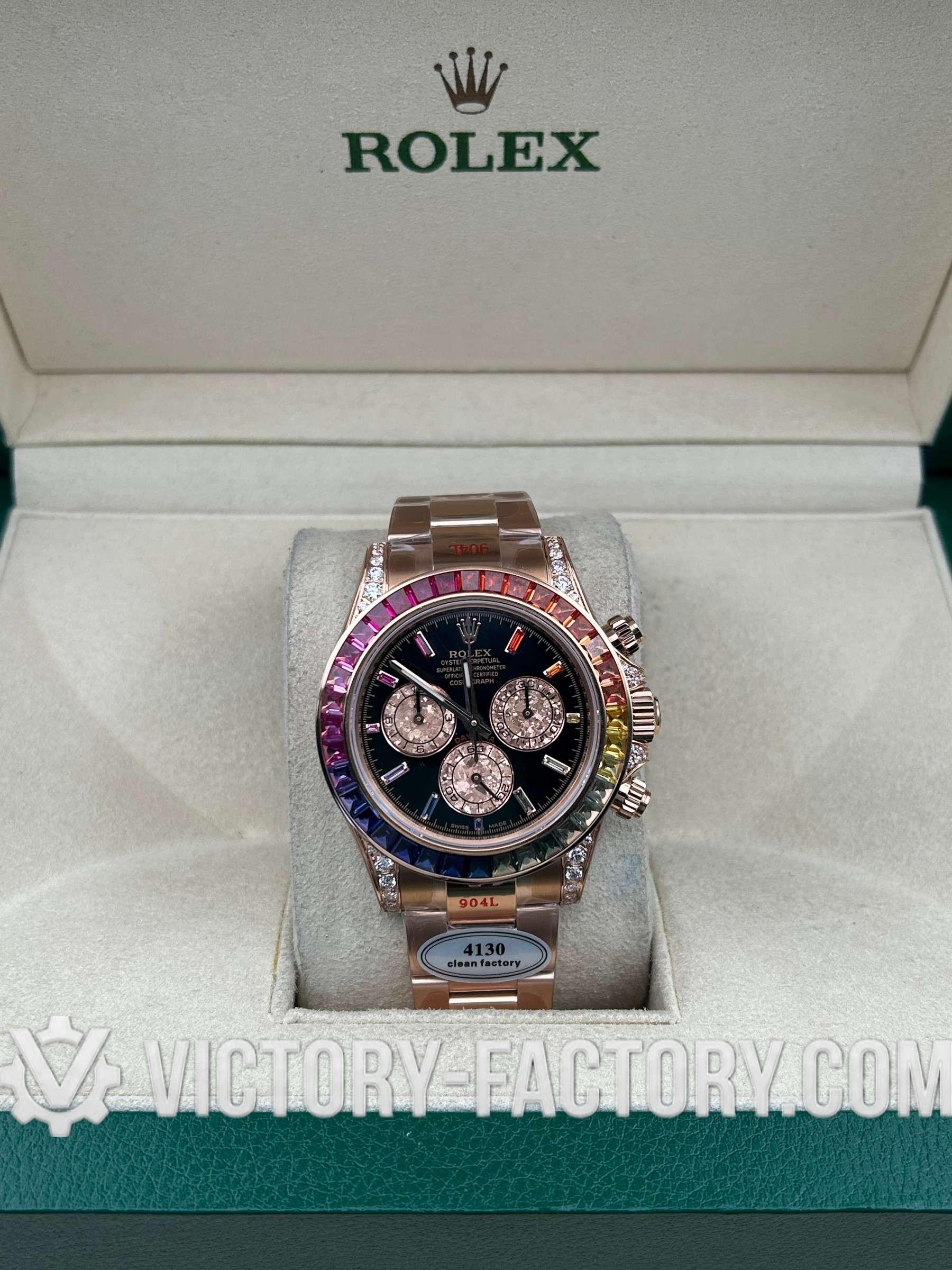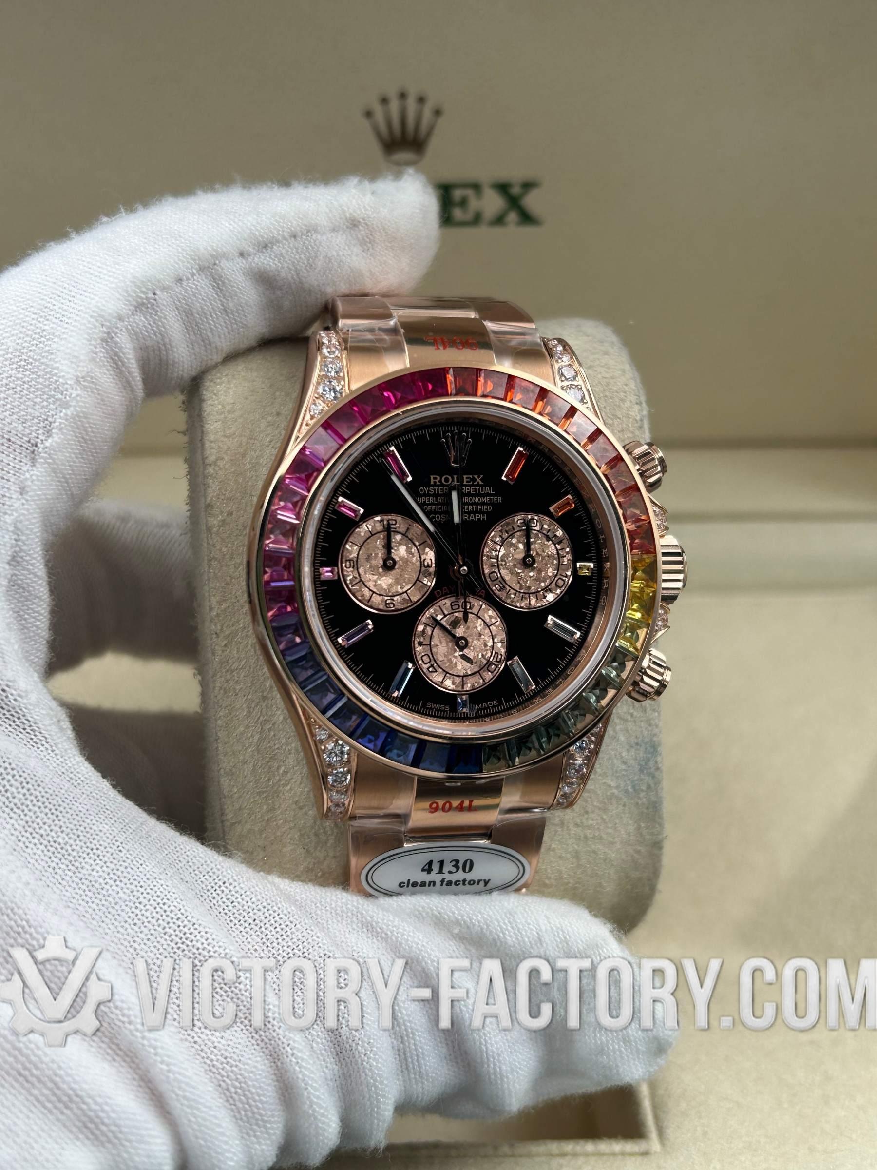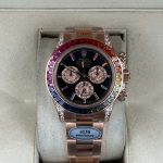 Victory Factory (VF) proudly presents the Rolex Cosmograph Daytona 116595 RBOW Rose Gold Rainbow Super Replica Watch, an epitome of luxury and precision engineering. This exceptional timepiece is a perfect 1:1 replication of the original Rolex Daytona Ref: 116595 RBOW, showcasing meticulous attention to detail and superior craftsmanship by integrating premium Clean Factory (C-Factory) exterior components with the industry-leading Dandong 4130 movement.