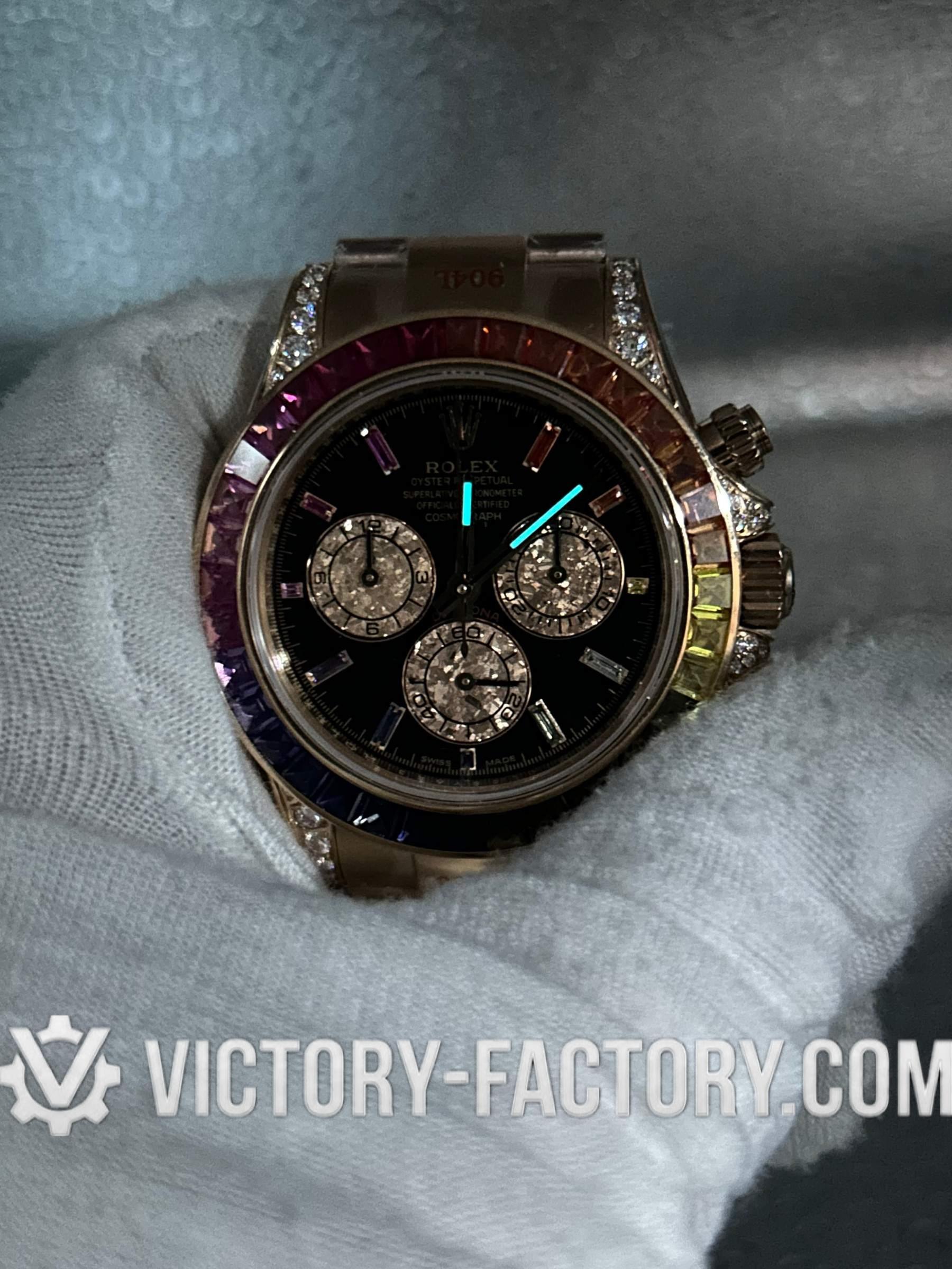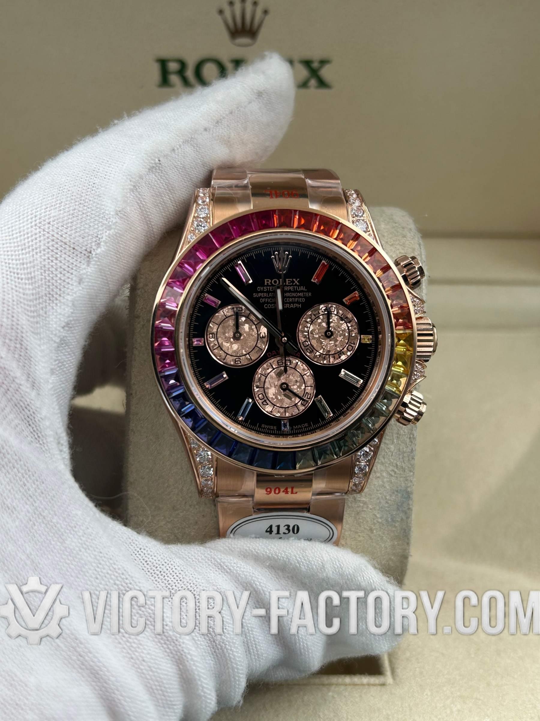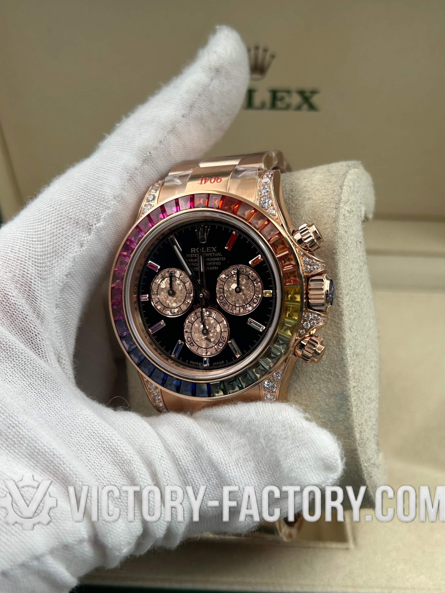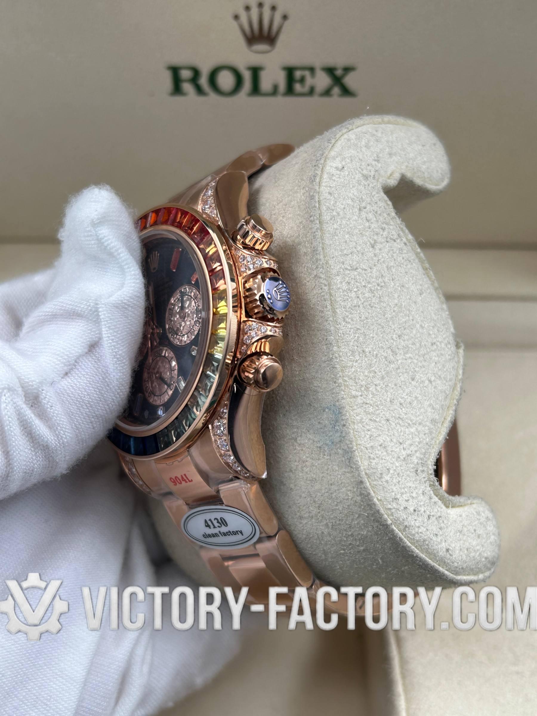 Victory Factory (VF) proudly presents the Rolex Cosmograph Daytona 116595 RBOW Rose Gold Rainbow Super Replica Watch, an epitome of luxury and precision engineering. This exceptional timepiece is a perfect 1:1 replication of the original Rolex Daytona Ref: 116595 RBOW, showcasing meticulous attention to detail and superior craftsmanship by integrating premium Clean Factory (C-Factory) exterior components with the industry-leading Dandong 4130 movement.