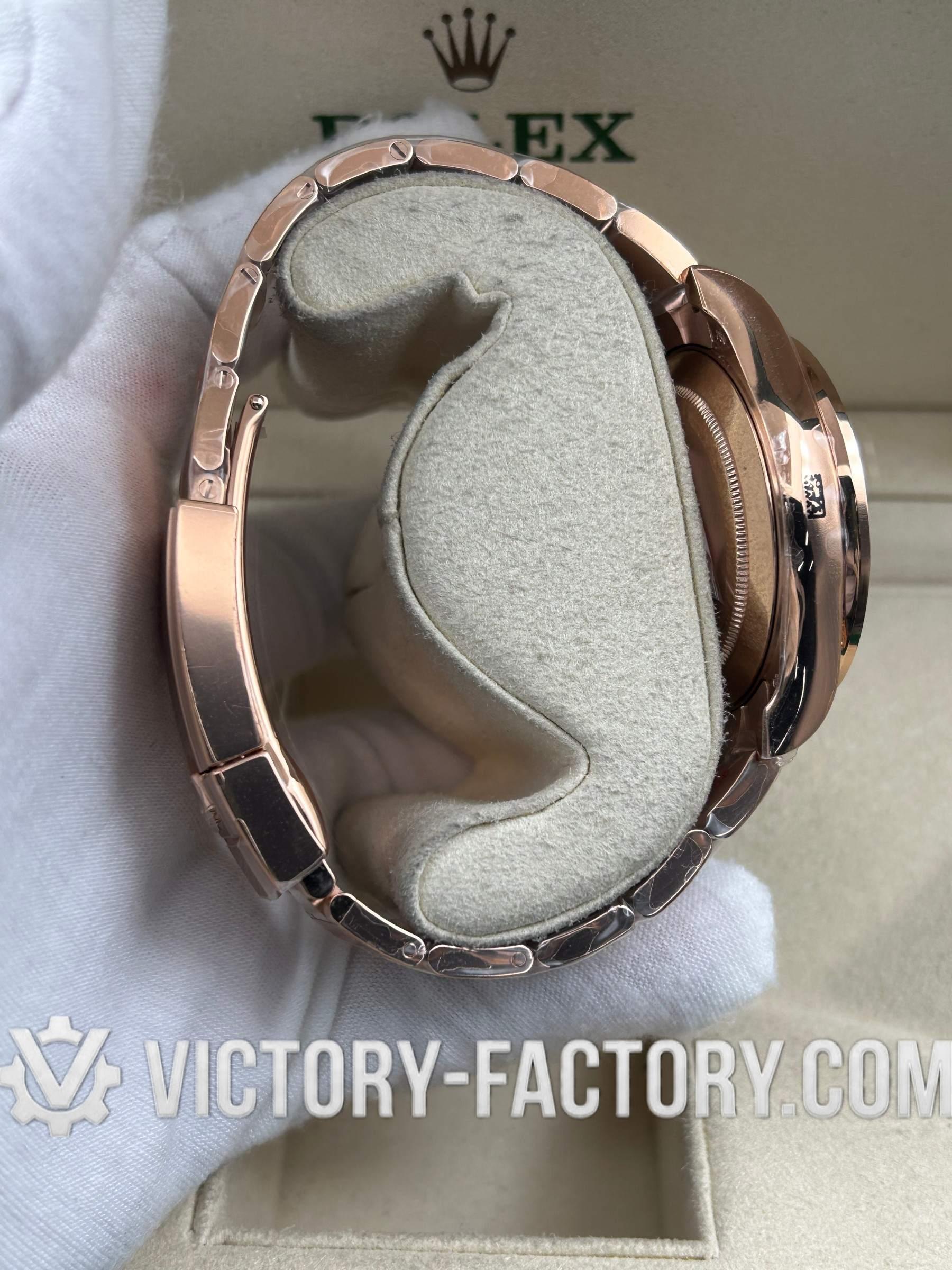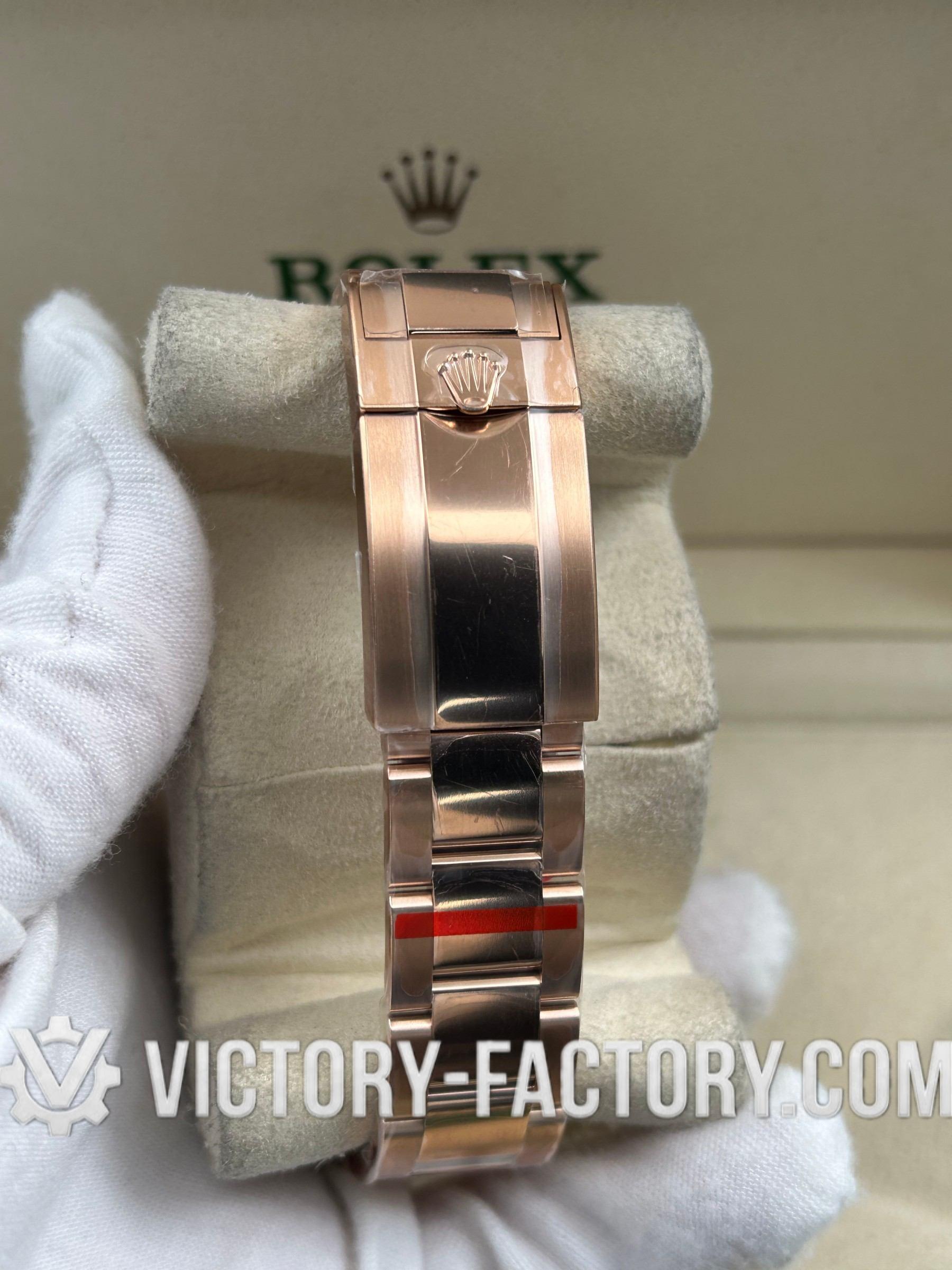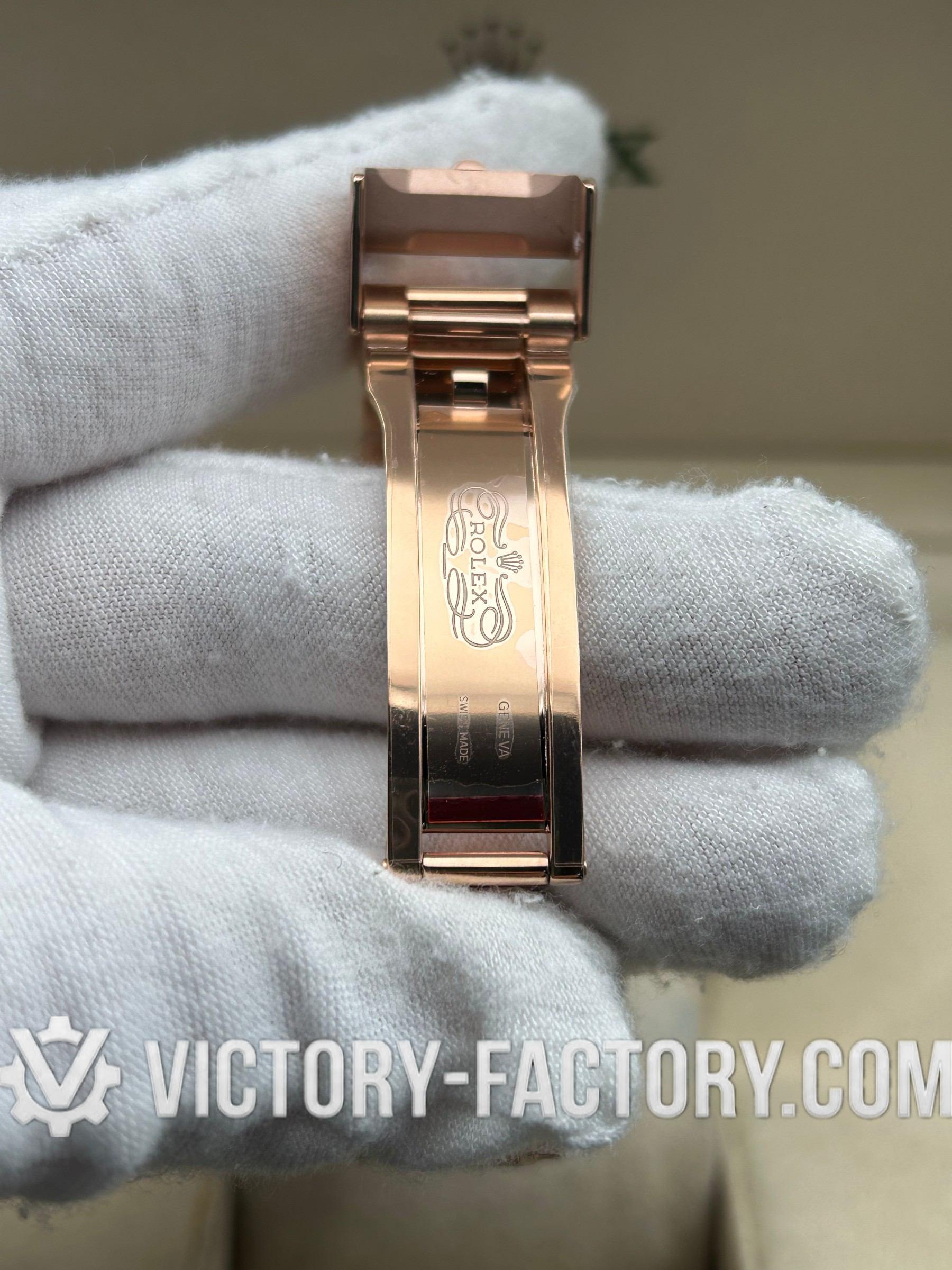 • CASE: Our Victory Factory replica boasts a solid 904L stainless steel case, real 18K Rose gold PVD plated, measuring 40mm in diameter, identical to the genuine Rolex. It features a one-piece forged case construction, enhanced with Moissanite Diamond & Sapphire, and detailed prints and engravings that are 100% same as the original. The watch includes a solid screw-down crown with Swiss rubber seal and ‘ROLEXROLEX’ engraving on the Rehaut. Every edge is smoothly hand-finished. The serial number is inscribed in the bezel, with each watch individually serialized.