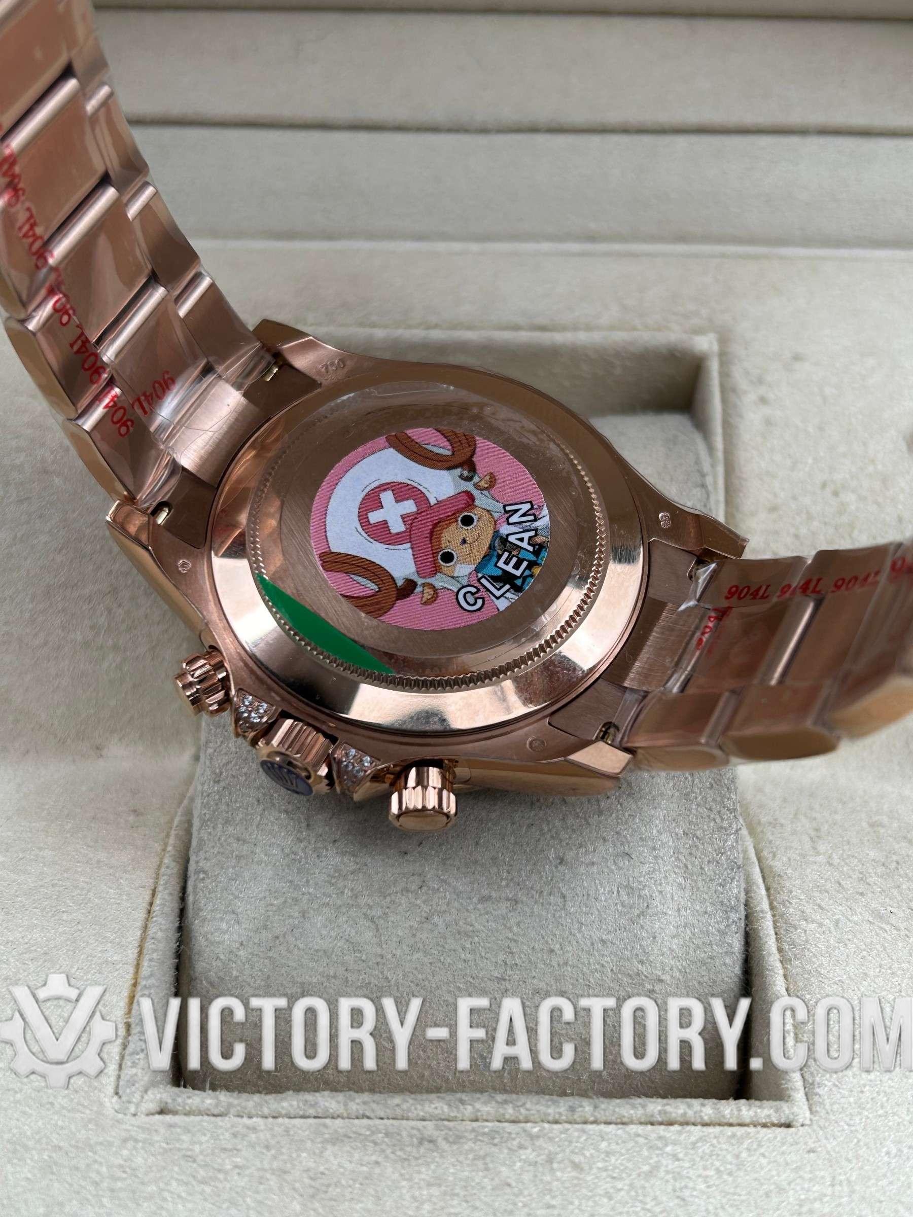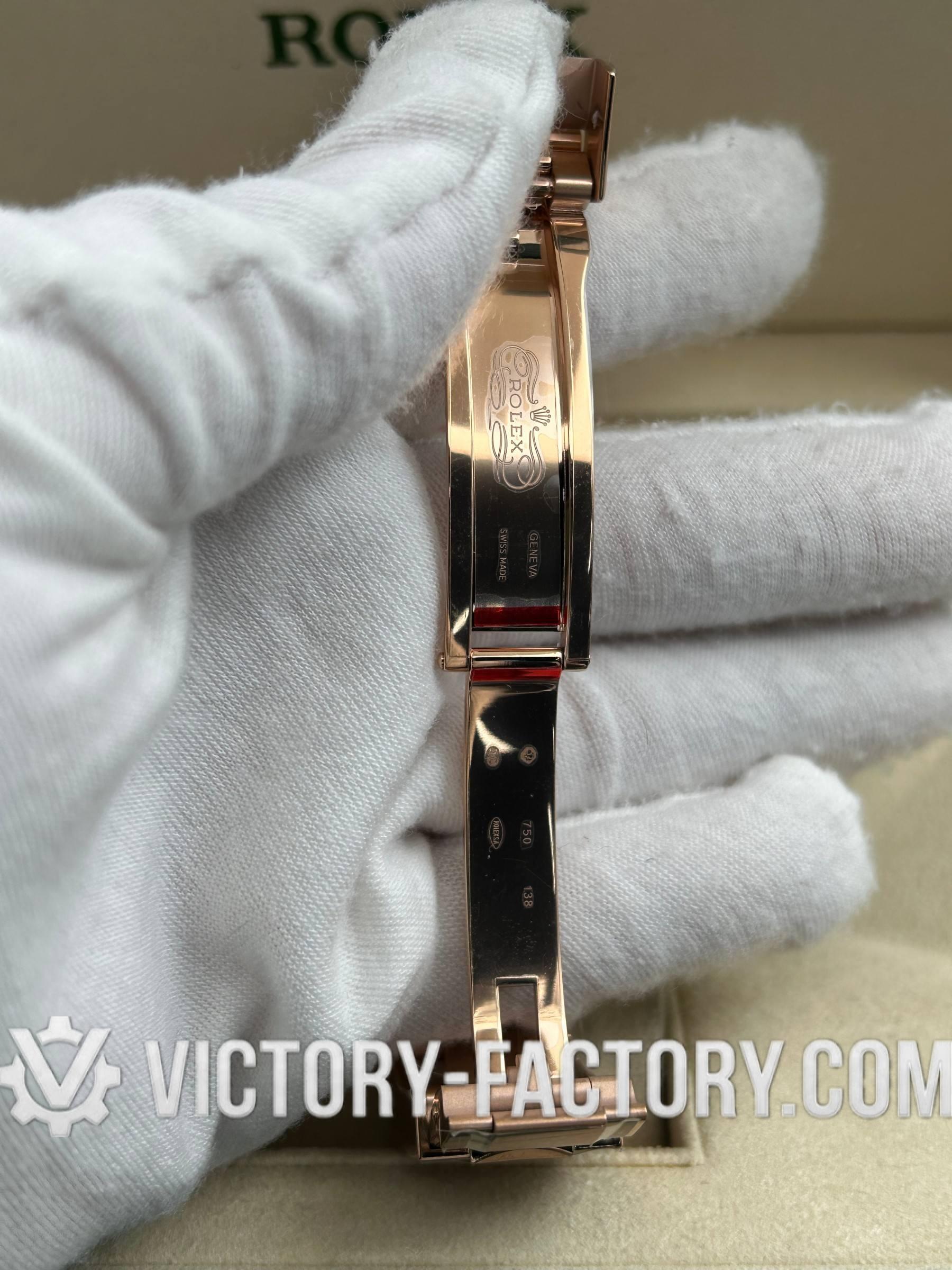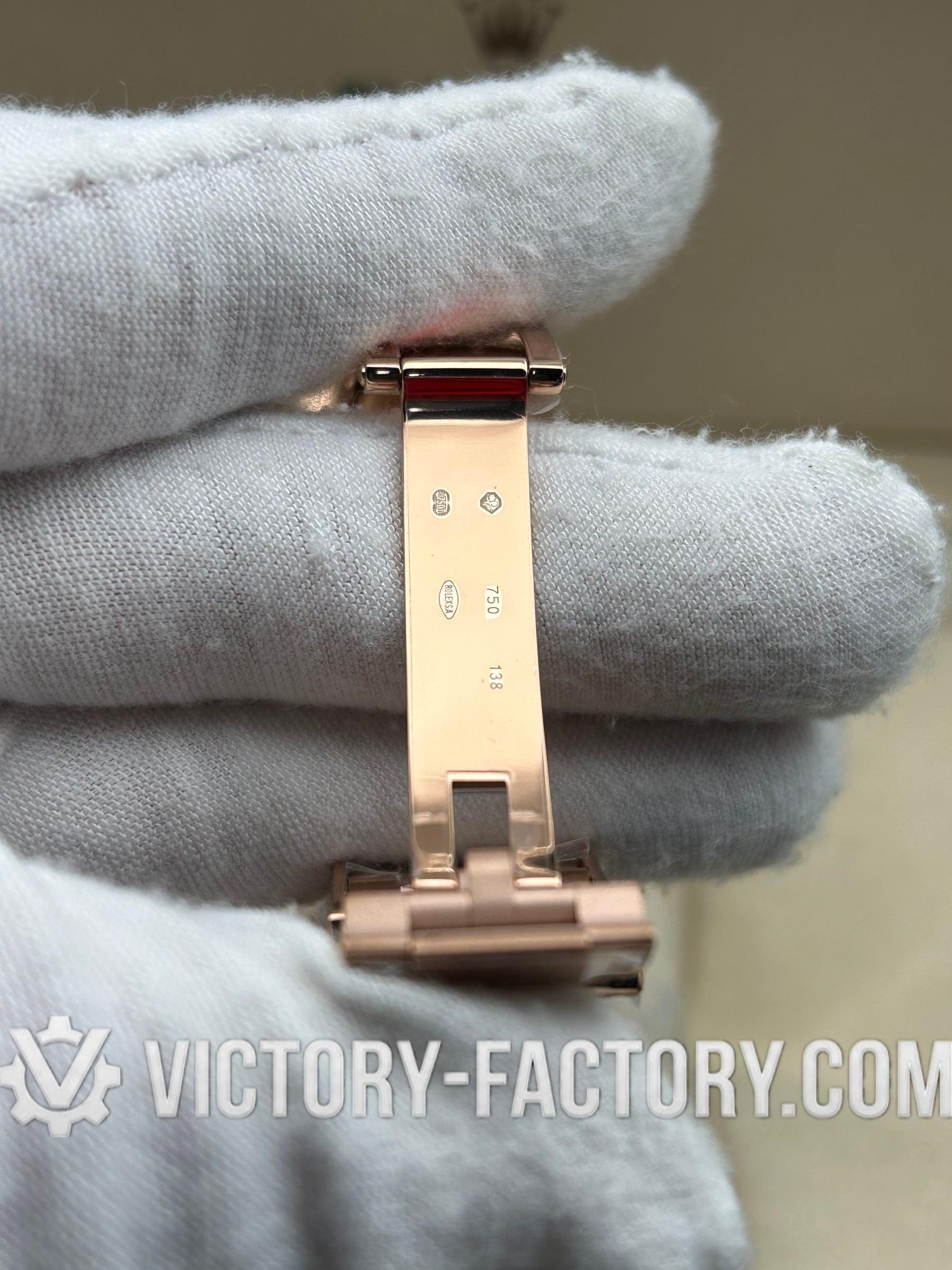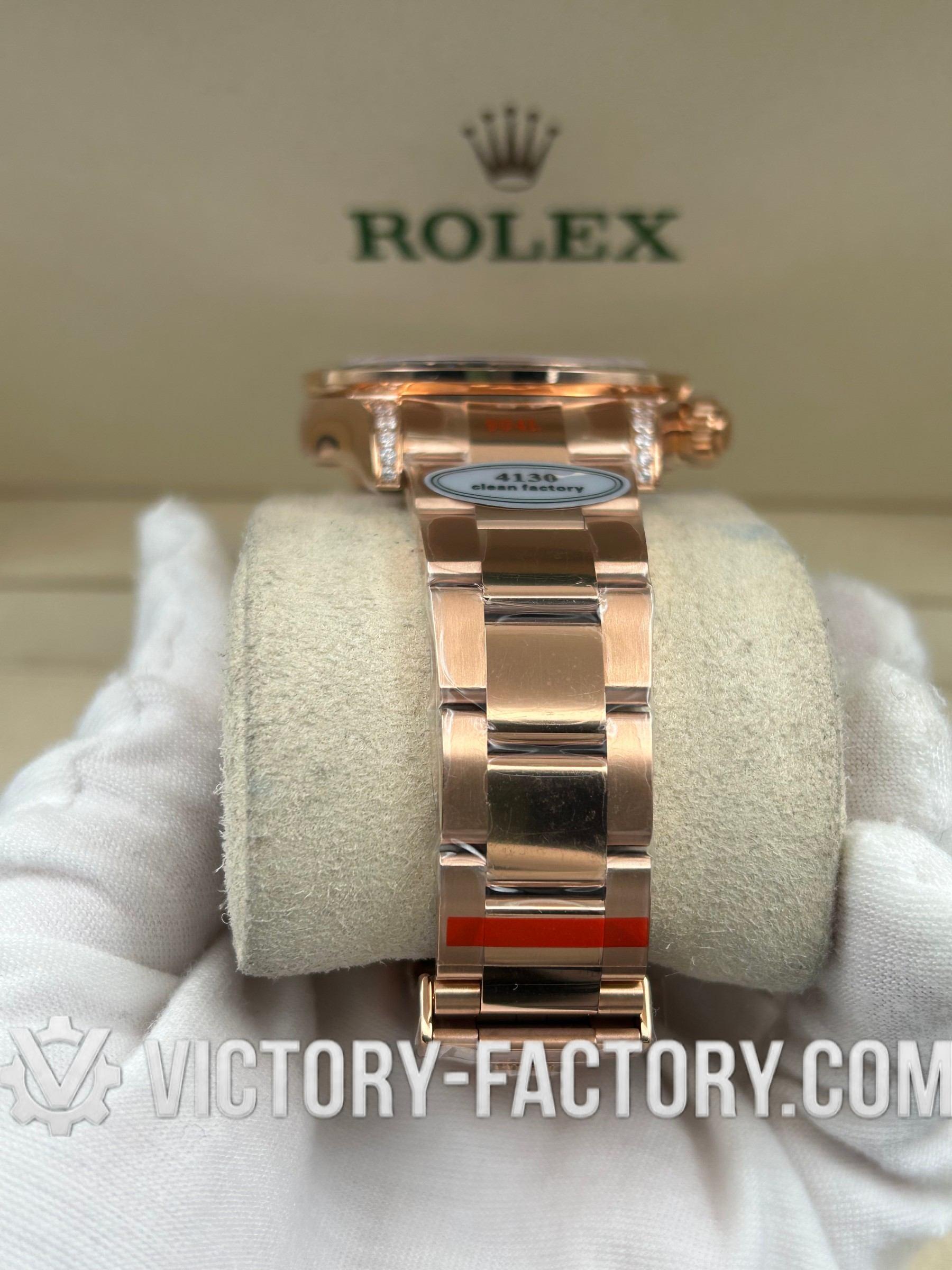 • CASE: Our Victory Factory replica boasts a solid 904L stainless steel case, real 18K Rose gold PVD plated, measuring 40mm in diameter, identical to the genuine Rolex. It features a one-piece forged case construction, enhanced with Moissanite Diamond & Sapphire, and detailed prints and engravings that are 100% same as the original. The watch includes a solid screw-down crown with Swiss rubber seal and ‘ROLEXROLEX’ engraving on the Rehaut. Every edge is smoothly hand-finished. The serial number is inscribed in the bezel, with each watch individually serialized.