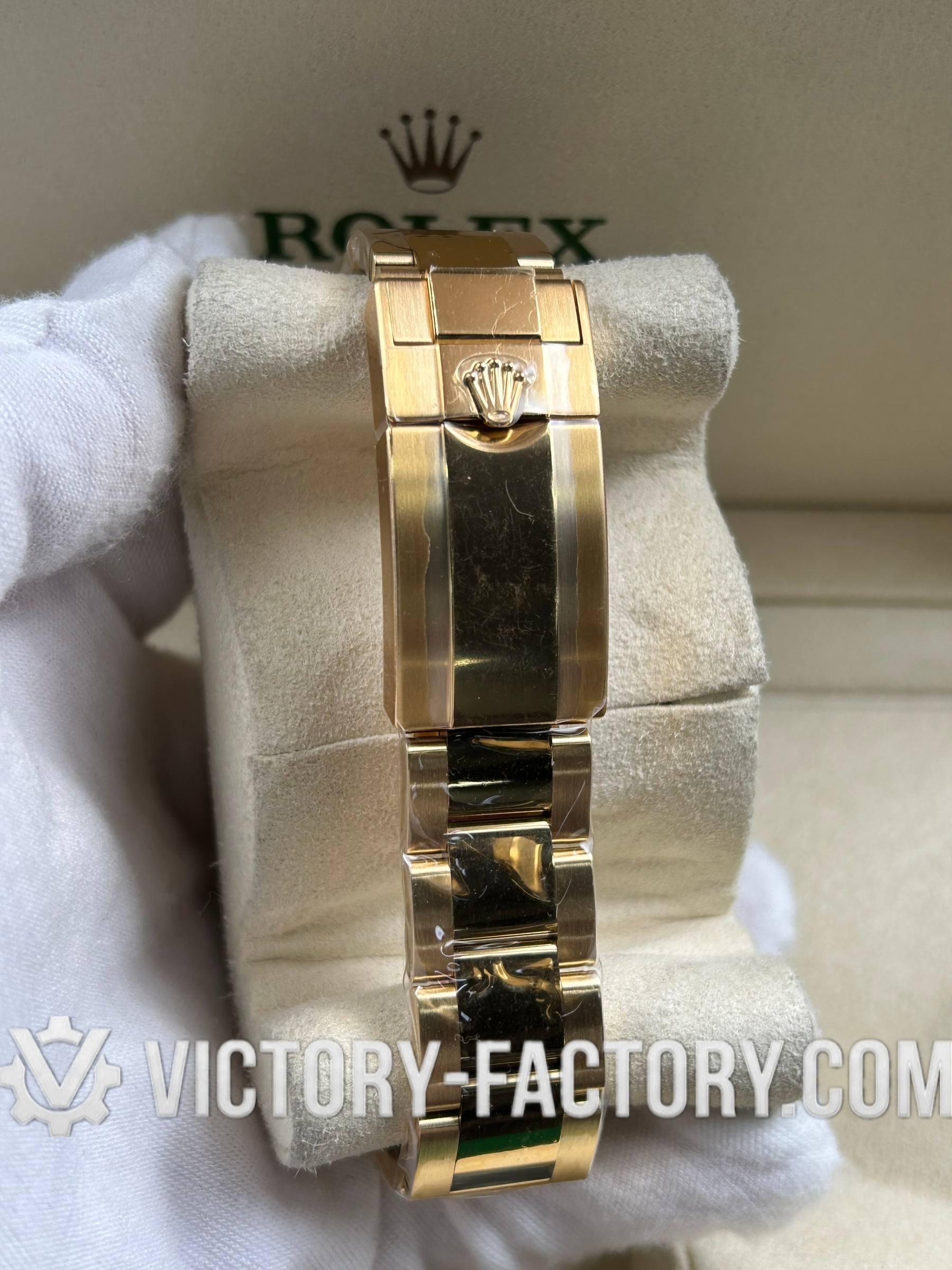 • **CASE**: The watch features a 40mm case made from 18k Yellow Gold wrapped over solid 904L stainless steel, mirroring the original Rolex steel’s monobloc construction. The case is complemented by a screw-down case-back, push-buttons, and a winding crown, all sealed with synthetic rubber for enhanced water resistance. Notable is the ‘ROLEXROLEX’ laser engraving on the Rehaut ring and the DLC scratch-protection coating, ensuring durability. Every dimension of the replica matches the original perfectly, with all parts interchangeable with an authentic Rolex.