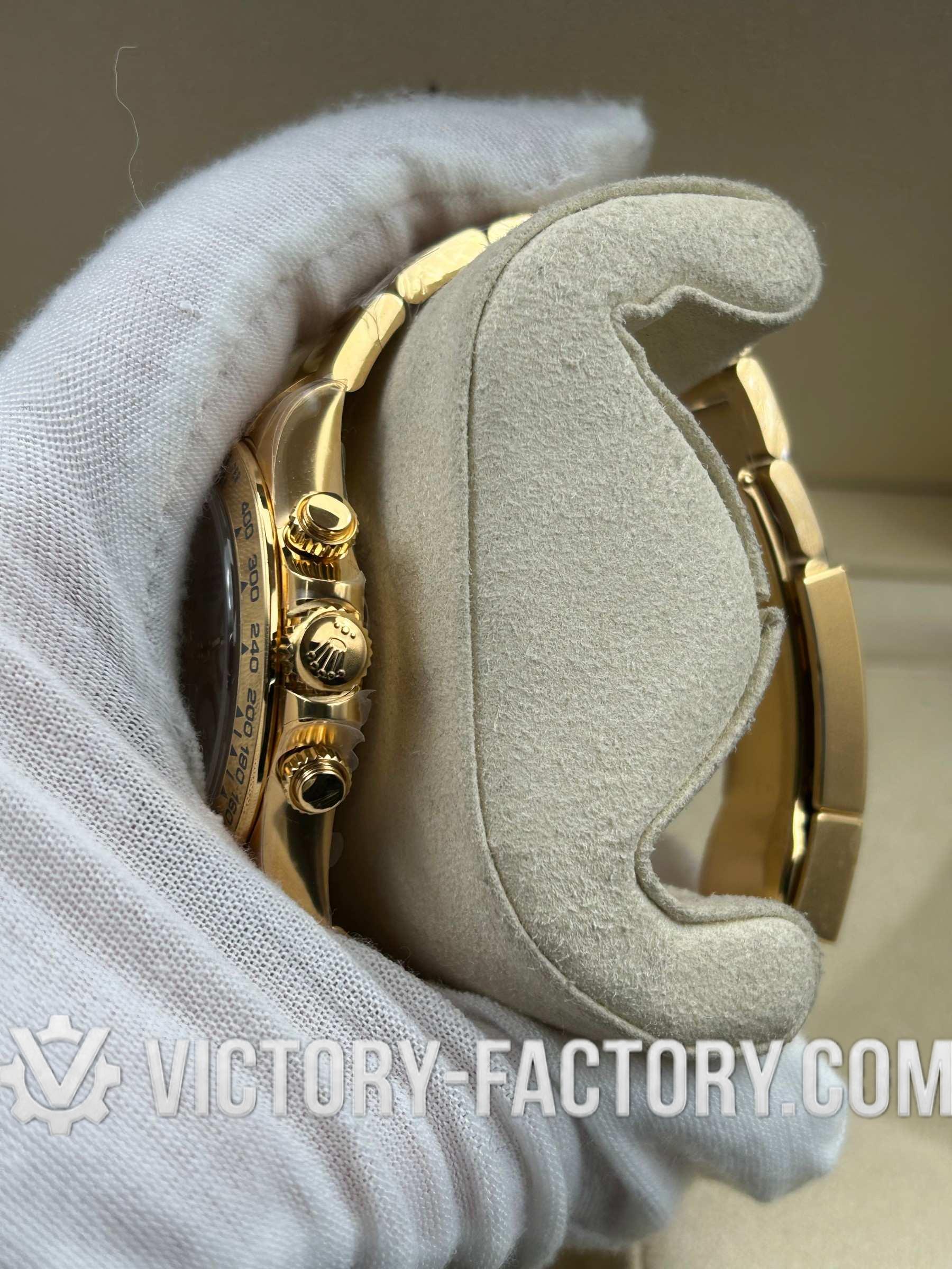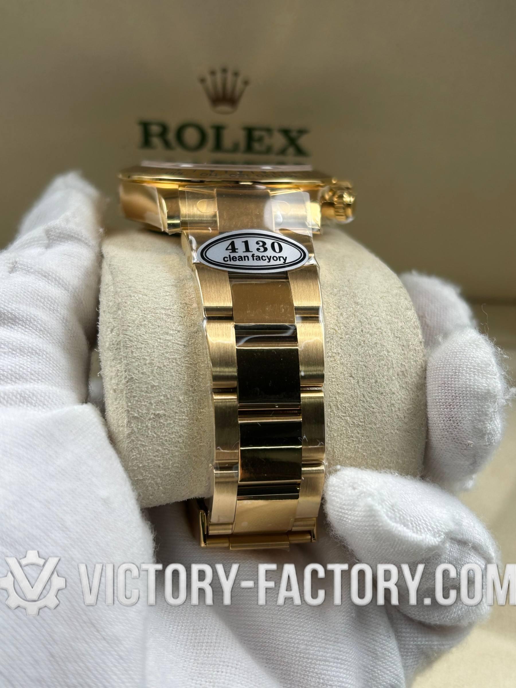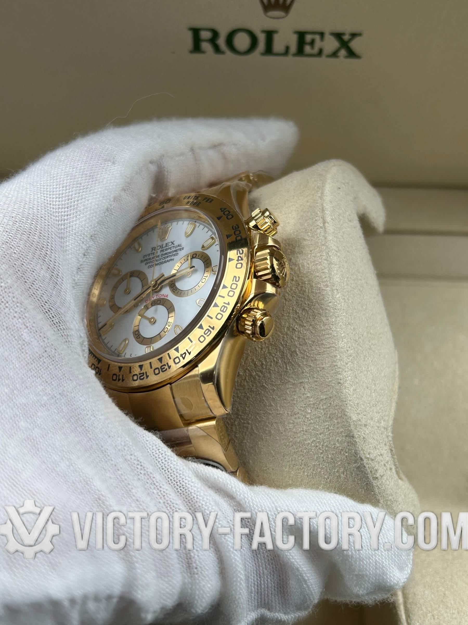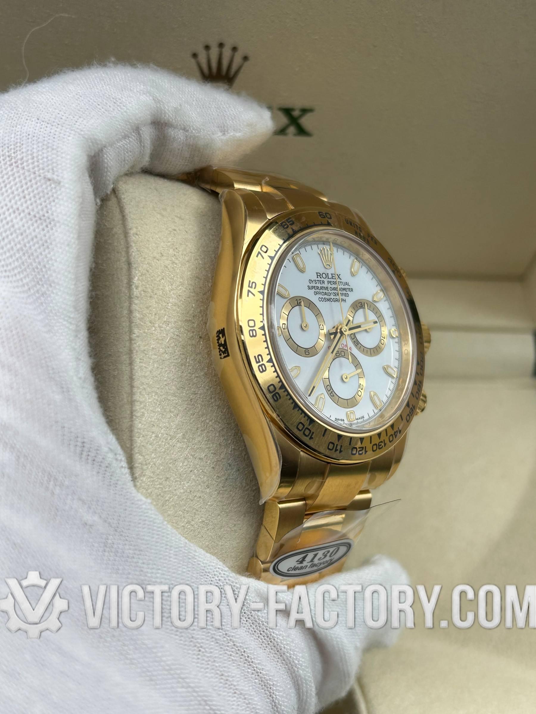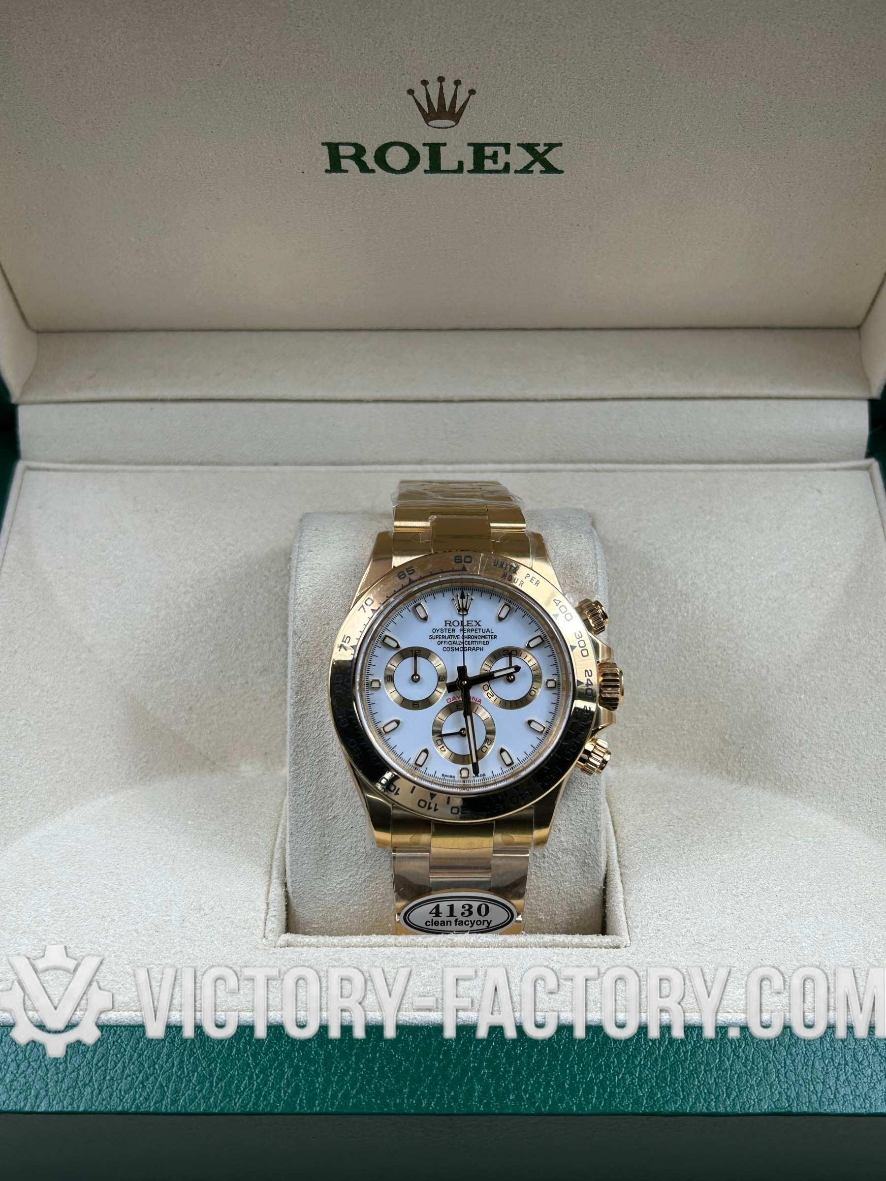 Victory Factory (VF) proudly presents the Rolex Cosmograph Daytona 18k Yellow Gold White Dial Clone Watch, a symbol of luxury and precision engineering. This timepiece is expertly crafted to match the original Rolex Cosmograph Daytona in every aspect, from design to functionality. By integrating premium Clean Factory exterior components with the industry-leading Dandong 4130 movement, Victory Factory sets a new standard for excellence.