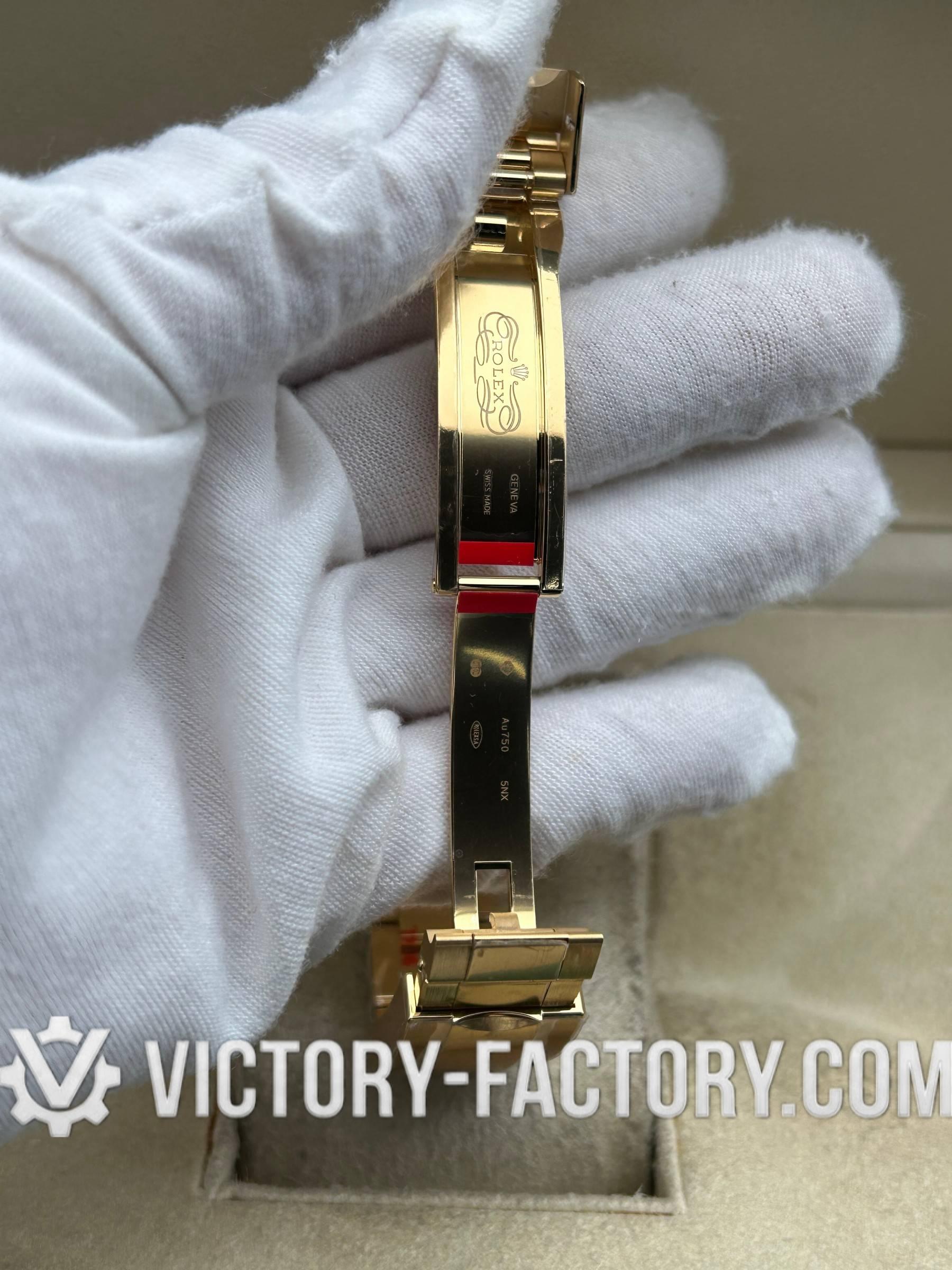 BRACELET: 904L Oyster with Easylink System The 18k yellow gold-wrapped 904L steel bracelet features the classic three-piece Oyster design. It includes a DLC scratch-protection coating, solid threaded screws, and an Oysterlock safety clasp with a 5mm Easylink comfort extension.