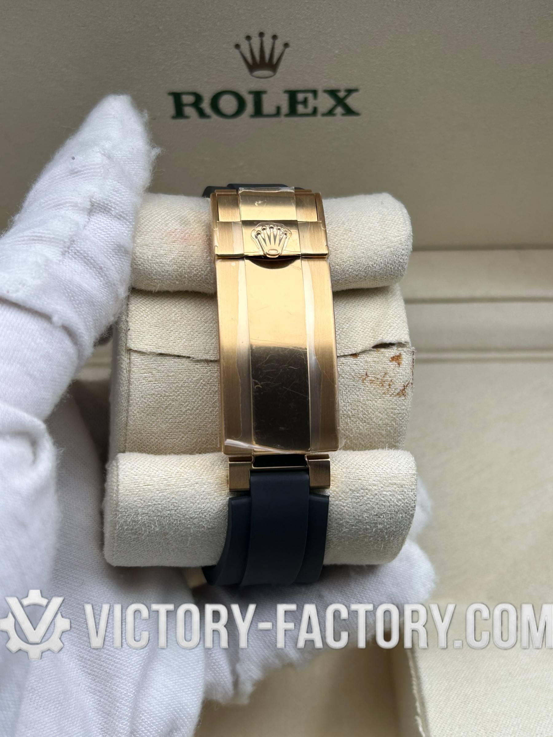 The bracelet is a high-performance Rubber Oysterflex with a metal blade core, overmoulded with black elastomer for durability and comfort.
