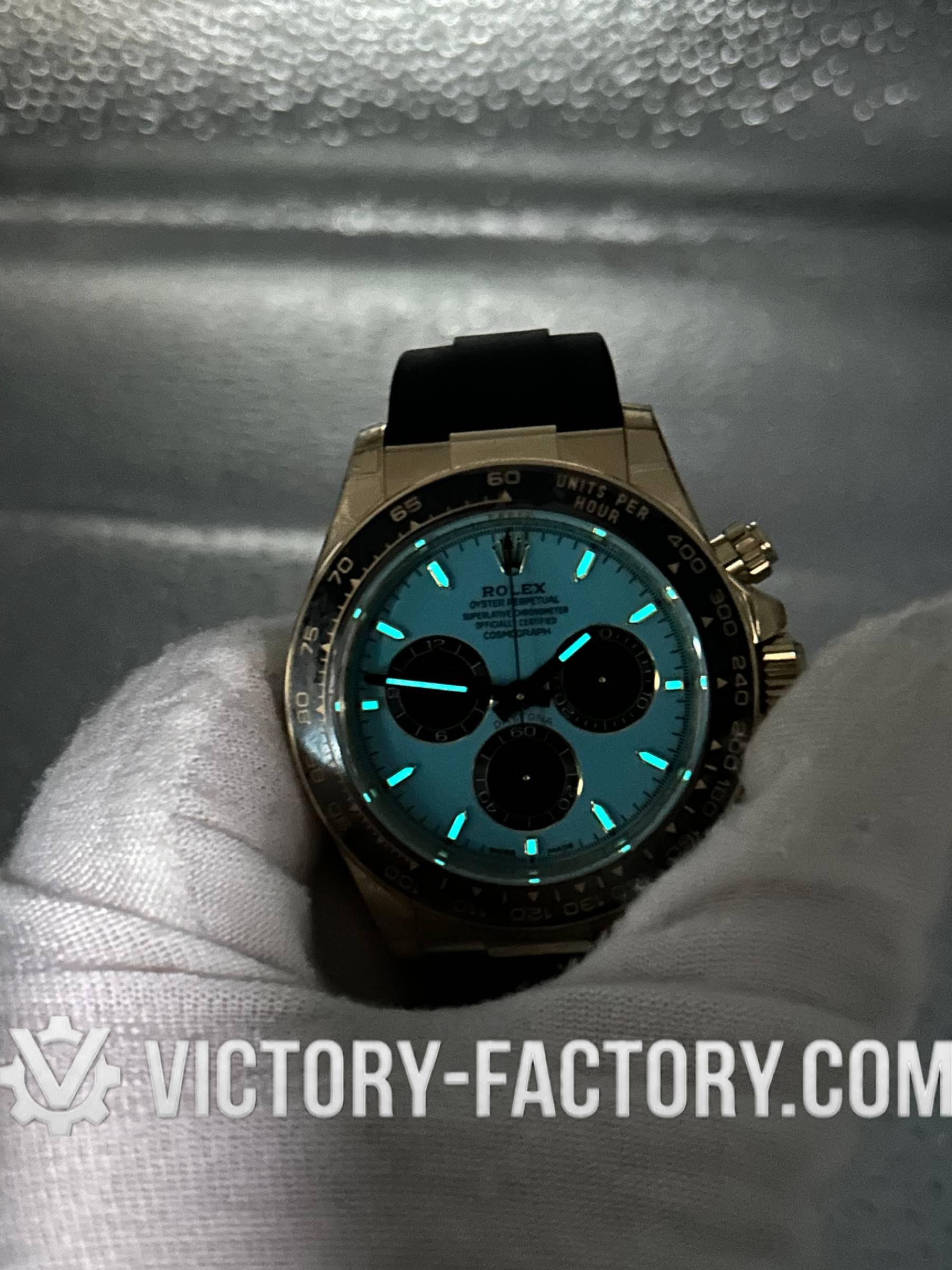 Product Overview: Victory Factory (VF) proudly unveils the 126519LN “Tiffany Blue,” a true emblem of elegance and high-end engineering. This exceptional timepiece is meticulously designed to mirror every detail of the original Rolex Cosmograph Daytona. By perfectly integrating Clean Factory’s (CF) industry-leading exterior components with the legendary Dandong 4131 Integrated Super Clone Movement, Victory Factory offers a replica that sets a new standard for both visual appeal and mechanical functionality.