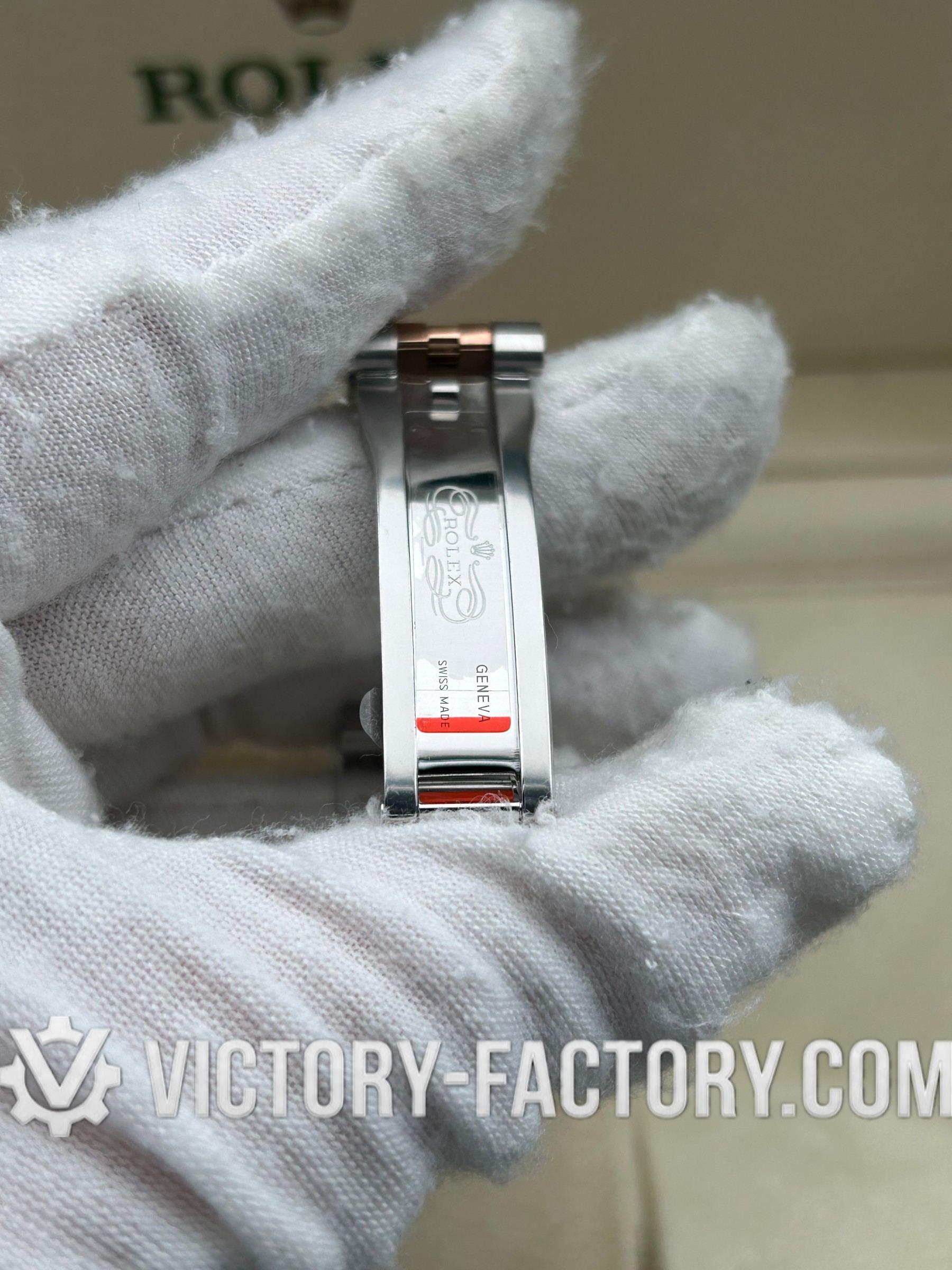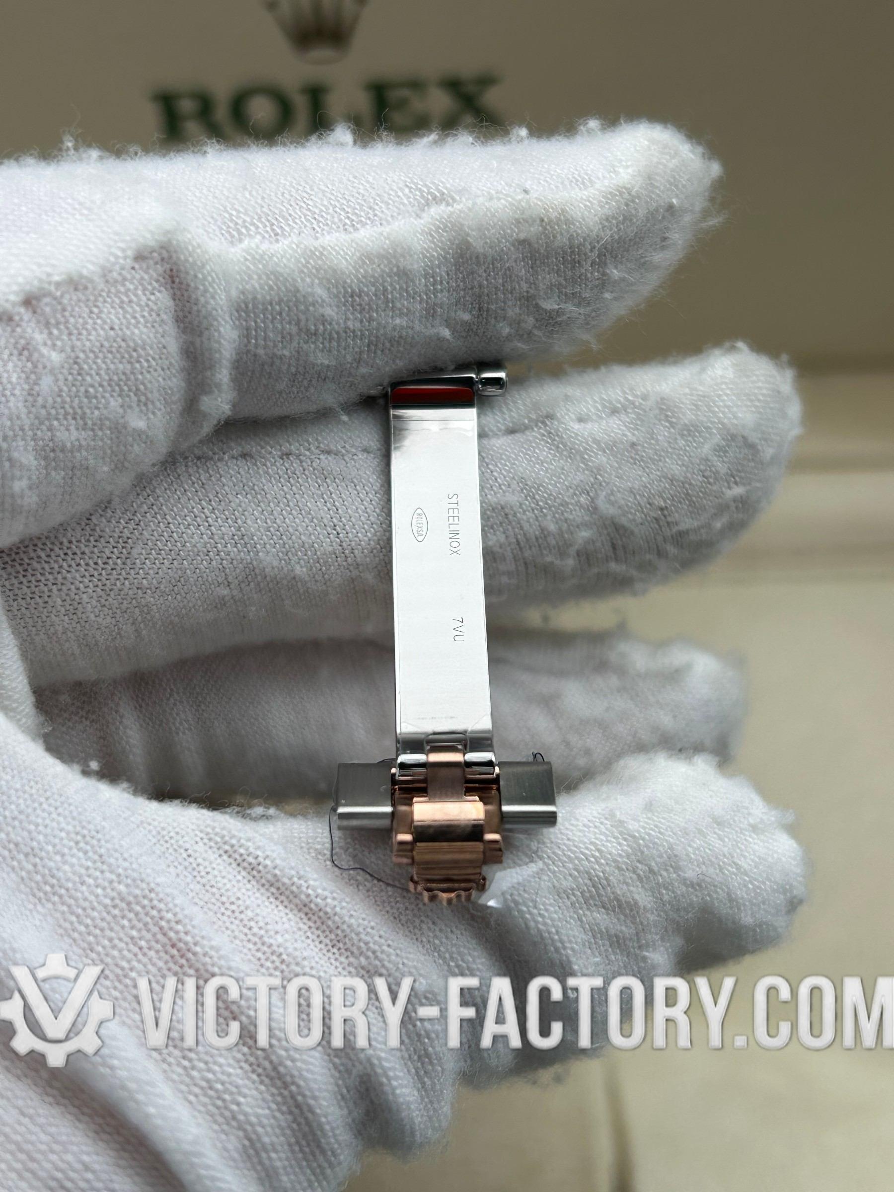 BRACELET: The classic Two-Tone Jubilee-style bracelet features 18k Rose Gold wrapped center links and solid 904L Stainless Steel outer links. It includes an enhanced DLC scratch-protection coating, solid threaded screws, and a folding Oysterlock safety clasp with an Easylink 5mm comfort extension link.