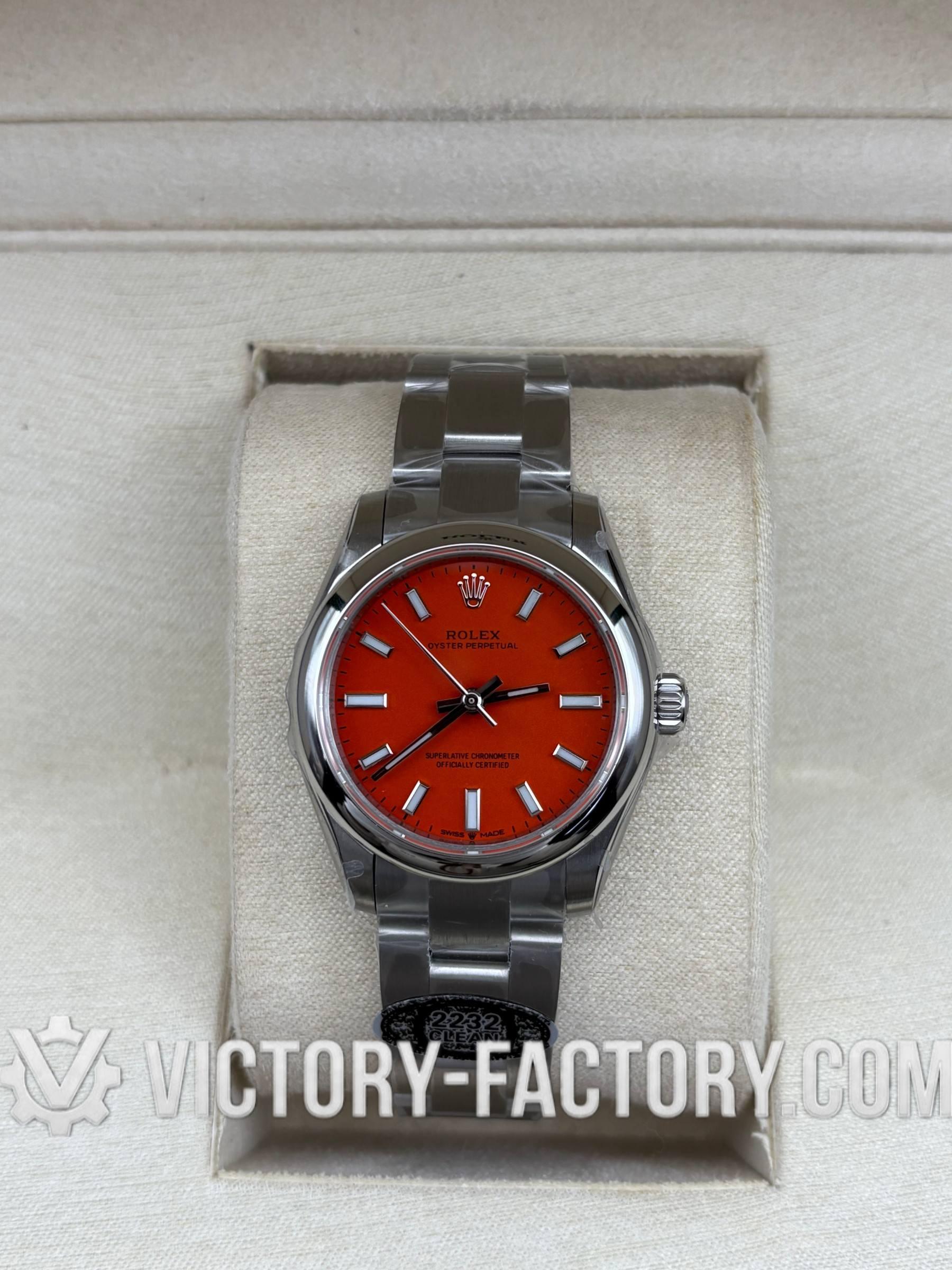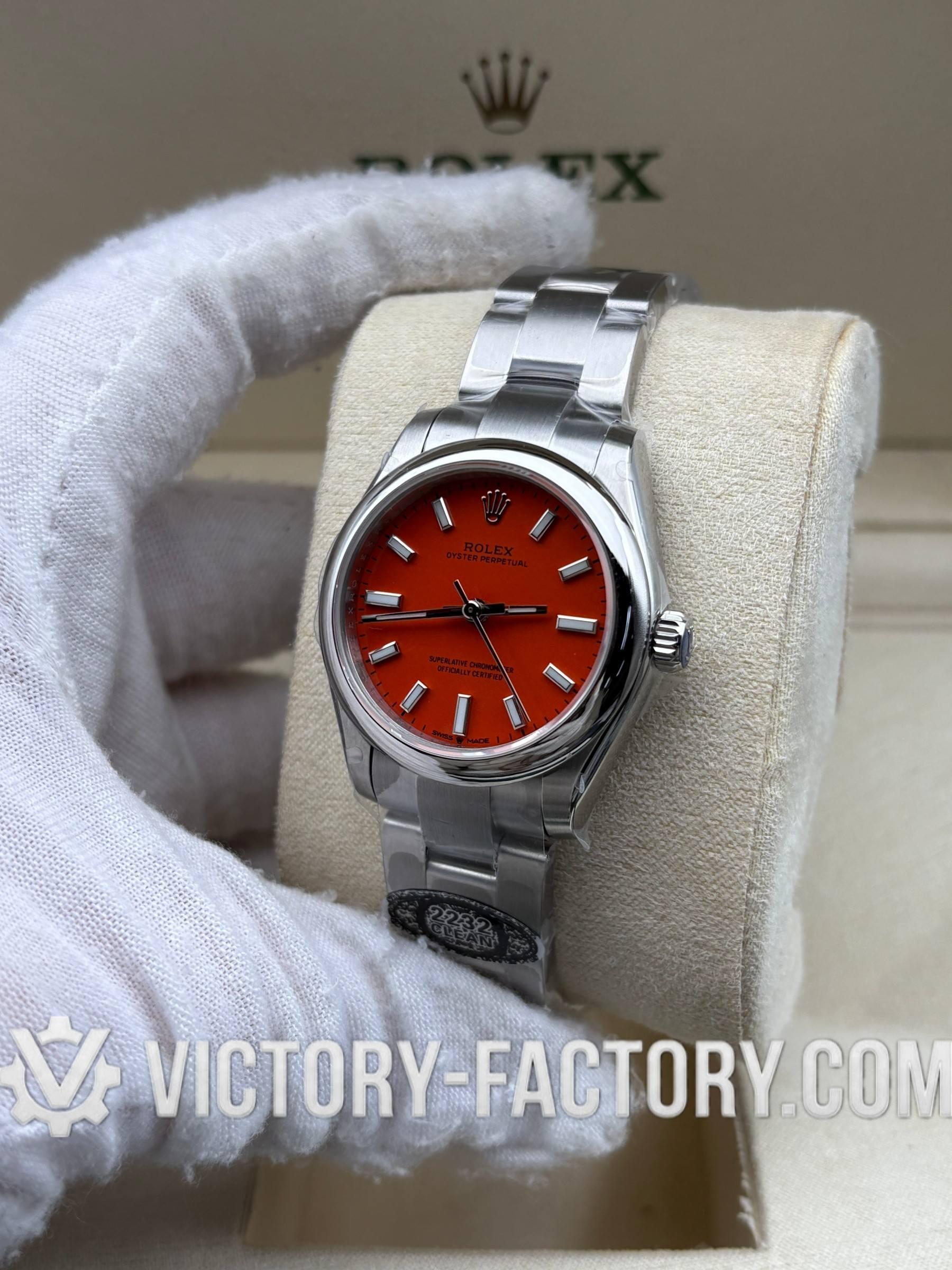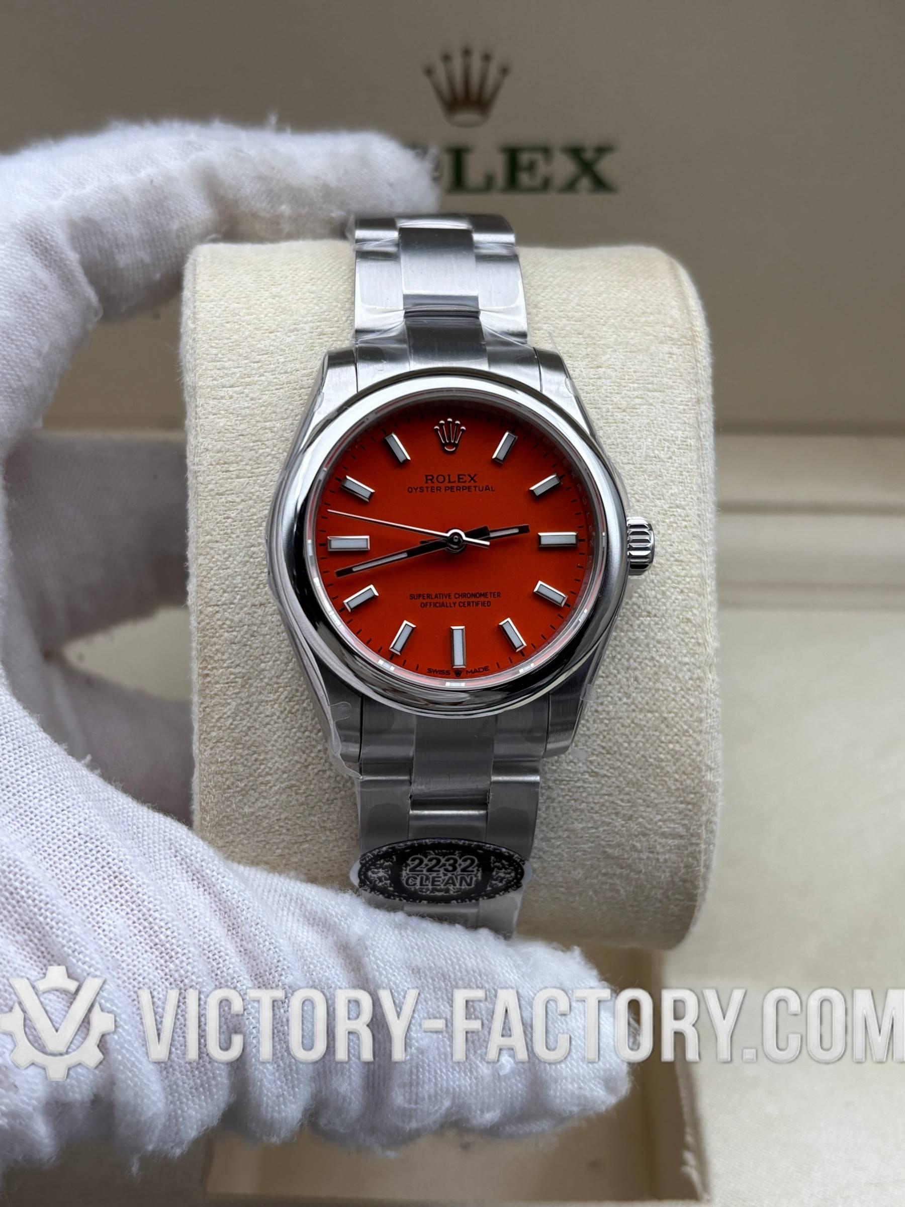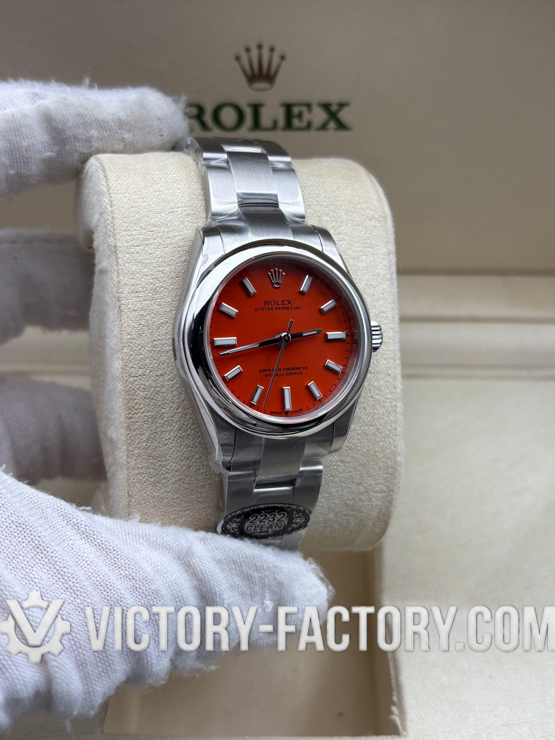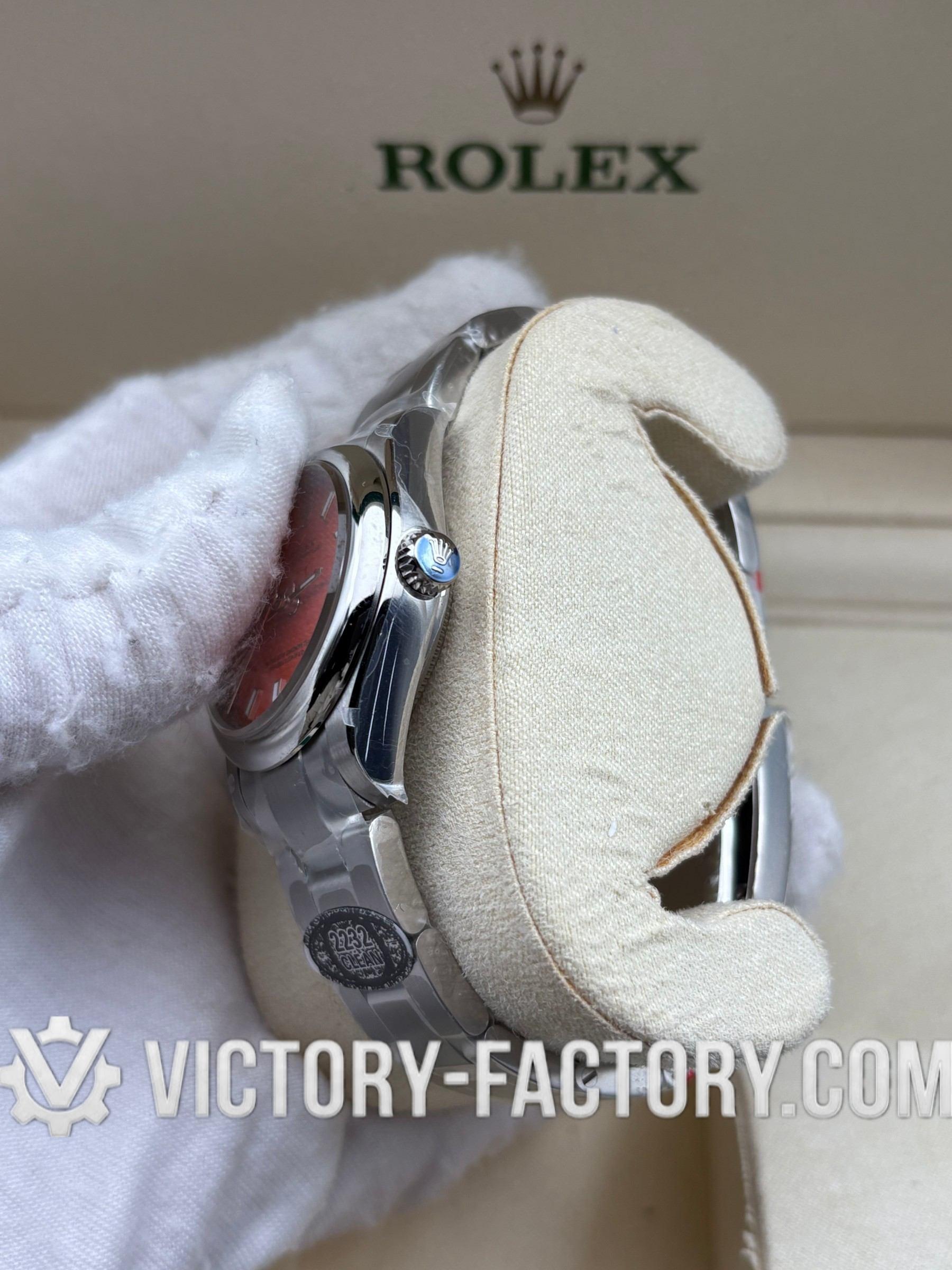 Overview: Victory Factory (VF) introduces the most striking 1:1 Super Clone of the Oyster Perpetual 31mm Ref. 277200 in the vibrant Coral Red dial finish. This “Hybrid Masterpiece” sets a new industry standard by seamlessly integrating Clean Factory’s (CF) world-class exterior components—renowned for their flawless 1:1 color accuracy—with the unmatched reliability of the Dandong 2232 Integrated Movement. It is designed for collectors who demand the finest visual aesthetics paired with a genuine professional-grade mechanical soul.