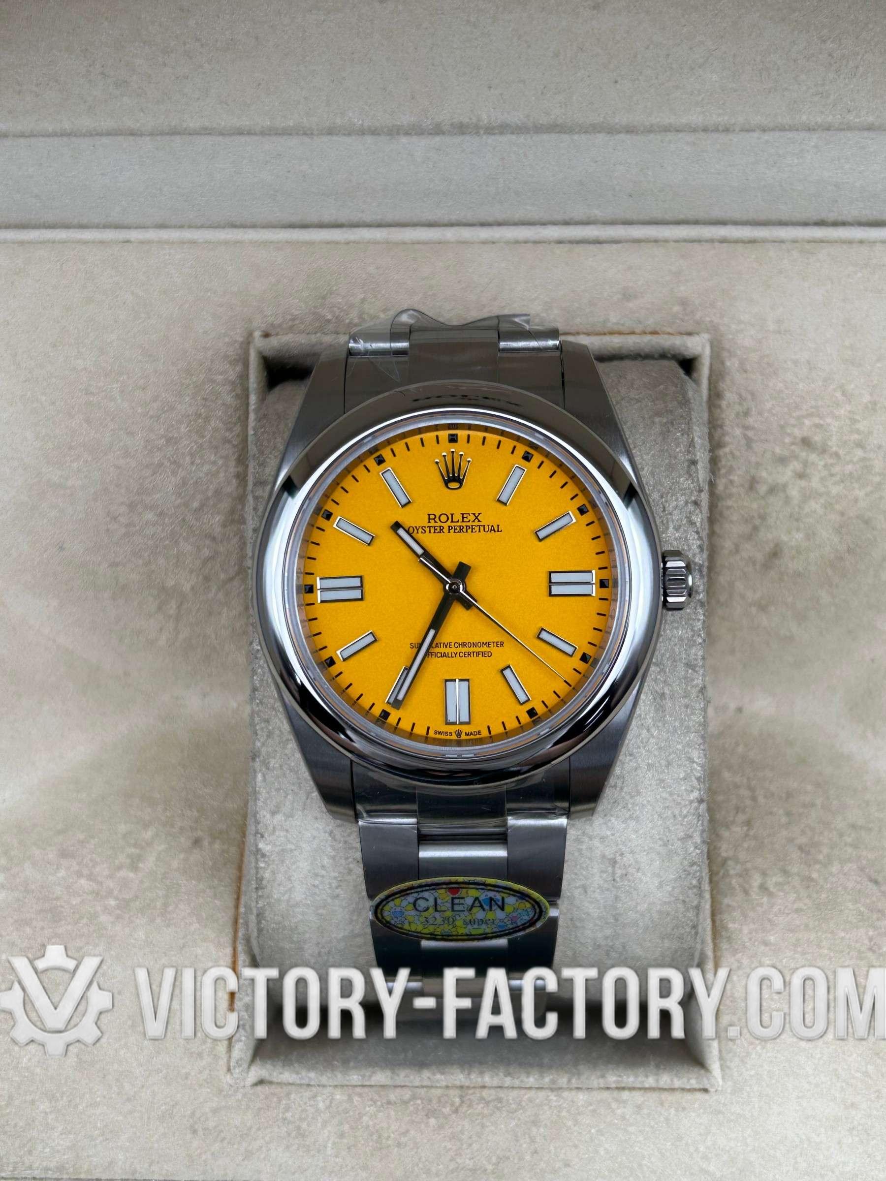 Overview: Victory Factory (VF) presents the definitive 1:1 Super Clone of the Oyster Perpetual 41mm Ref. 124300 in the iconic vibrant yellow dial. This “Hybrid Masterpiece” sets a new market benchmark by perfectly inheriting Clean Factory’s (CF) world-class exterior components—renowned for their 1:1 color accuracy and 904L steel finishing—paired with the high-performance Dandong 3230 Integrated Movement. It is the premier choice for enthusiasts who demand original-grade visual details and a robust mechanical soul.