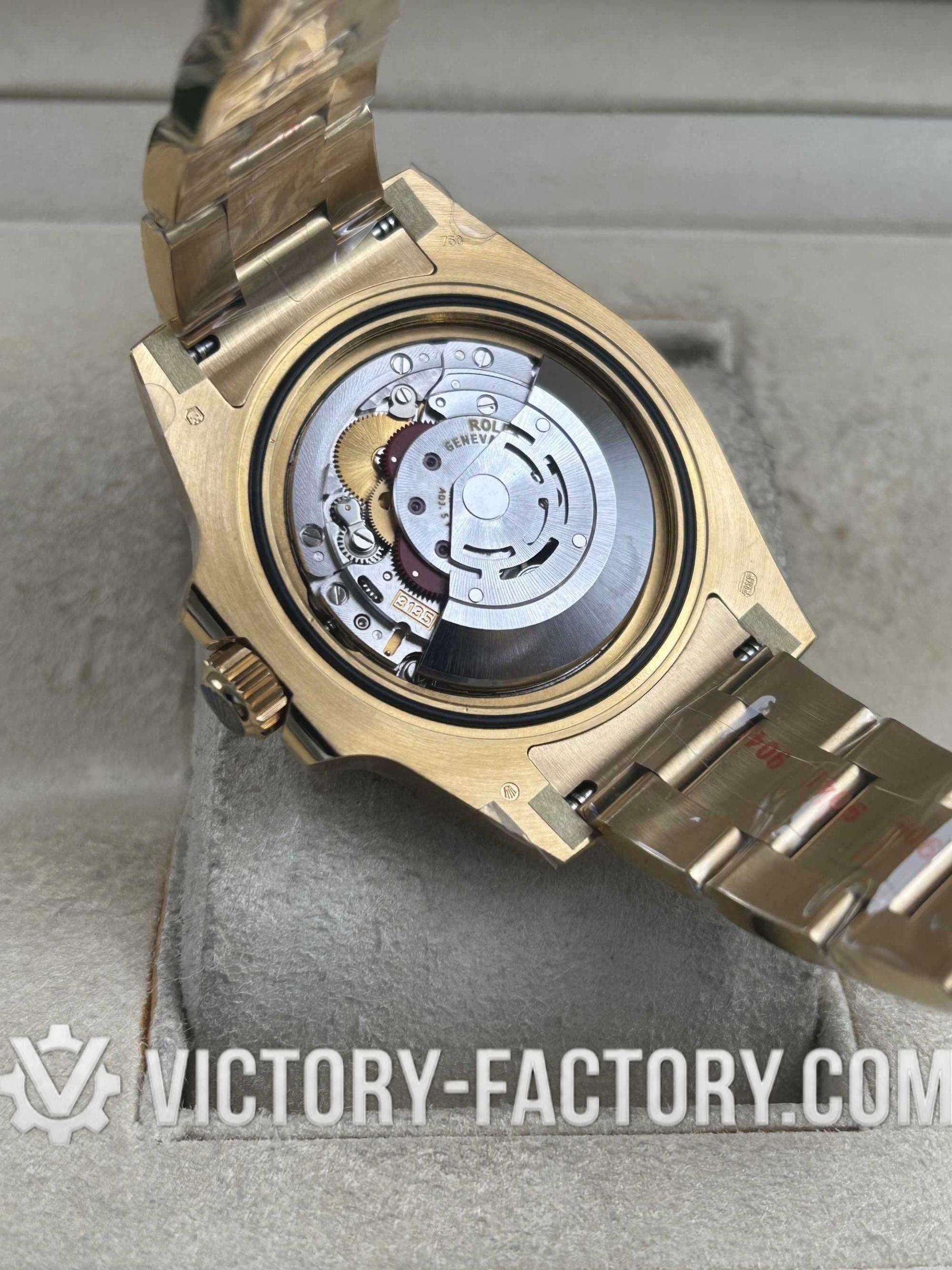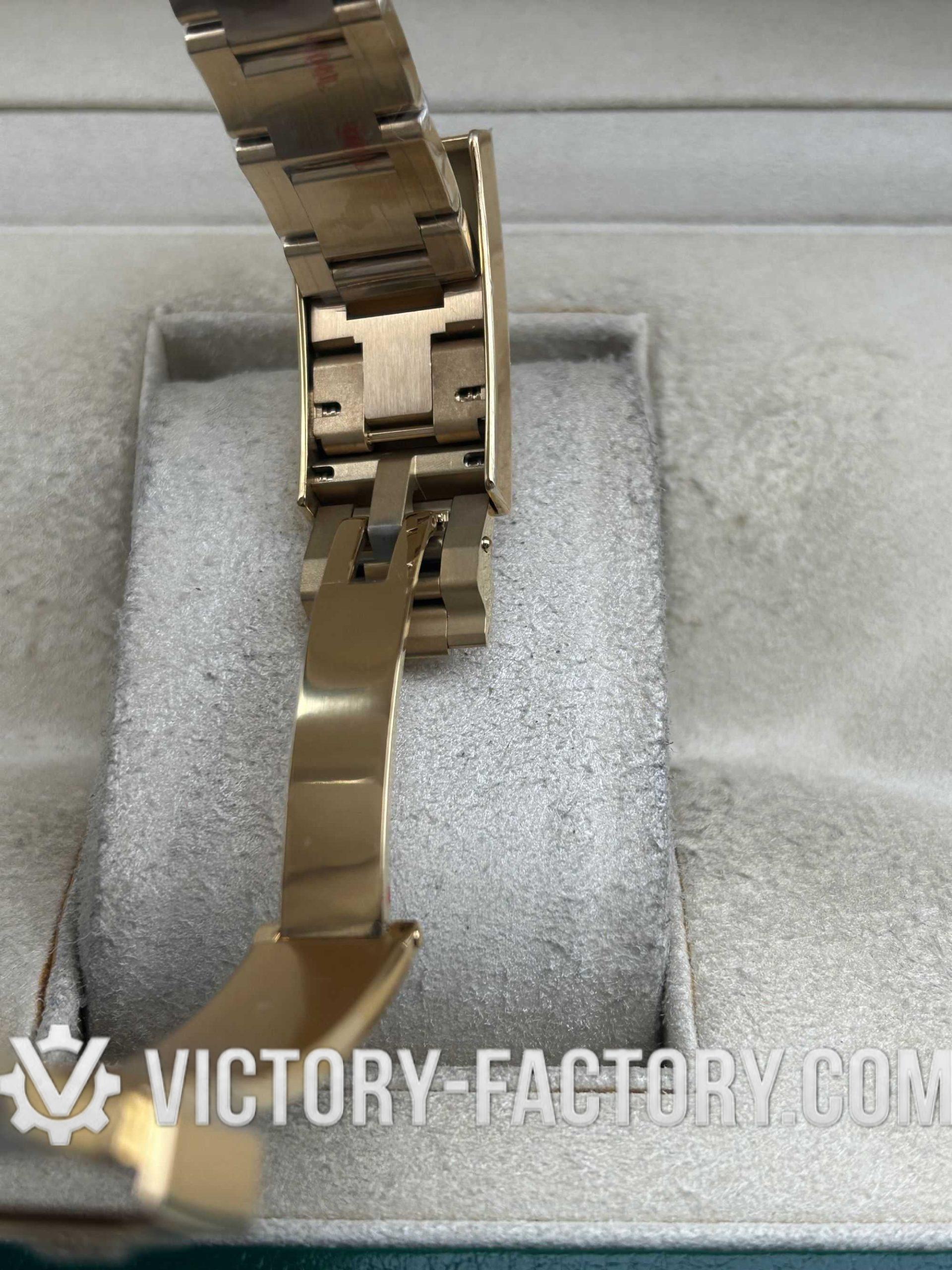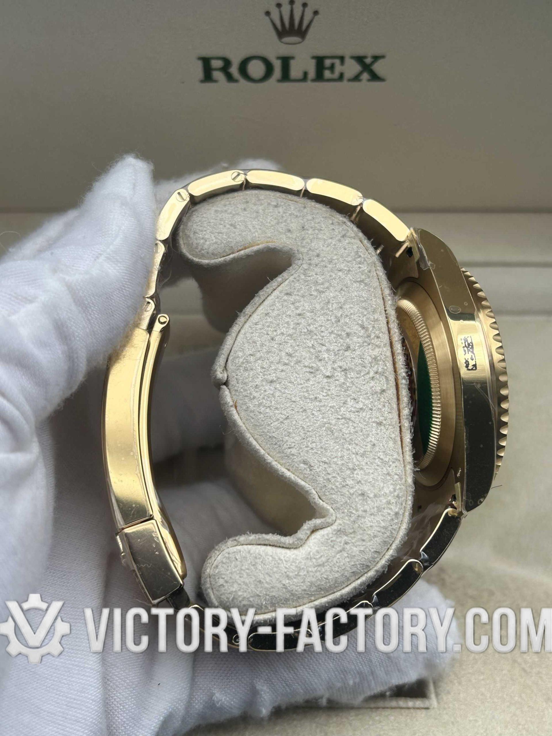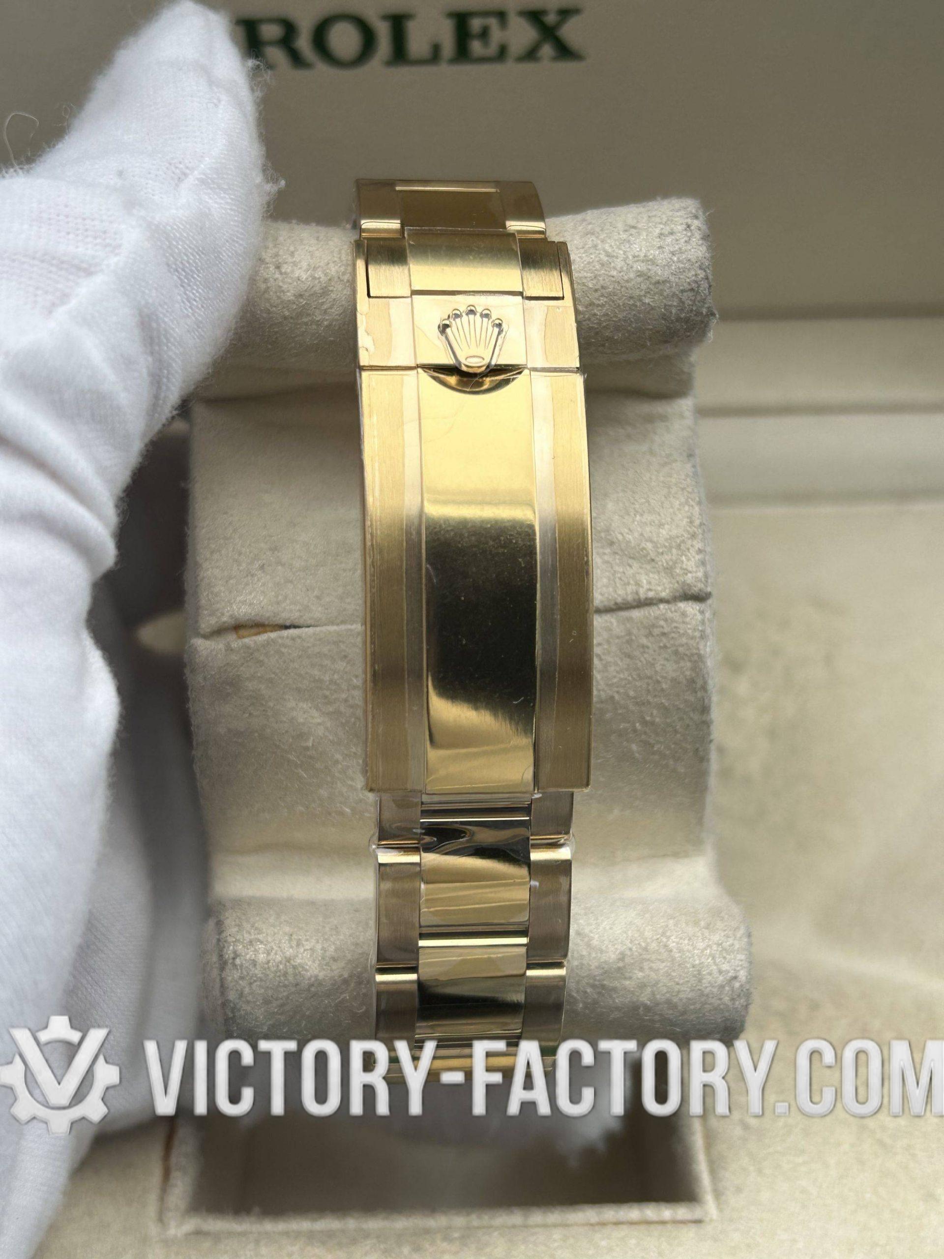 Embodying Victory Factory’s dedication to excellence, the 40mm case is wrapped in 18k yellow gold over solid 904L stainless steel, mirroring the authentic Rolex design.